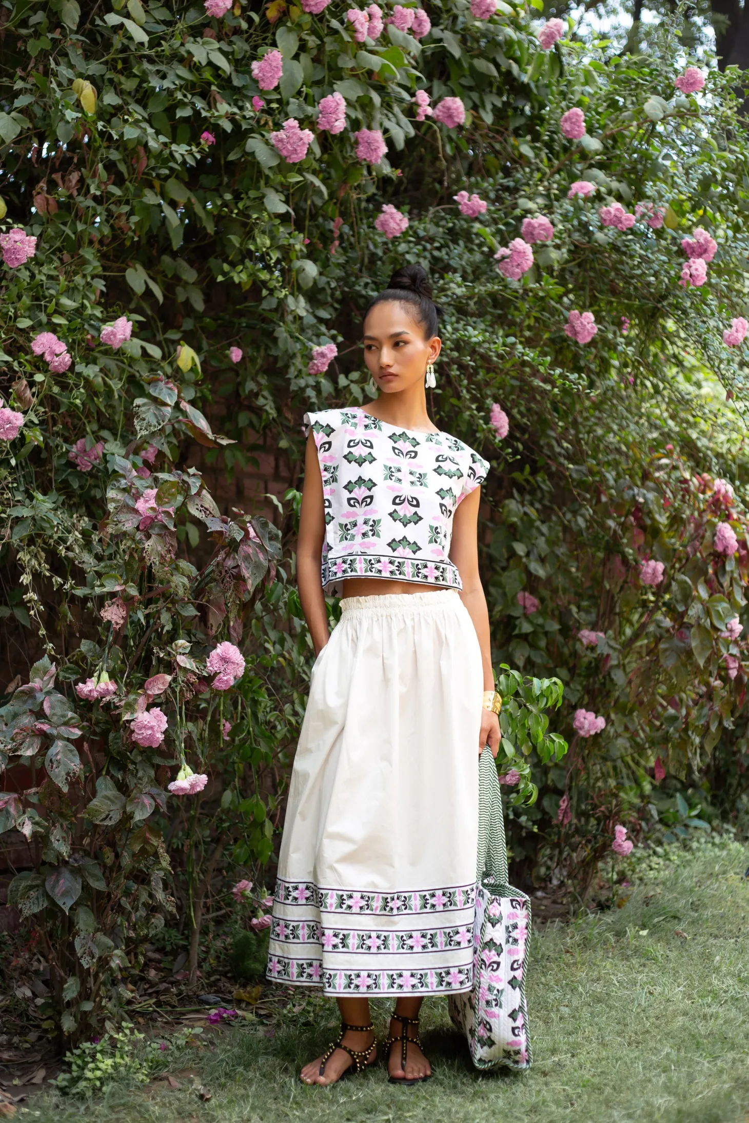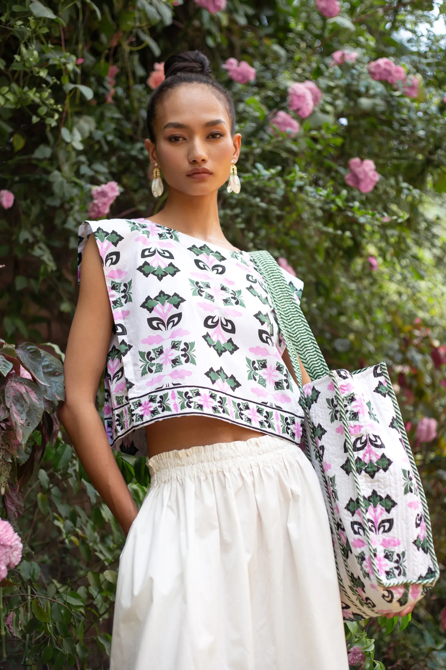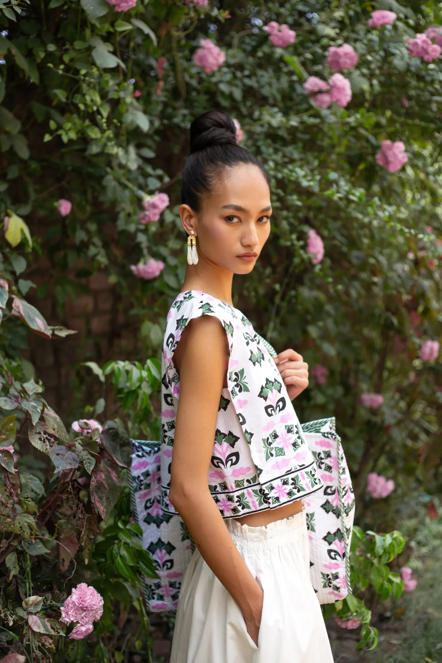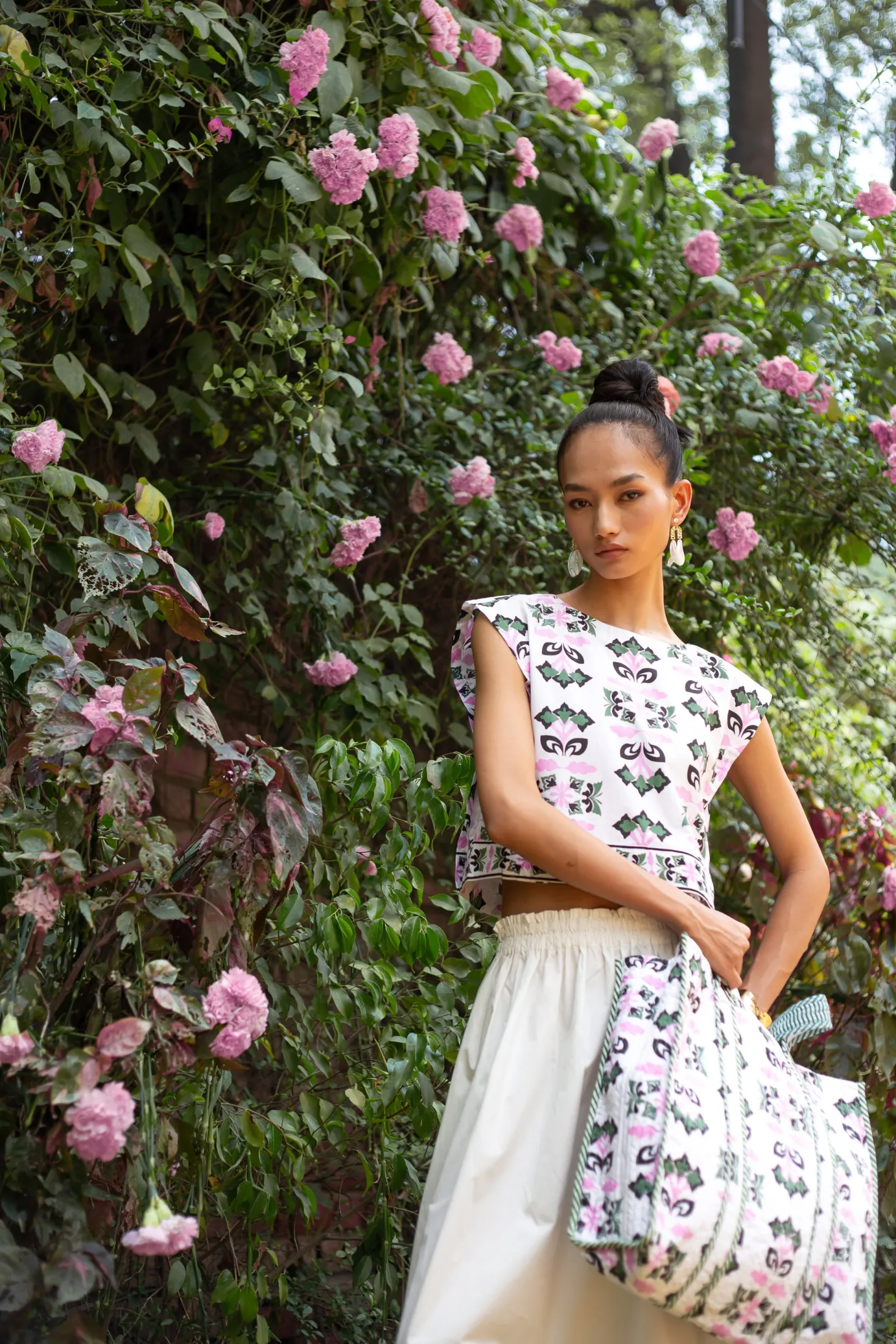 The sleek Piper top is a Spring – Summer wardrobe essential. With a slightly boxy shape and lightly capped sleeves, the Piper effortlessly pairs with our matching Kiley shorts or Amber Skirt. Piper is crafted from breathable premium Cotton Poplin. Taking cues from the spectacular butterflies native to the Pyrenees, this design uses simple flower and butterfly motifs to create a captivating geometric pattern.