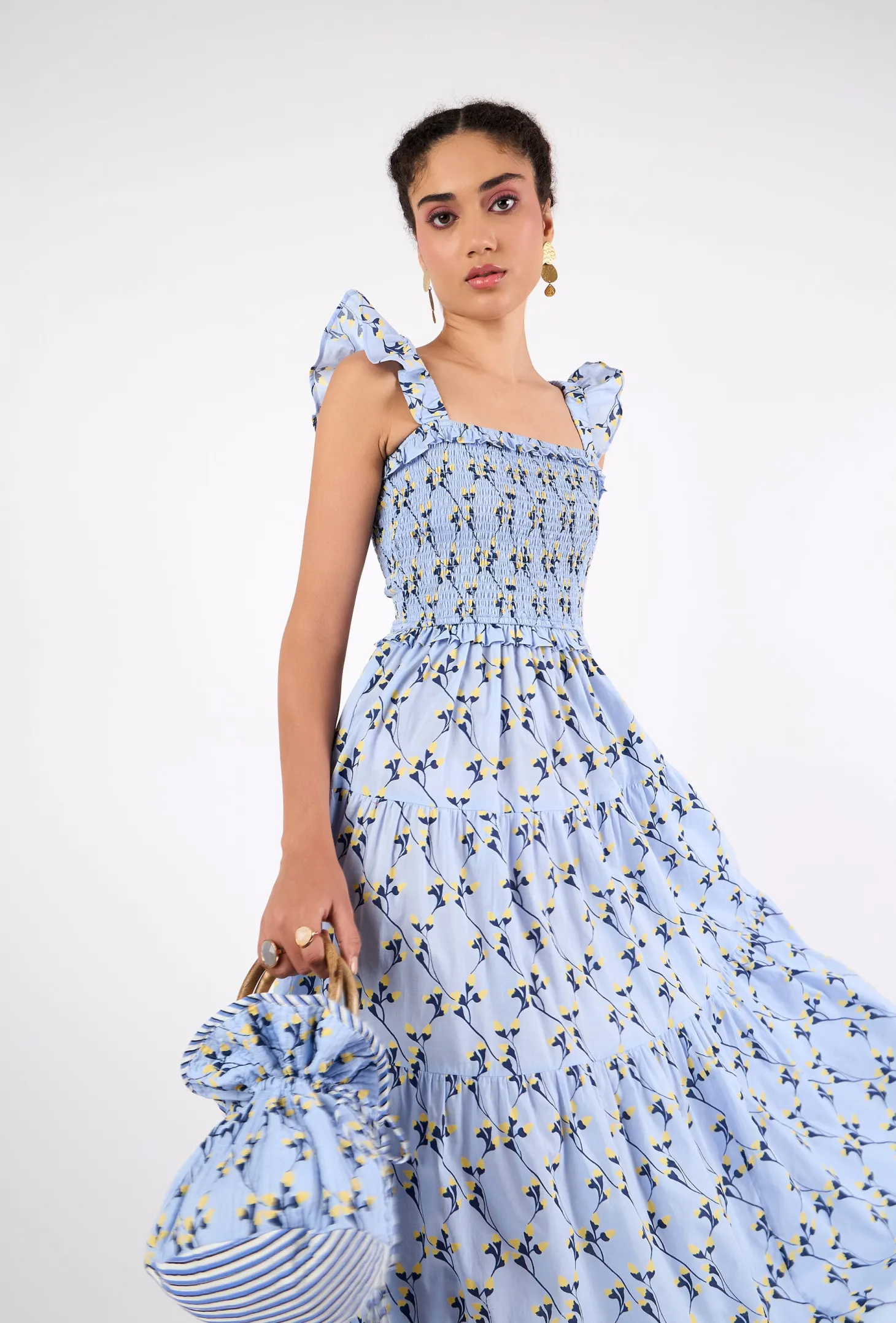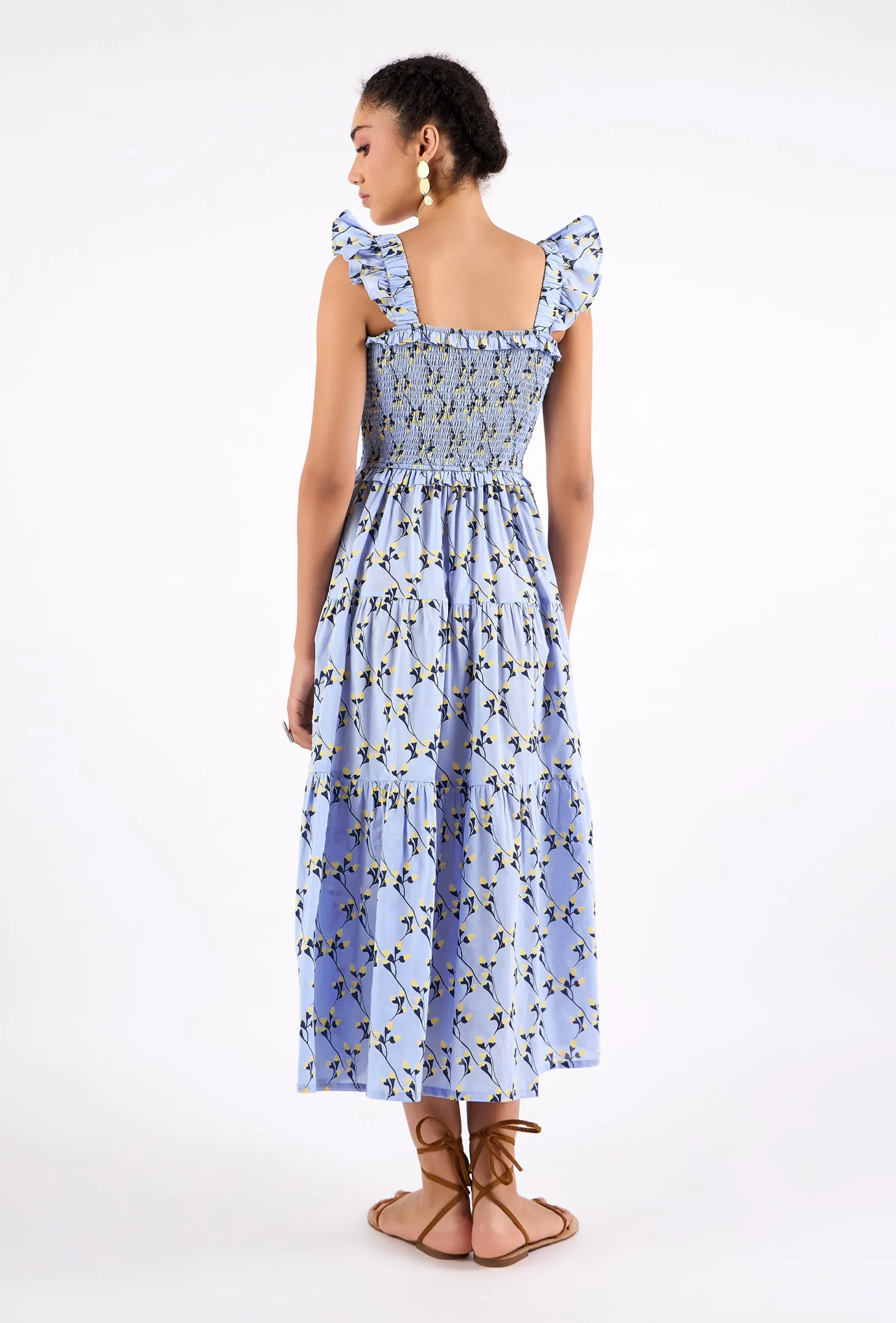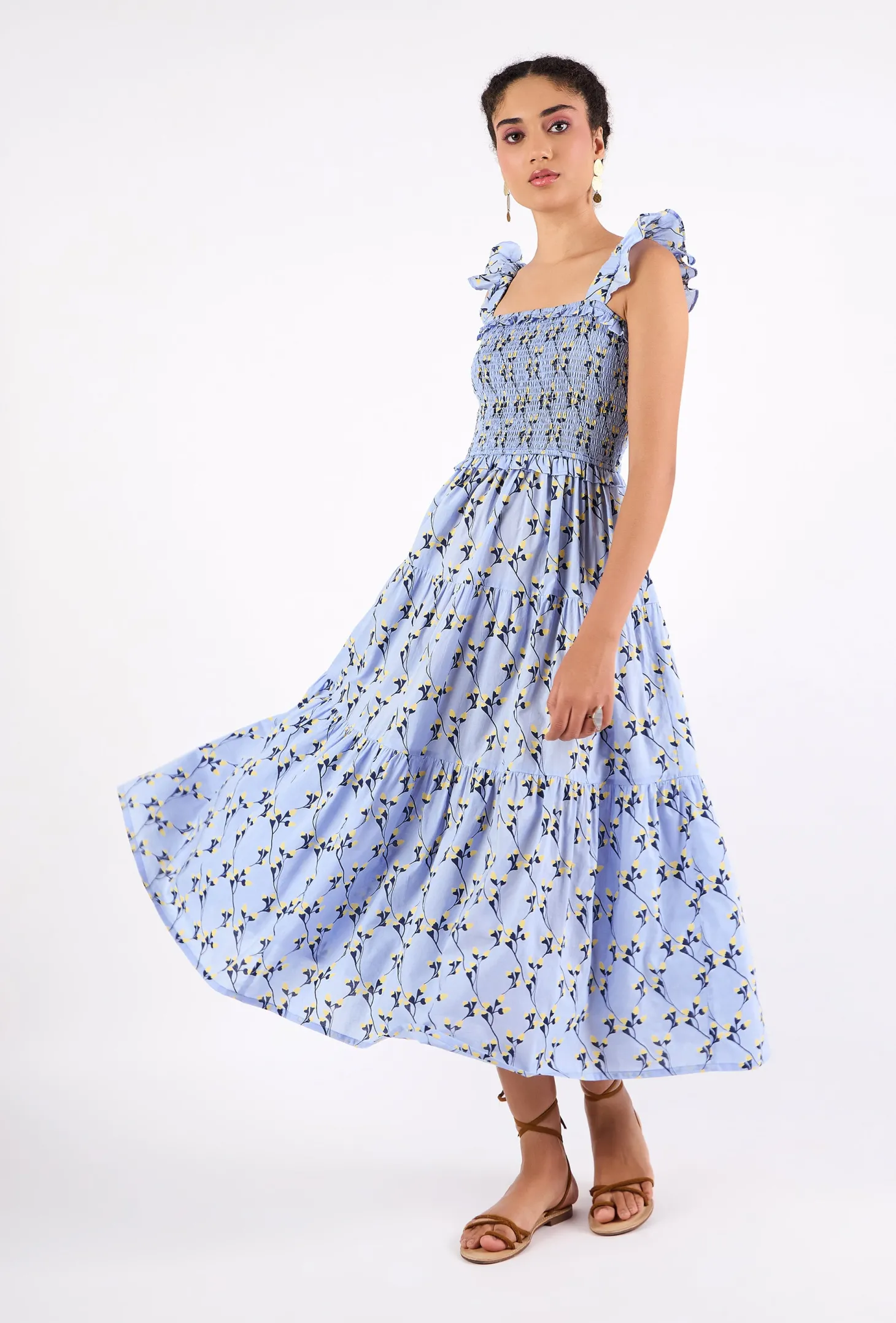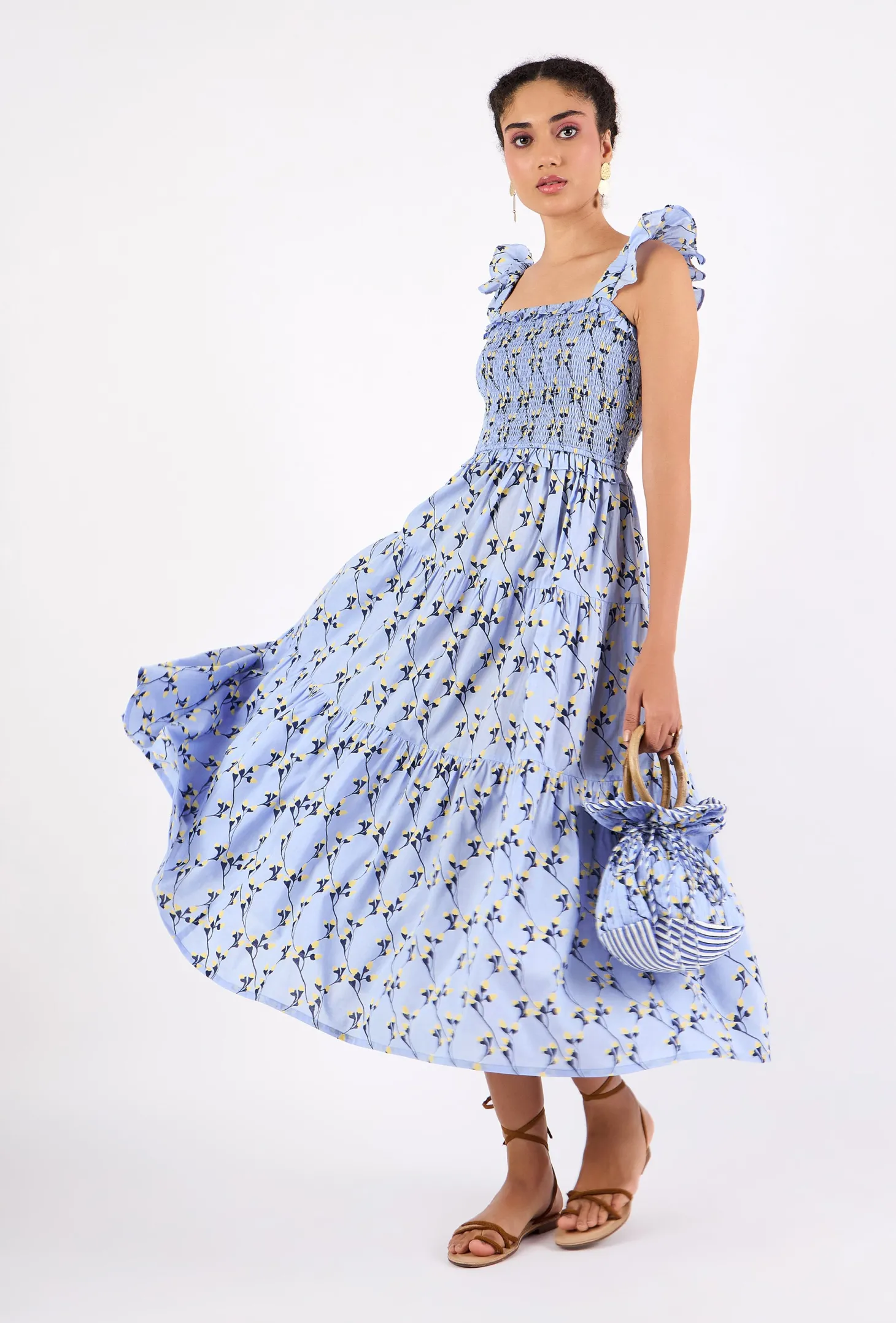 Our bestseller Mia dress has been upgraded! The playful midi dress, known for its beautiful tiered ruffle skirt and ever-so-flattering smocked bodice, now features elasticated flutter sleeves for a sophisticated look. This romantic silhouette is perfect for dinner dates, weekend brunches, and garden parties. Mia is made from a soft, breathable cotton cambric fabric. Inspired by the wildflowers blooming in spring around the medieval village of Gordes, Provence, this print references the idyllic scenery of the blooming landscape.