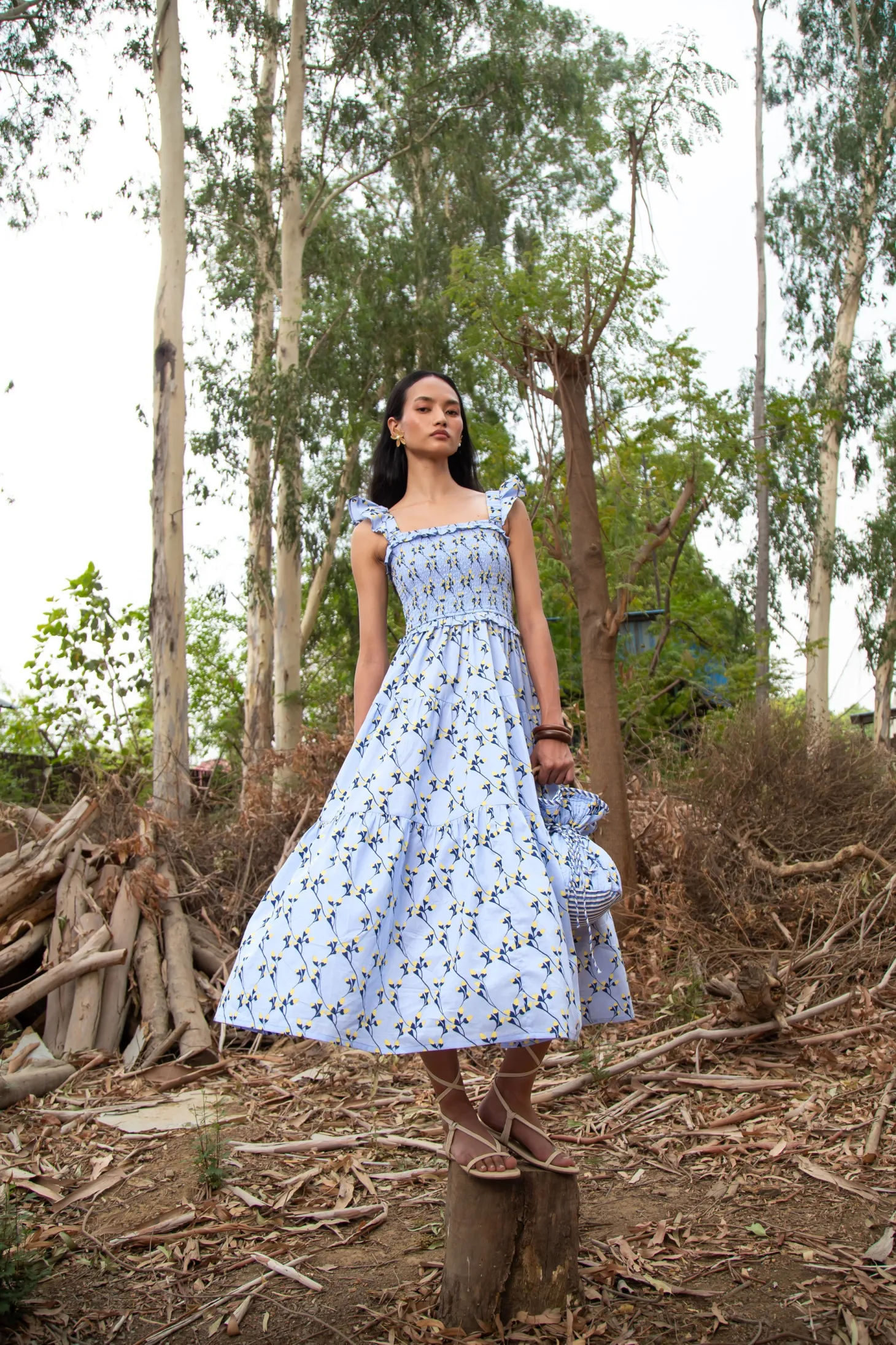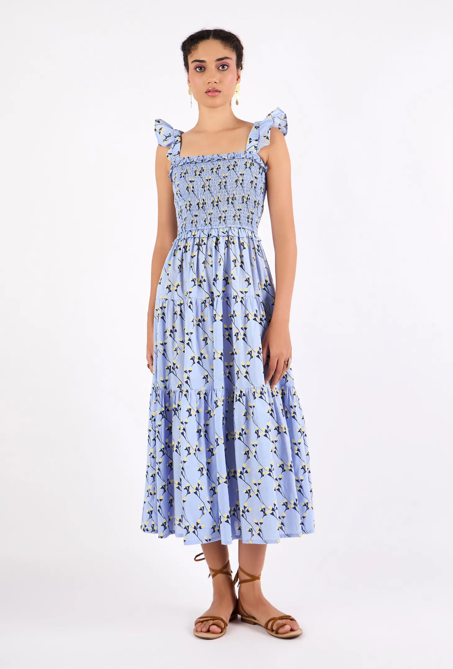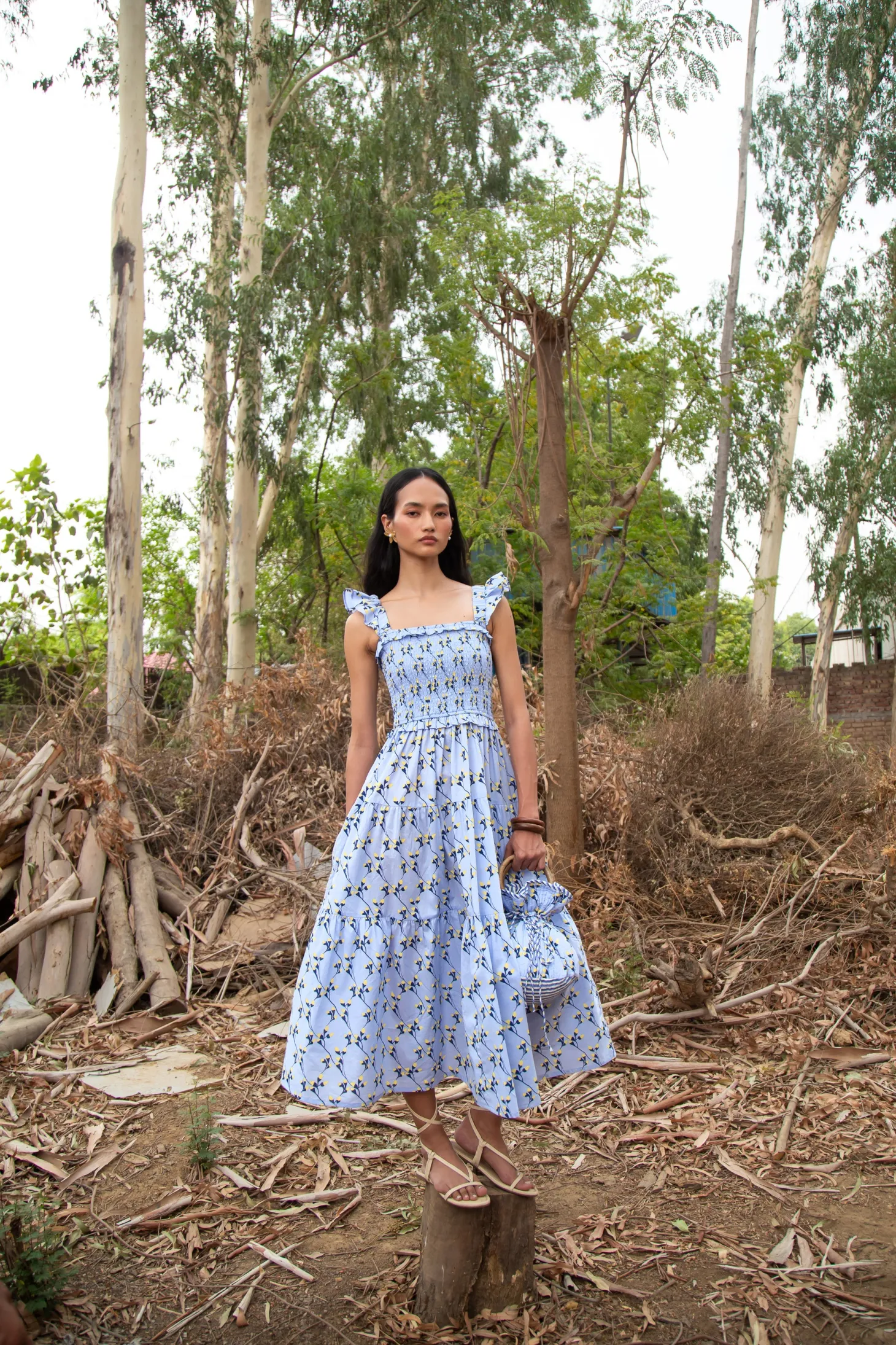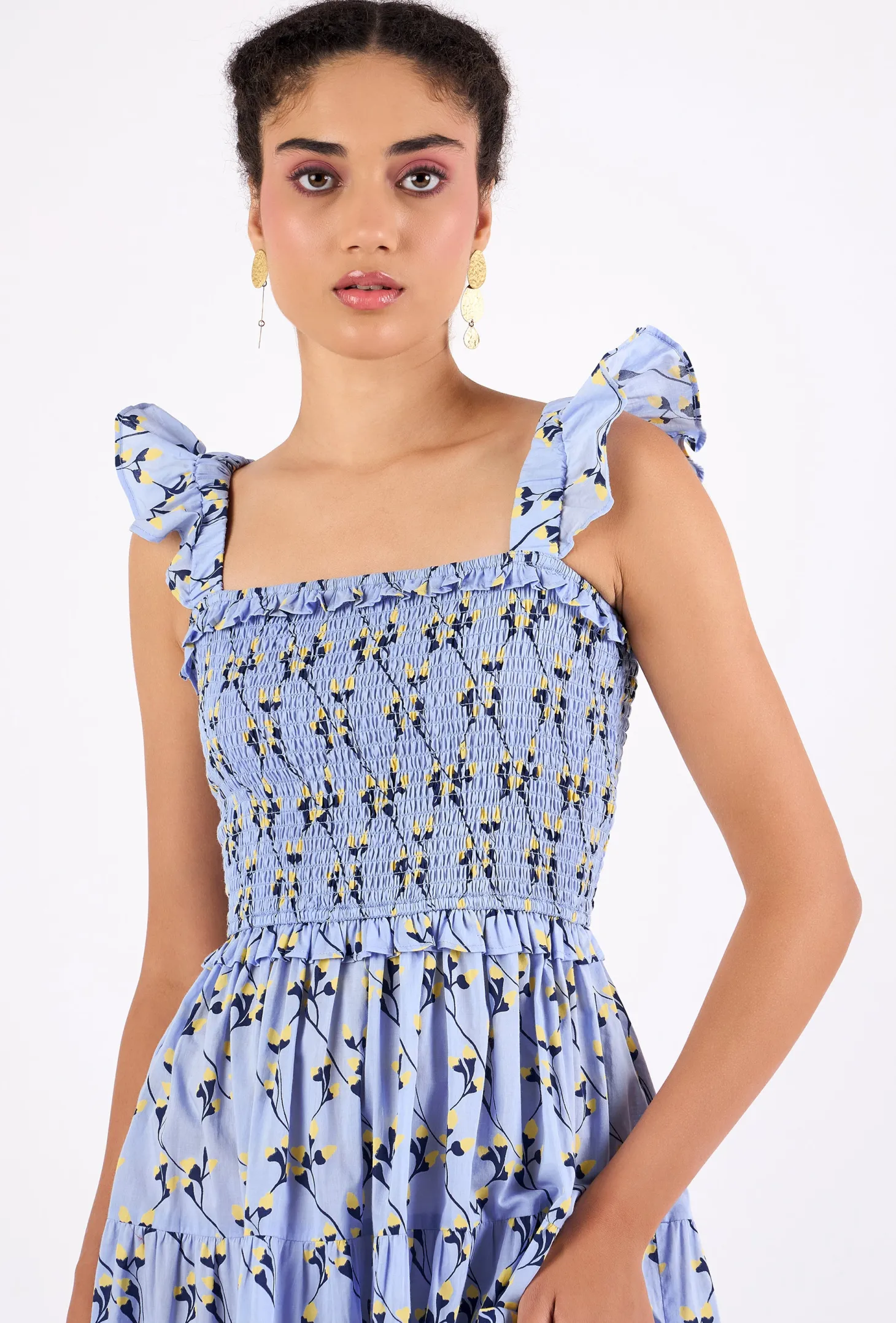 Our bestseller Mia dress has been upgraded! The playful midi dress, known for its beautiful tiered ruffle skirt and ever-so-flattering smocked bodice, now features elasticated flutter sleeves for a sophisticated look. This romantic silhouette is perfect for dinner dates, weekend brunches, and garden parties. Mia is made from a soft, breathable cotton cambric fabric. Inspired by the wildflowers blooming in spring around the medieval village of Gordes, Provence, this print references the idyllic scenery of the blooming landscape.