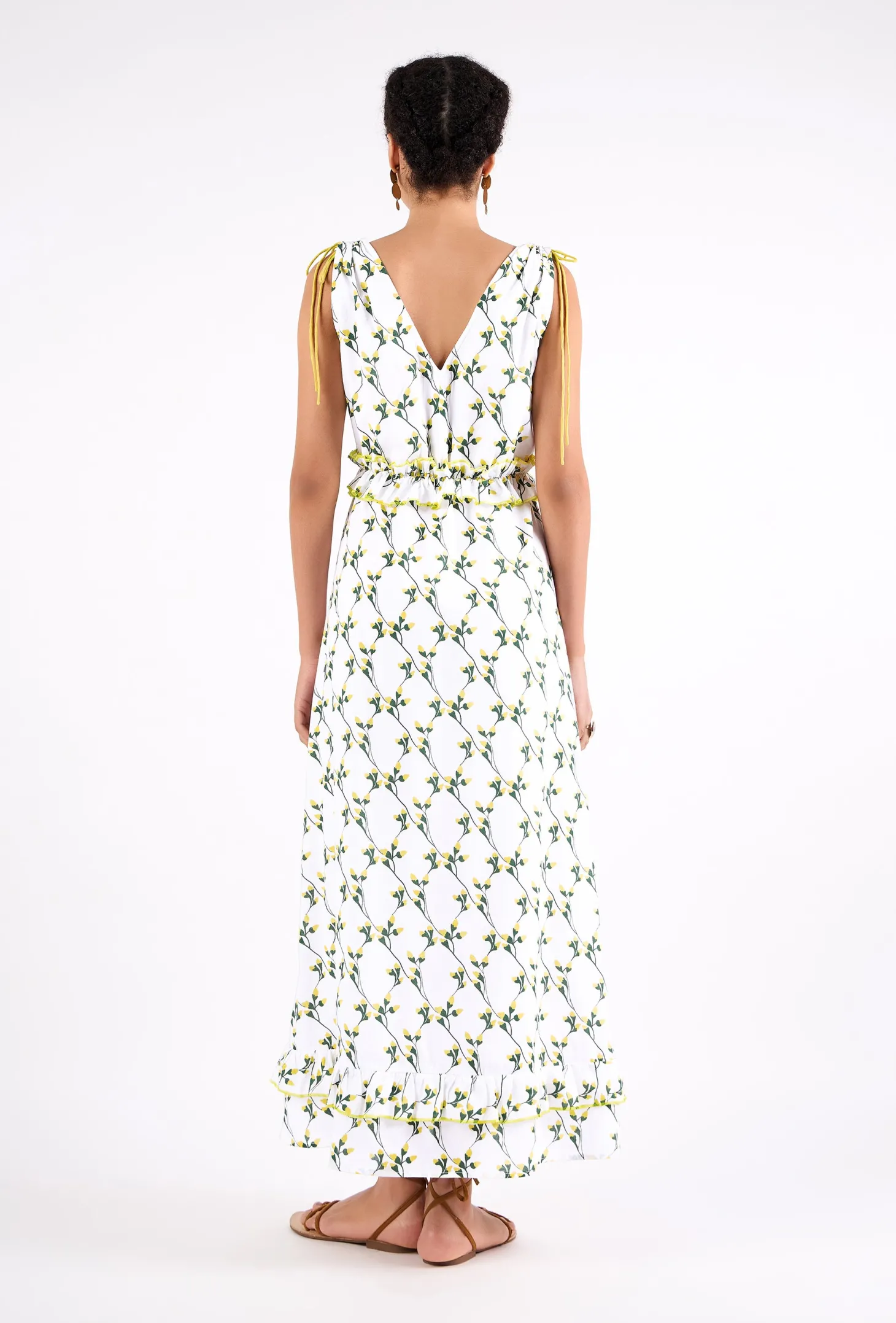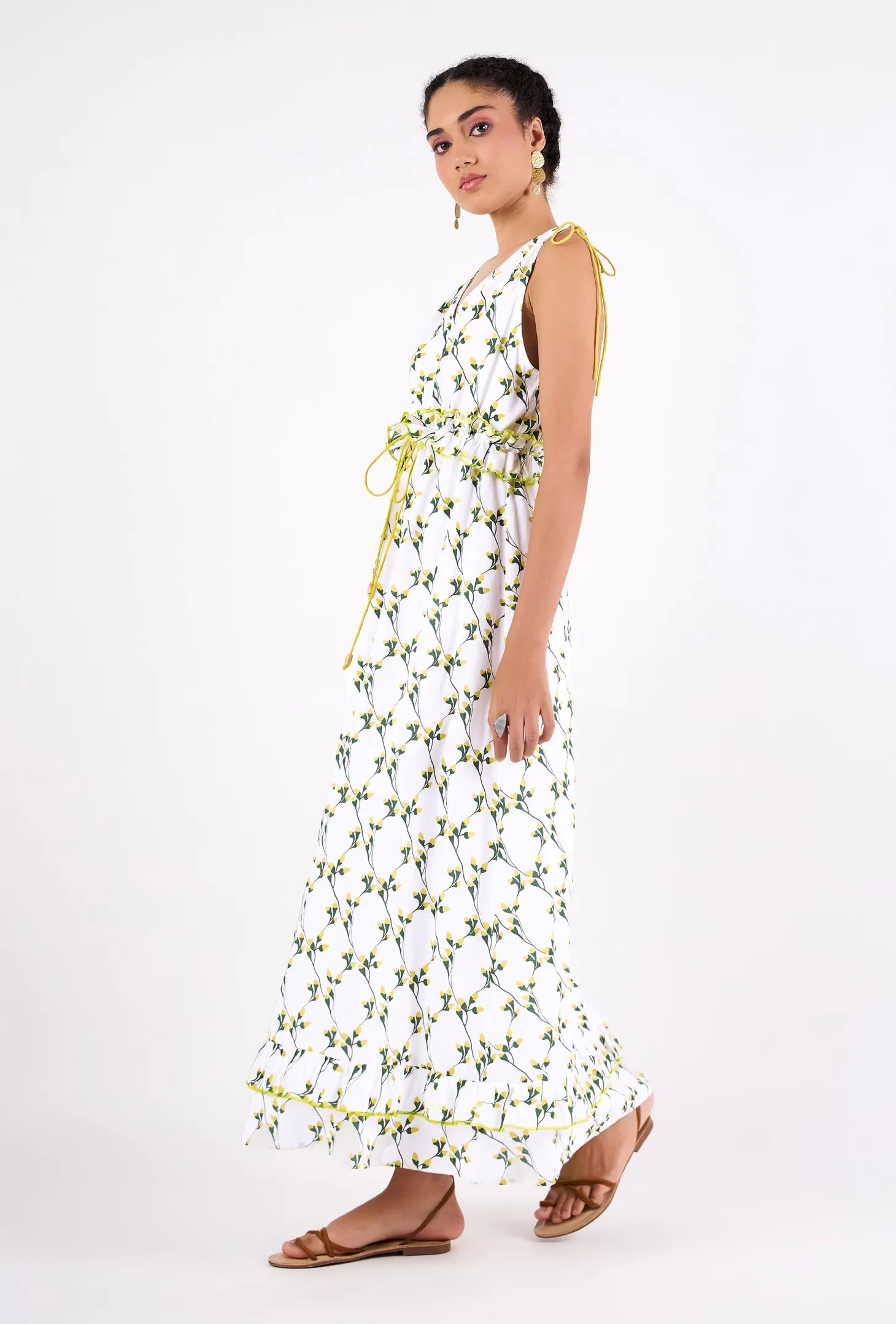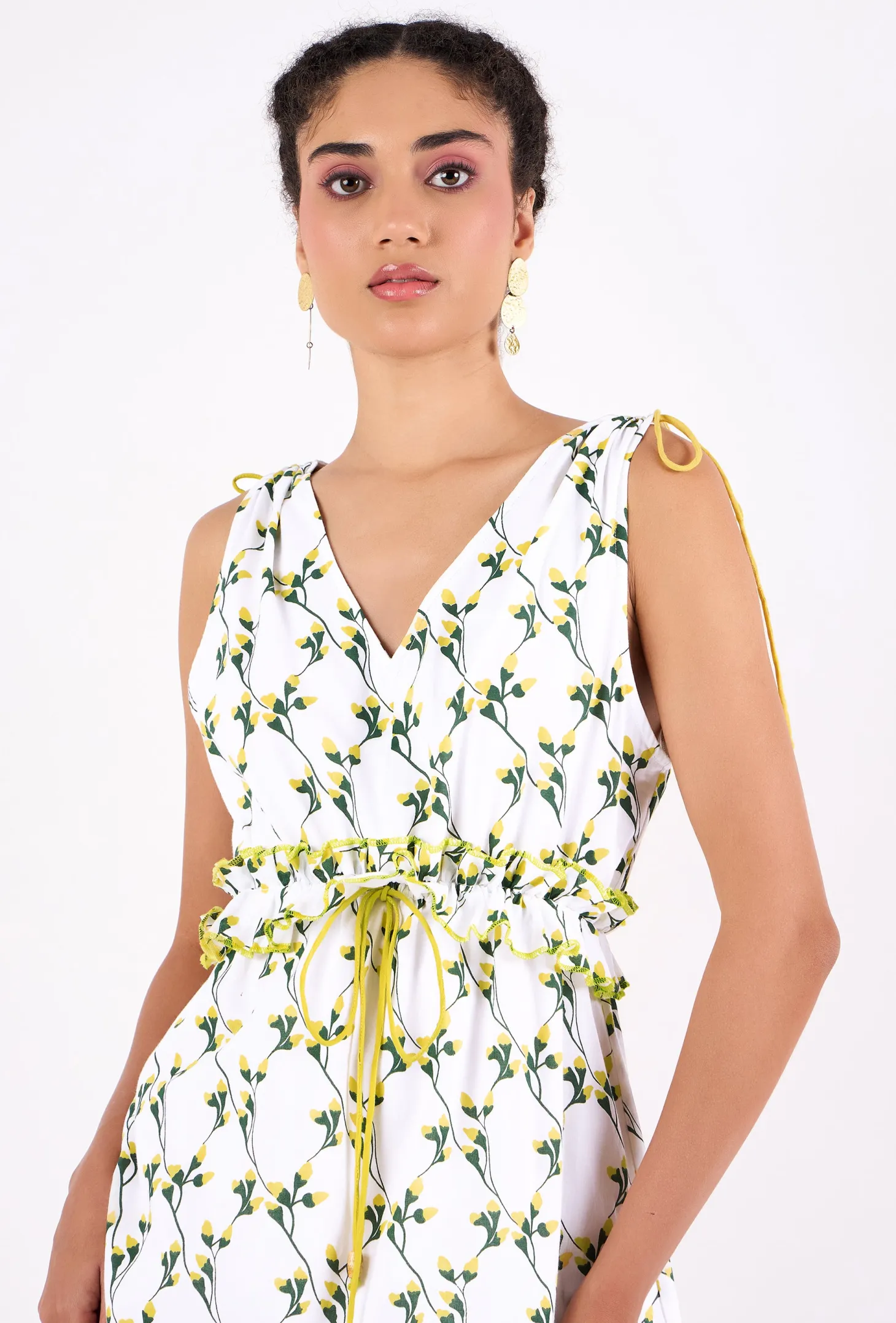 Stay cool and stylish in this airy dress, designed with drawstring ties at the shoulders and waist for a customizable fit. The chic A-line silhouette is enhanced by delicate ruffle details, making it a versatile piece that transitions seamlessly from casual days in sandals to elegant evenings in heels. Drew is made from a soft, breathable cotton cambric fabric. Inspired by the wildflowers blooming in spring around the medieval village of Gordes, Provence, this print references the idyllic scenery of the blooming landscape.