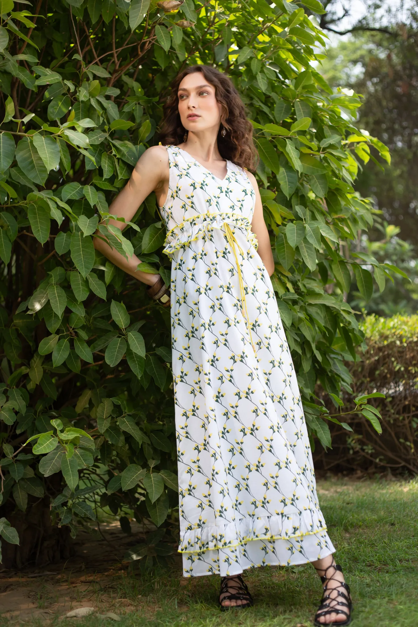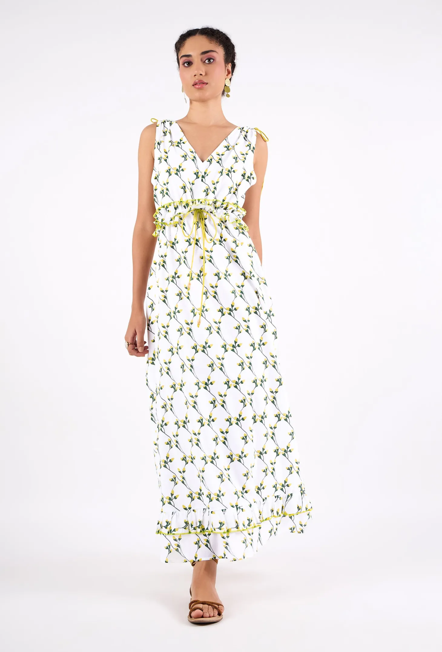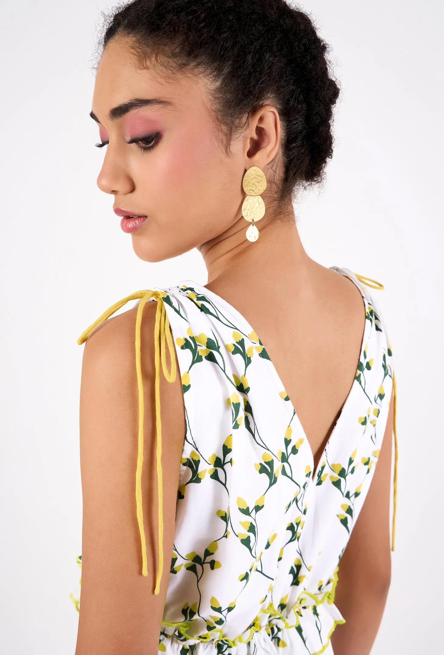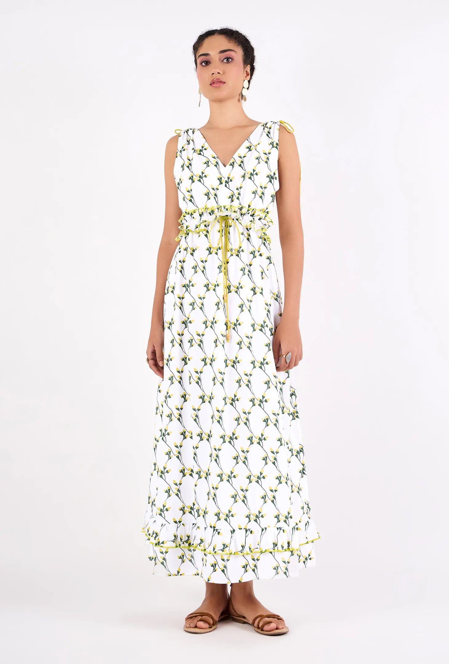 Stay cool and stylish in this airy dress, designed with drawstring ties at the shoulders and waist for a customizable fit. The chic A-line silhouette is enhanced by delicate ruffle details, making it a versatile piece that transitions seamlessly from casual days in sandals to elegant evenings in heels. Drew is made from a soft, breathable cotton cambric fabric. Inspired by the wildflowers blooming in spring around the medieval village of Gordes, Provence, this print references the idyllic scenery of the blooming landscape.