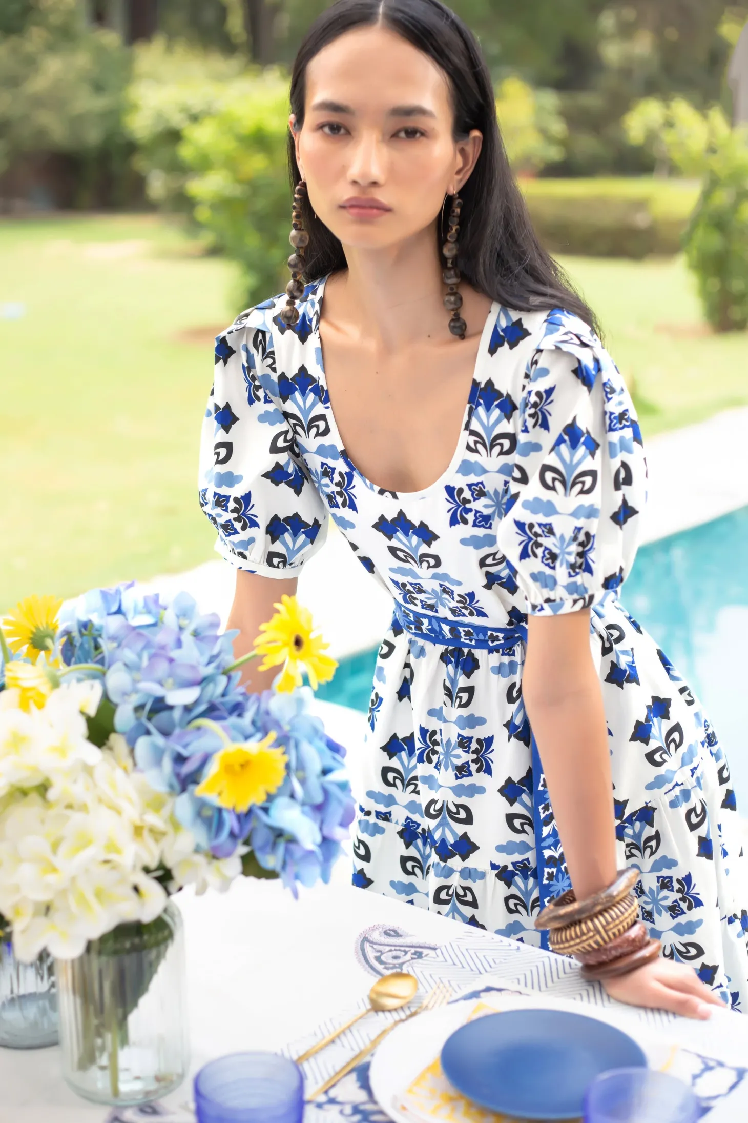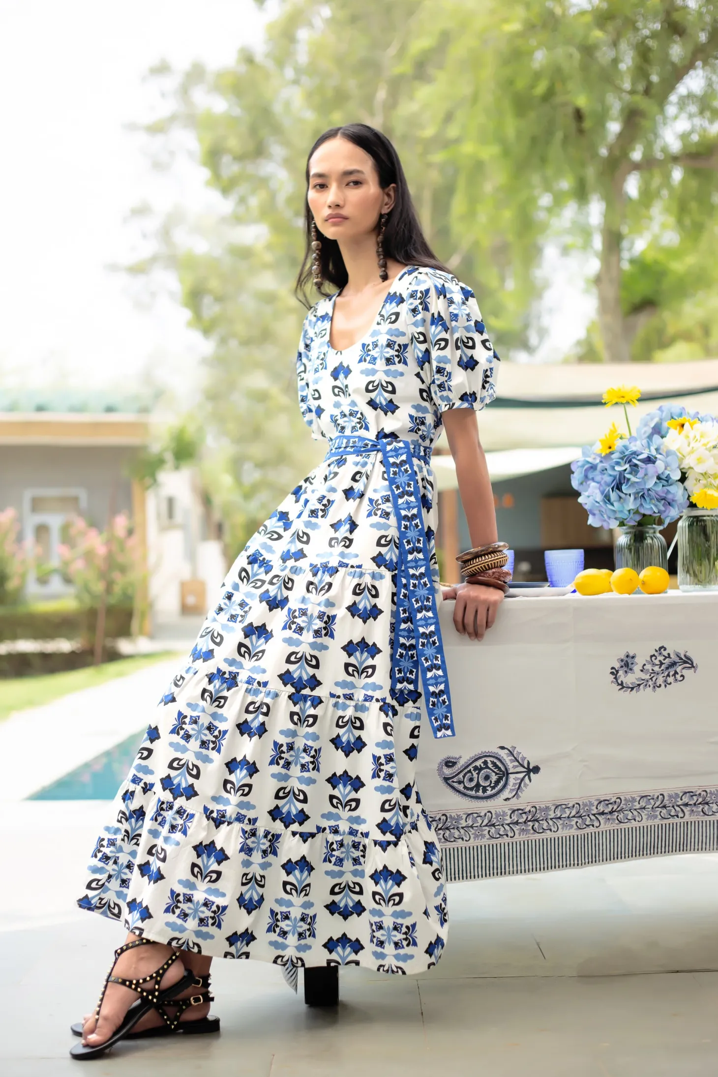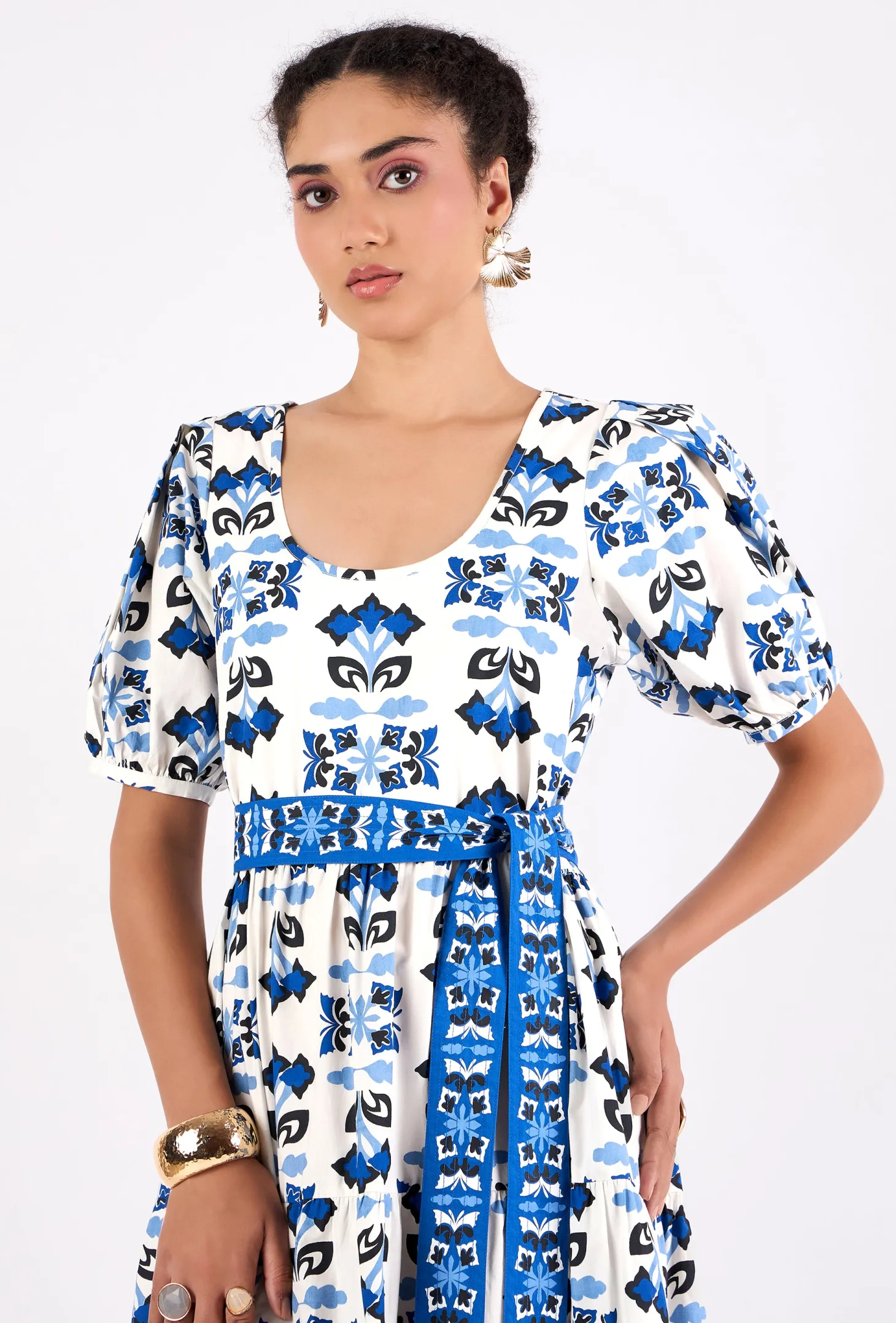 Elevate your look with the Daisy dress, a contemporary choice for your everyday wardrobe. Featuring a round neckline, puff sleeves and relaxed fit, the maxi offers both comfort and style. Complete the look and cinch in the waist with the included braided belt. Daisy is crafted from breathable premium Cotton Poplin. Taking cues from the spectacular butterflies native to the Pyrenees, this design uses simple flower and butterfly motifs to create a captivating geometric pattern.