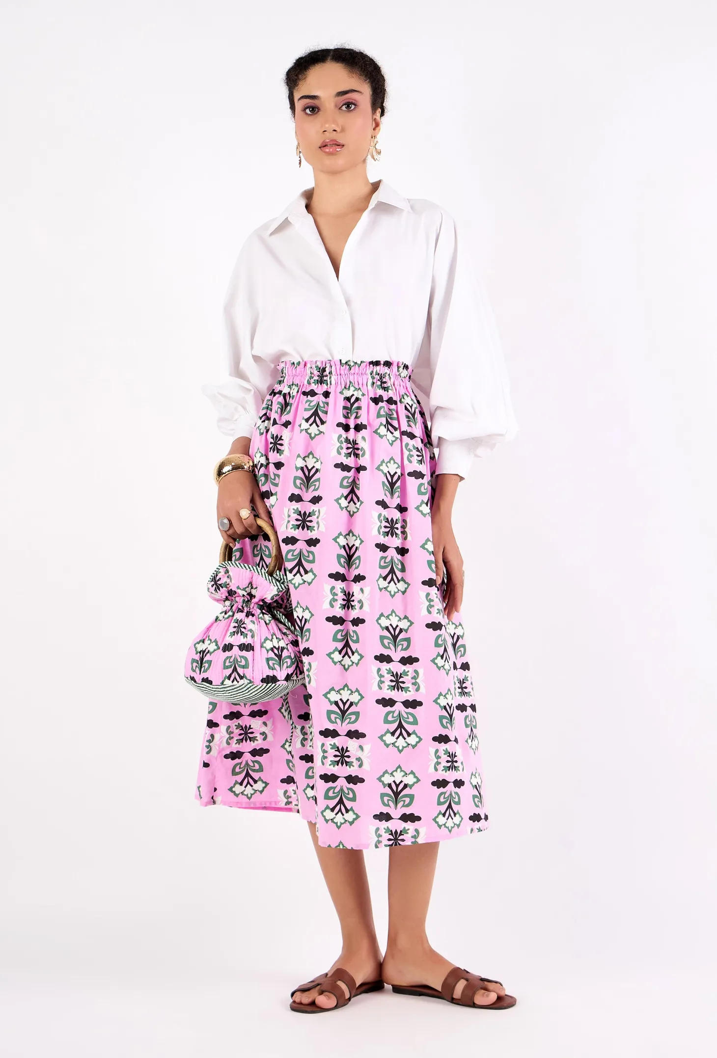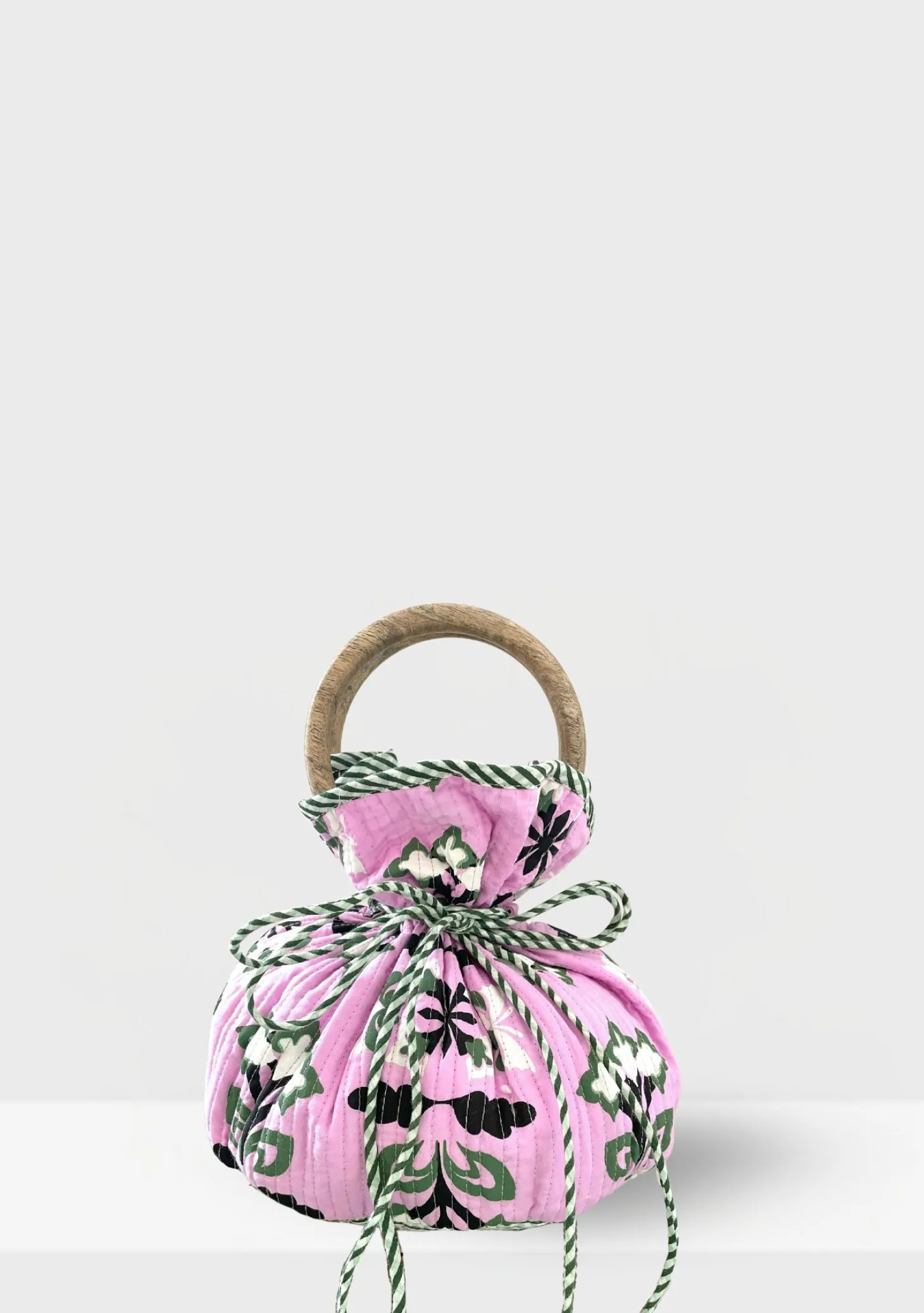 Bella’s outer layer showcases our stunning hand-drawn print and is lined with recycled block-printed fabric. The drawstring closure adds a feminine touch, while the gathered fabric at the handles enhances its elegant design. Sturdy mango wood handles bring a natural, earthy element. This quilted bucket bag is a chic accessory that effortlessly elevates any outfit.