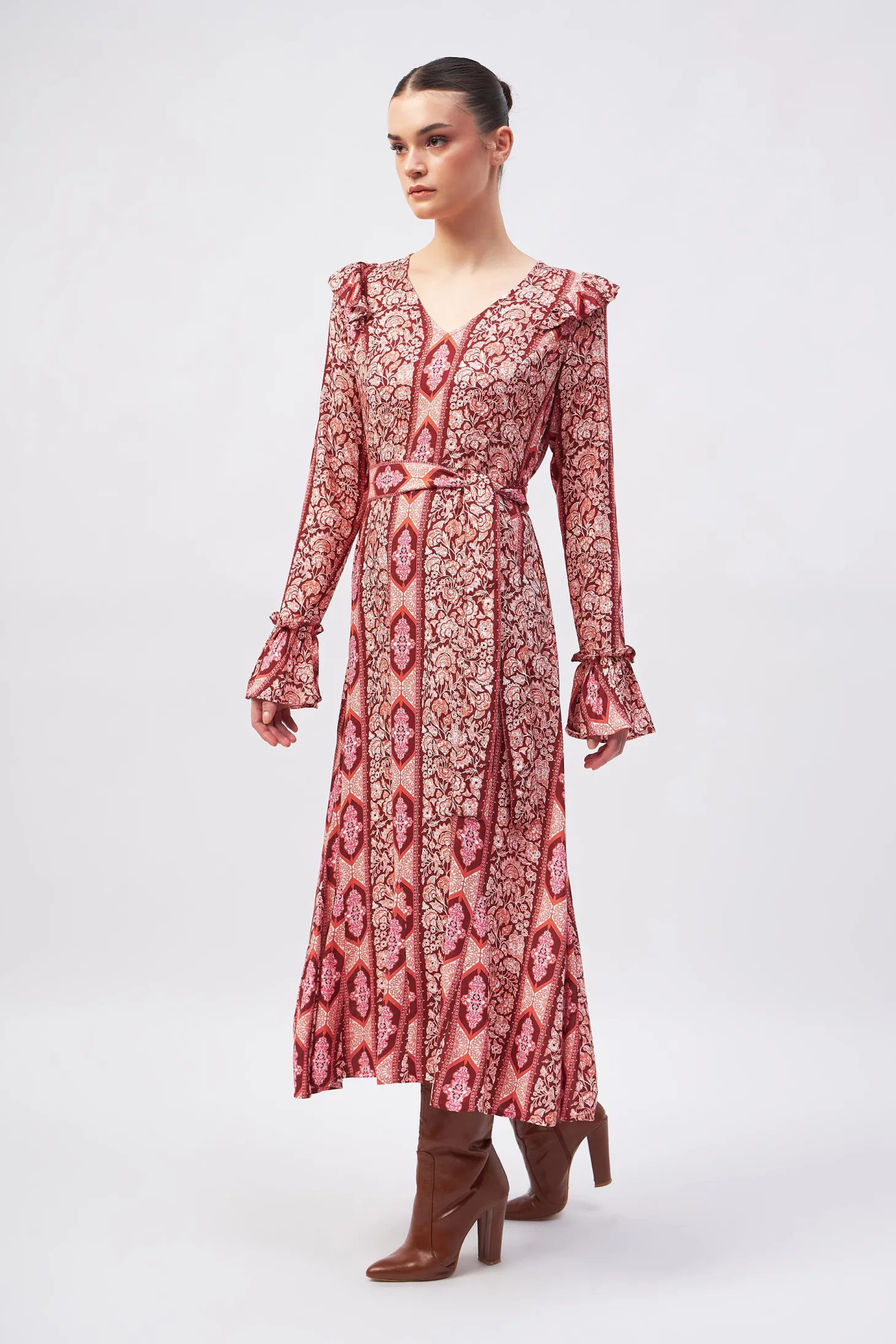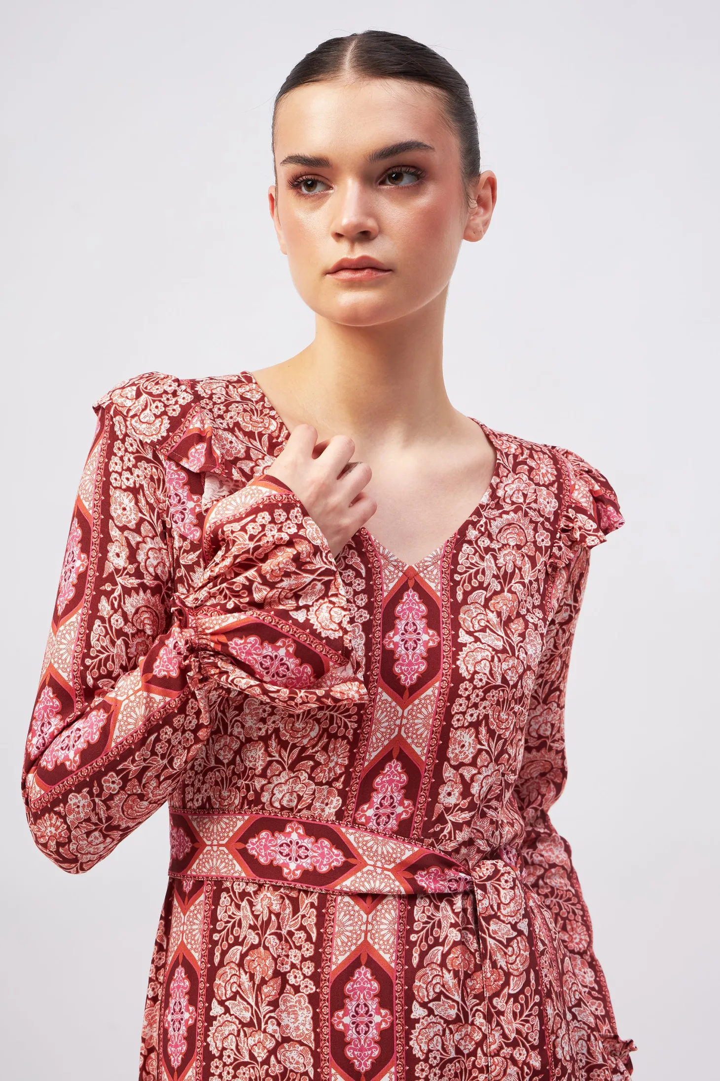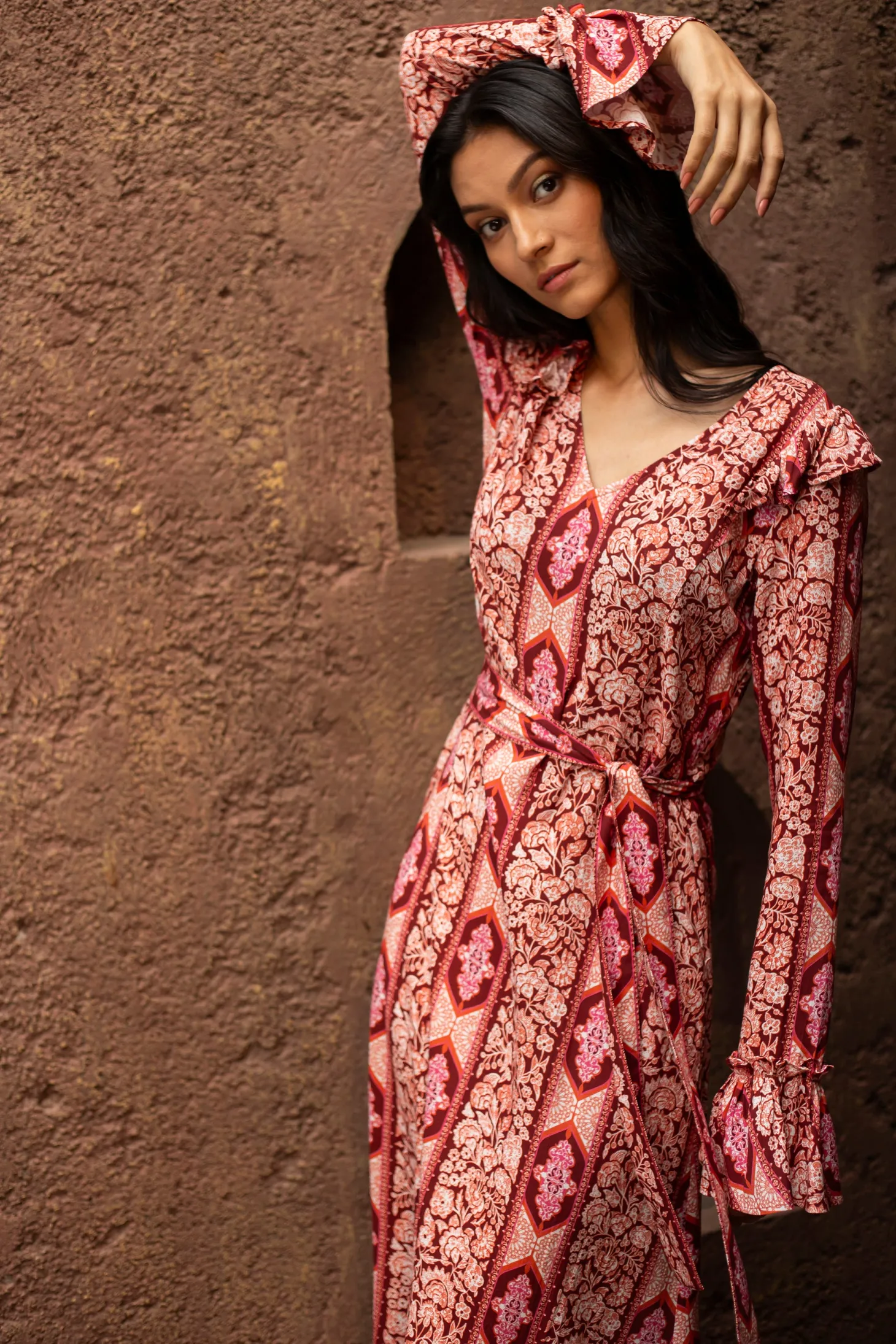 Channel timeless glamour with our Hedy dress featuring a chic V-neck, a fitted bodice and slender A-line that falls in a gently flared hem. The included belt ensures an even more defined waist. Subtle ruffle details add a touch of refinement, making it the perfect choice for effortlessly elegant holiday fêtes.Arabesque draws inspiration from the Moorish architecture in Casablanca’s “Habbous” neighbour- hood. The intricate, interlacing geometric patterns mirror the centuries-old Moroccan artistry.