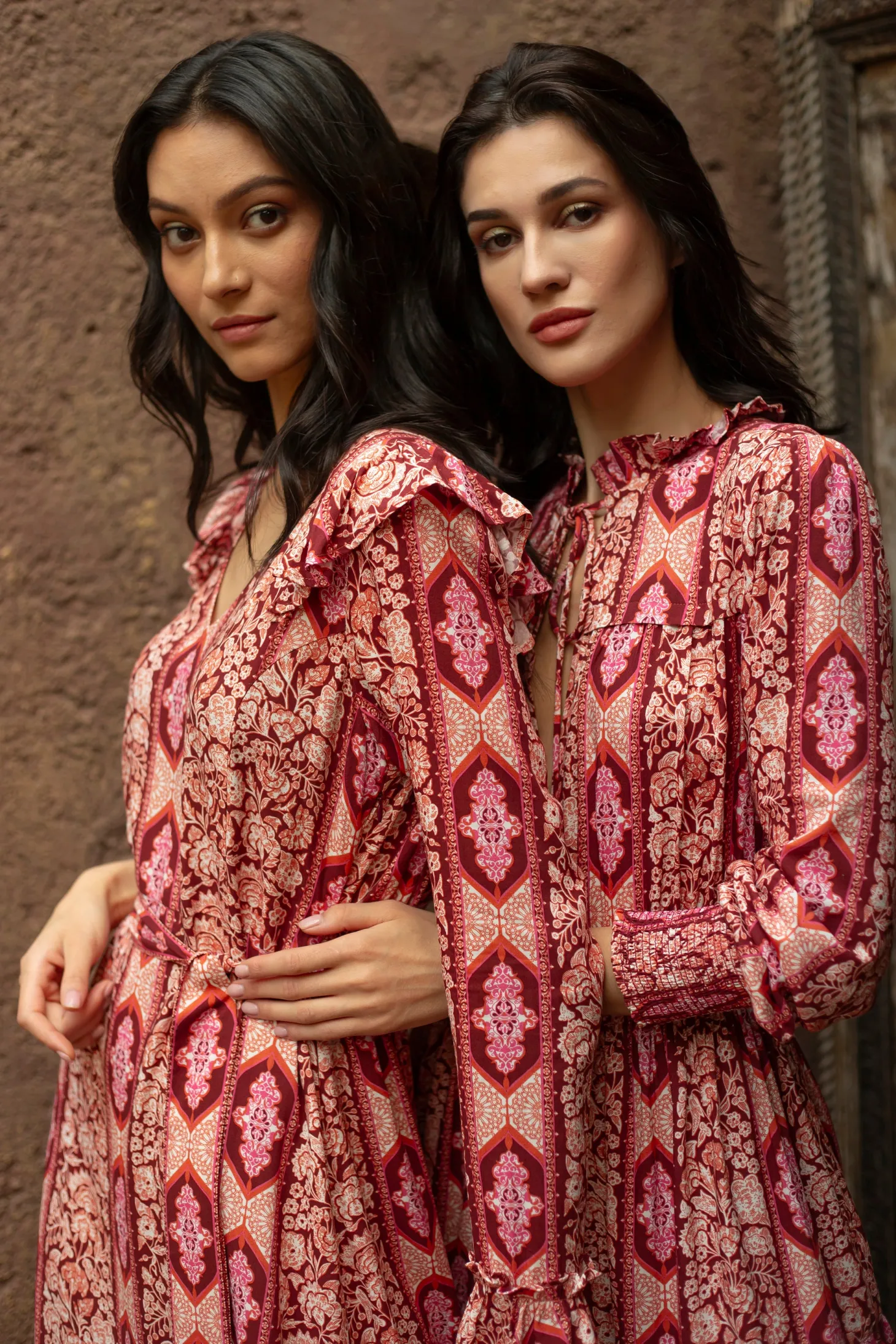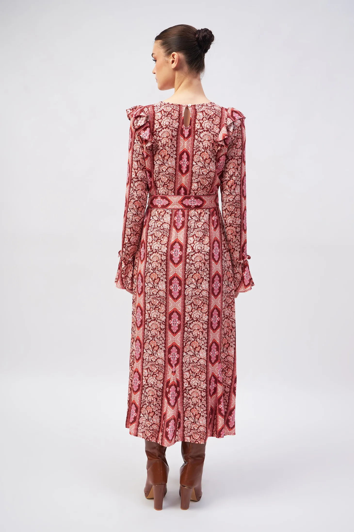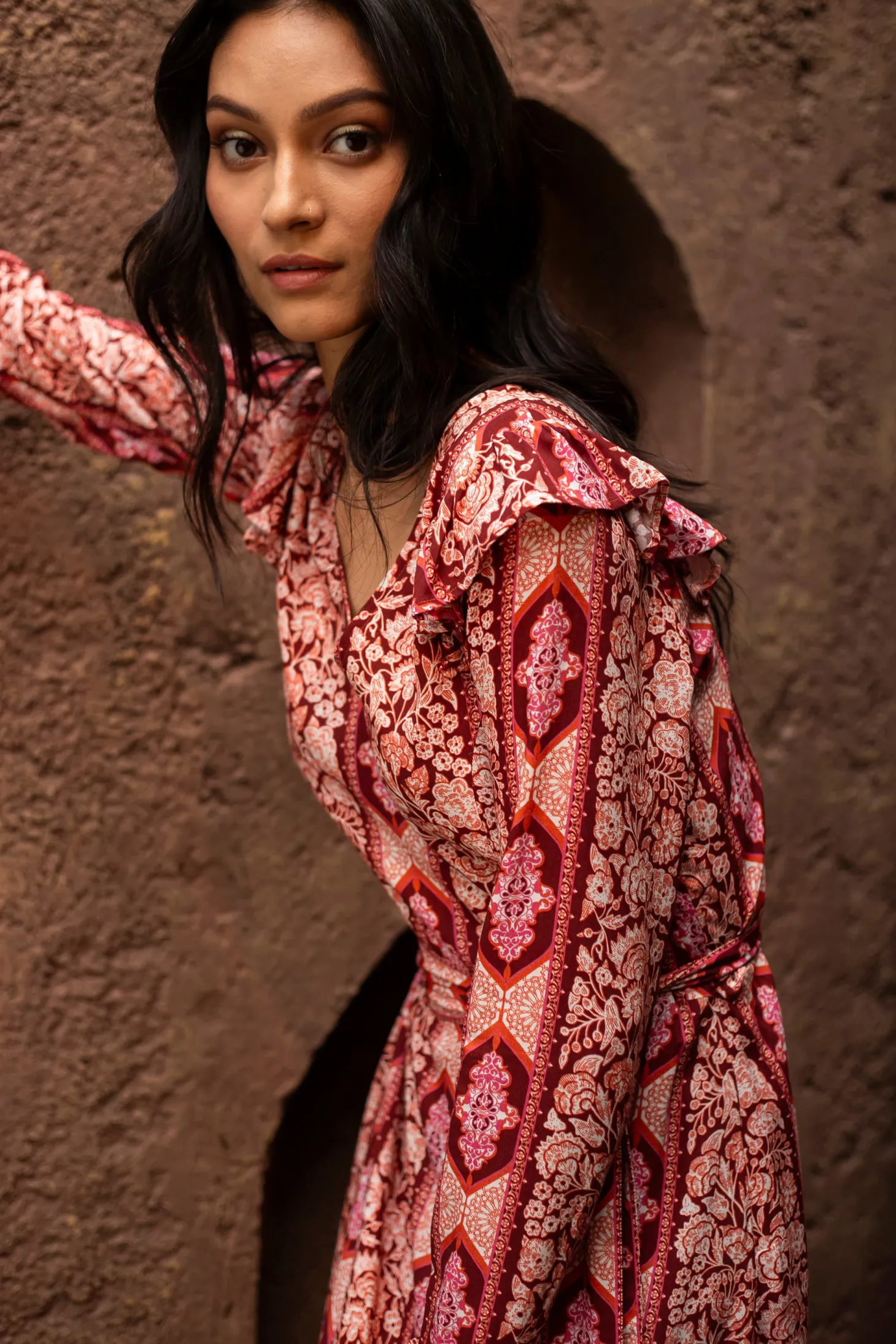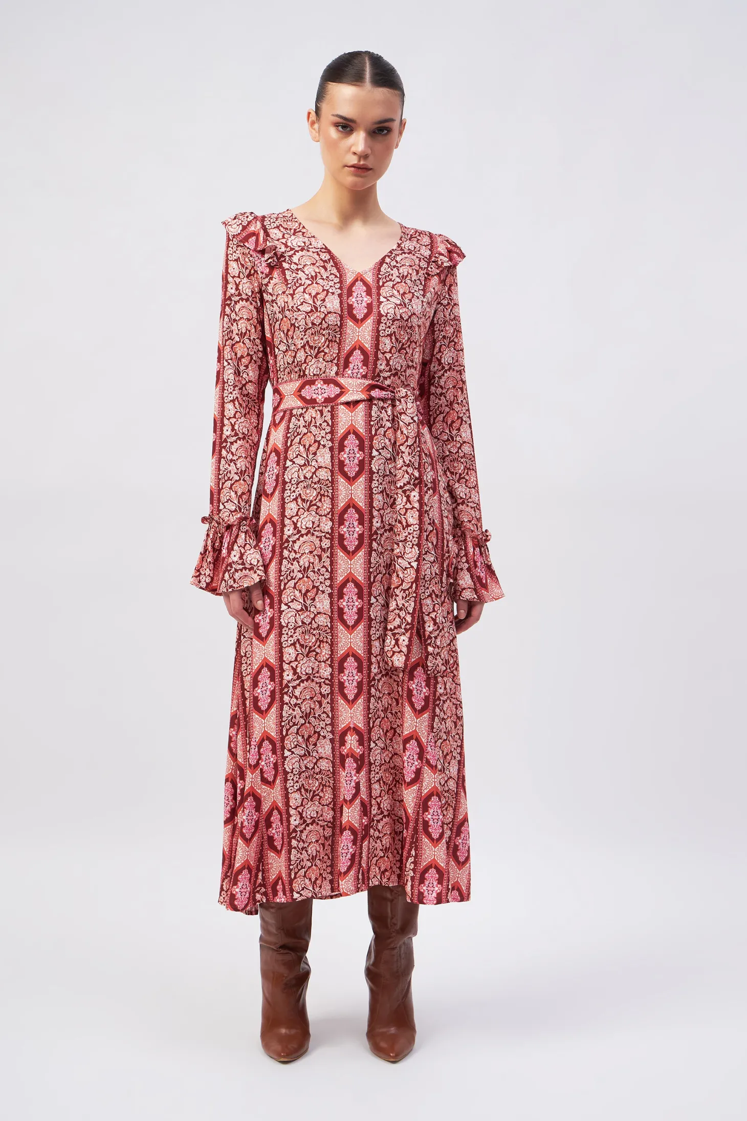 Channel timeless glamour with our Hedy dress featuring a chic V-neck, a fitted bodice and slender A-line that falls in a gently flared hem. The included belt ensures an even more defined waist. Subtle ruffle details add a touch of refinement, making it the perfect choice for effortlessly elegant holiday fêtes.Arabesque draws inspiration from the Moorish architecture in Casablanca’s “Habbous” neighbour- hood. The intricate, interlacing geometric patterns mirror the centuries-old Moroccan artistry.