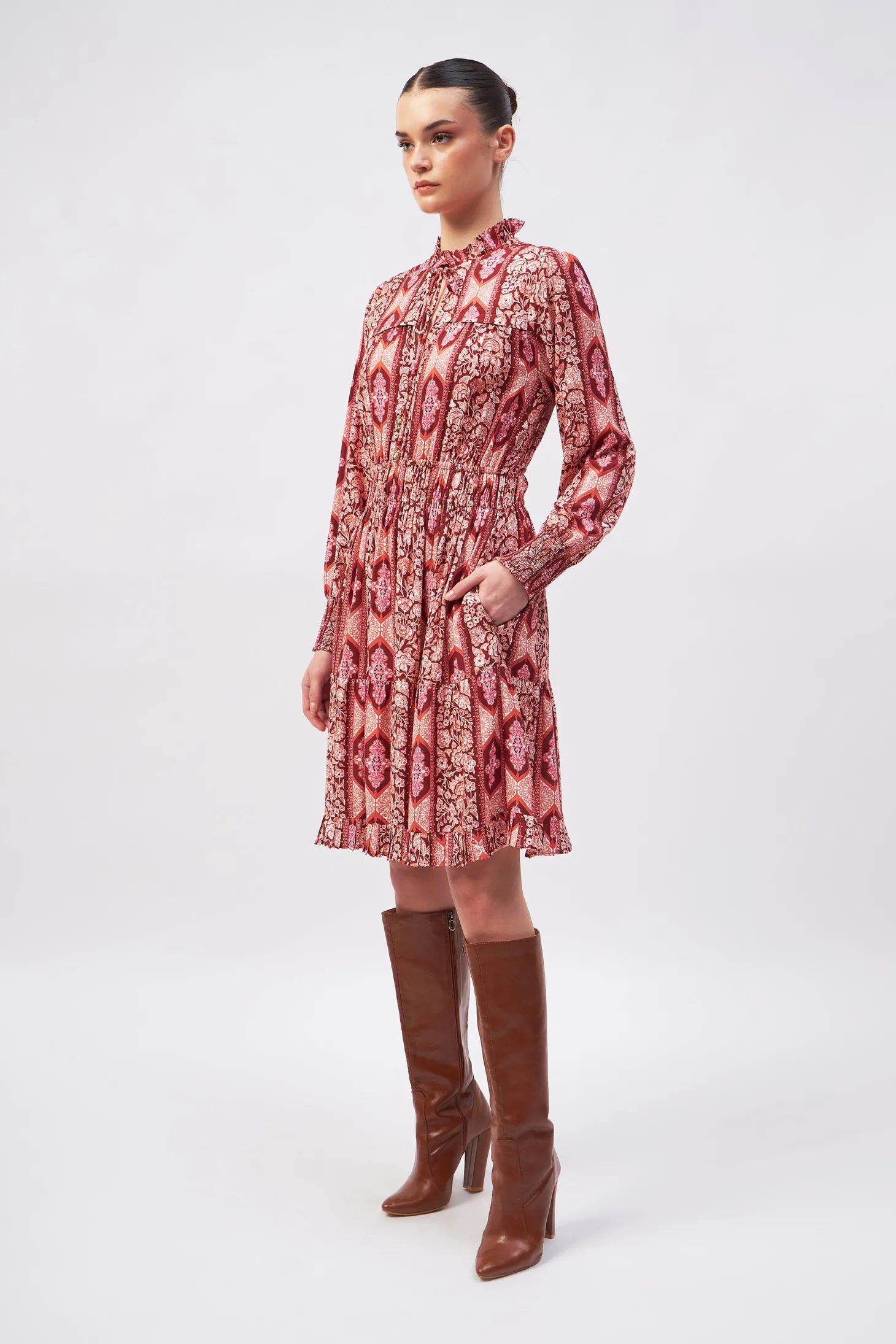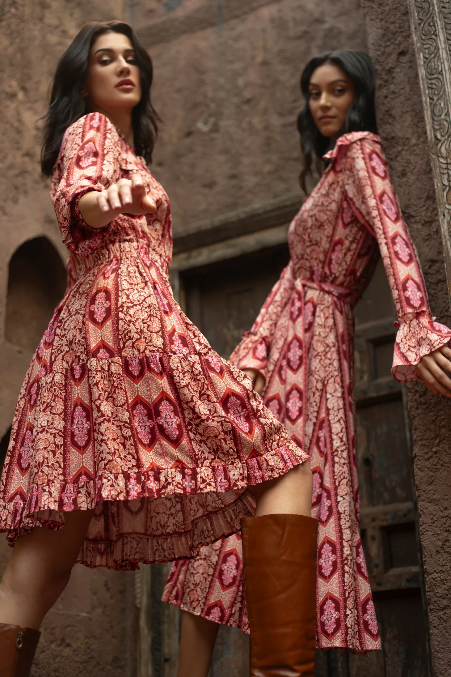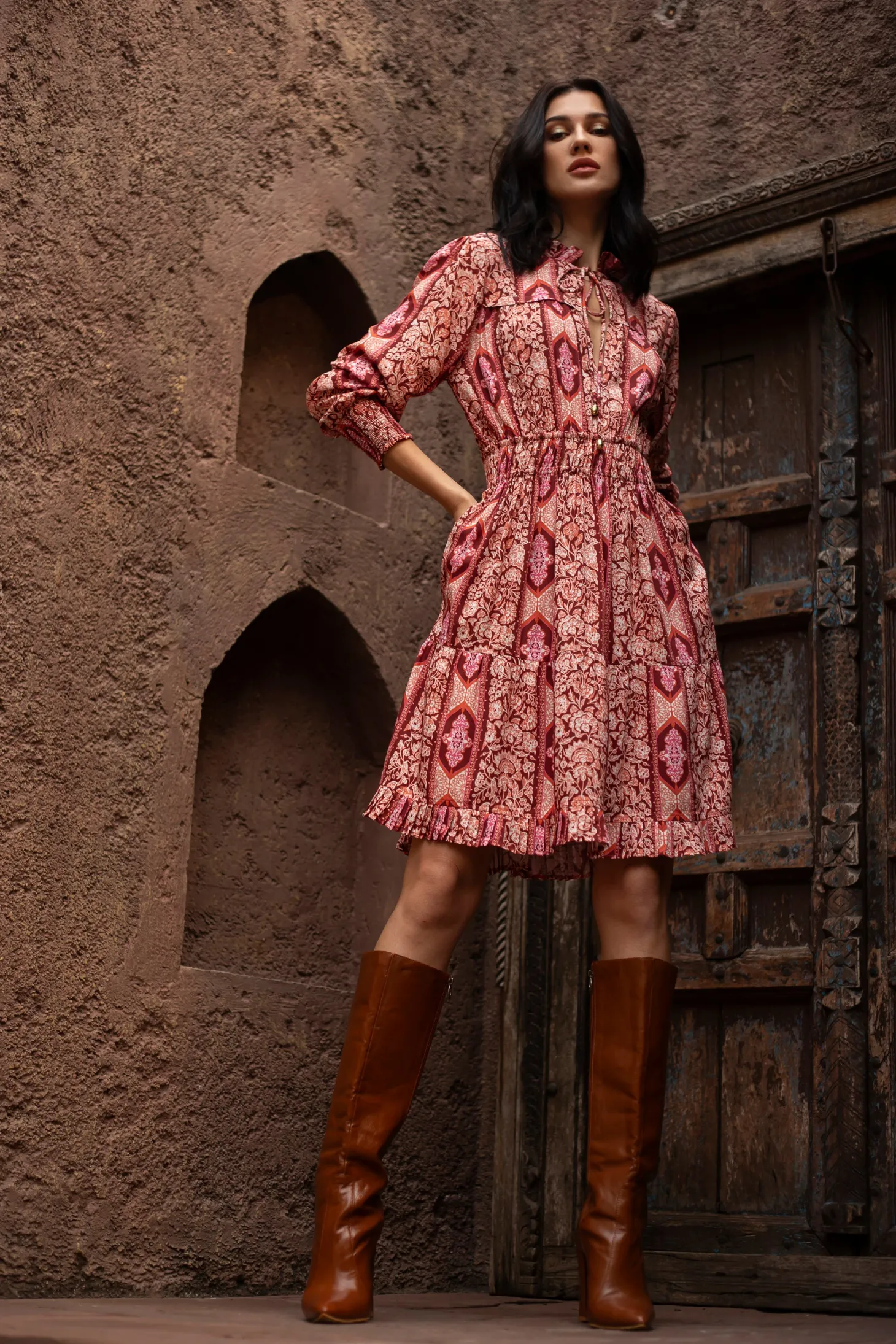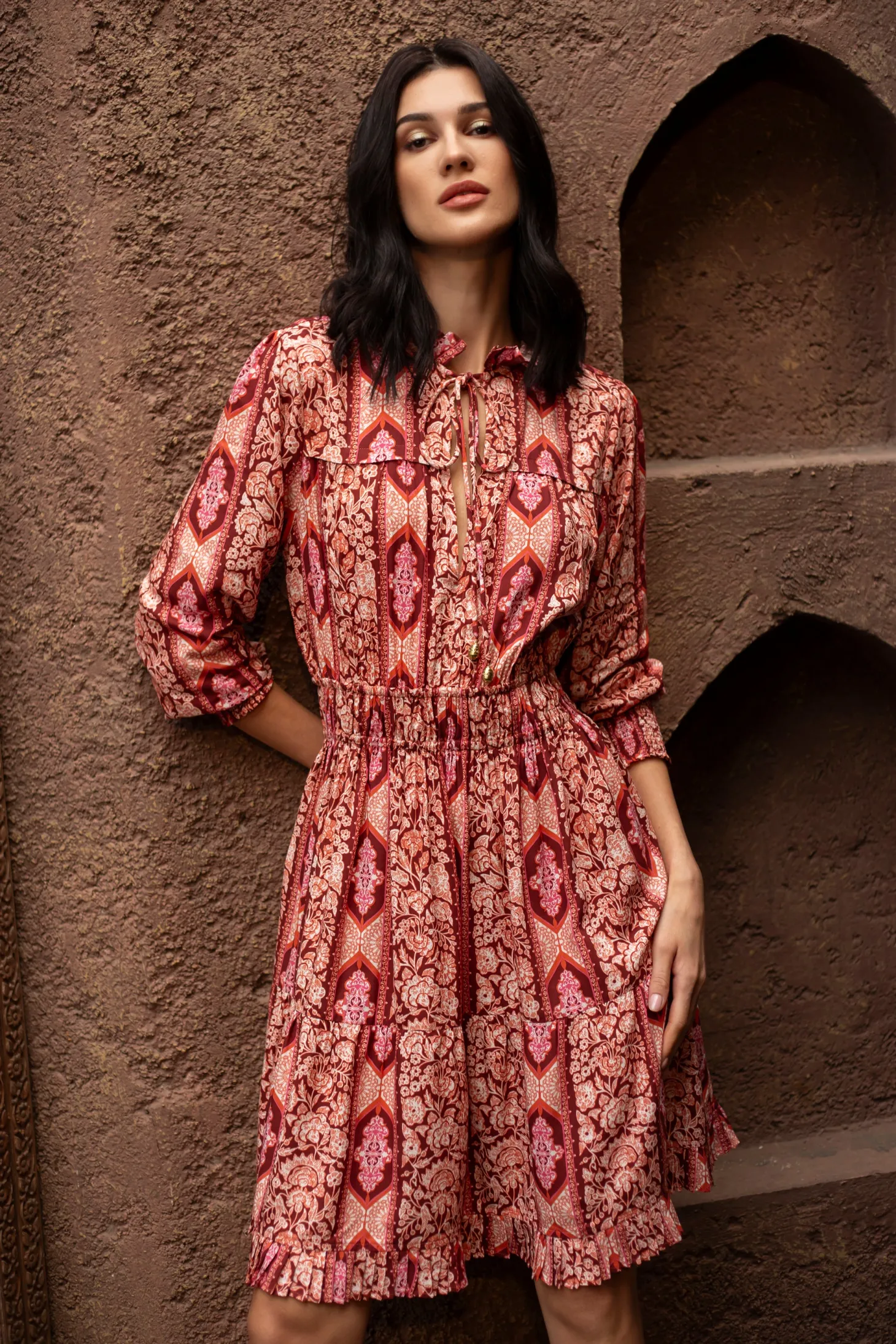 Our showstopper Alice dress features an elastic waist and smocked cuffs for a comfortable fit. The pleats on the collar, skirt and bodice give it a romantic touch. The collar ties feature custom brass embellishments with Moroccan engravings. Arabesque draws inspiration from the Moorish architecture in Casablanca’s “Habbous” neighbour- hood. The intricate, interlacing geometric patterns mirror the centuries-old Moroccan artistry.