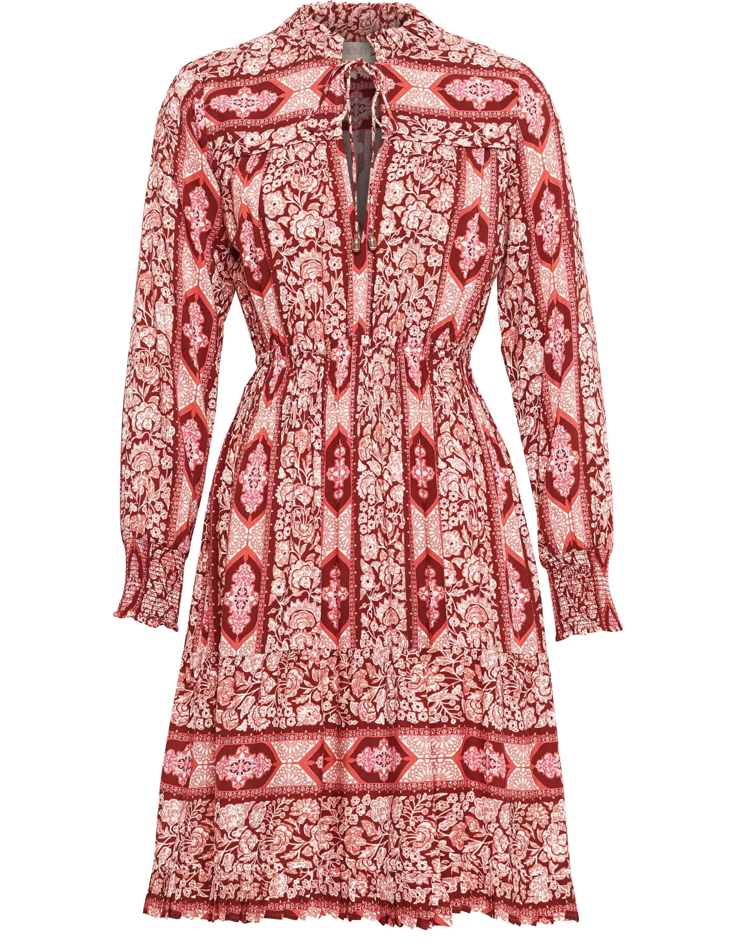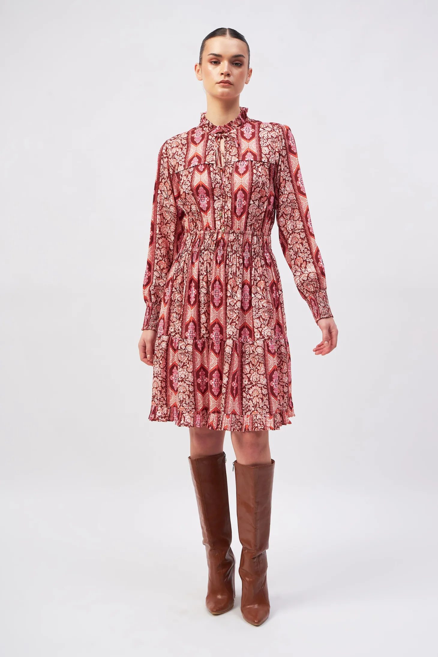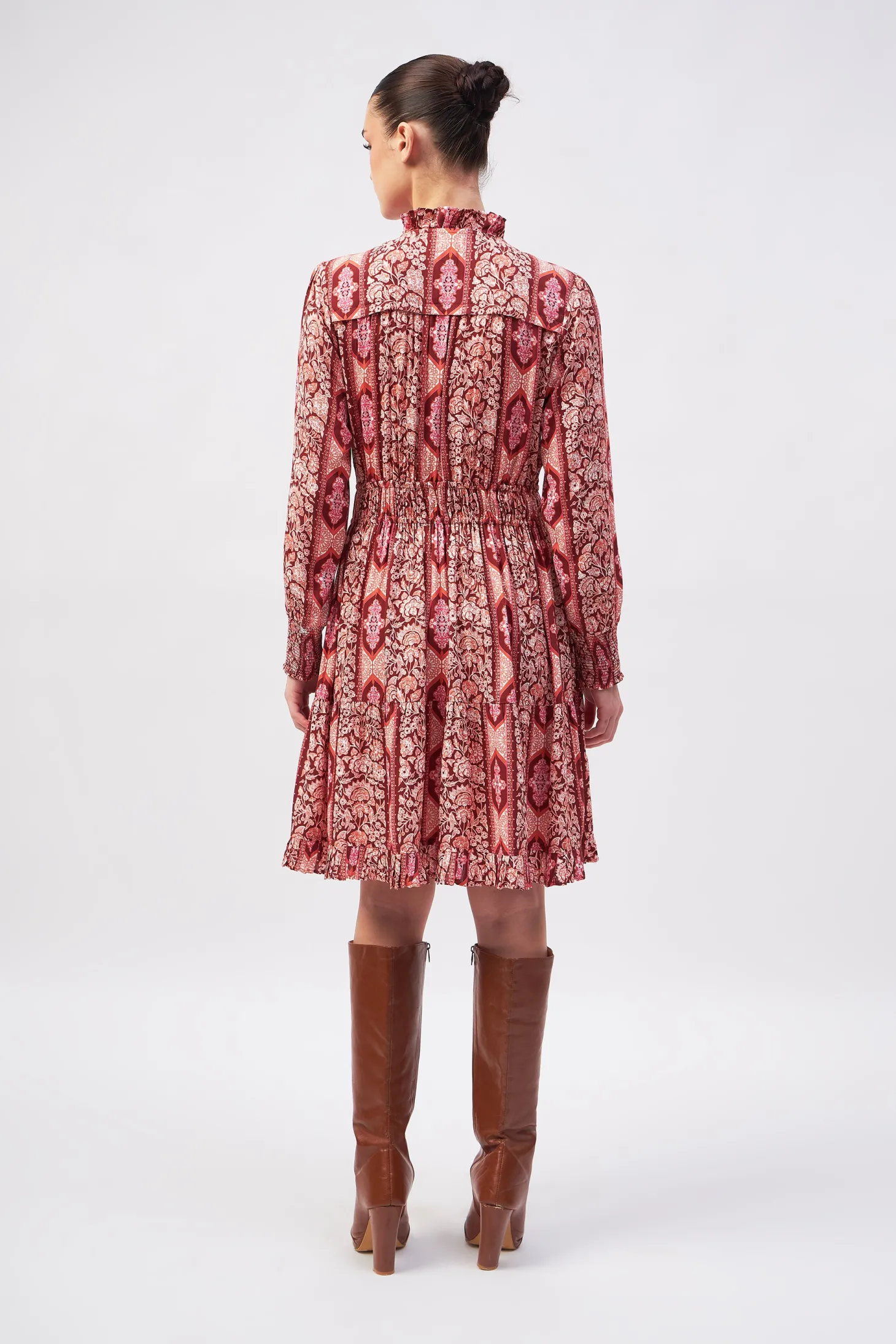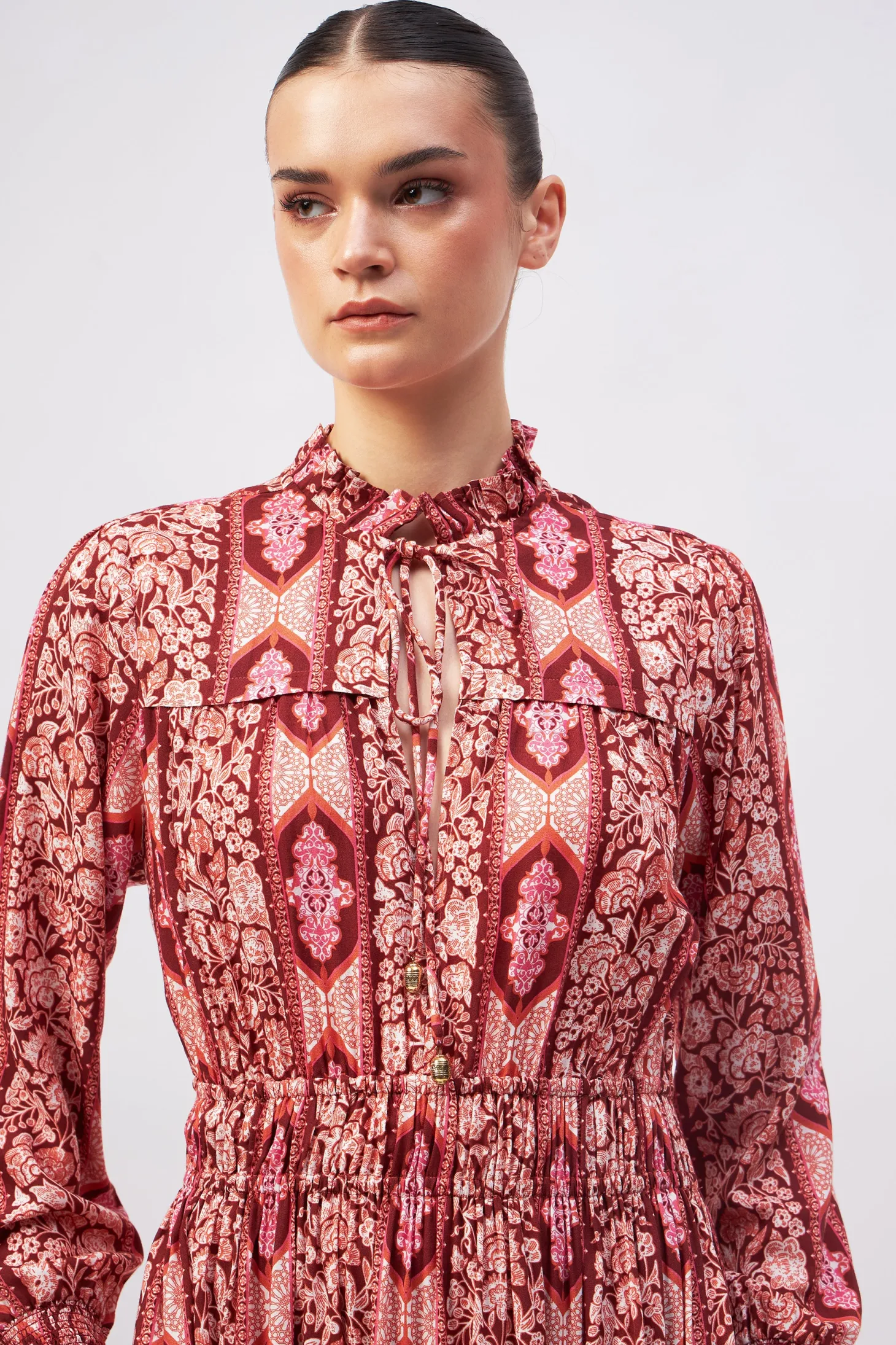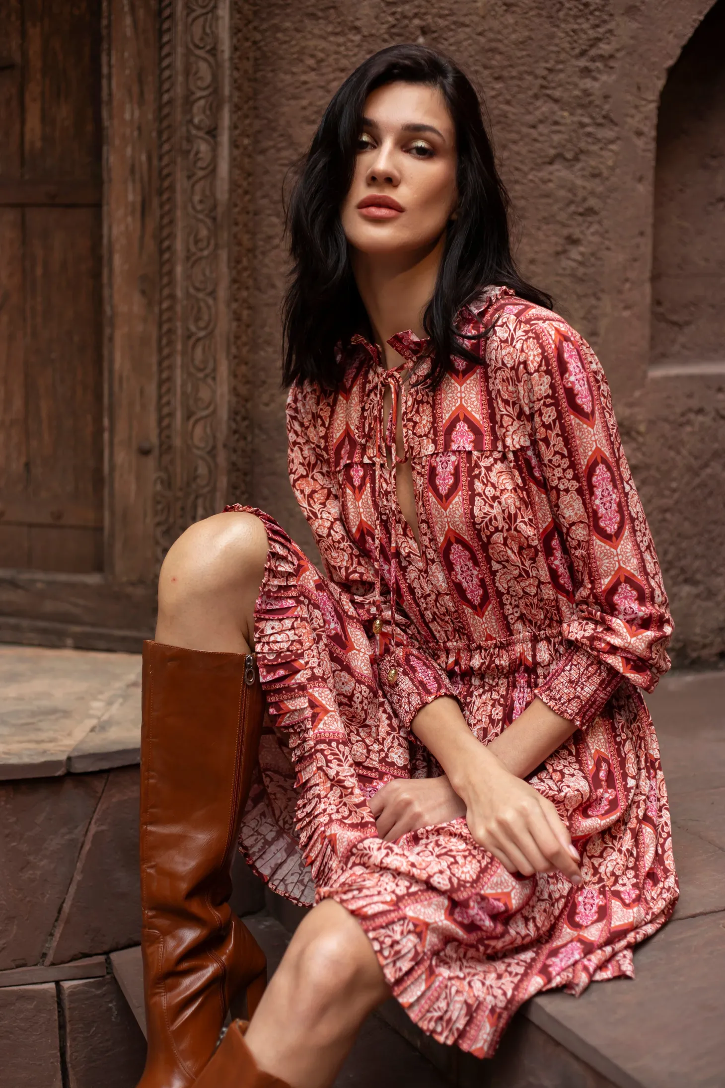 Our showstopper Alice dress features an elastic waist and smocked cuffs for a comfortable fit. The pleats on the collar, skirt and bodice give it a romantic touch. The collar ties feature custom brass embellishments with Moroccan engravings. Arabesque draws inspiration from the Moorish architecture in Casablanca’s “Habbous” neighbour- hood. The intricate, interlacing geometric patterns mirror the centuries-old Moroccan artistry.