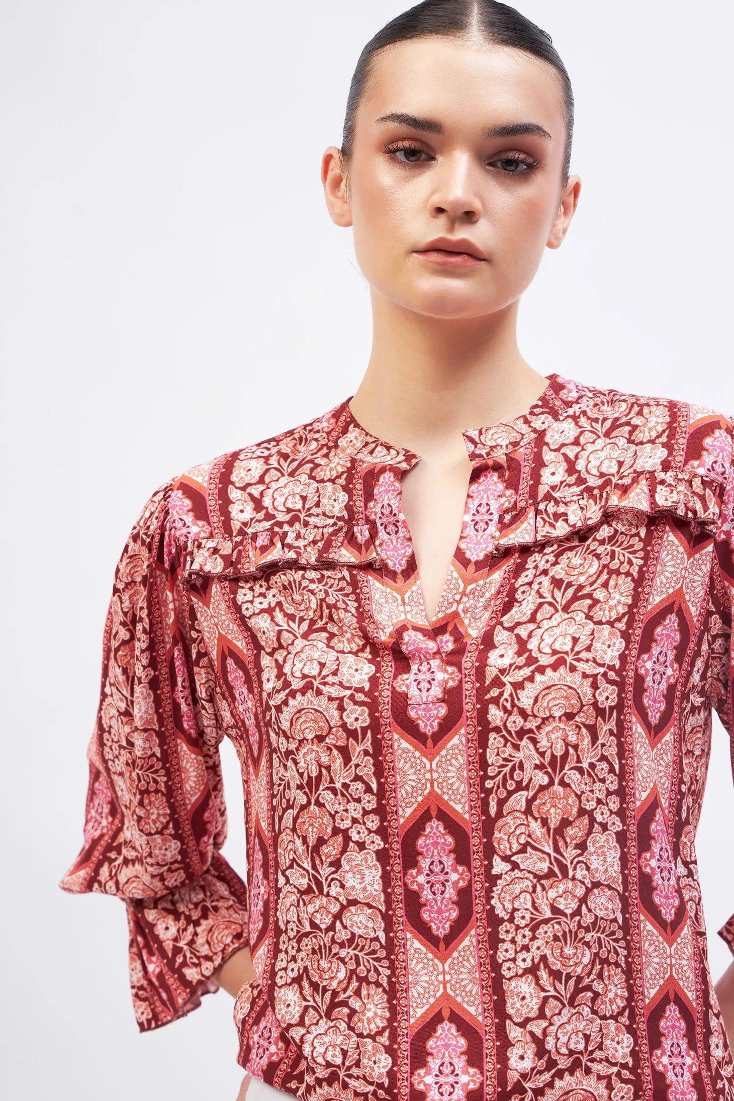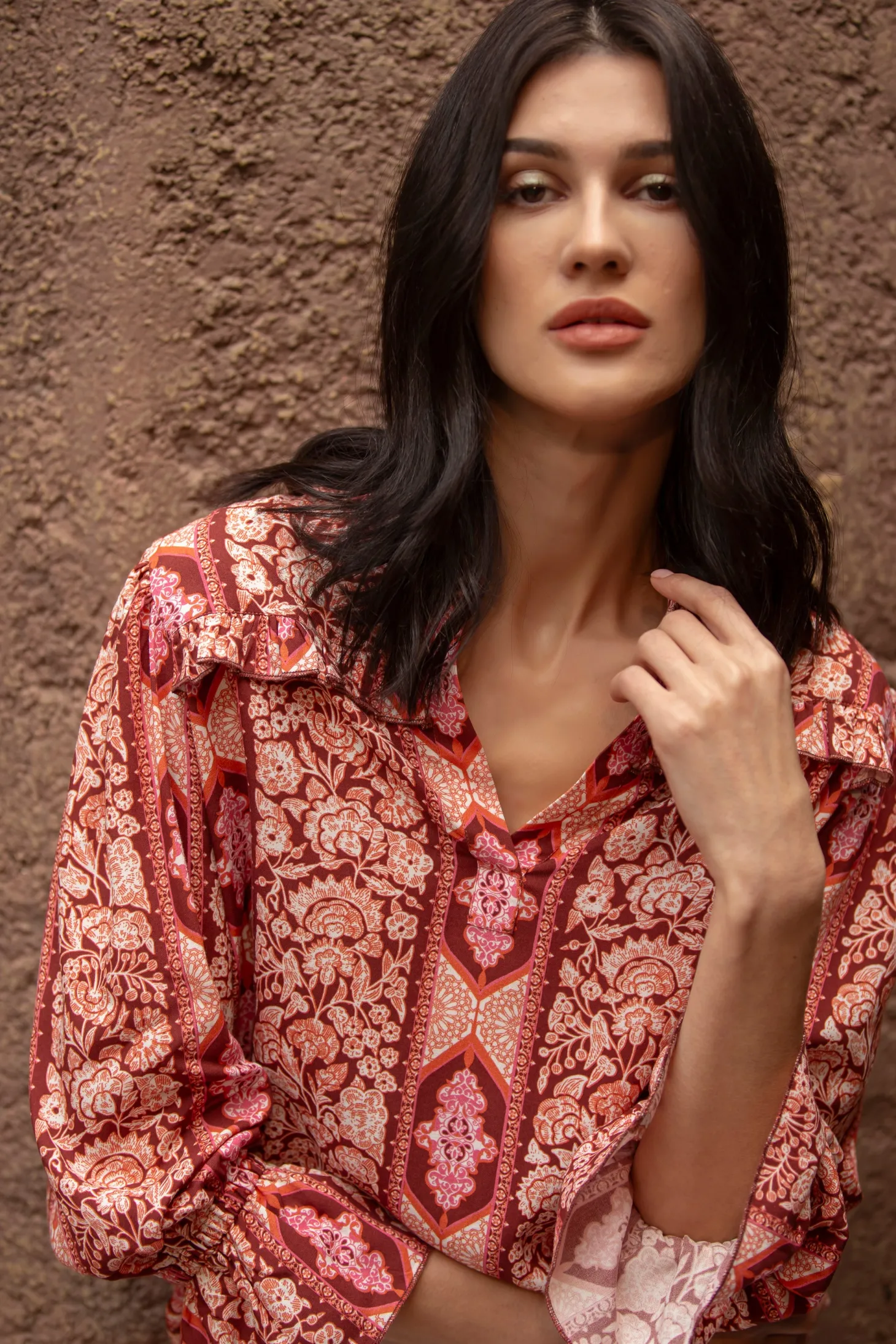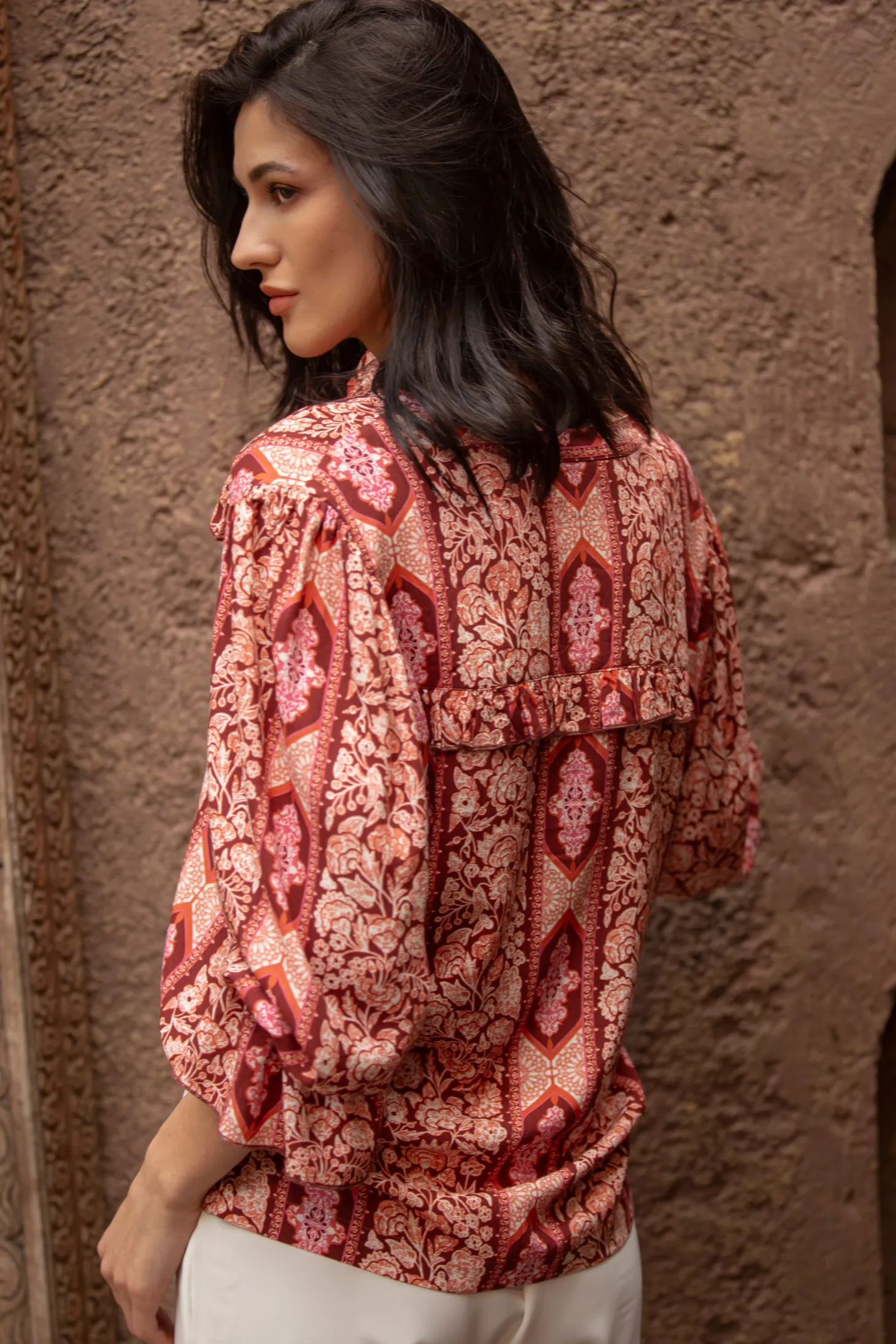 With its slightly puffed 3/4 sleeves, relaxed cut and delicate ruffle details, the Stella is a winner all year round. Pair it with our Gia Midi skirt or with Denim for a casual look.Arabesque draws inspiration from the Moorish architecture in Casablanca’s “Habbous” neighbour- hood. The intricate, interlacing geometric patterns mirror the centuries-old Moroccan artistry.