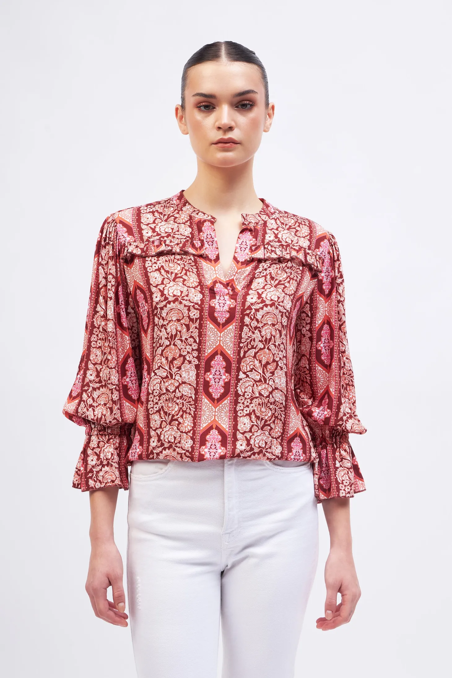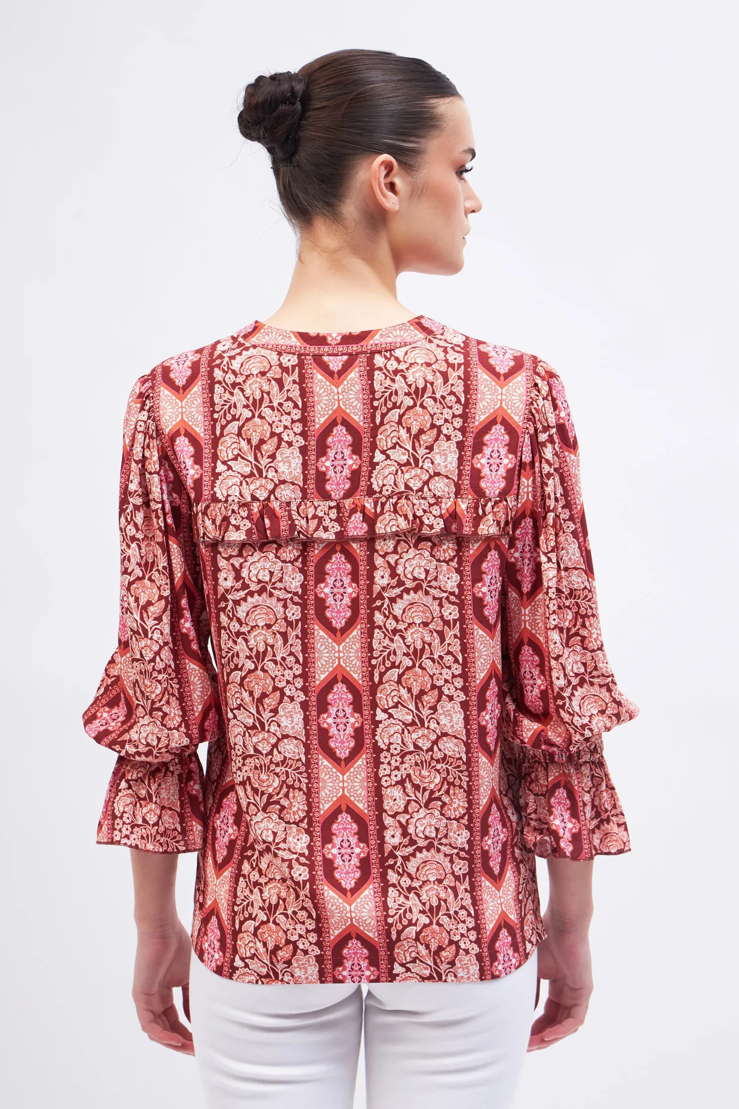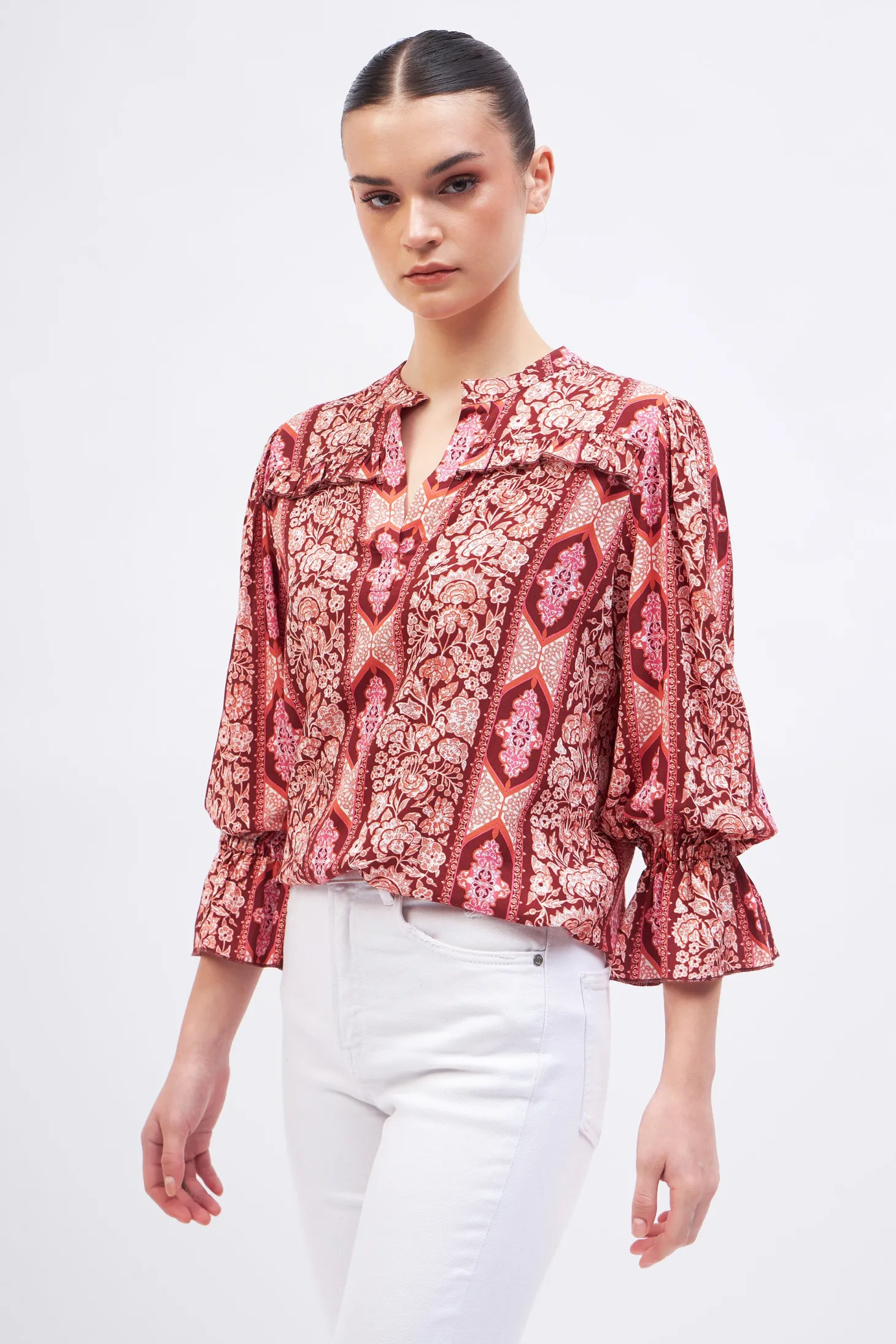 With its slightly puffed 3/4 sleeves, relaxed cut and delicate ruffle details, the Stella is a winner all year round. Pair it with our Gia Midi skirt or with Denim for a casual look.Arabesque draws inspiration from the Moorish architecture in Casablanca’s “Habbous” neighbour- hood. The intricate, interlacing geometric patterns mirror the centuries-old Moroccan artistry.