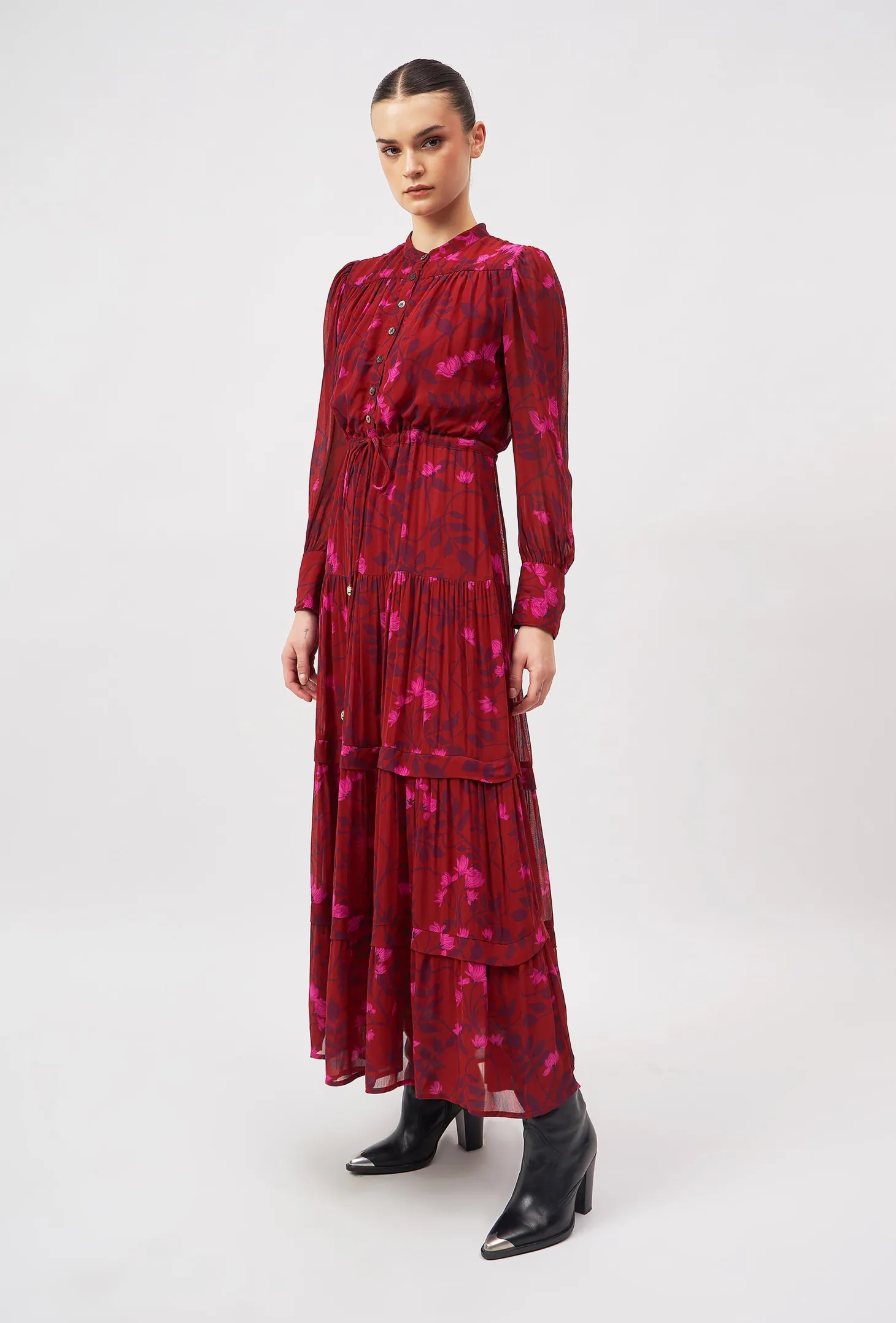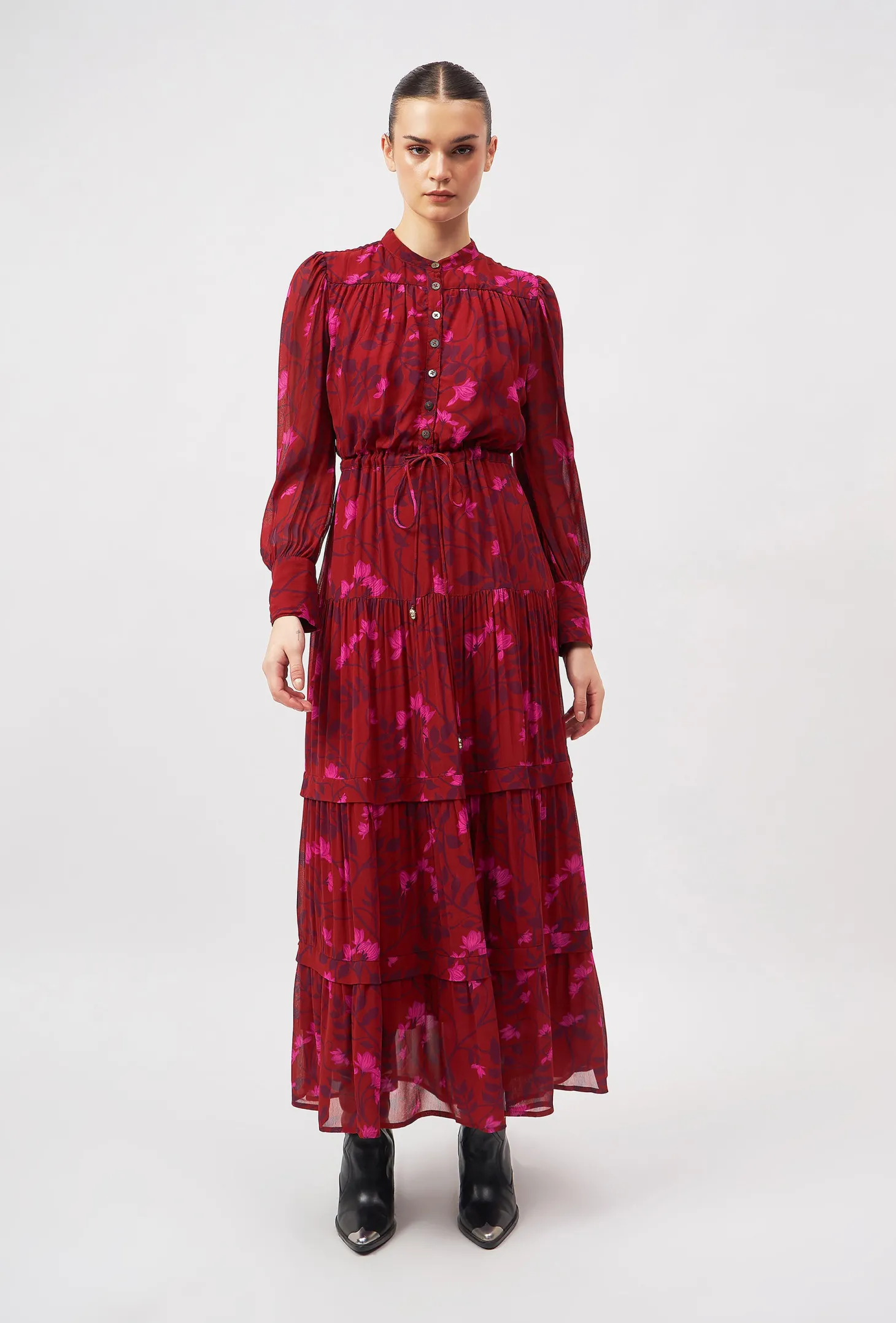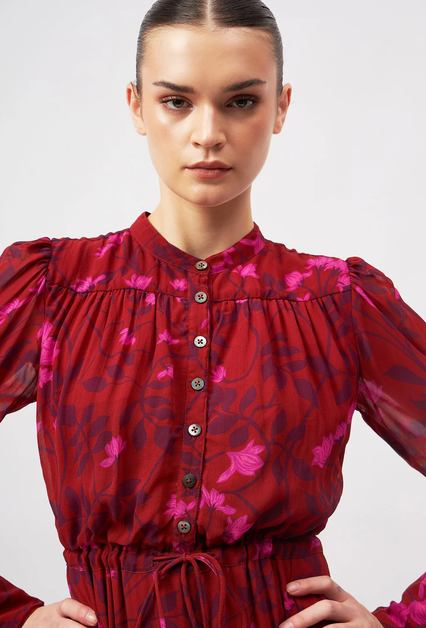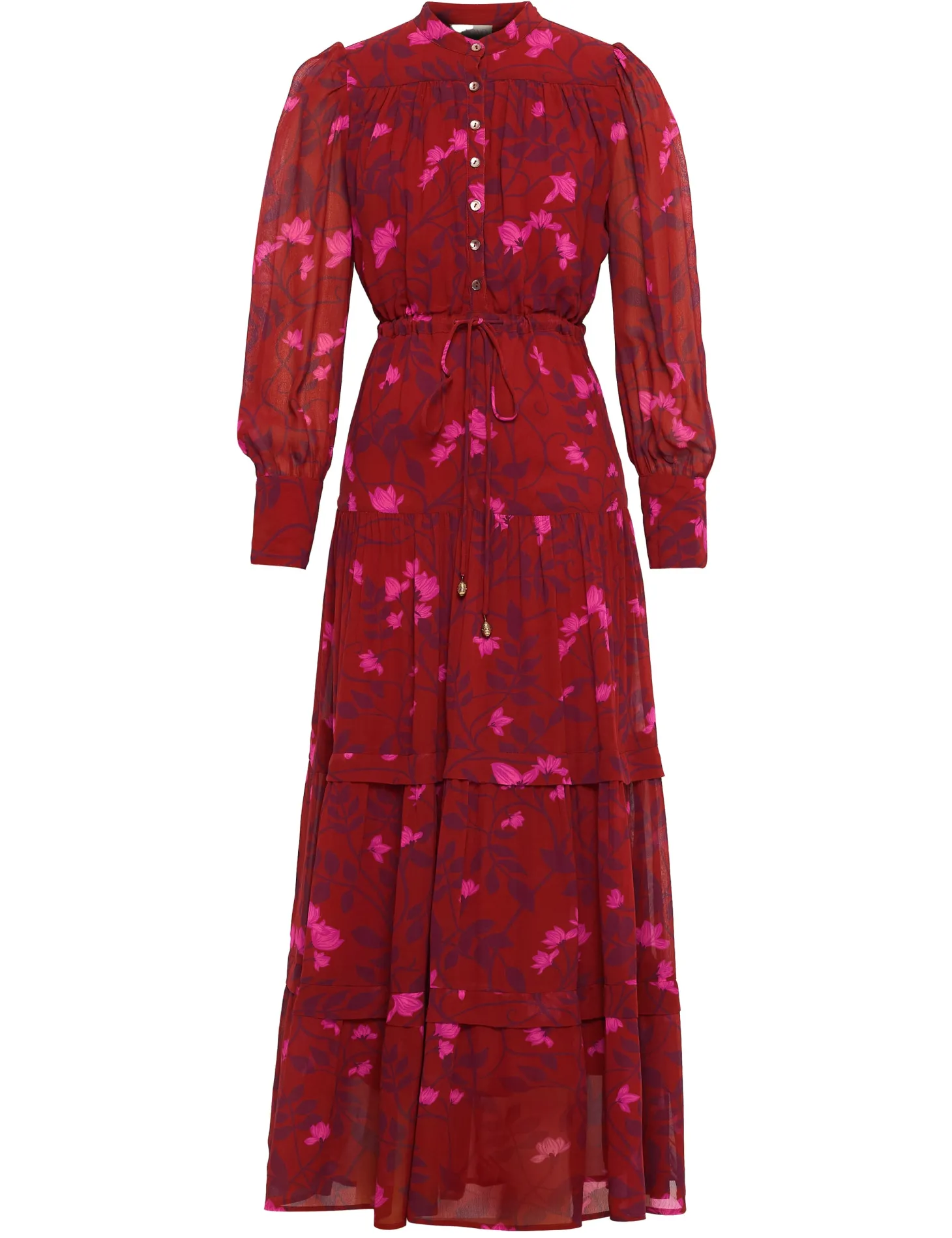 The structured sleeves, together with a romantic tiered A-line make the Sissi dress an instant icon. The self-tie cinch waist guarantees an impeccable fit. The collar ties feature custom brass embellishments with Moroccan engravings.The artwork references Jardin Majorelle, an iconic botanical garden in Marrakesh designed by a French painter. The print captures the vibrant hues of this Moroccan oasis.