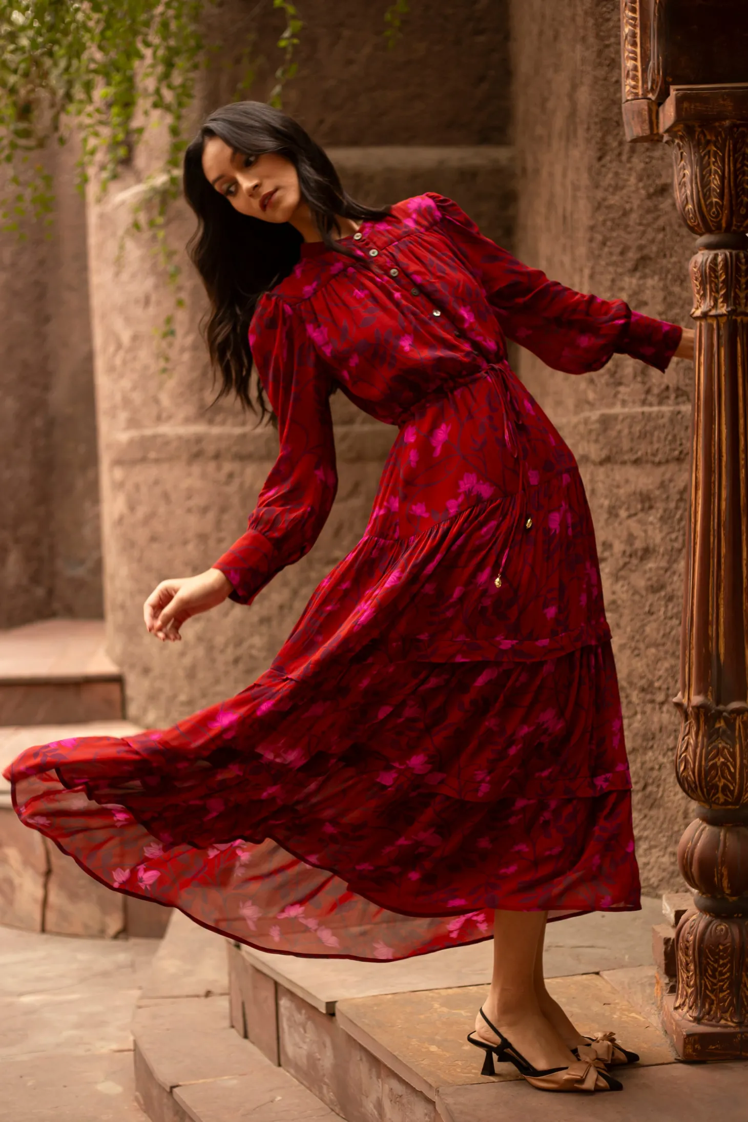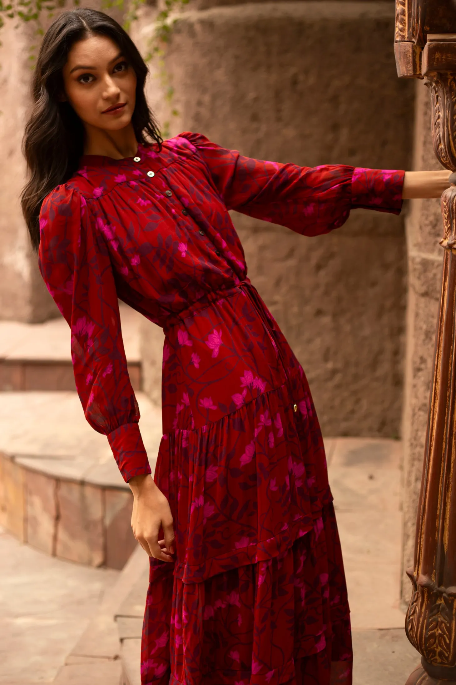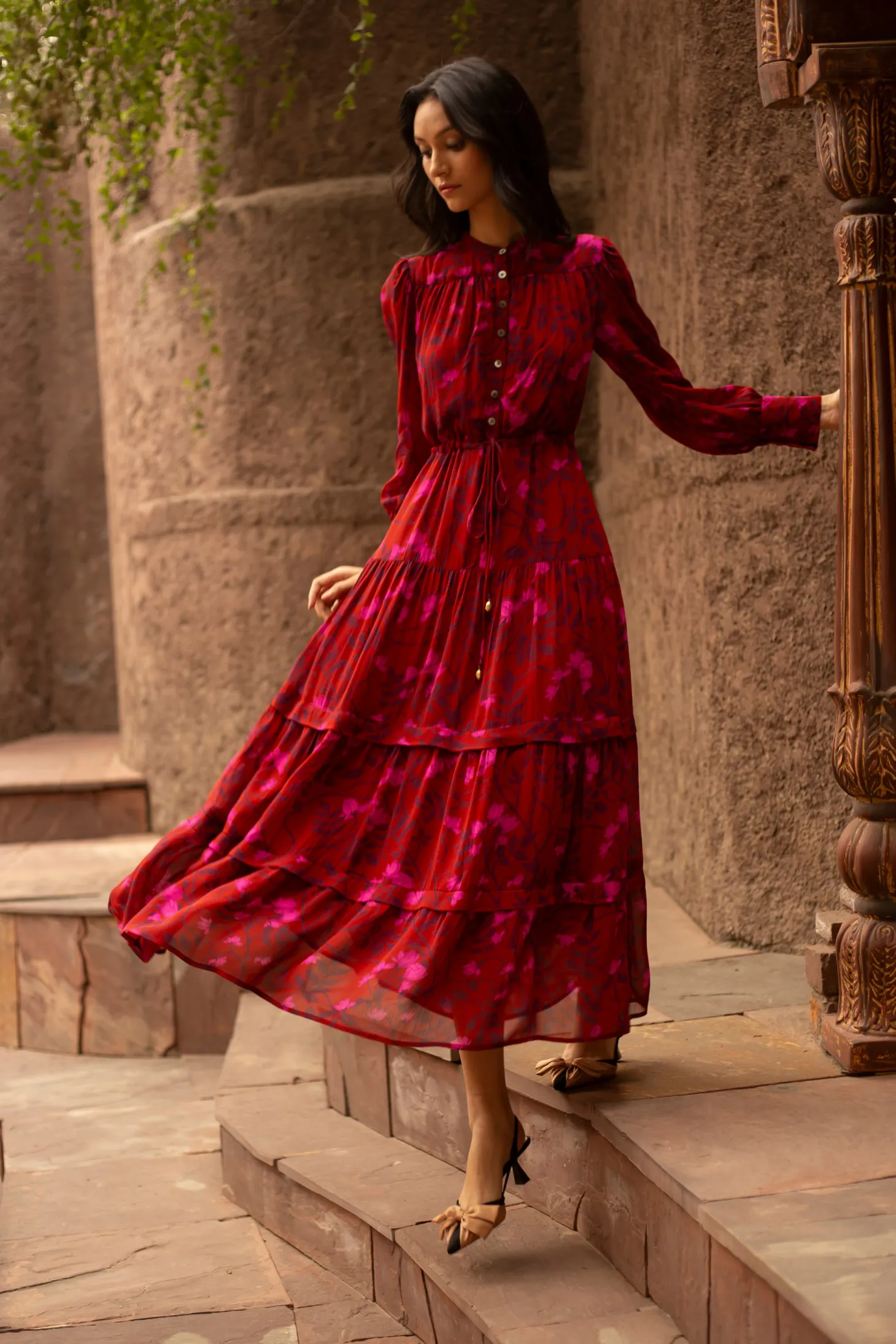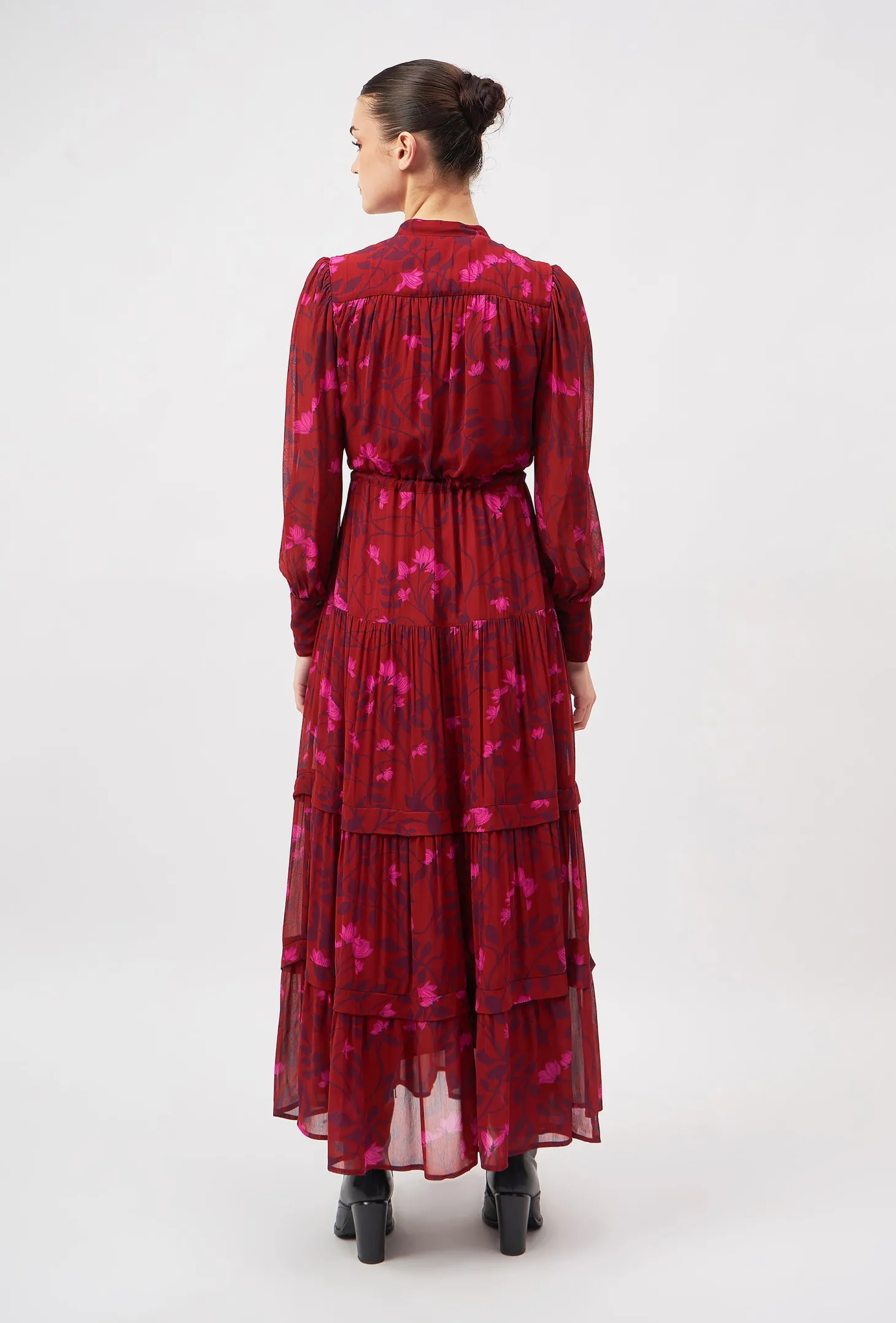 The structured sleeves, together with a romantic tiered A-line make the Sissi dress an instant icon. The self-tie cinch waist guarantees an impeccable fit. The collar ties feature custom brass embellishments with Moroccan engravings.The artwork references Jardin Majorelle, an iconic botanical garden in Marrakesh designed by a French painter. The print captures the vibrant hues of this Moroccan oasis.