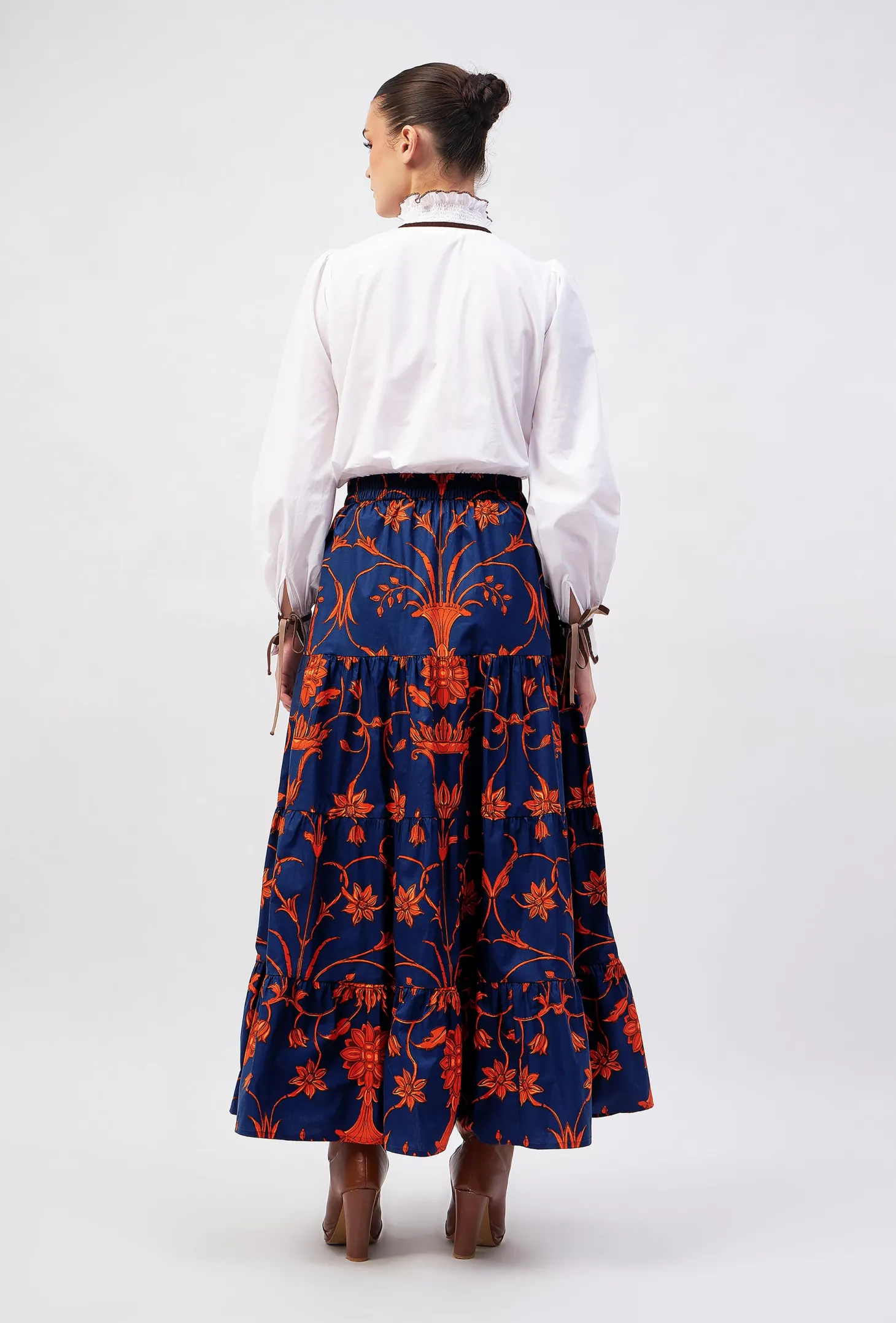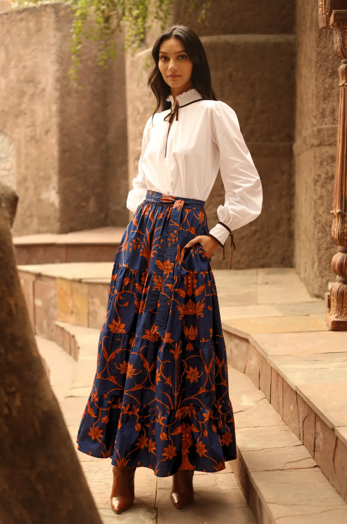 The Gia skirt is back in a new intriguing print. The elastic waist, self-tie belt, tiered A-line and hidden pockets channel elegance with ease. Pair it with a chic blouse or dress down with a white t-shirt and trainers.The print design is influenced by ancient Berber-Roman stone carvings found near the city of Meknes in Morocco. The artwork references stylized floral motifs set in perfect symmetry.