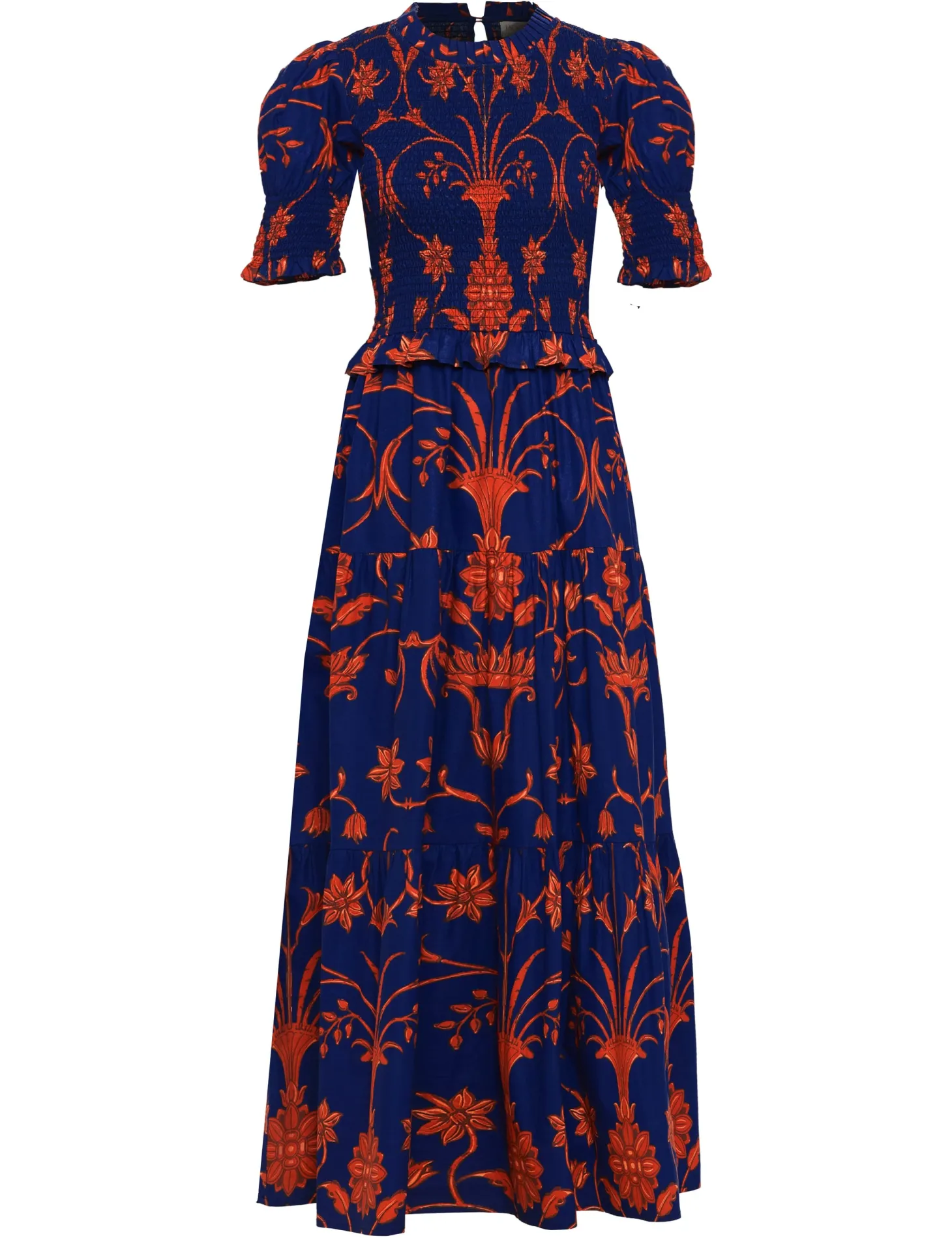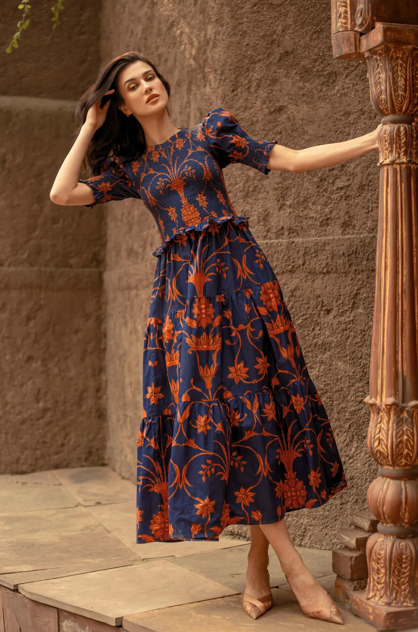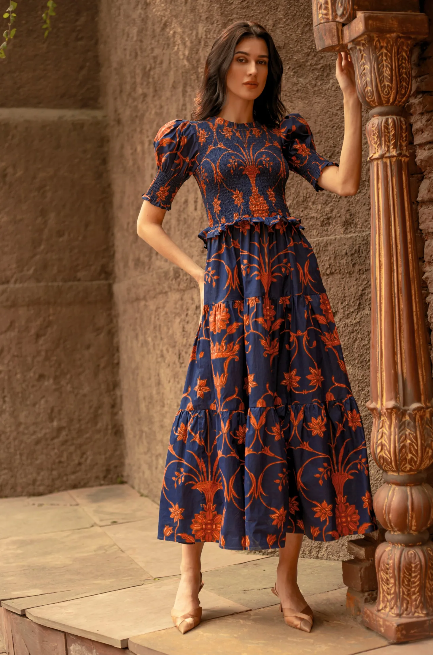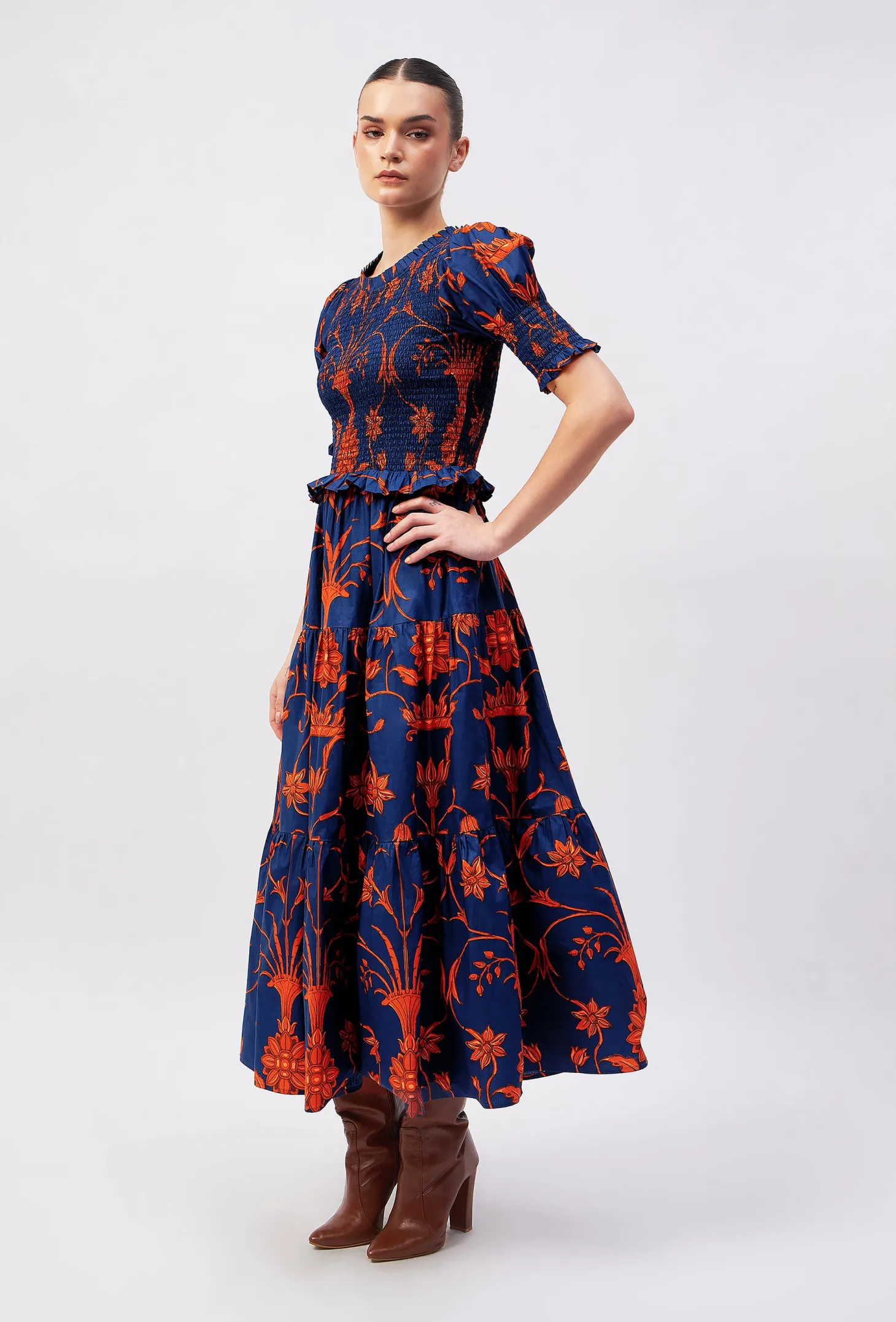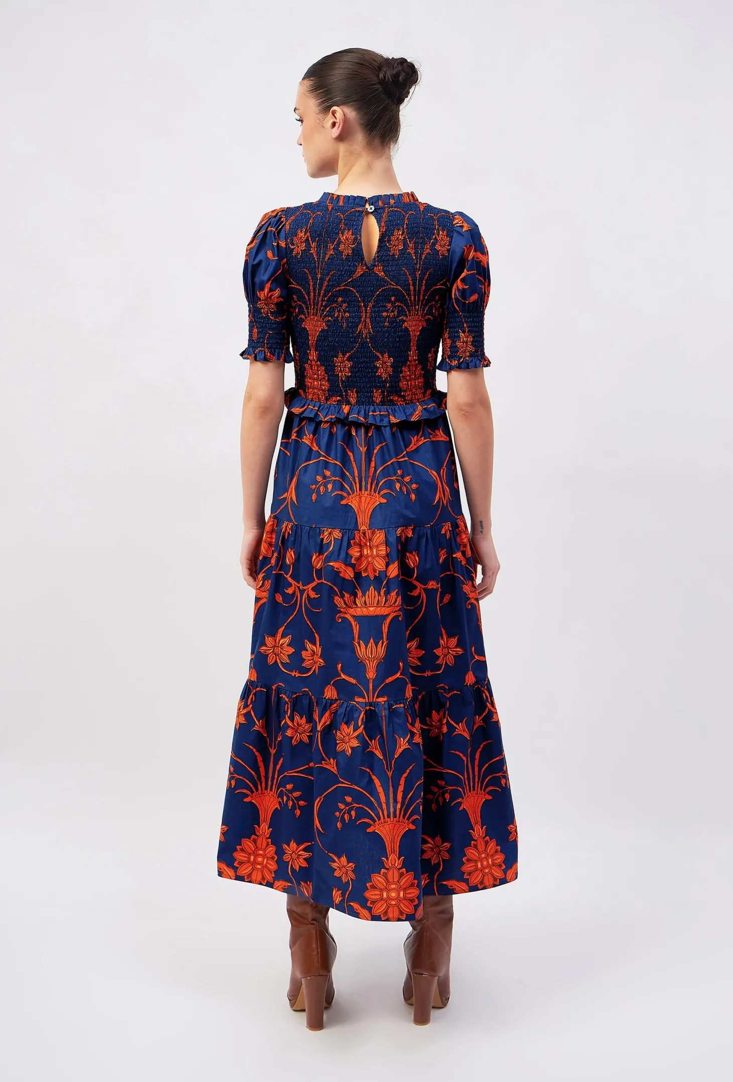The Klara strikes the right balance between sophistication and ease with its smocked bodice, tiered A-line skirt and flattering puff sleeves. The delicate frills on the neckline, cuffs and waist give it an elegant touch.The print design is influenced by ancient Berber-Roman stone carvings found near the city of Meknes in Morocco. The artwork references stylized floral motifs set in perfect symmetry.