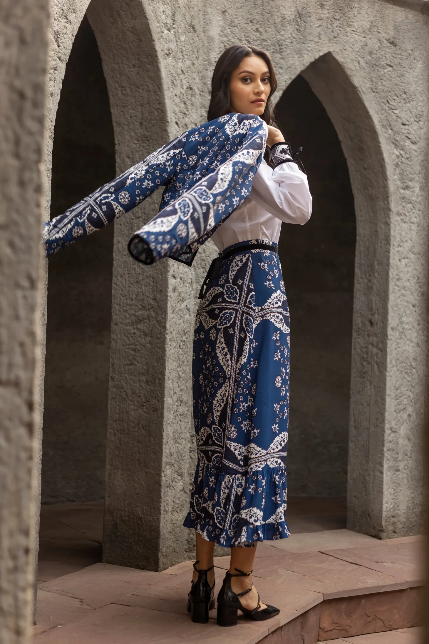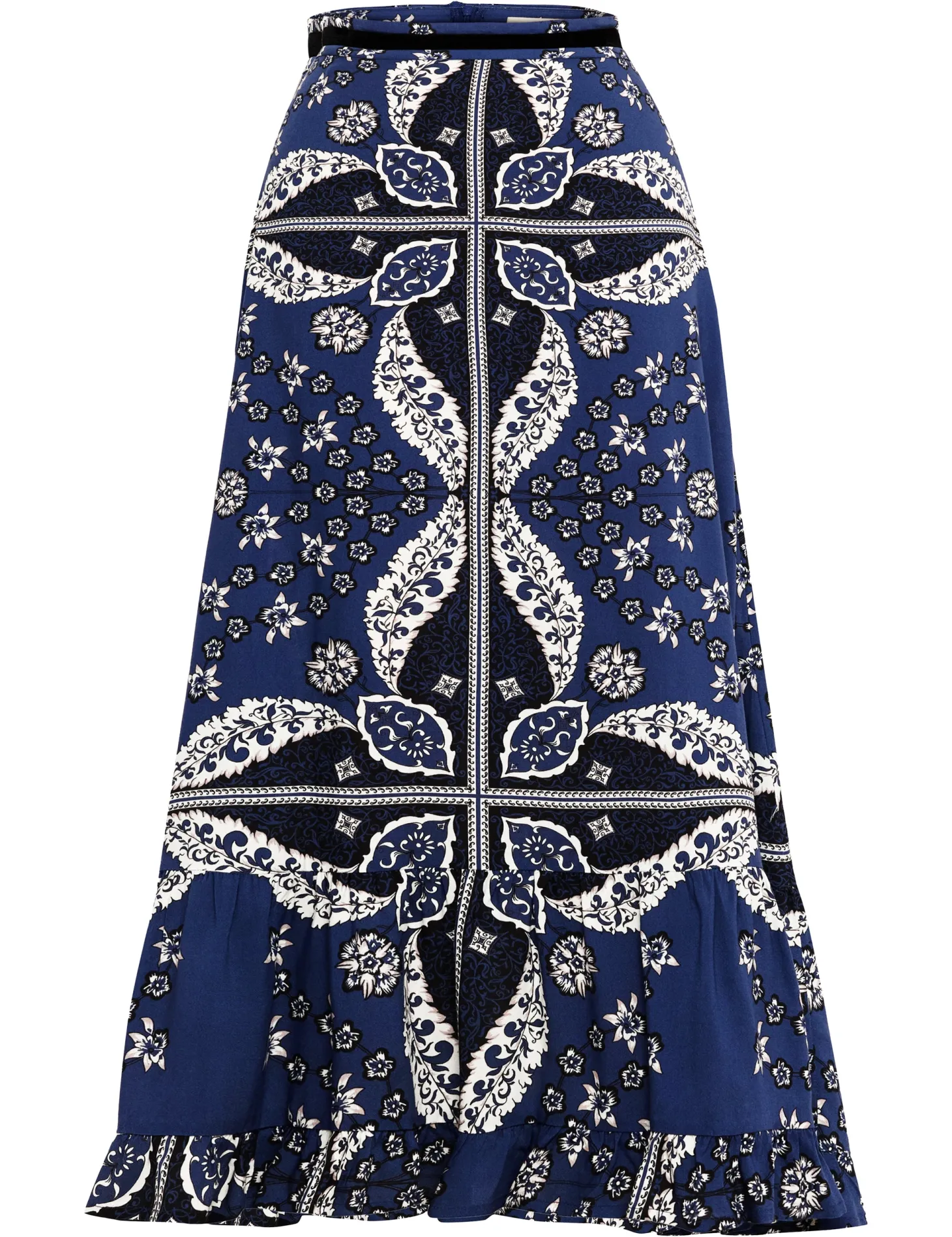 Introducing the Aurora, a flattering midi skirt for all occasions. Her high waist and adjustable velvet belt guarantee a flawless fit. The slender A-line falls to an elegant ruffled hem. Style her casually with flats or pair the Aurora with heels for a festive flair.Reflecting the charm of Bahia Palace in Marrakesh, this print design draws inspiration from the grand tiles of the palace, blending geometric elegance with whimsical ornaments in celebration of Moroccan mosaic artistry.