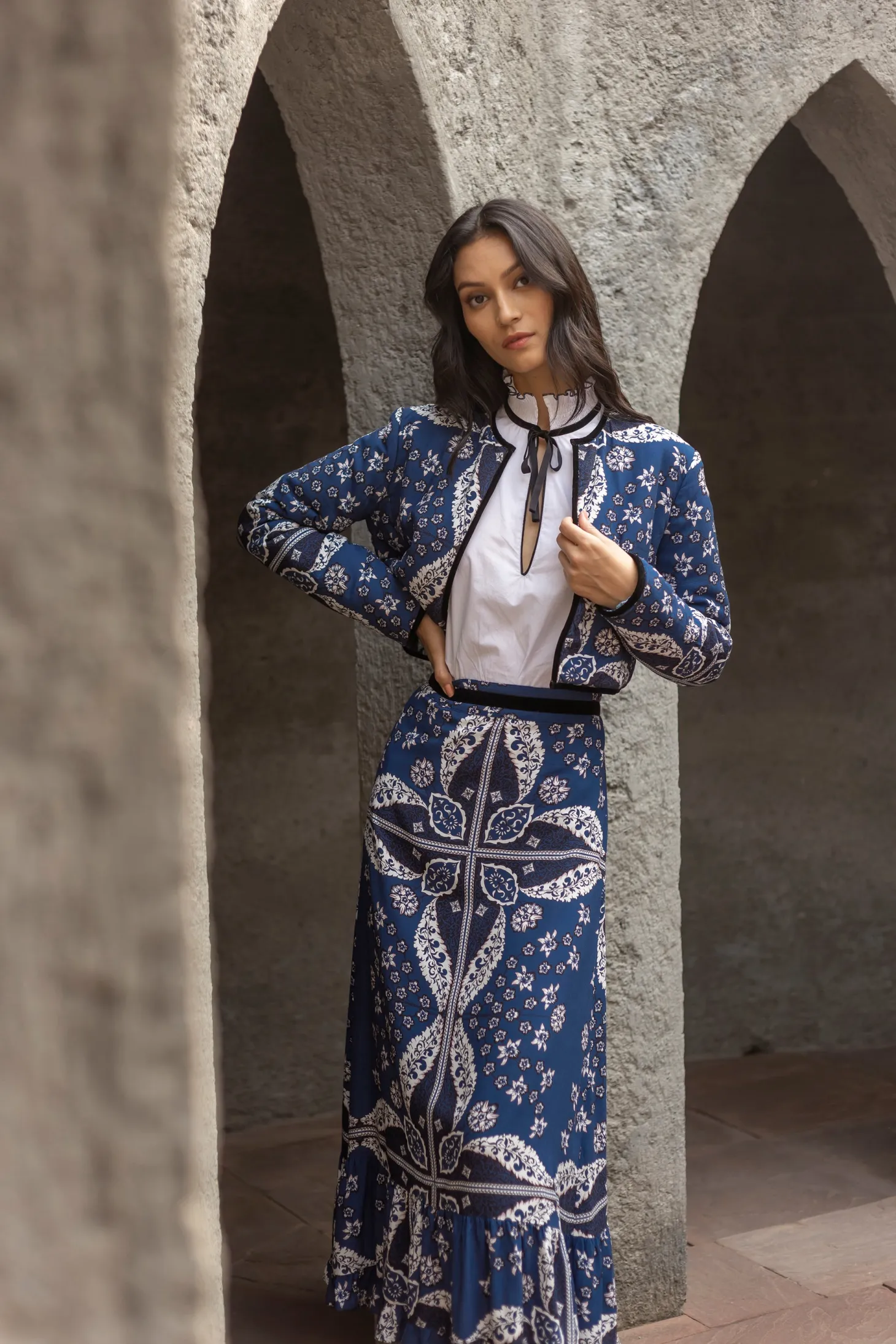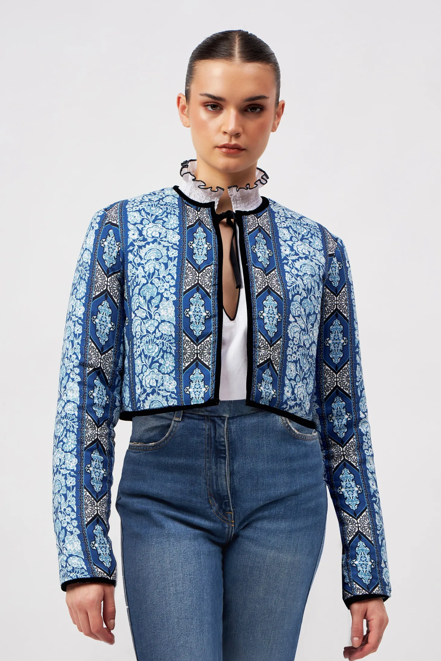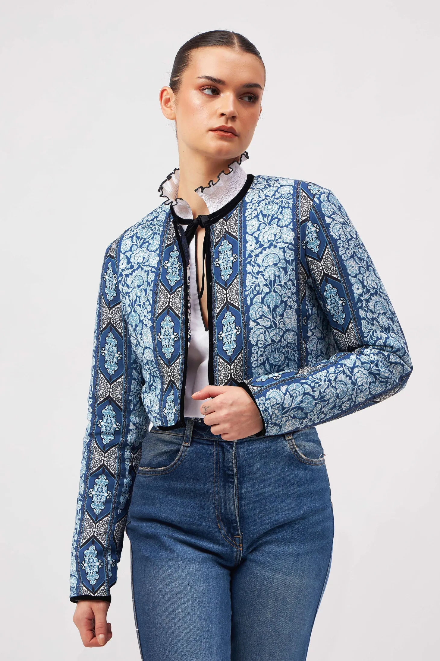Introducing a contemporary masterpiece, this exquisite cropped jacket is a reversible marvel, offering two looks in one statement piece. Lined with the softest cotton, it not only provides unparalleled comfort but also shapes a beautiful silhouette. Versatile and refined, it effortlessly complements both elegant dresses and casual pants. The print design of the outer shell is influenced by ancient Berber-Roman stone carvings. Reflecting the charm of Bahia Palace in Marrakesh, this print design draws inspiration from the grand tiles of the palace, blending geometric elegance with whimsical ornaments in celebration of Moroccan mosaic artistry.