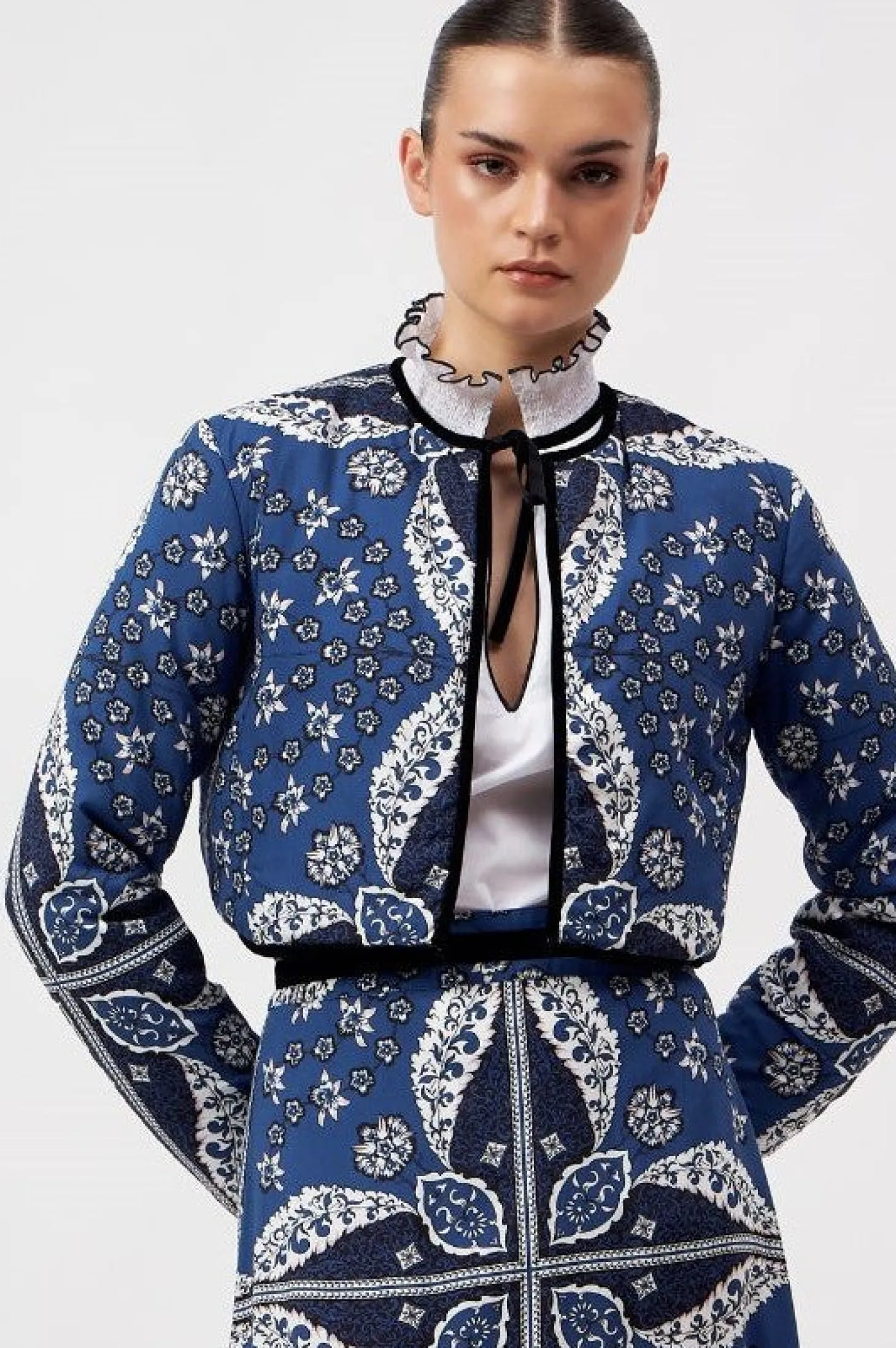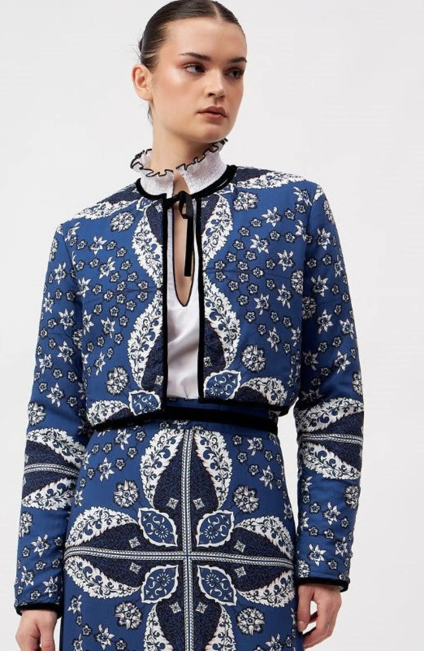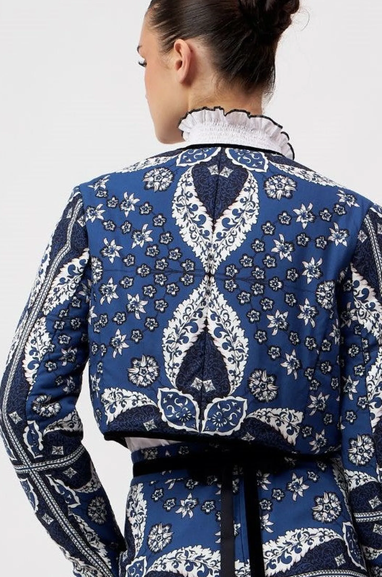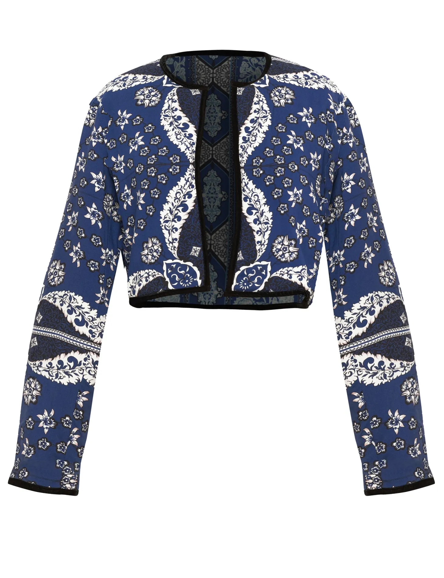 Introducing a contemporary masterpiece, this exquisite cropped jacket is a reversible marvel, offering two looks in one statement piece. Lined with the softest cotton, it not only provides unparalleled comfort but also shapes a beautiful silhouette. Versatile and refined, it effortlessly complements both elegant dresses and casual pants. The print design of the outer shell is influenced by ancient Berber-Roman stone carvings. Reflecting the charm of Bahia Palace in Marrakesh, this print design draws inspiration from the grand tiles of the palace, blending geometric elegance with whimsical ornaments in celebration of Moroccan mosaic artistry.