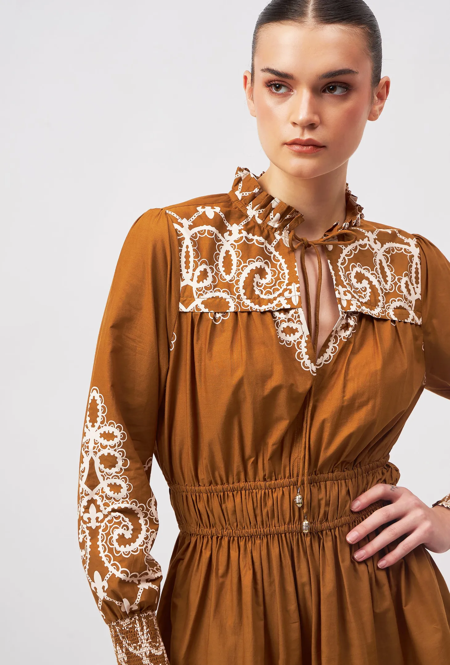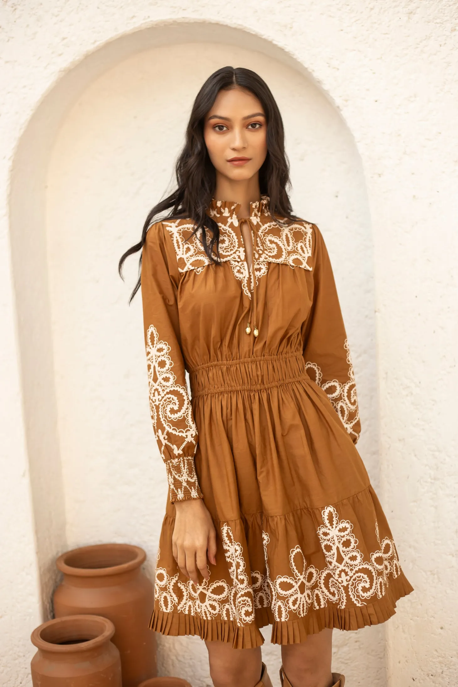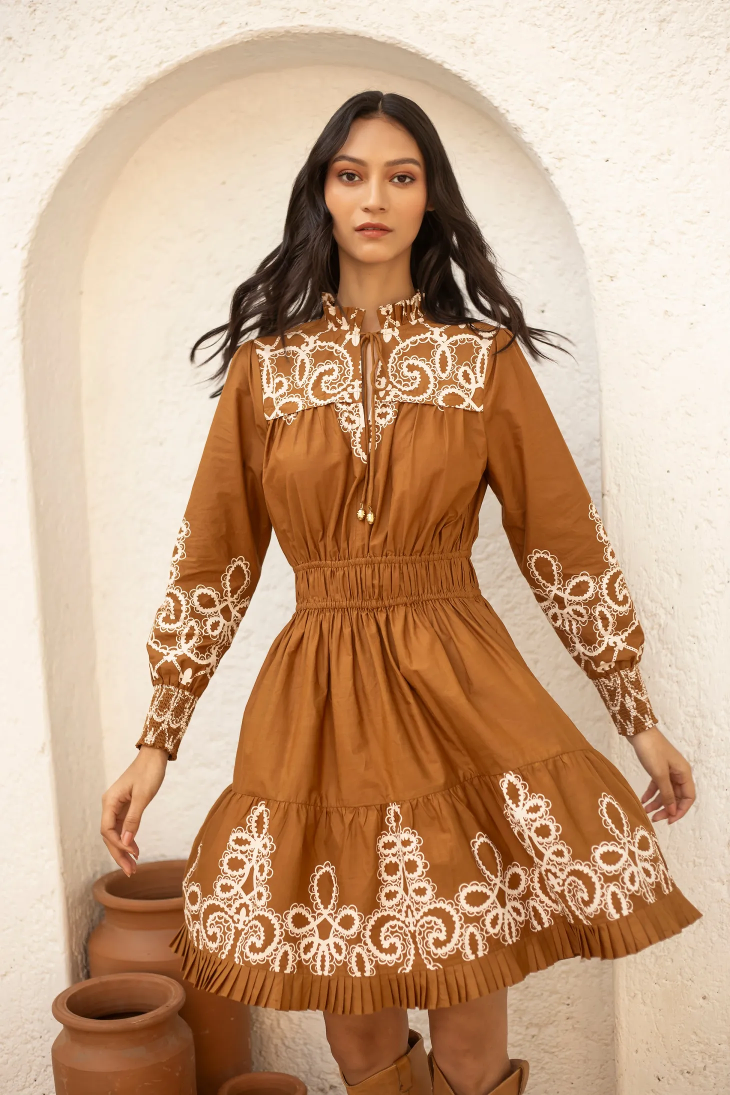 Our showstopper Alice dress features an elastic waist and smocked cuffs for a comfortable fit. The pleats on the collar, skirt and bodice give it a romantic touch. The collar ties feature custom brass embellishments with Moroccan engravings. “Medina” channels the elegance and craftsmanship of a Moroccan vintage bridal gown. The artwork pays homage to the intricate lacework and delicate embroidery traditionally hand-sewn onto heavy silks and brocade.
