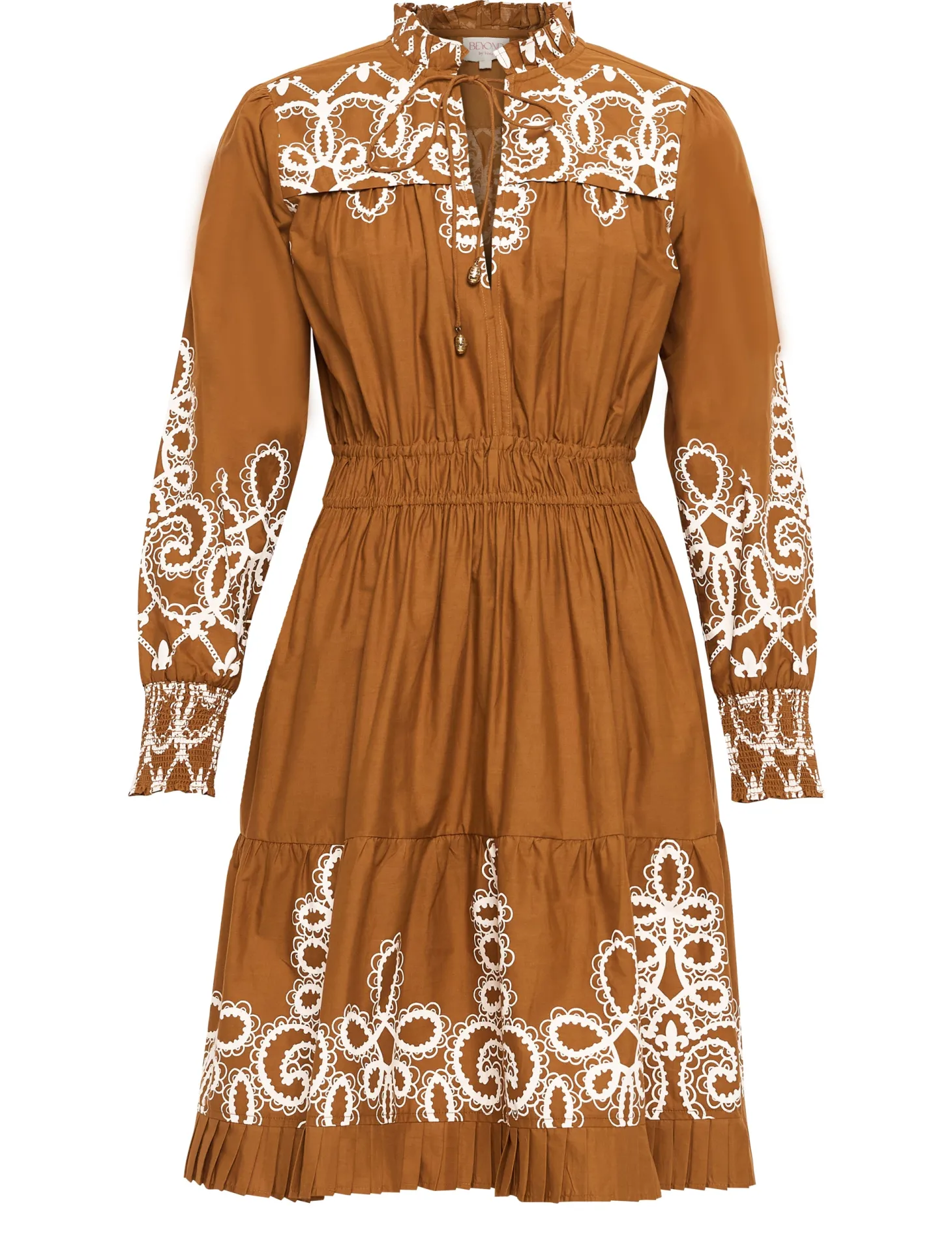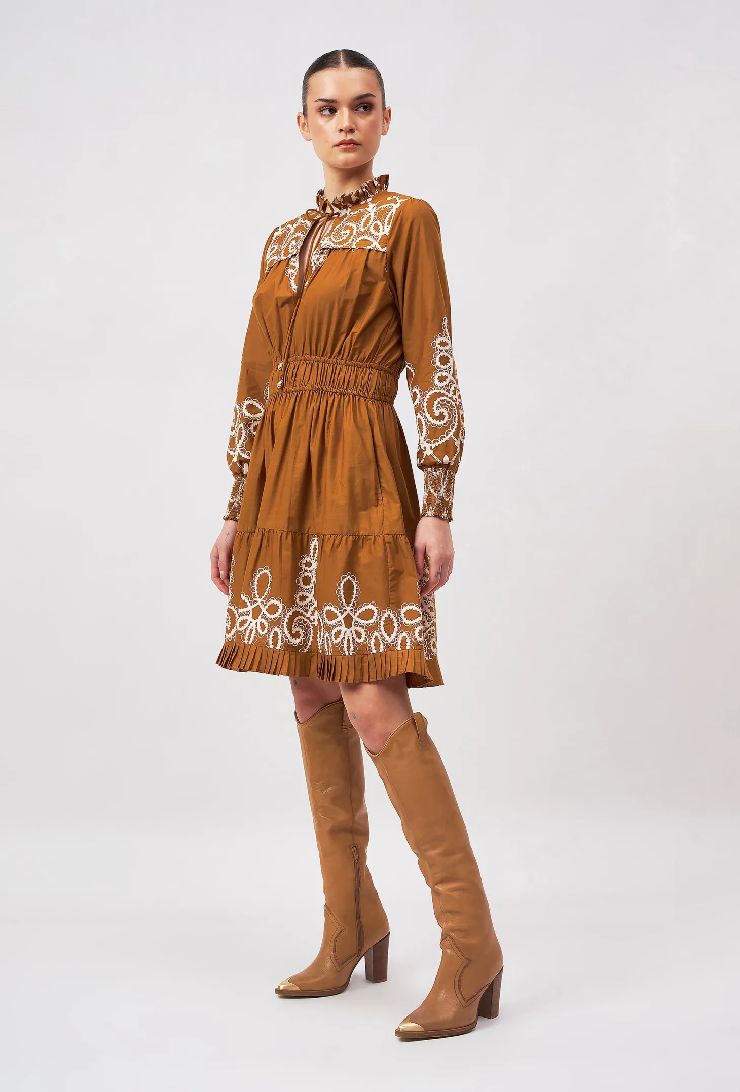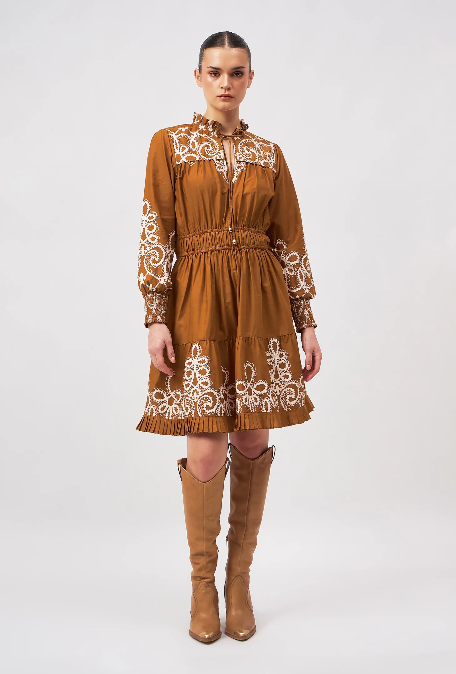 Our showstopper Alice dress features an elastic waist and smocked cuffs for a comfortable fit. The pleats on the collar, skirt and bodice give it a romantic touch. The collar ties feature custom brass embellishments with Moroccan engravings. “Medina” channels the elegance and craftsmanship of a Moroccan vintage bridal gown. The artwork pays homage to the intricate lacework and delicate embroidery traditionally hand-sewn onto heavy silks and brocade.