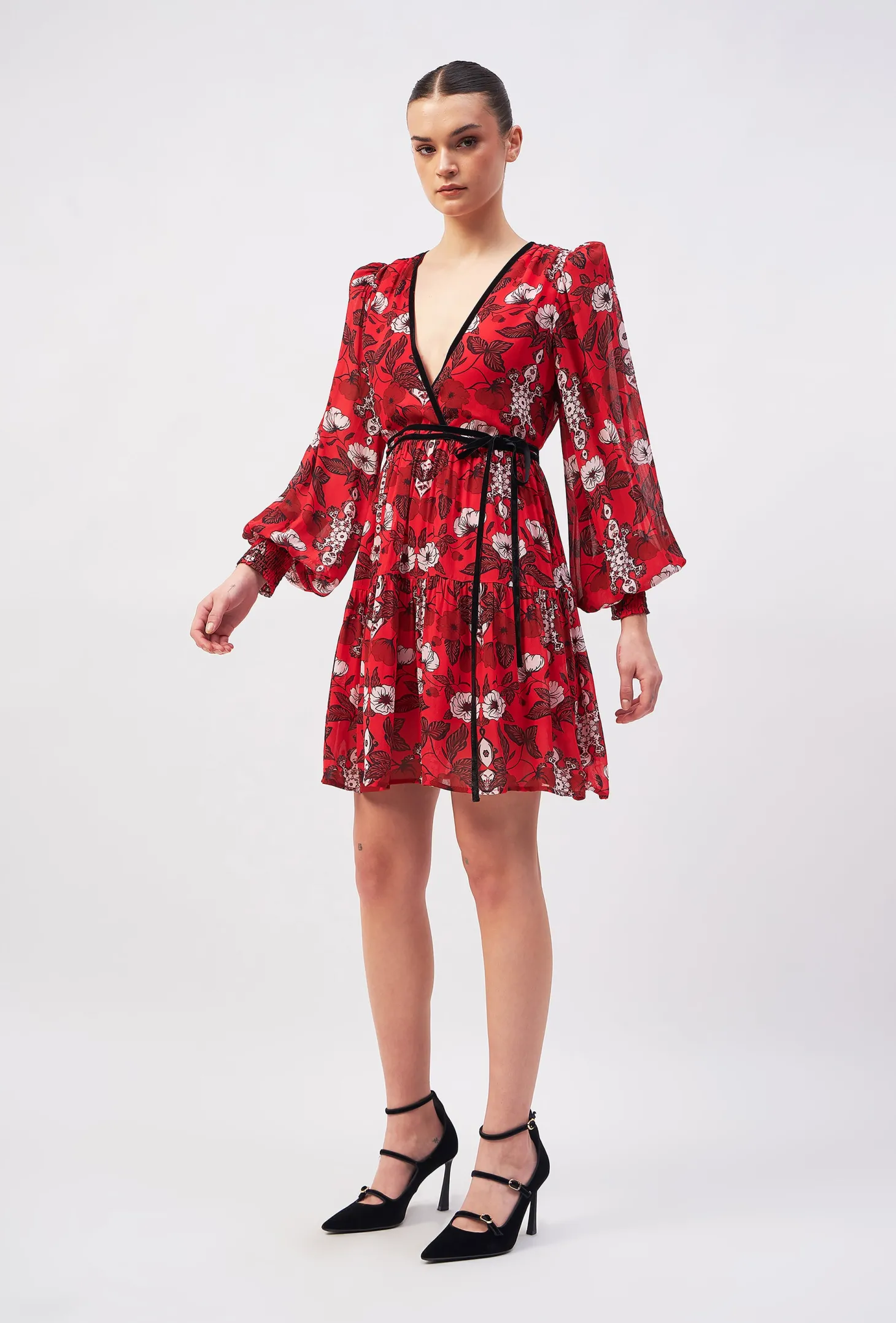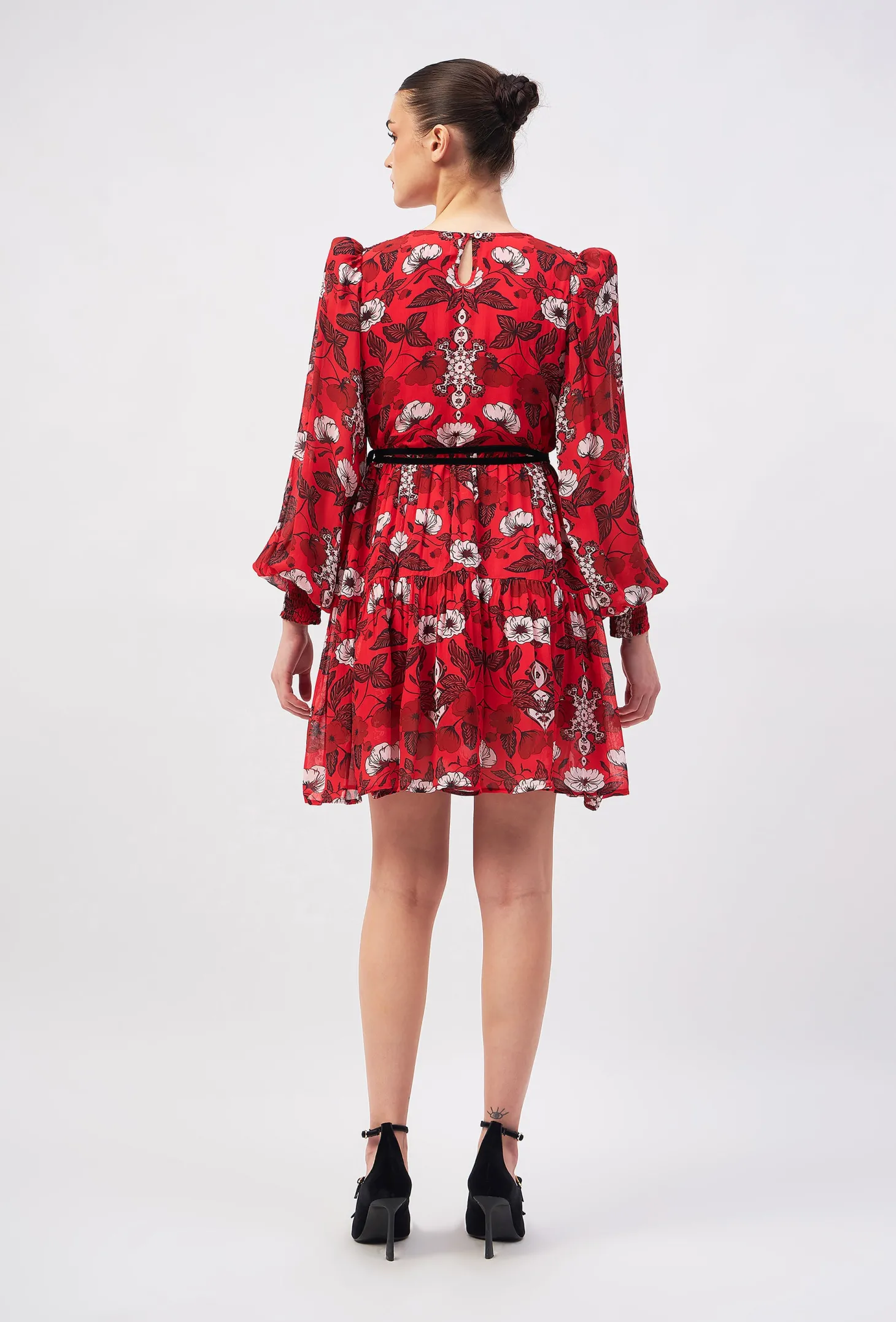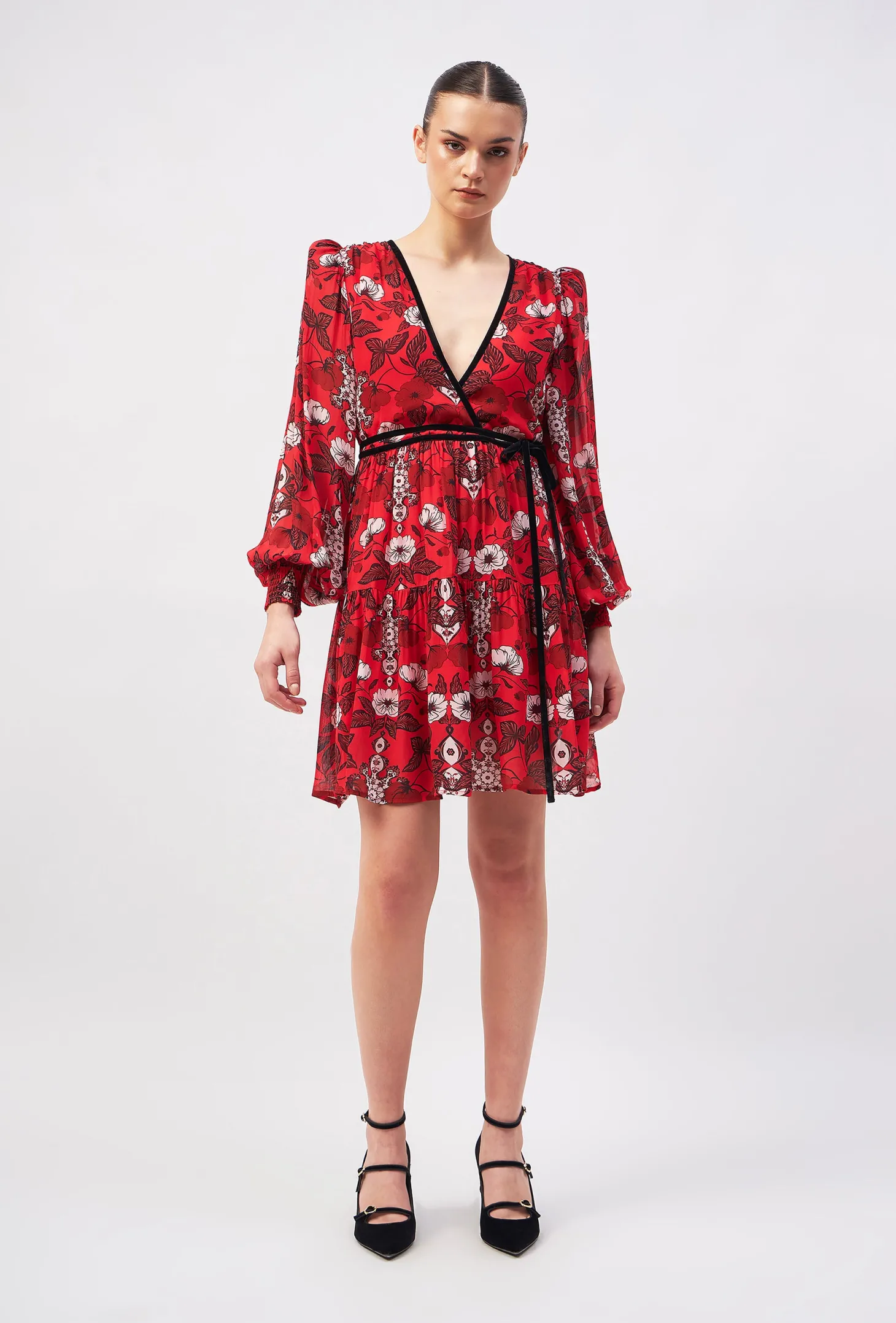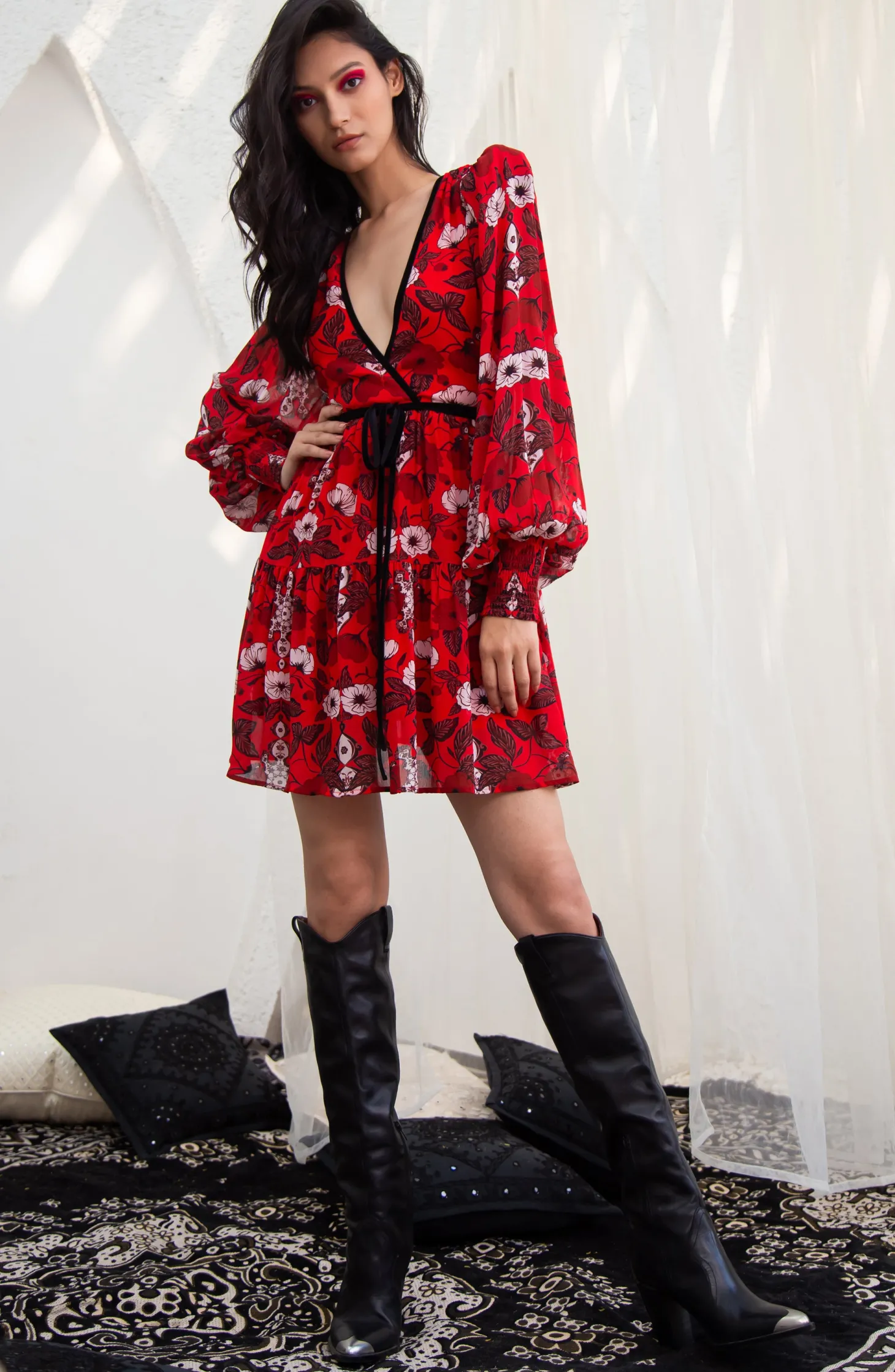 Redefine your party wardrobe with the Quinn, a fusion of sophistication and playful- ness boasting a deep V-neck, flouncy skirt, and billowy sleeves with smocked cuffs. A self-tie velvet belt ensures a customized fit, making it the go-to choice for a memorable night out. The artwork references the beauty of “Riads” traditional Moroccan houses known for their stunning courtyards. The floral motifs draw inspiration from the courtyard gardens, while arabesque patterns honor the mesmerizing tile mosaics in the riads.