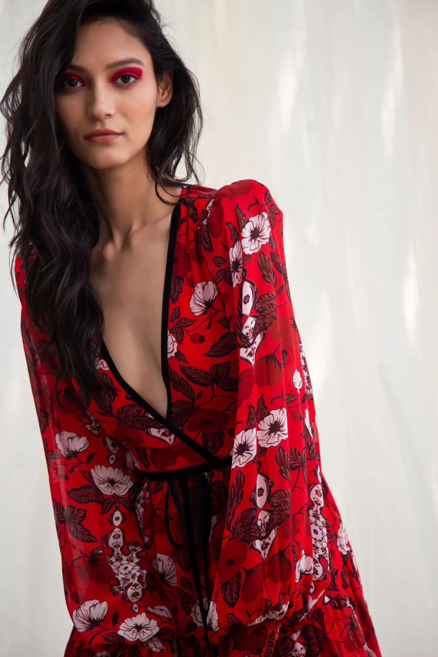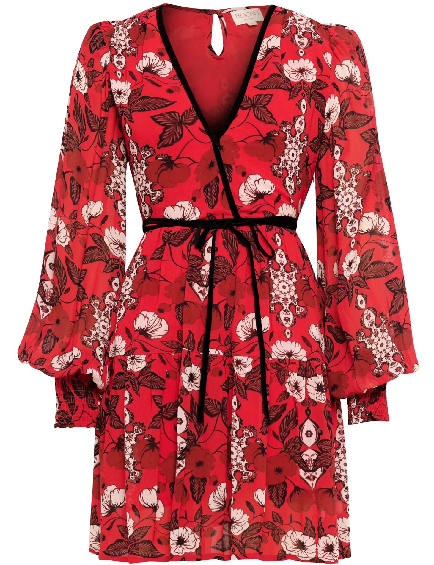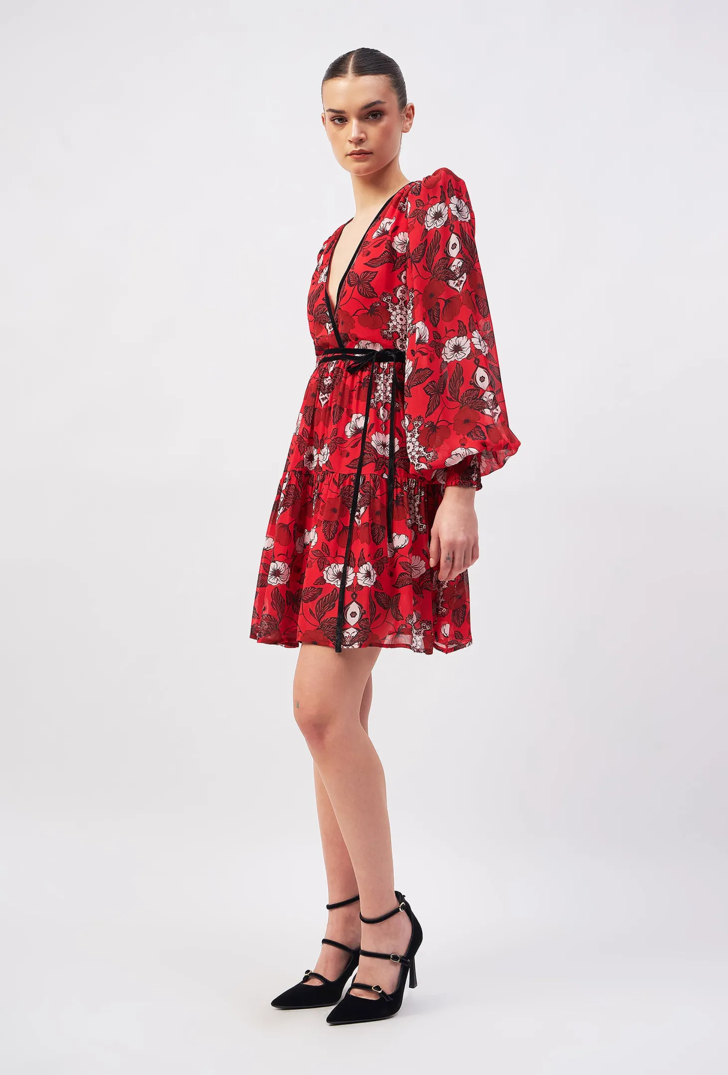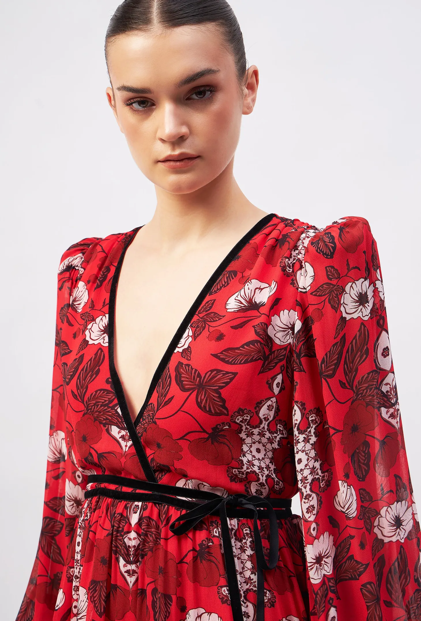 Redefine your party wardrobe with the Quinn, a fusion of sophistication and playful- ness boasting a deep V-neck, flouncy skirt, and billowy sleeves with smocked cuffs. A self-tie velvet belt ensures a customized fit, making it the go-to choice for a memorable night out. The artwork references the beauty of “Riads” traditional Moroccan houses known for their stunning courtyards. The floral motifs draw inspiration from the courtyard gardens, while arabesque patterns honor the mesmerizing tile mosaics in the riads.