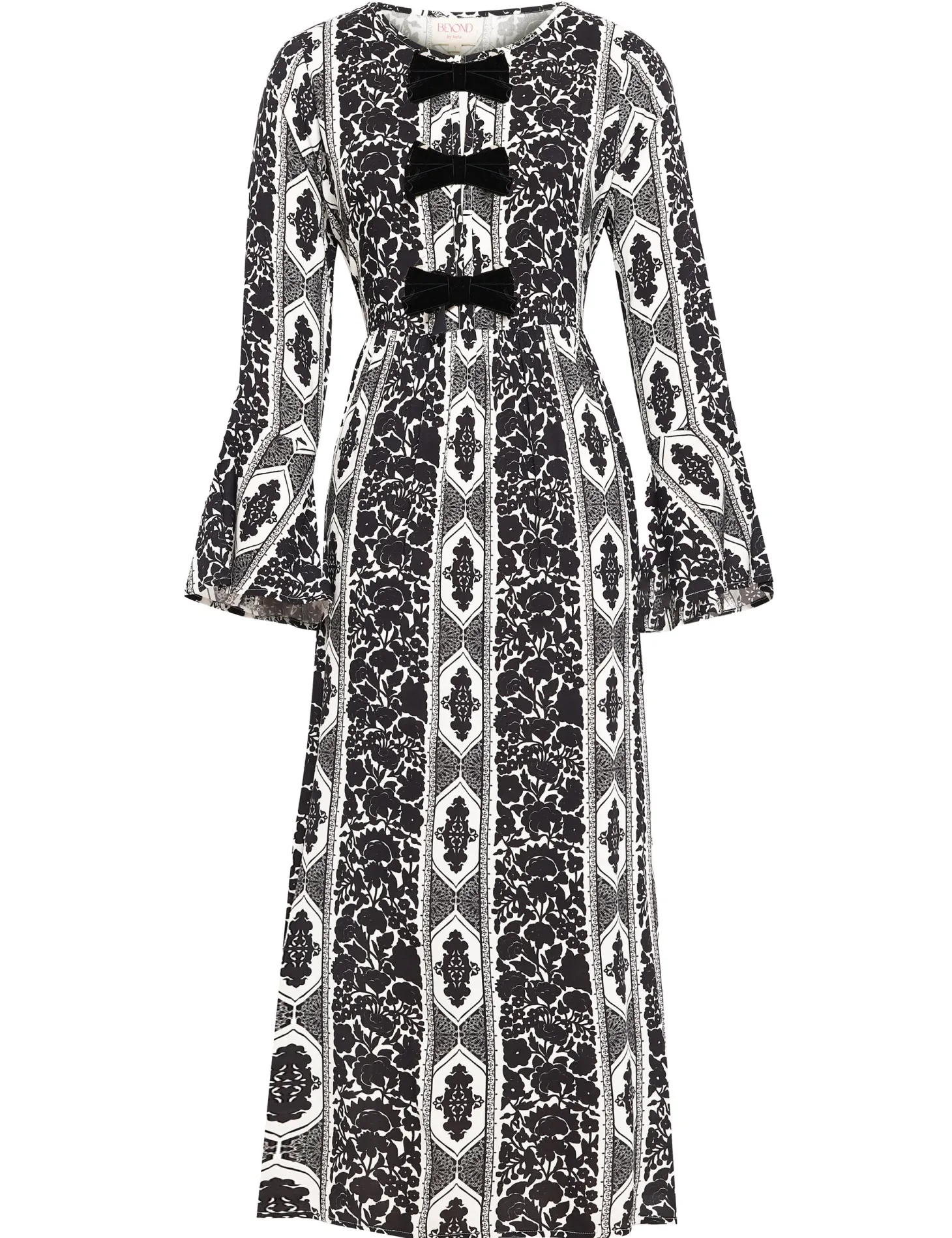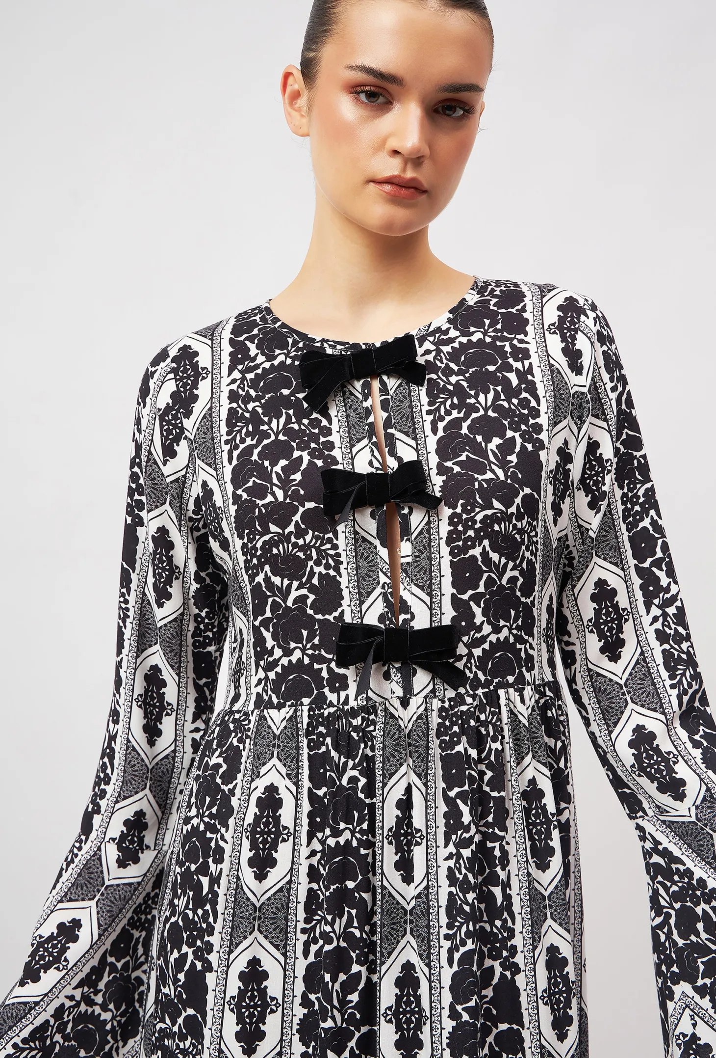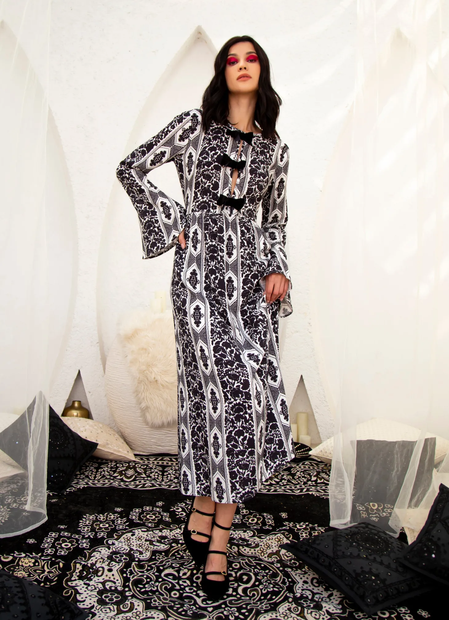 Elevate your festive wardrobe with the exquisite Gwen dress. Gwen showcases a semi-fitted silhouette with alluring keyhole openings at the front that are adorned with luxurious velvet bows. Her long, slender trumpet sleeves add an extra touch of sophistication. Gwen is a vision of holiday elegance.Arabesque draws inspiration from the Moorish architecture in Casablanca’s “Habbous” neighbourhood. The intricate, interlacing geometric patterns mirror the centuries-old Moroccan artistry.