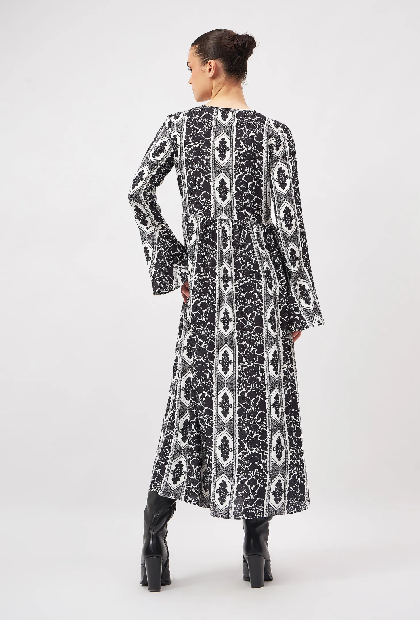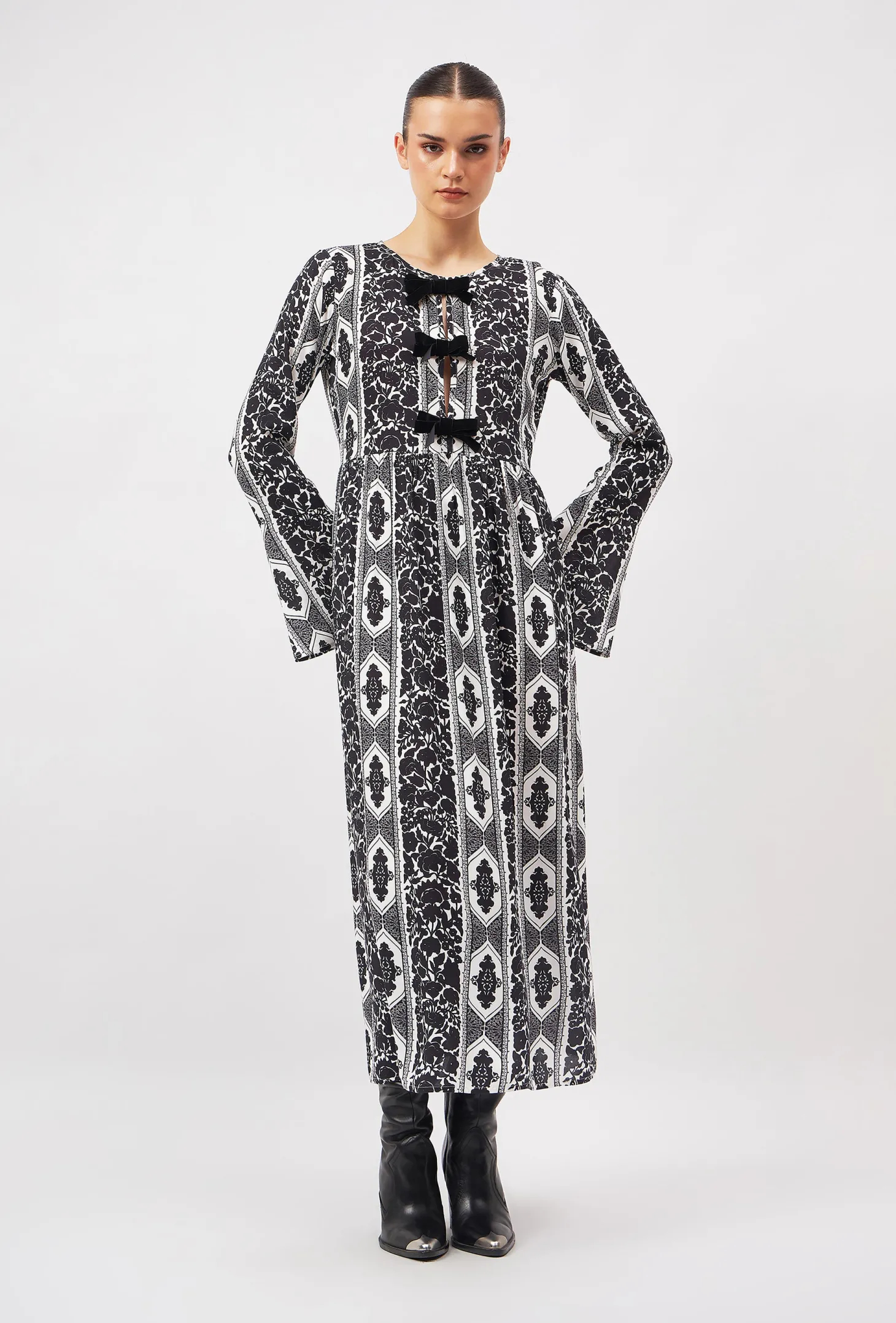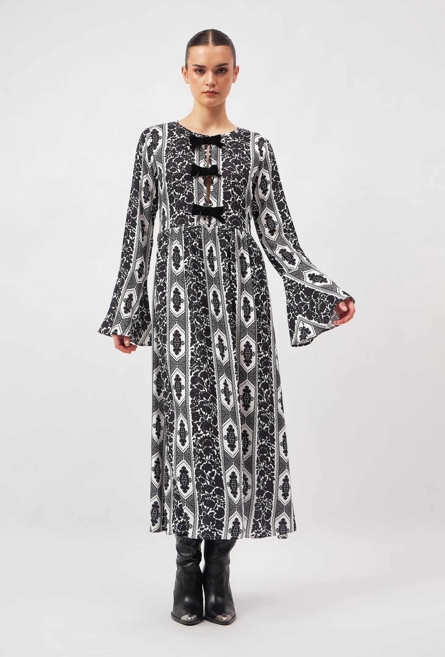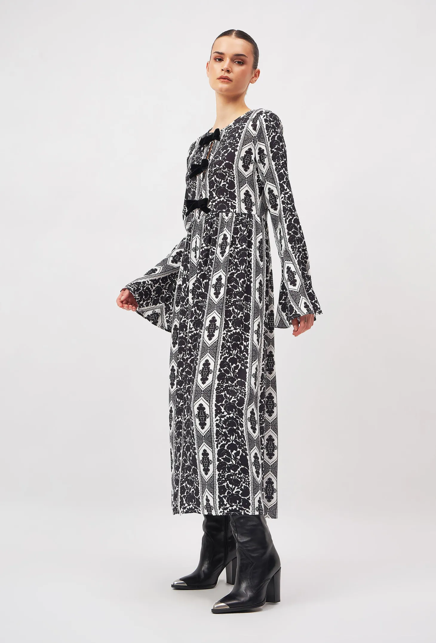 Elevate your festive wardrobe with the exquisite Gwen dress. Gwen showcases a semi-fitted silhouette with alluring keyhole openings at the front that are adorned with luxurious velvet bows. Her long, slender trumpet sleeves add an extra touch of sophistication. Gwen is a vision of holiday elegance.Arabesque draws inspiration from the Moorish architecture in Casablanca’s “Habbous” neighbourhood. The intricate, interlacing geometric patterns mirror the centuries-old Moroccan artistry.