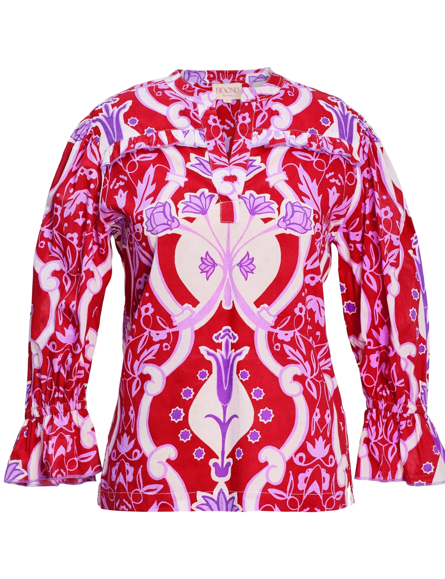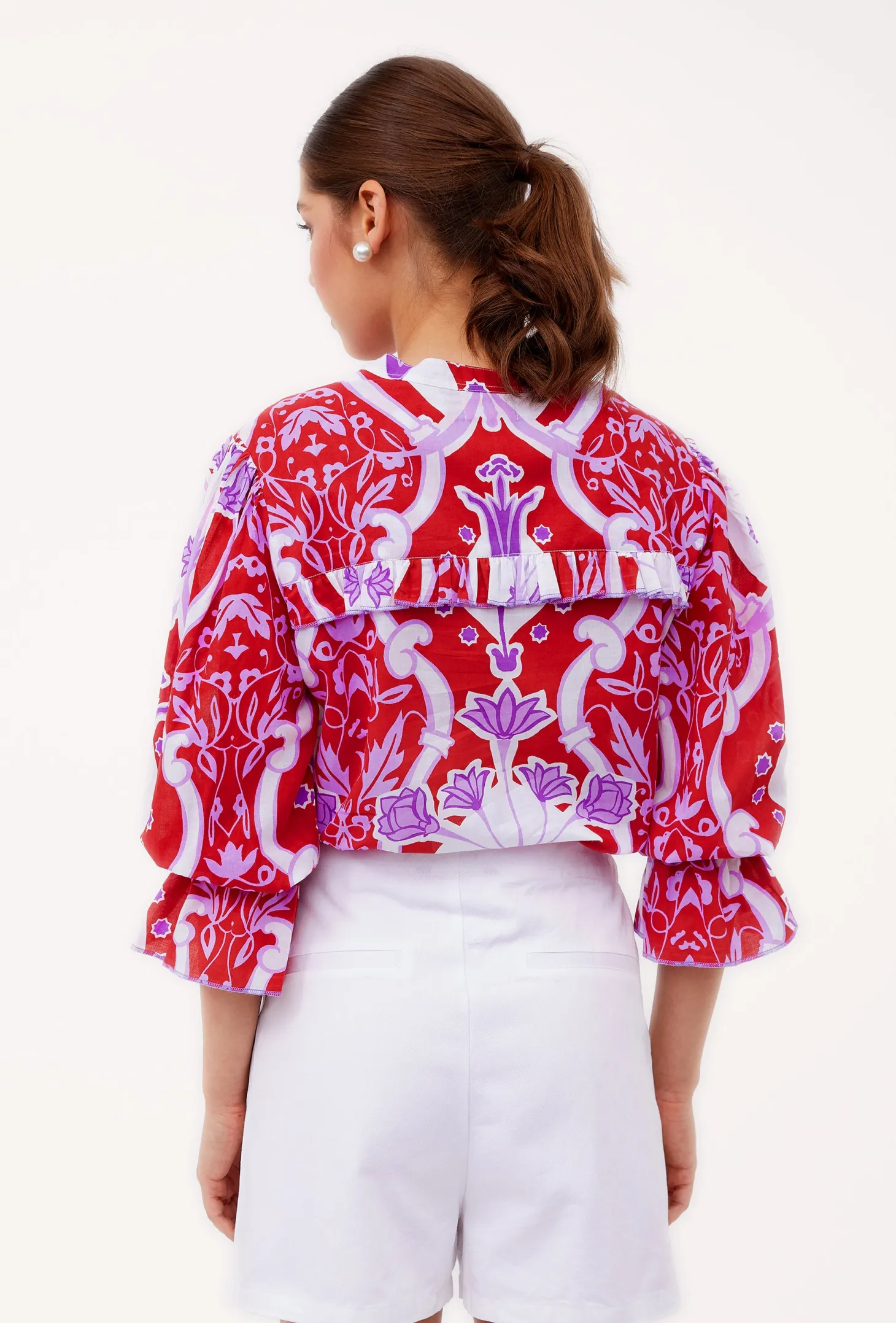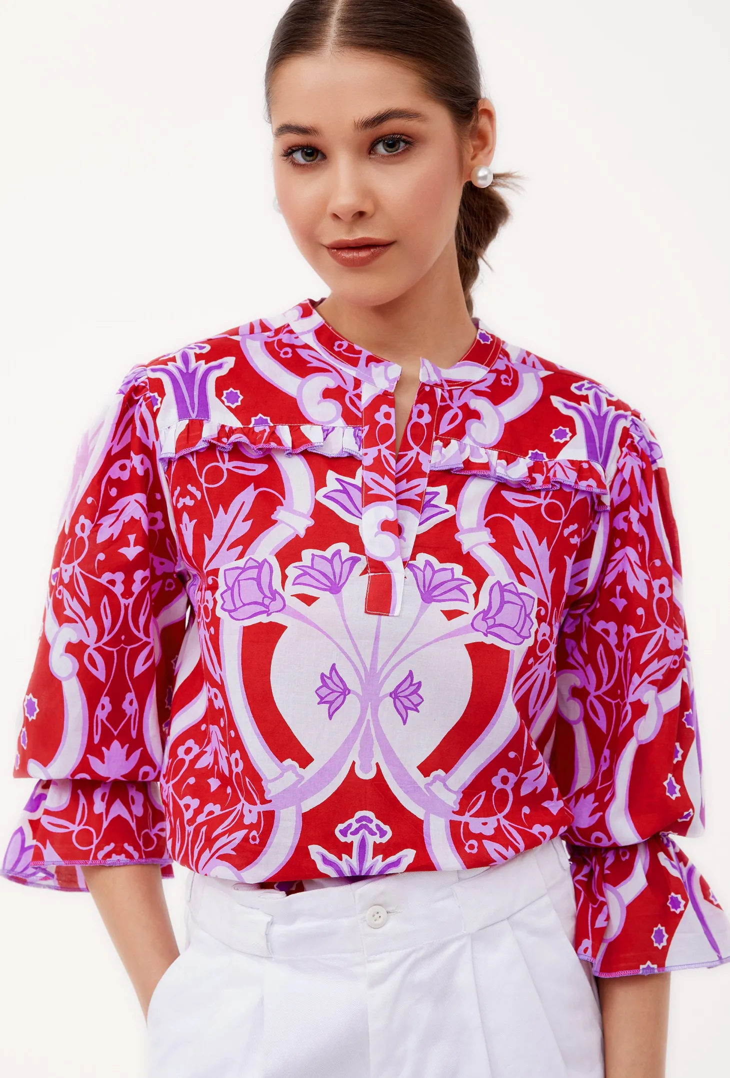 With its slightly puffed 3/4 sleeves, relaxed cut and delicate ruffle details, the Stella is a winner all year round. Pair it with our Gia Midi skirt or with Denim for a casual look. Stella is made from soft, breathable cotton. Inspired by ornamental stone railings of Lake Como’s grand villas, this print exudes grandeur and elegance.
