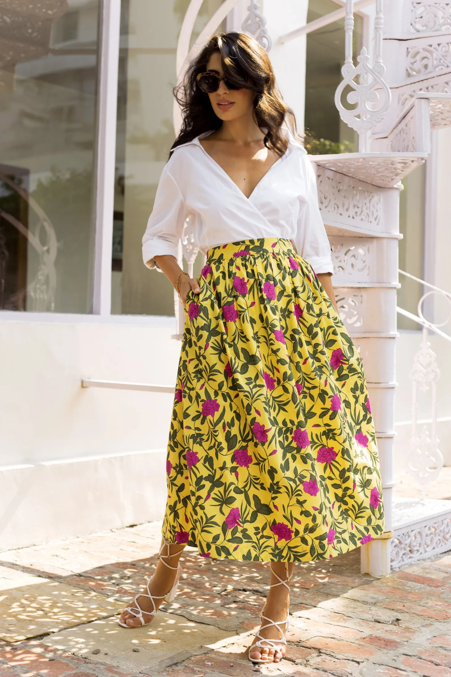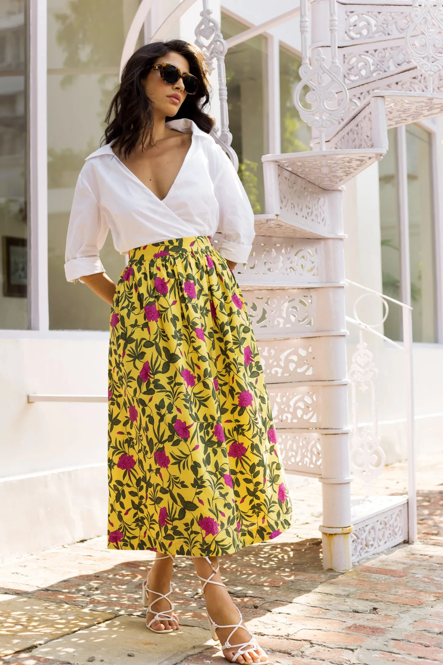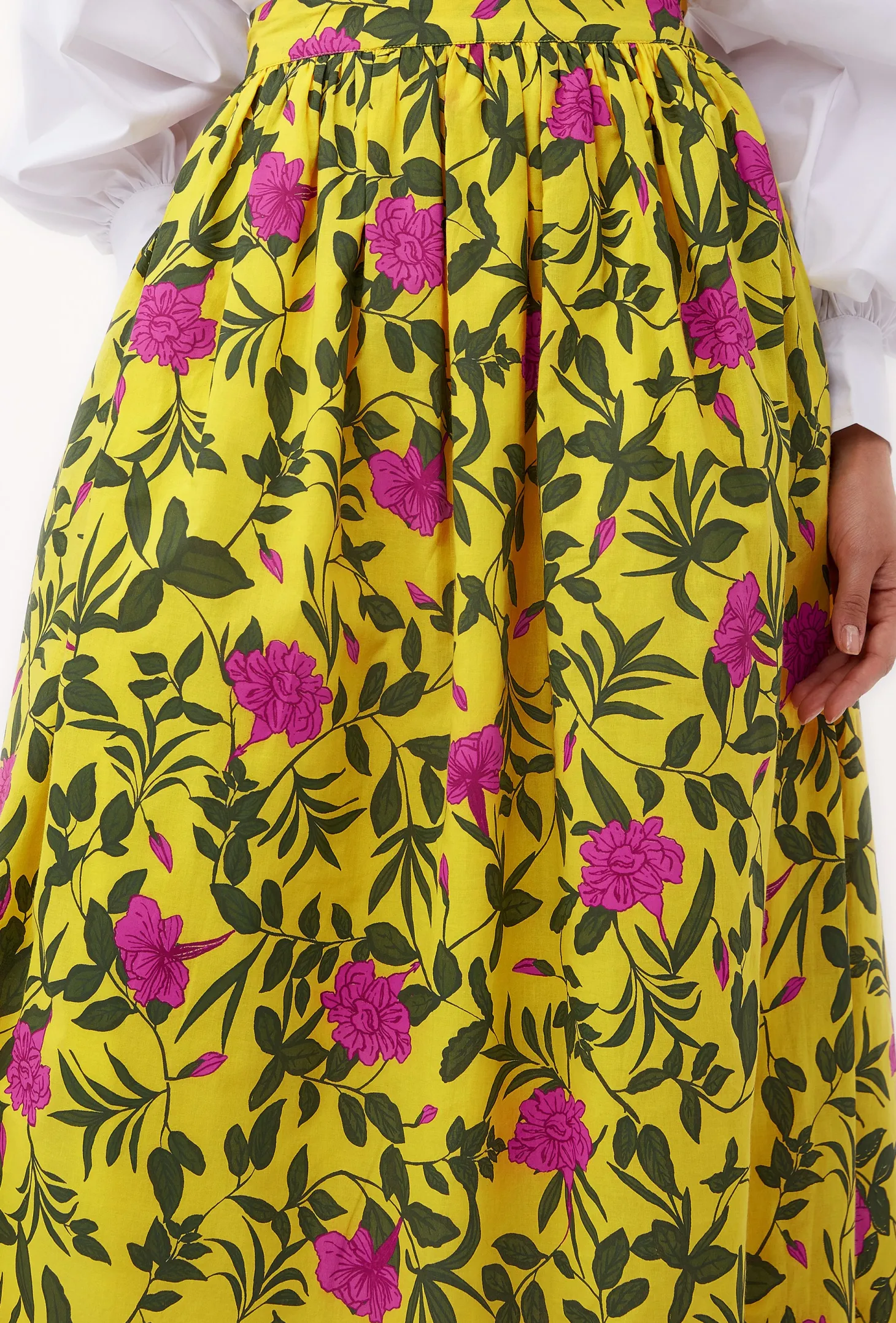 The Anna skirt is a perfect companion for leisurely strolls through the charming streets of Florence. The midi skirt features a flattering A-line silhouette, hidden pockets, and an adjustable waist. Pair it with flats and a white tee for a casual daytime look, or dress it up with heels for a sophisticated evening ensemble. Anna is made from a soft, breathable cotton cambric fabric that will keep you cool on a hot summer day. The print design echoes the charm of Tuscan gardens in full bloom, showcasing vivid depictions of lilies and lush greens.