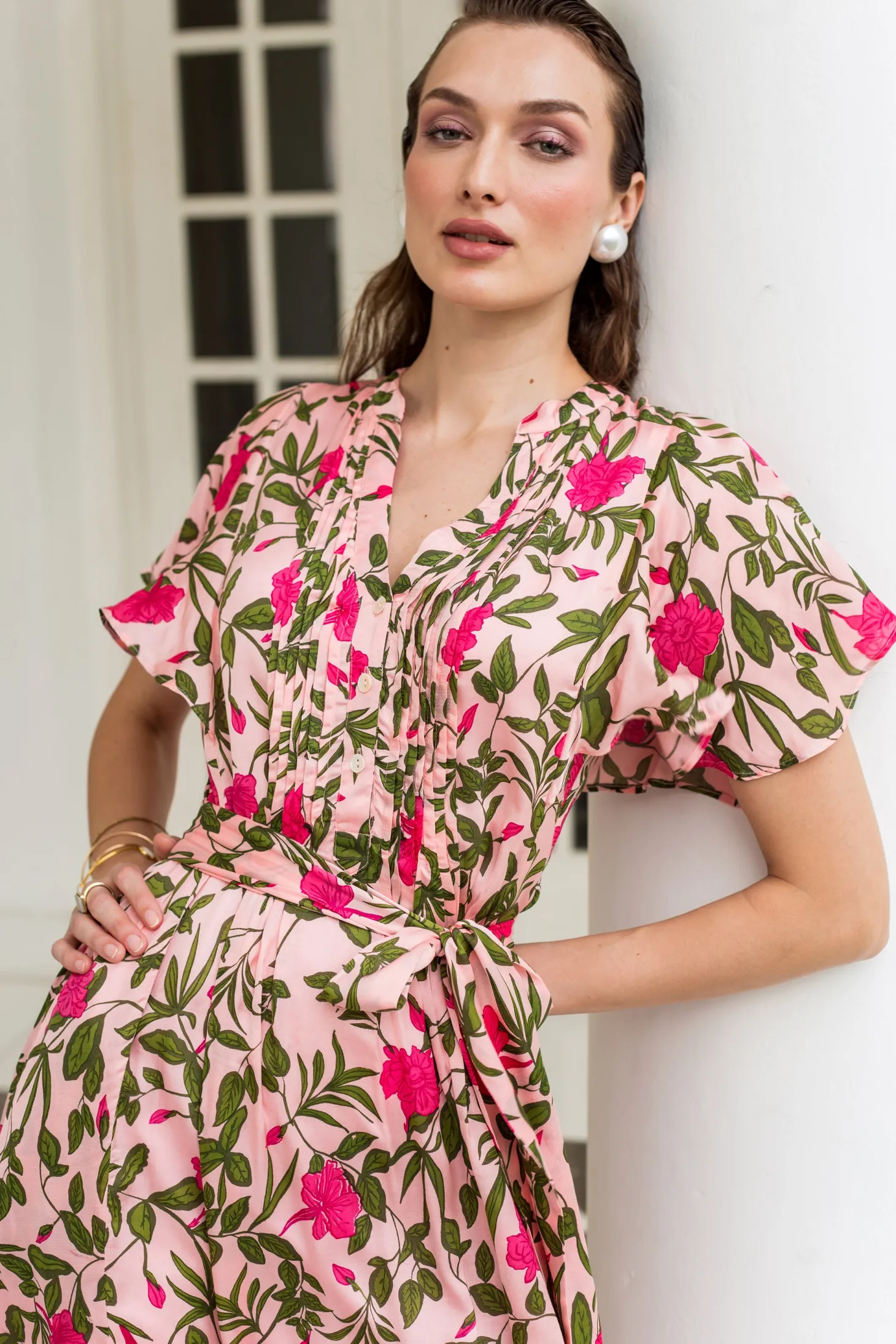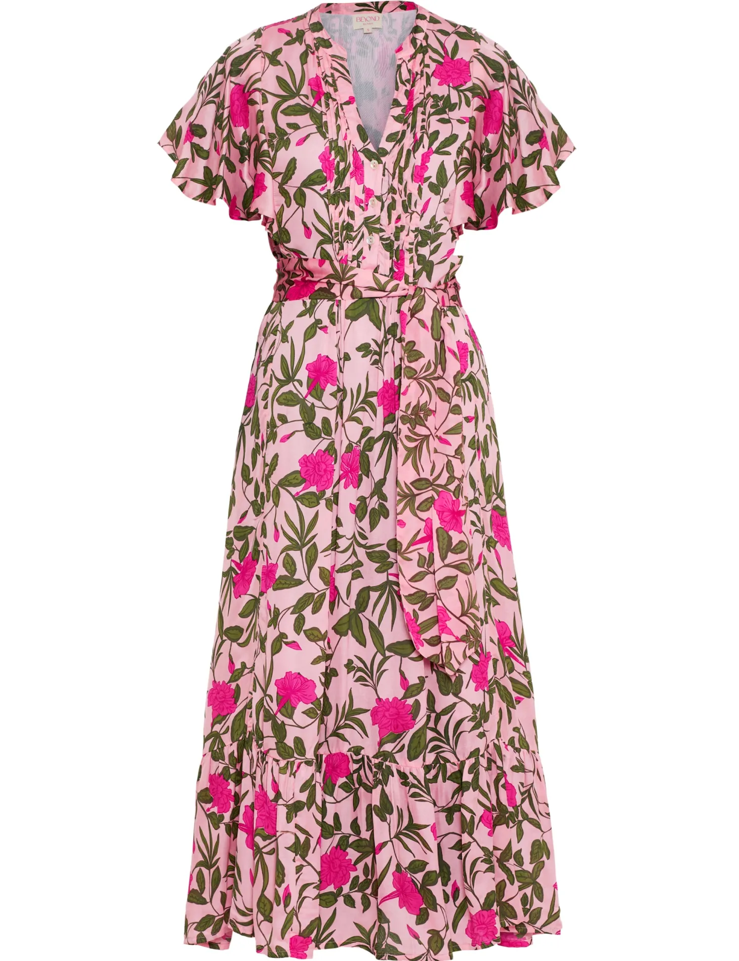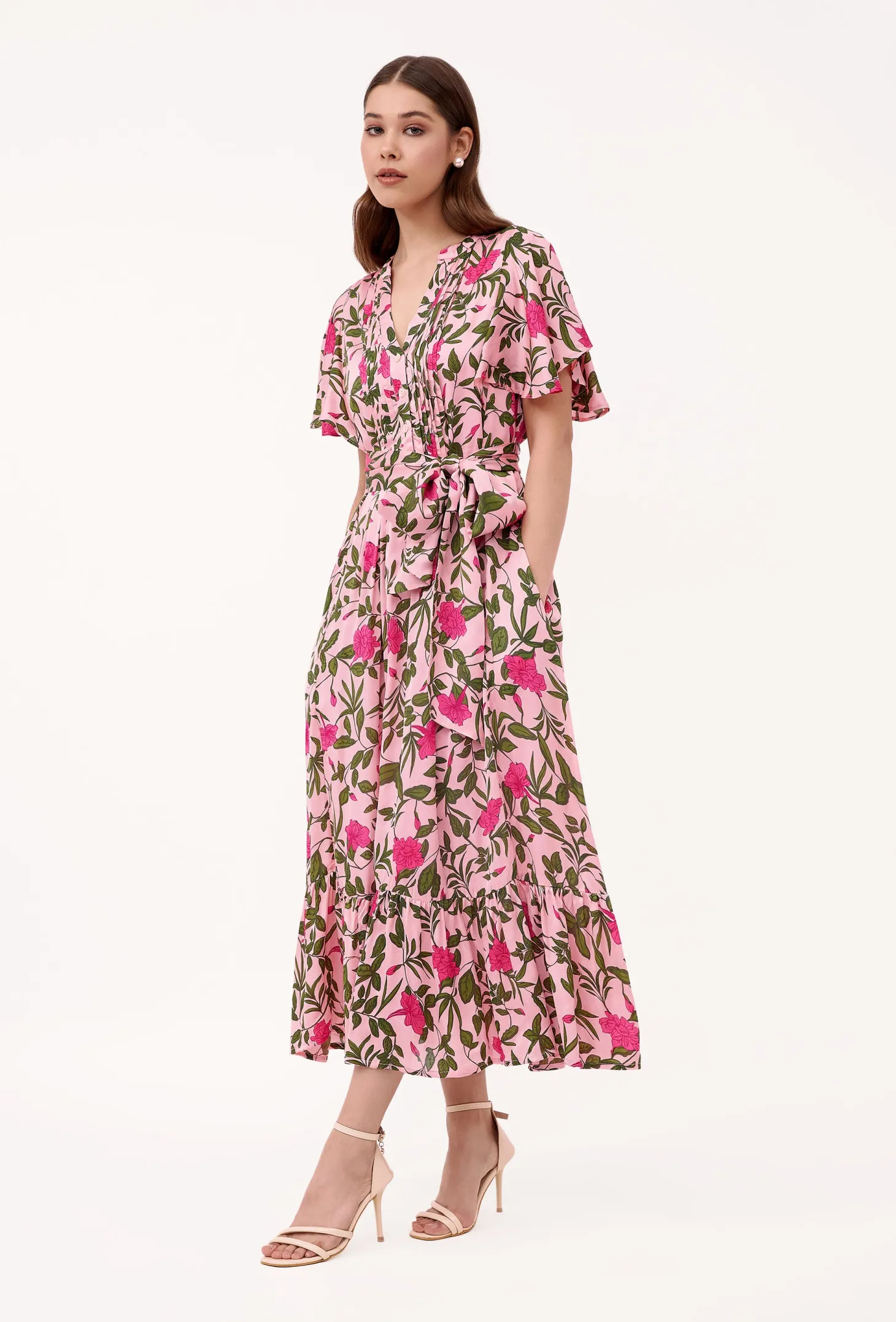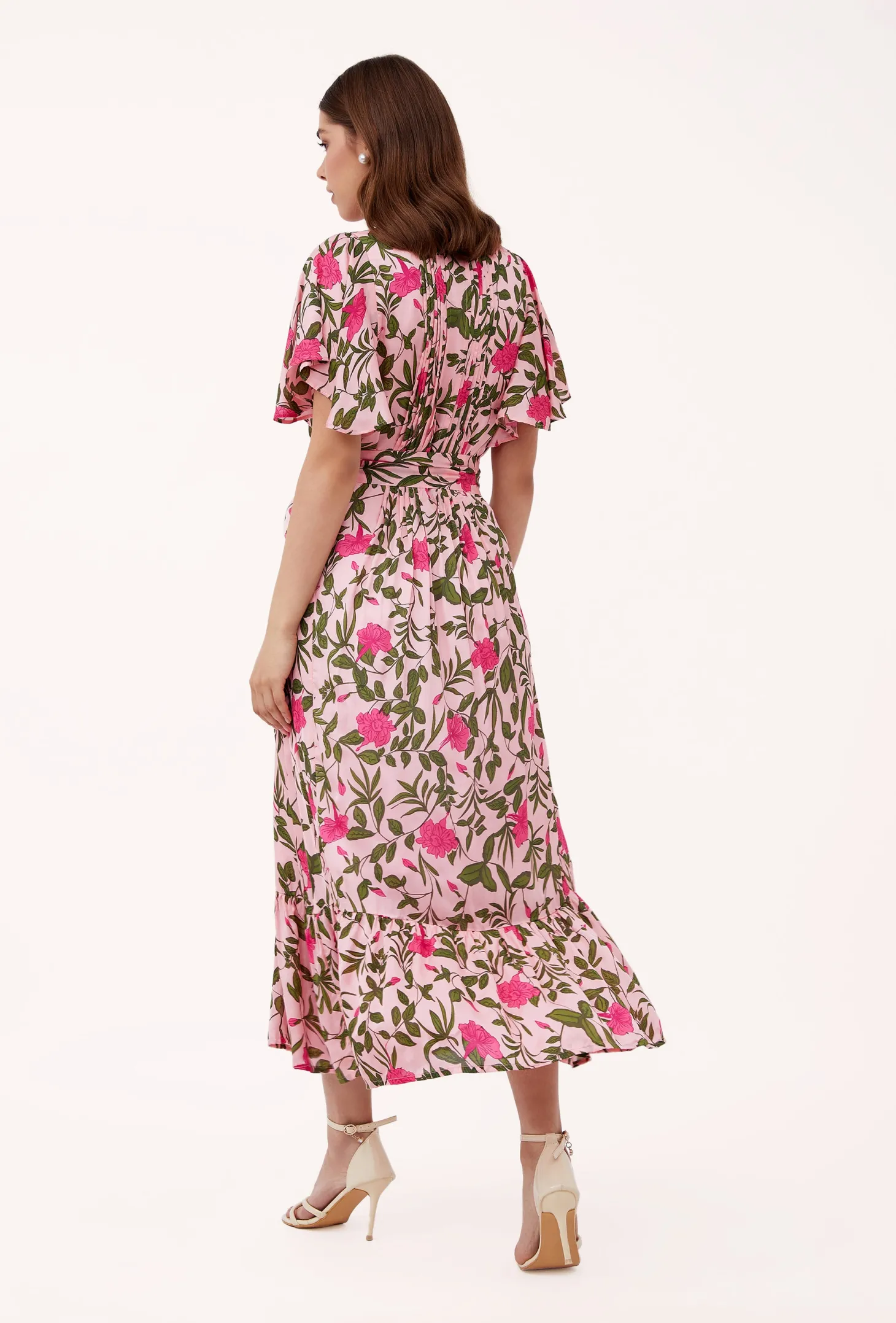 The Leni dress is a true ode to femininity. The universally flattering loose cut is accentuated by subtle pleats and a ruffled hem, while the featured belt cinches in at the waist for a truly enchanting silhouette. Leni is crafted from luxurious satin fabric with an elegant sheen and a fluid drape. The print design echoes the charm of Tuscan gardens in full bloom, showcasing vivid depictions of lilies and lush greens.