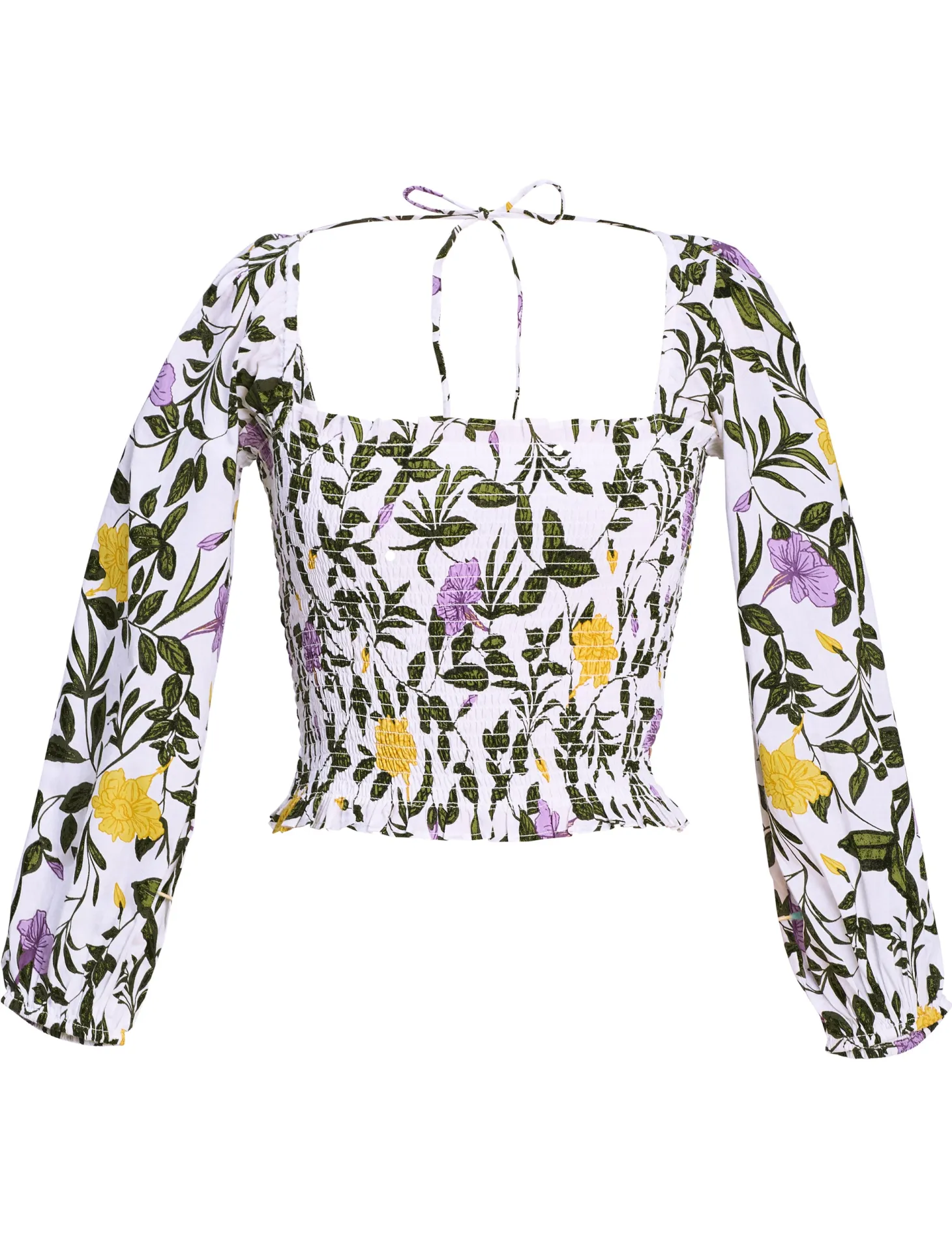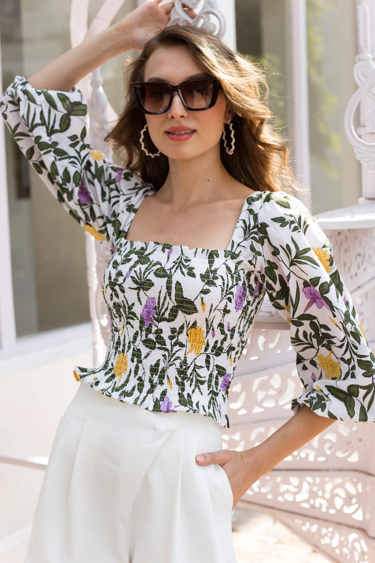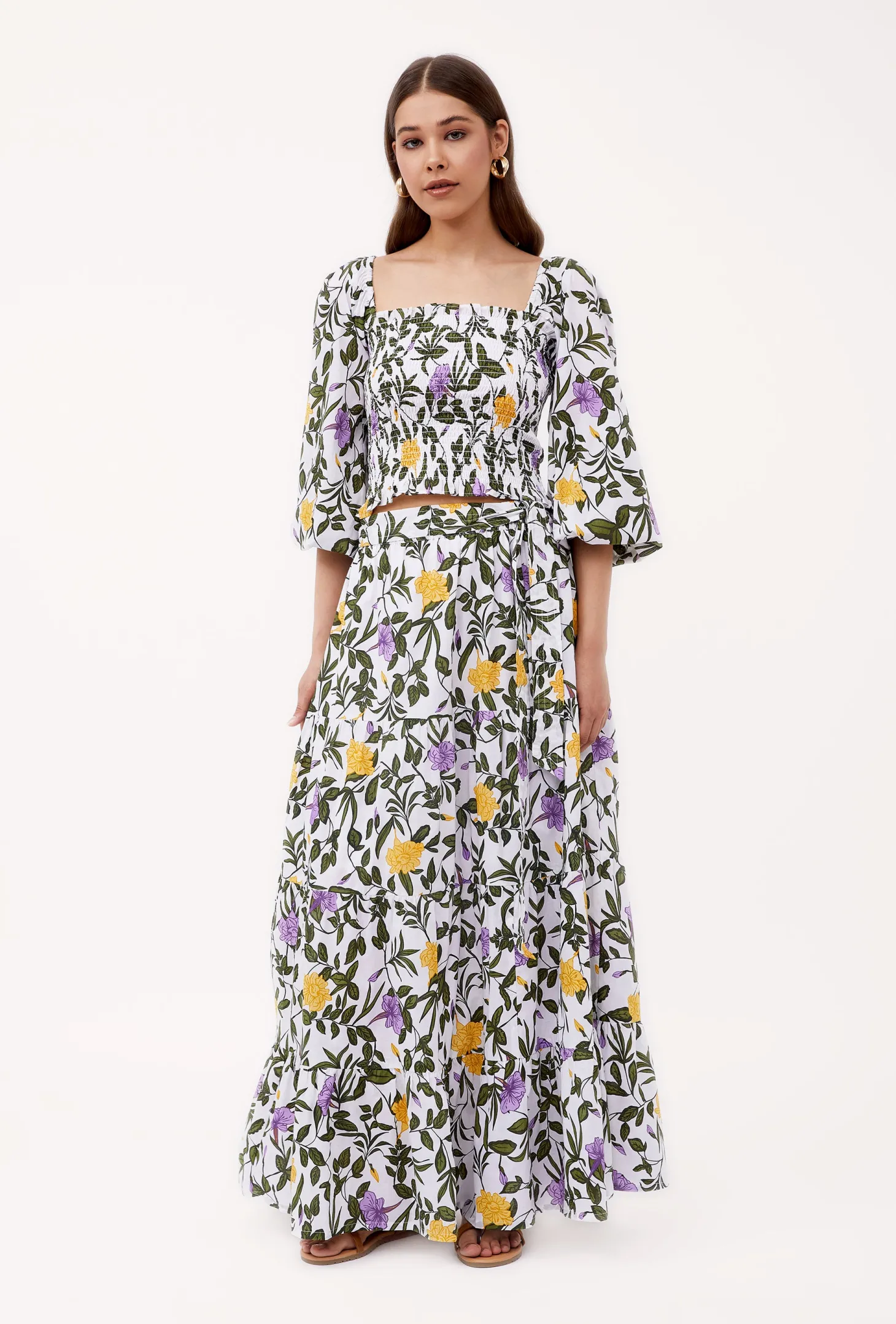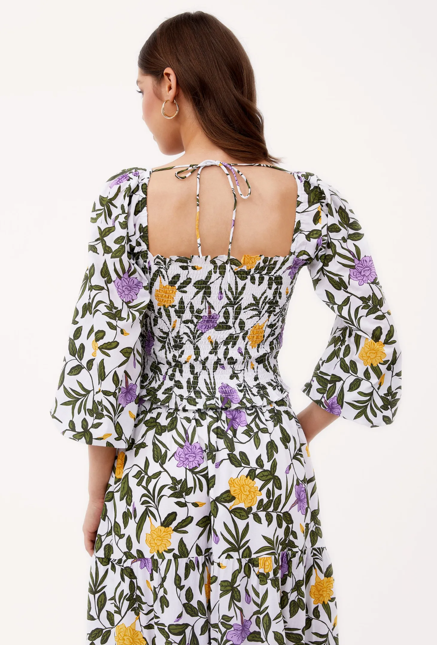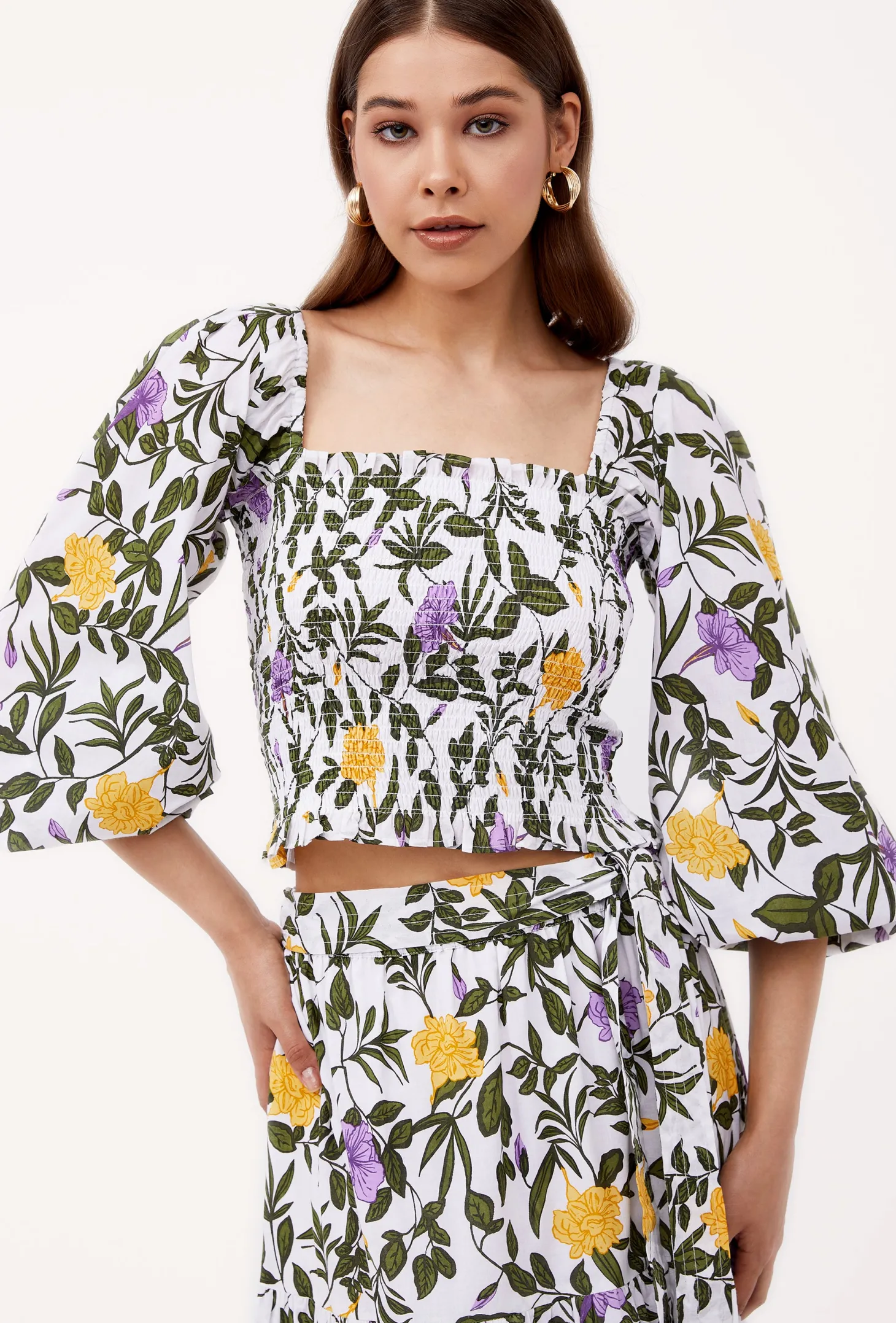 Embrace playful sophistication with our Gloria crop top featuring a square neckline, smocked bodice, and billowy 3/4 sleeves that effortlessly transition from on-shoulder to off-shoulder. This versatile piece pairs exquisitely with our Anna skirt, creating an ensemble to turn heads. Gloria is made from a soft, breathable cotton cambric fabric that will keep you cool on a hot summer day. The print design echoes the charm of Tuscan gardens in full bloom, showcasing vivid depictions of lilies and lush greens.