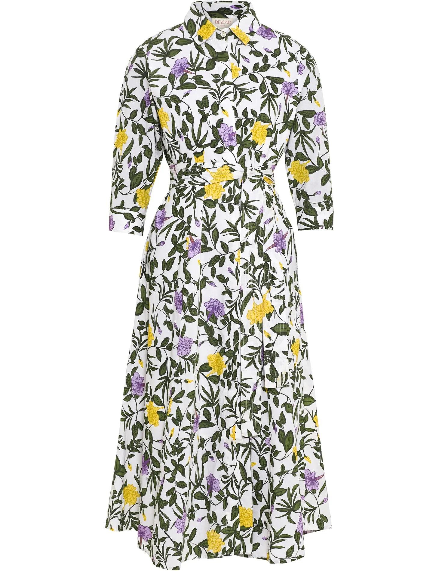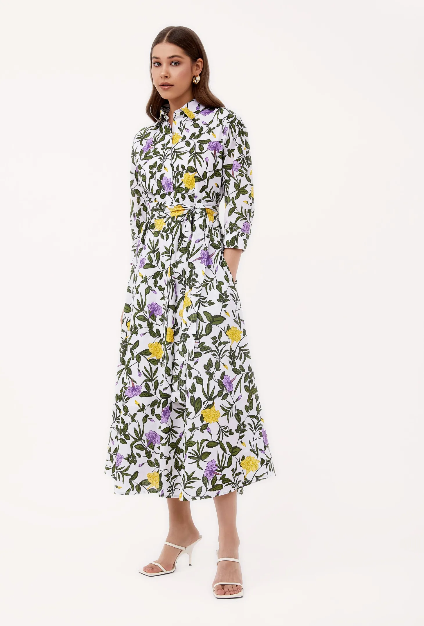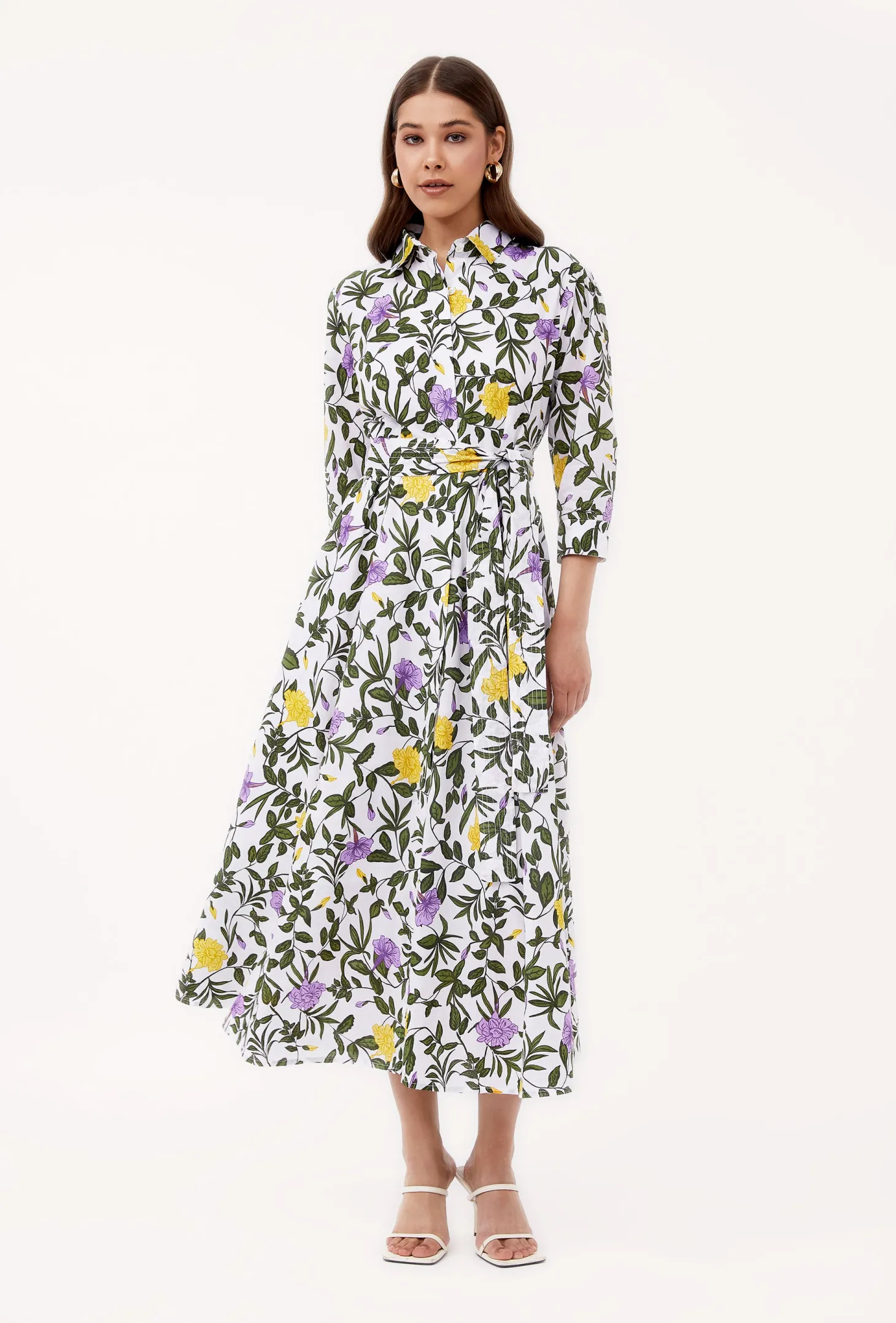 Emily is a classic shirt dress with an elegant ease and a flattering, effortless silhouette. The dress buttons down at the front and features 3/4 sleeves.Emily is made from a soft, breathable cotton cambric fabric that will keep you cool on a hot summer day. The print design echoes the charm of Tuscan gardens in full bloom, showcasing vivid depictions of lilies and lush greens.