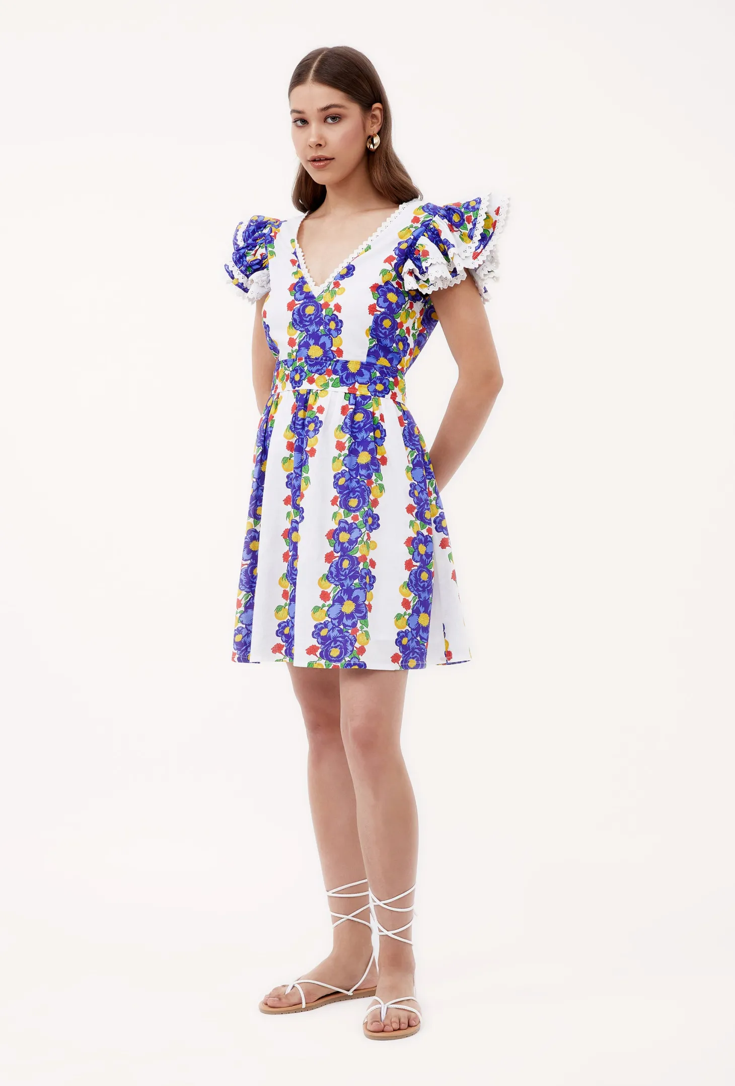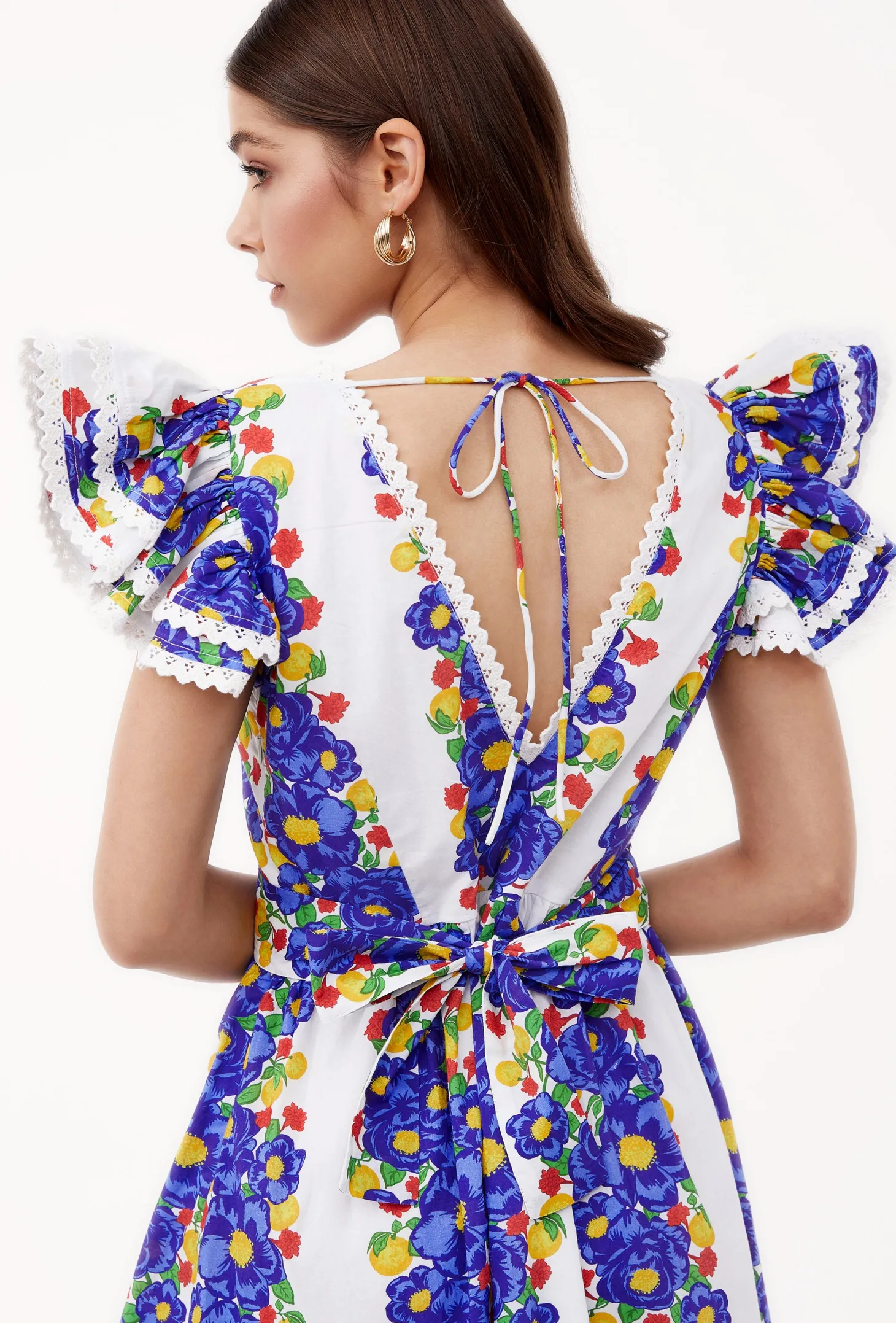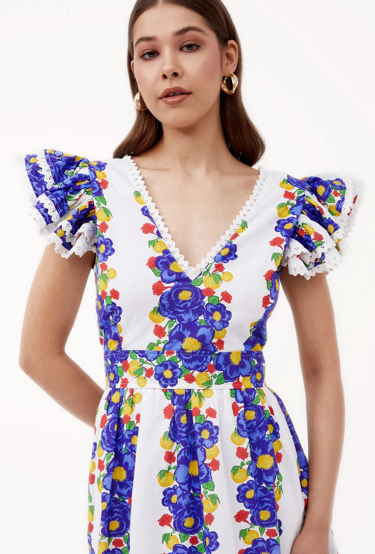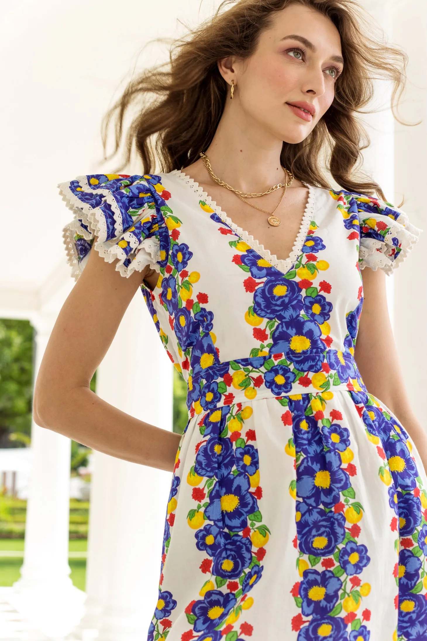 The Chloe is the ultimate jet set piece. With its flirty V-neck, its flutter sleeves and fitted self-tie waist, the Chloe is a great choice for a day outing but easily glams up for an evening event. Chloe is made from a soft, breathable cotton cambric fabric that will keep you cool on a hot summer day. The print artwork channels opulent garden parties held in the grand villas of Lake Como. The bold print embodies a celebration of indulgence.