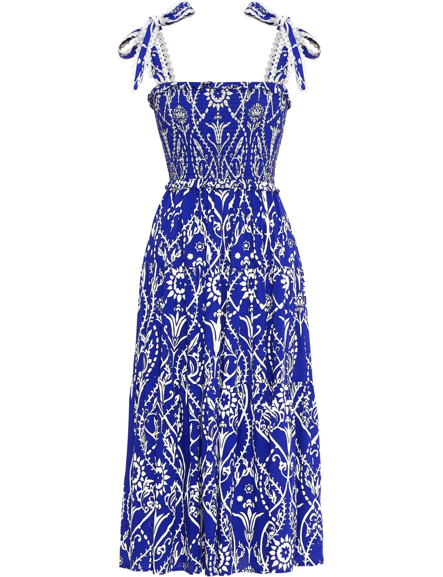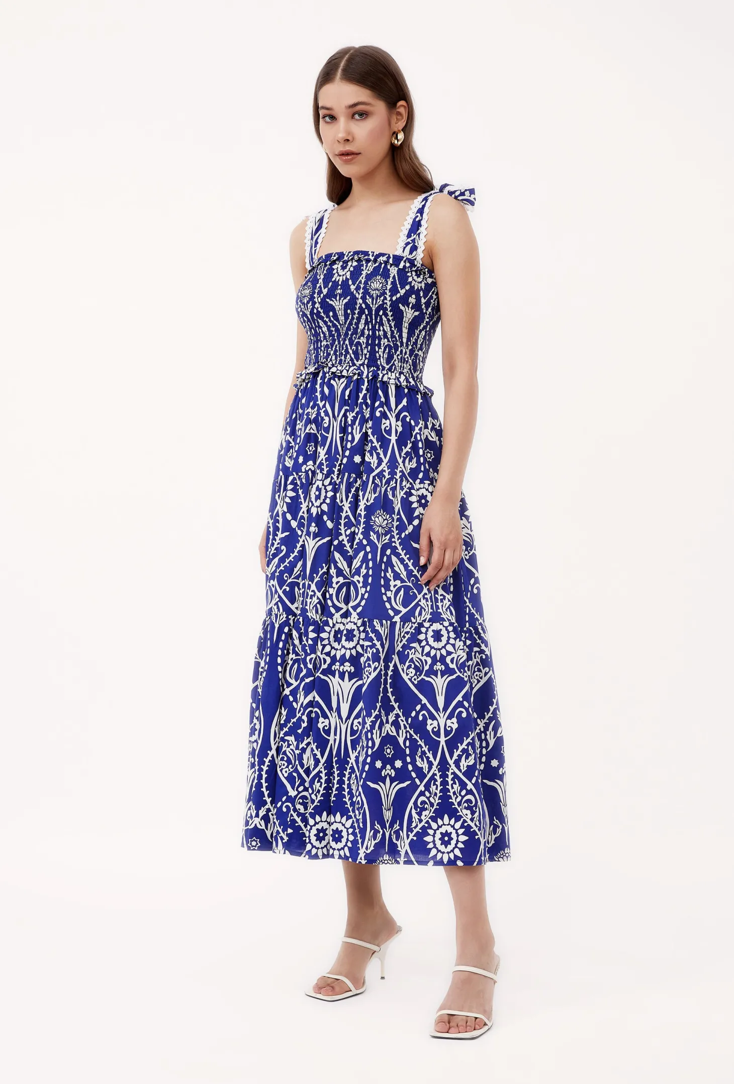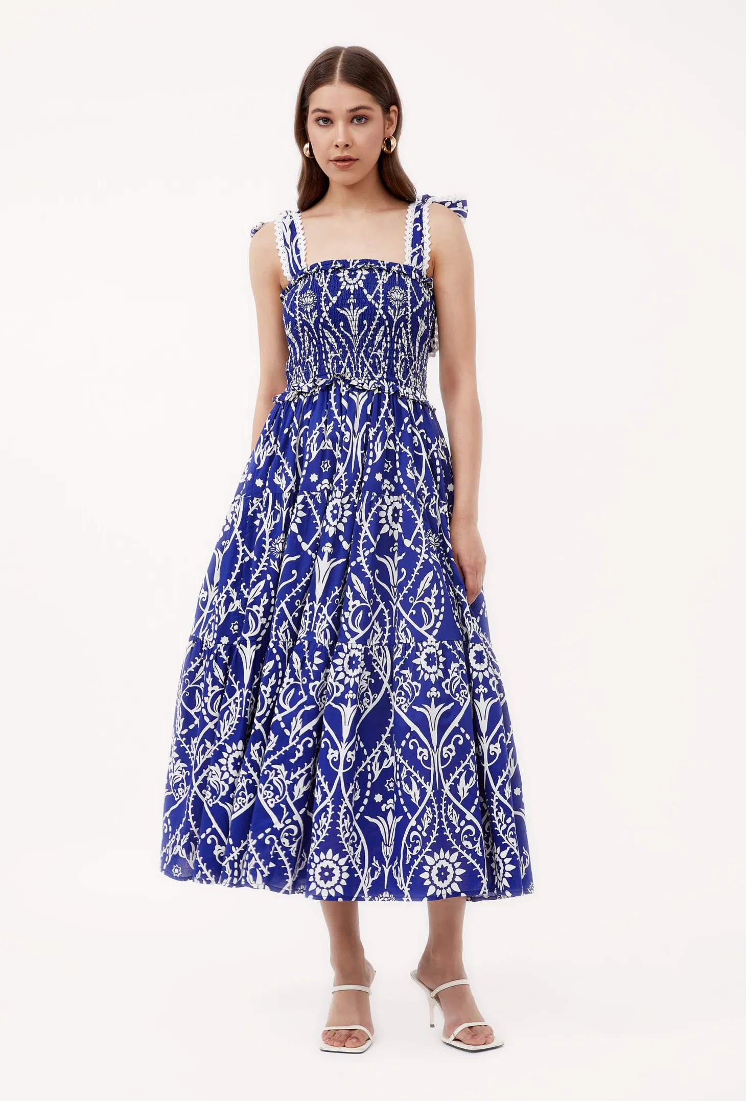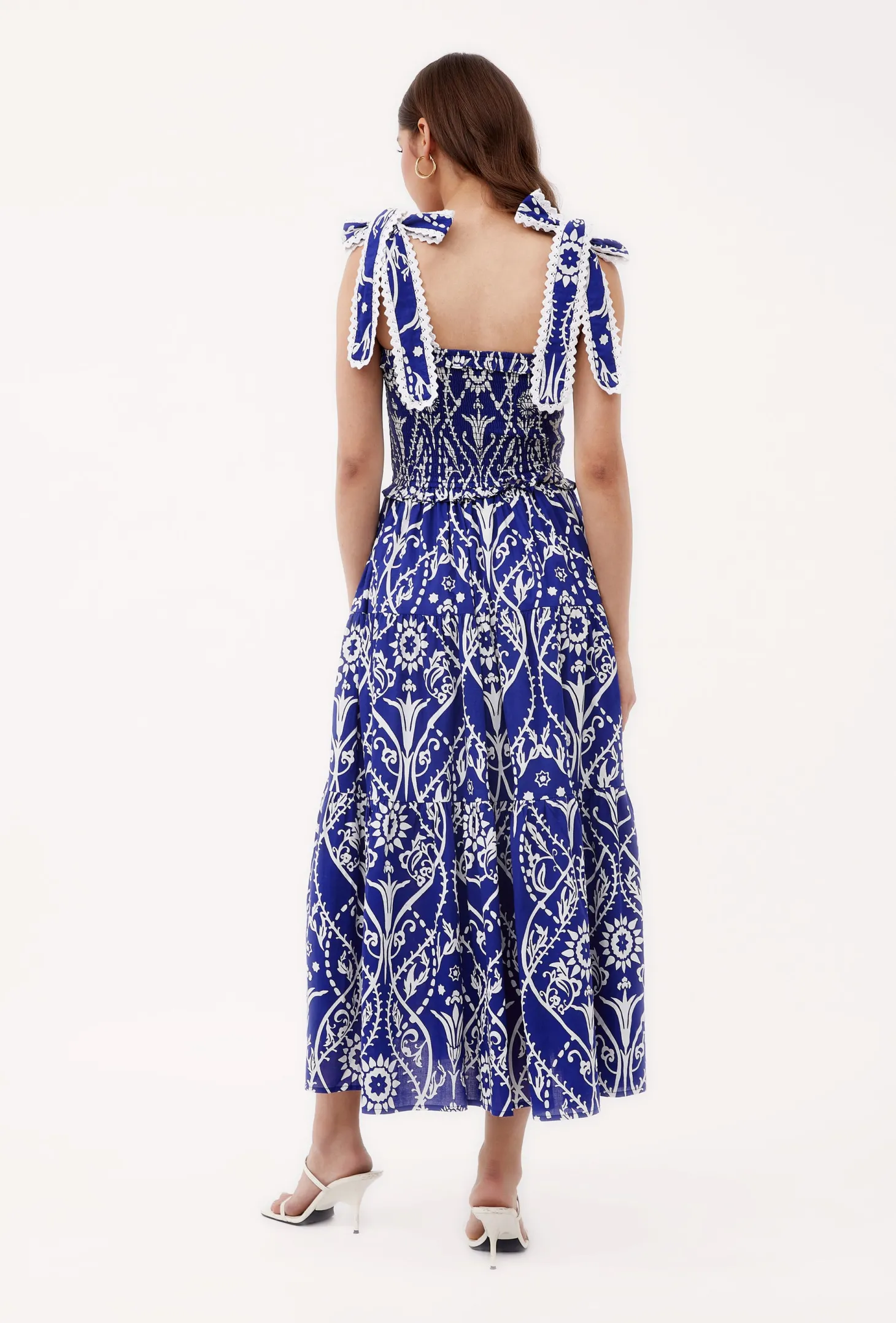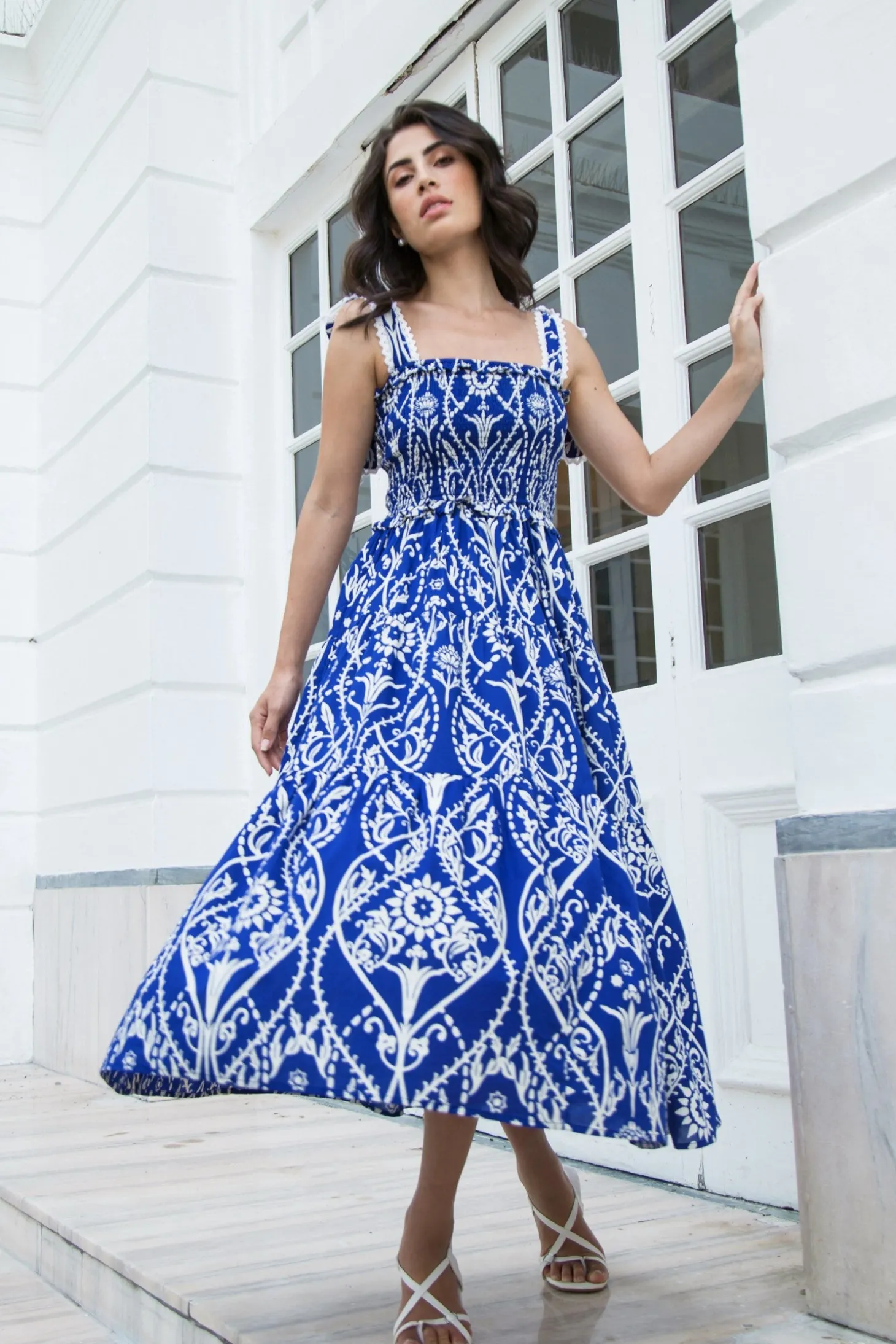 The playful Mia dress has a beautiful tiered A-line silhouette with romantic ruffle details on the waist. The smocked top and self-tie straps ensure comfort and a perfect fit. Mia is made from a soft, breathable cotton cambric fabric that will keep you cool on a hot summer day. The print design takes cues from Italian cathedrals, with round shapes reminiscent of rose windows and intricate floral ornaments inspired by the facades’ carvings and sculptures.
