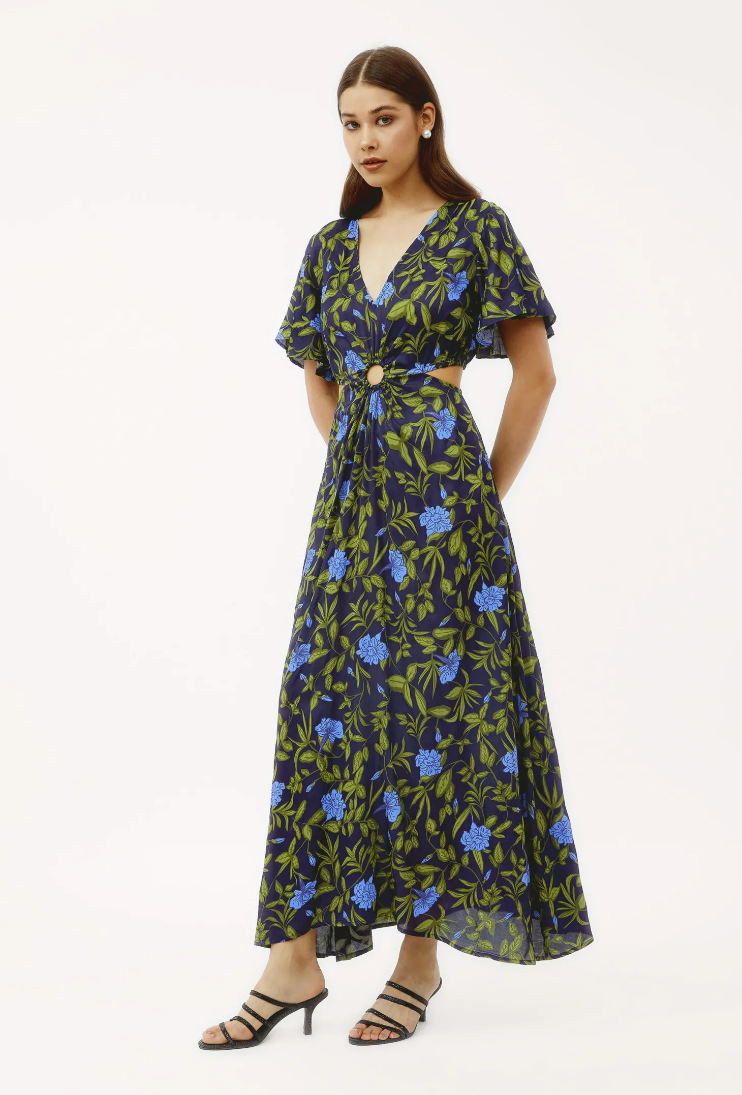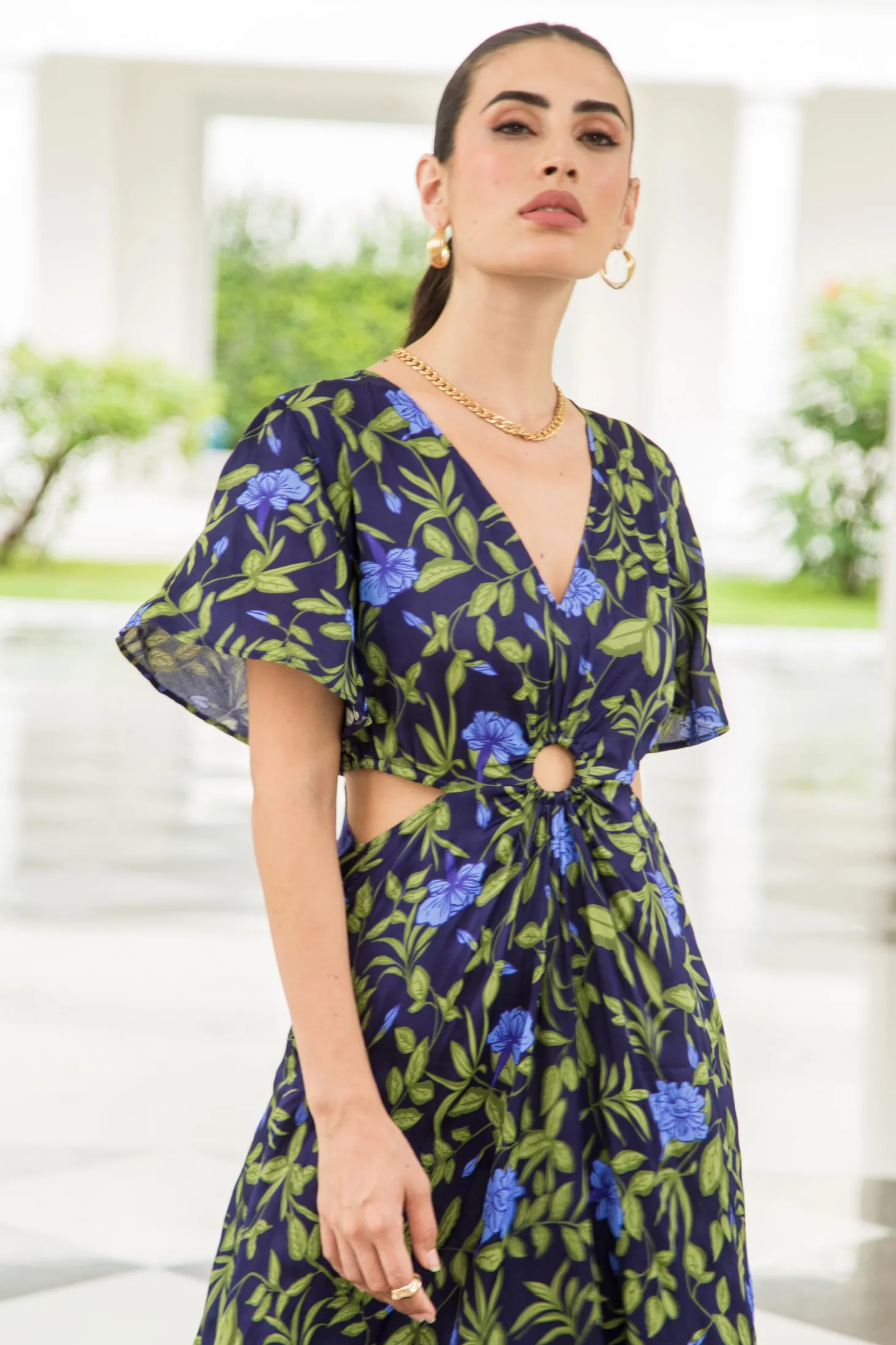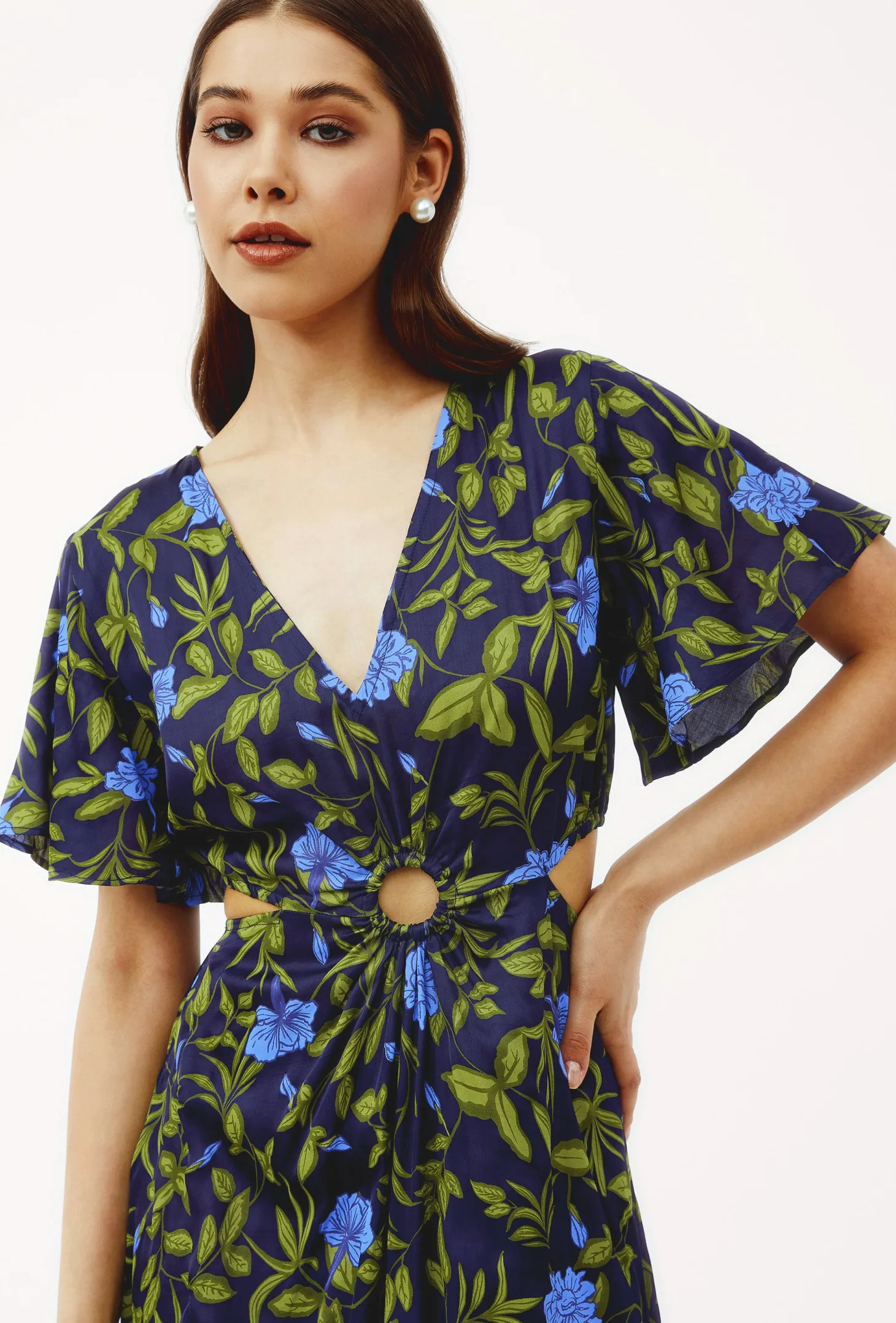 The Giselle dress, with its flattering cutouts at the waist, its enticing V-neck, butterfly sleeves and narrow A-line is the dress you wear to feel fabulous. Giselle is crafted from luxurious satin fabric with an elegant sheen and a fluid drape. The print design echoes the charm of Tuscan gardens in full bloom, showcasing vivid depictions of lilies and lush greens.