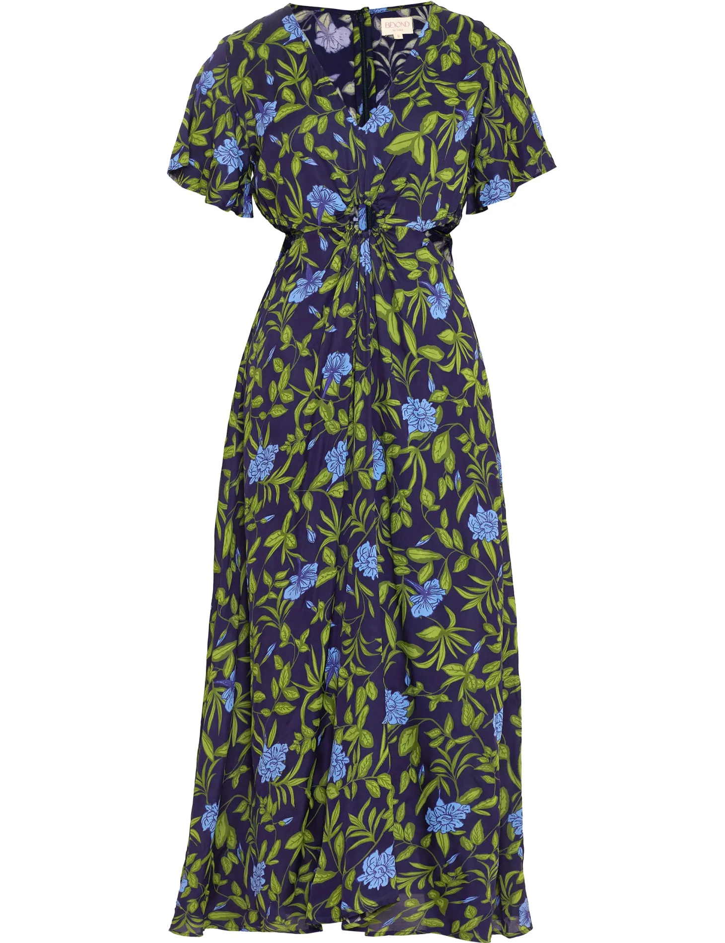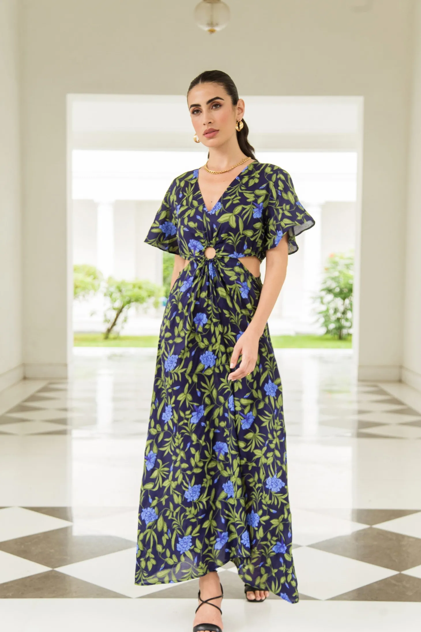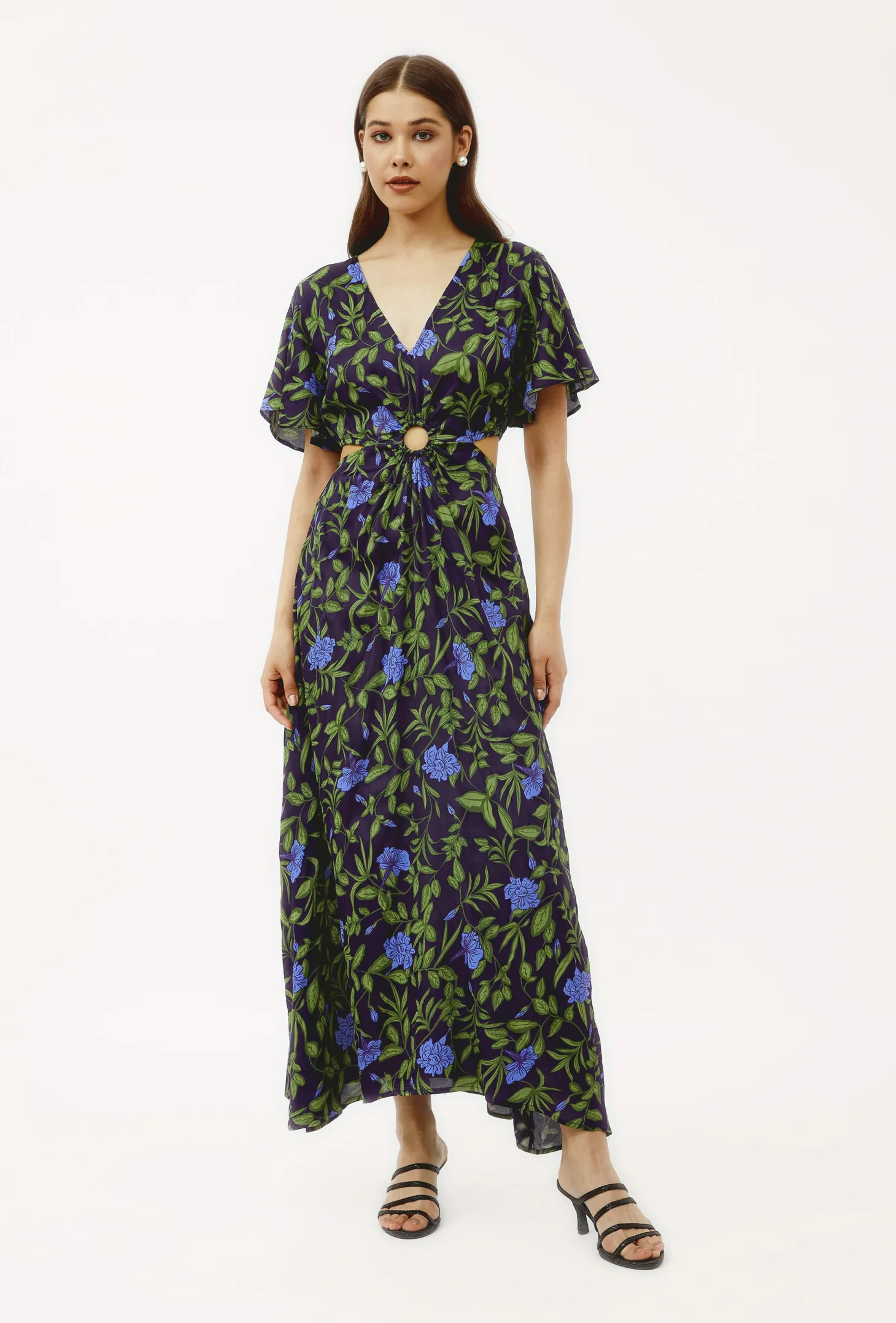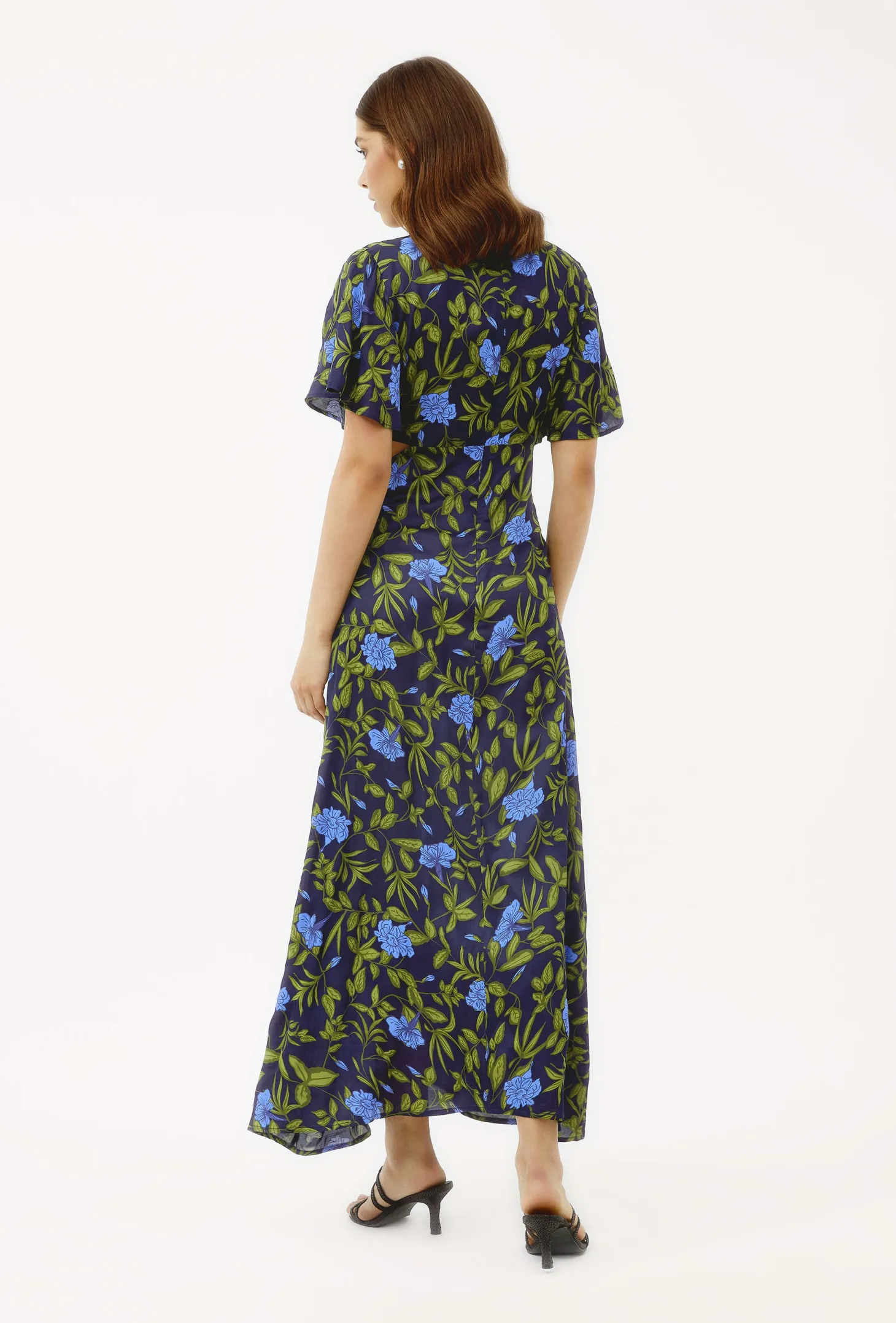 The Giselle dress, with its flattering cutouts at the waist, its enticing V-neck, butterfly sleeves and narrow A-line is the dress you wear to feel fabulous. Giselle is crafted from luxurious satin fabric with an elegant sheen and a fluid drape. The print design echoes the charm of Tuscan gardens in full bloom, showcasing vivid depictions of lilies and lush greens.