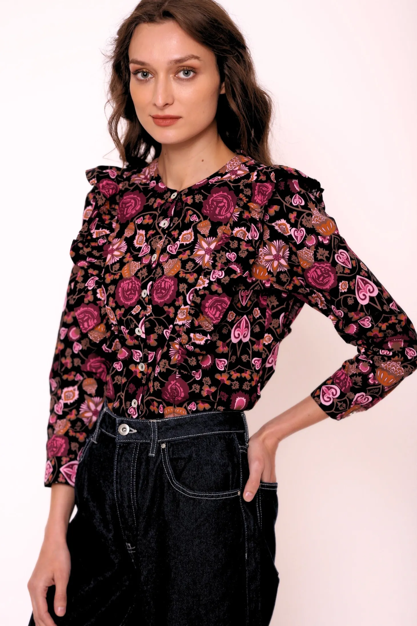 Our Johanna channels modern romance with its flouncy ruffles and flattering shape. Leave a few of the buttons undone for a more relaxed look. To complete the look, pair the Johanna with our Gia skirt or with Jeans. Johanna is made from soft, breathable cotton. The floral print pays homage to the beauty of traditional embroidery artworks found in century old Austrian “Tracht” costumes.