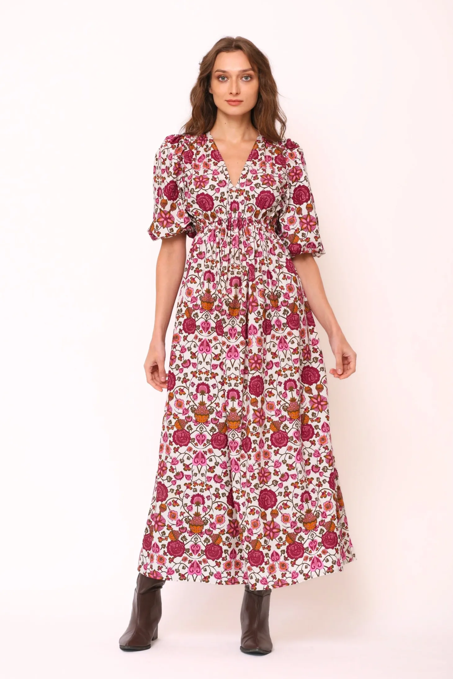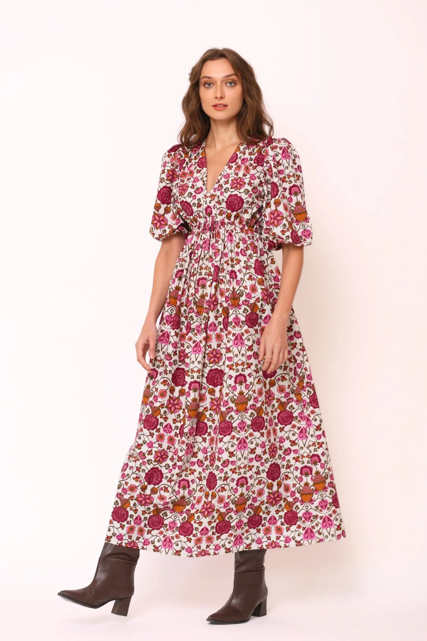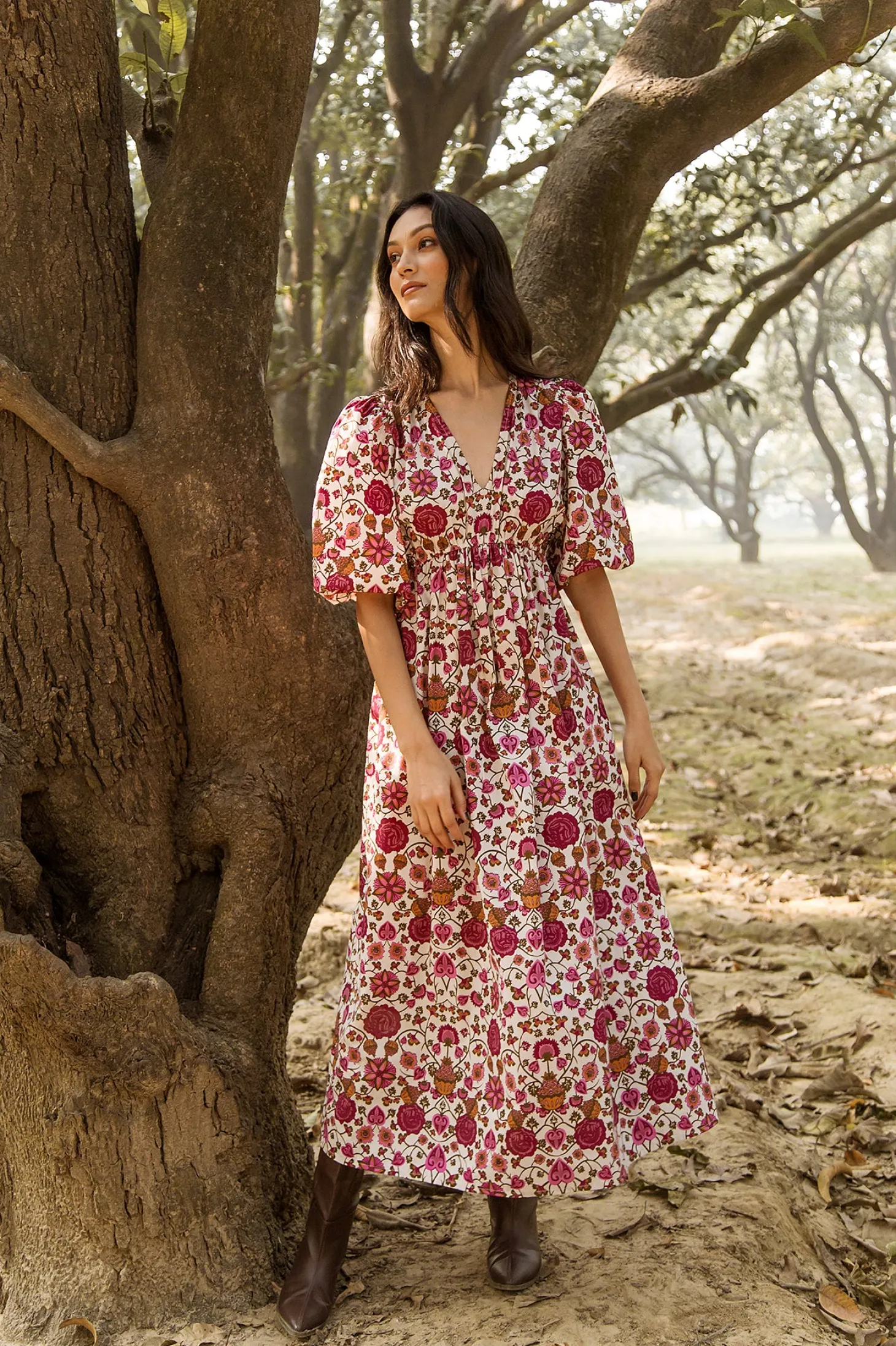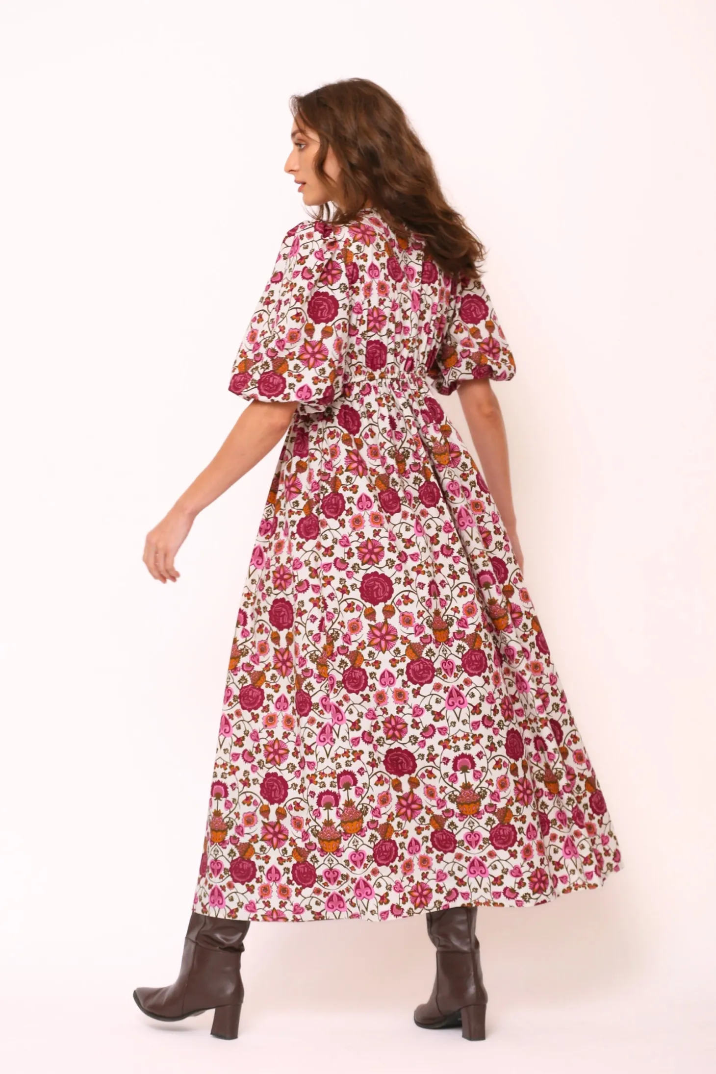 With its elbow-length puffed sleeves, V-neck, elastic waistband and flattering A-line, the Emilia Dress is a fall favorite. Layer with a cardigan and boots as the temperature drops, this midi length dress says fall sophistication. Emilia is made from soft, breathable cotton. The “Orchard” print that references the natural beauty of apple orchards in the apple-growing region of Austria’s highlands.