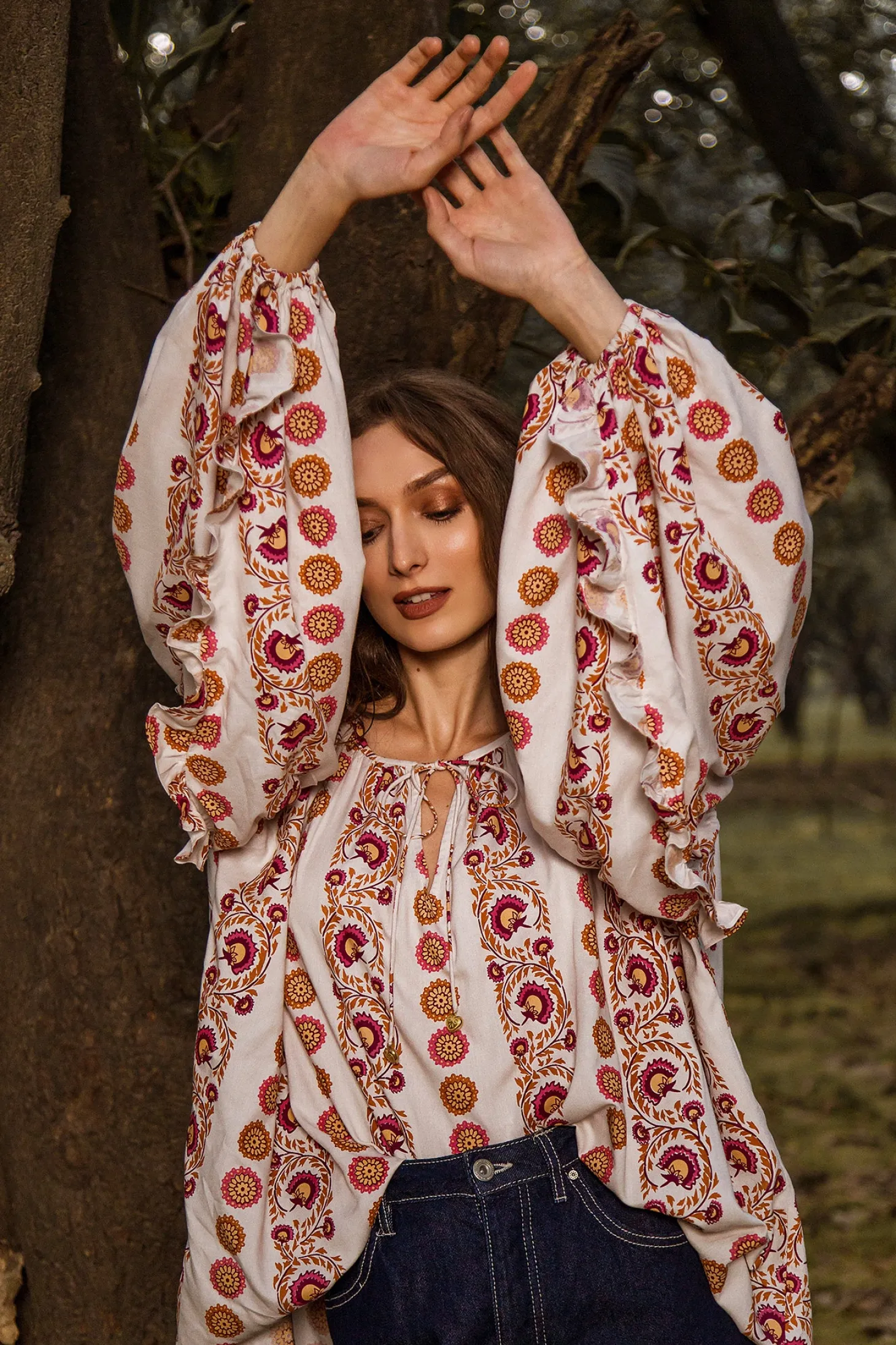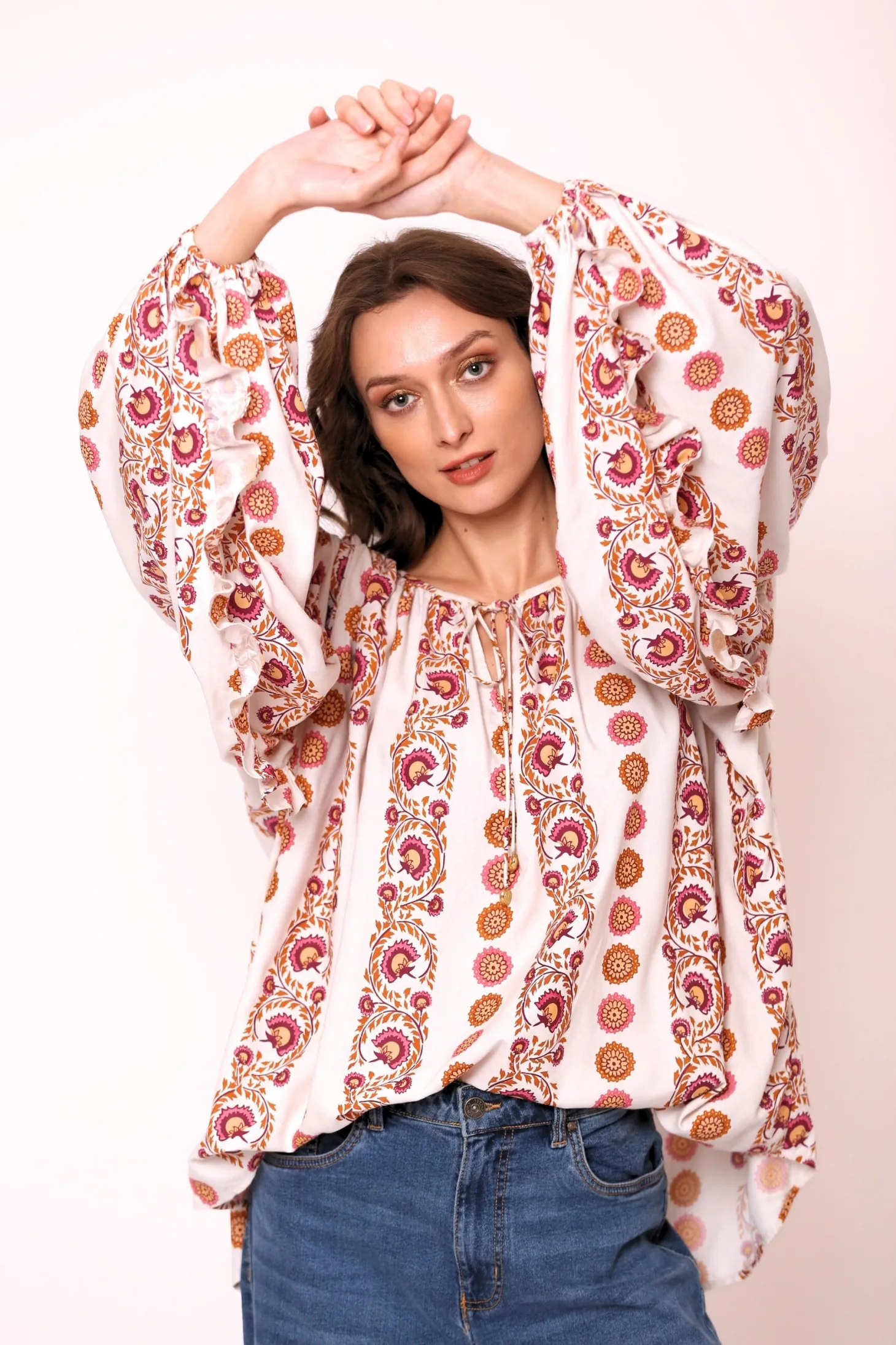 The Julia is an effortless, airy silhouette with full blouson sleeves. The versatile top features an open neckline with a delicate self-tie closure adorned with hand-made brass hearts. Tuck it into our high-waisted Teresa pants or pair it with Denim for a more casual look. Julia is made from ultra soft, plant-based Viscose that drapes beautifully. The print aims to portray the sunrise on top of a mountain, minute by minute bathing the nearby plateaus and valleys in hues of blue, pink, yellow and orange.