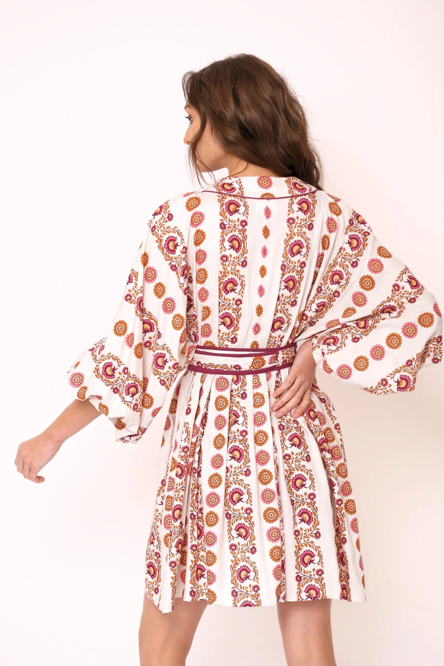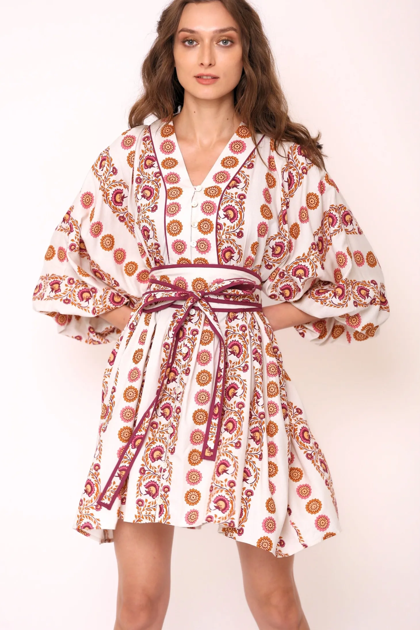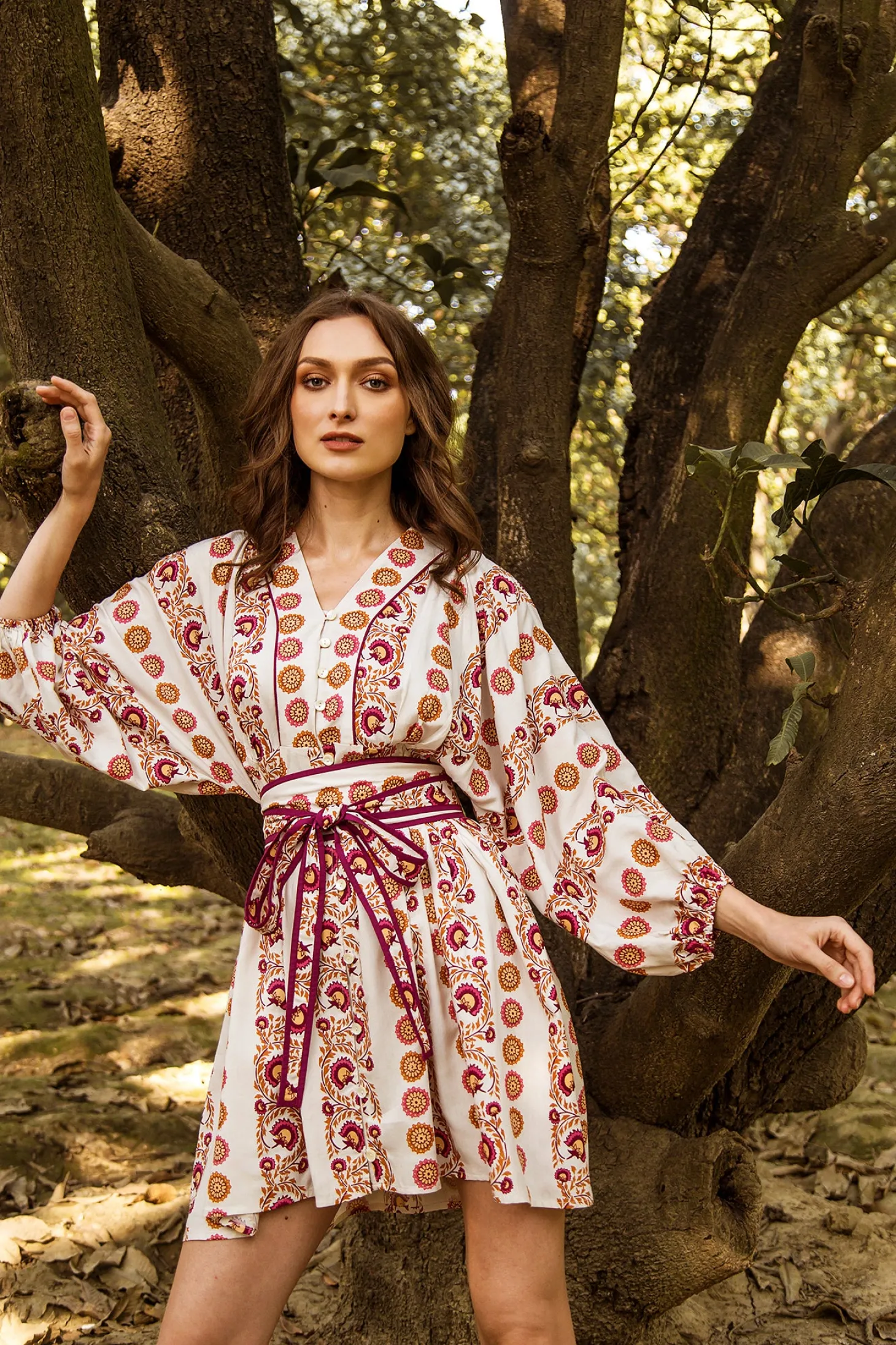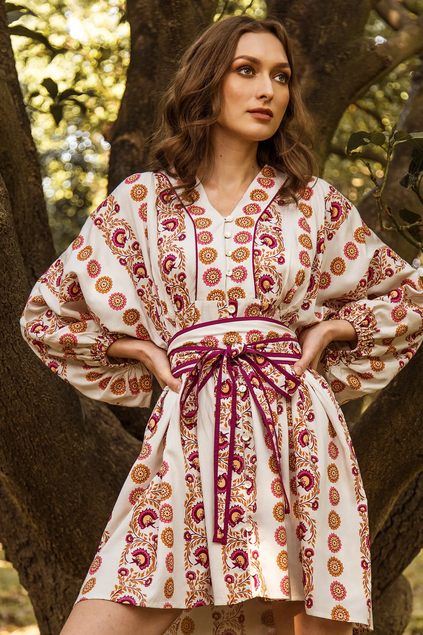 The Lara showcases a wonderful synergy between sophistication and ease. Lara showcases a loose, A-line body, blouson sleeves and a buttoned-down V-neck. Accentuate the waist with the featured obi belt. Lara is made from ultra soft, plant-based Viscose that drapesbeautifully. The print aims to portray the sunrise on top of a mountain, minute by minute bathing the nearby plateaus and valleys in hues of blue, pink, yellow and orange.