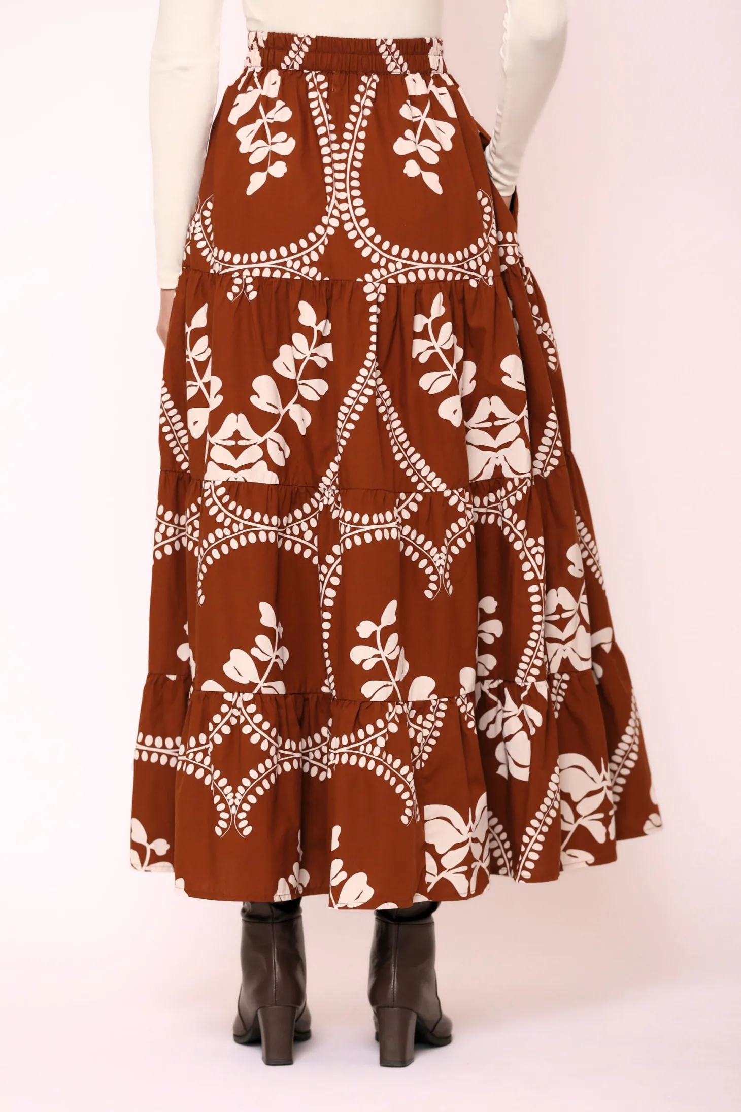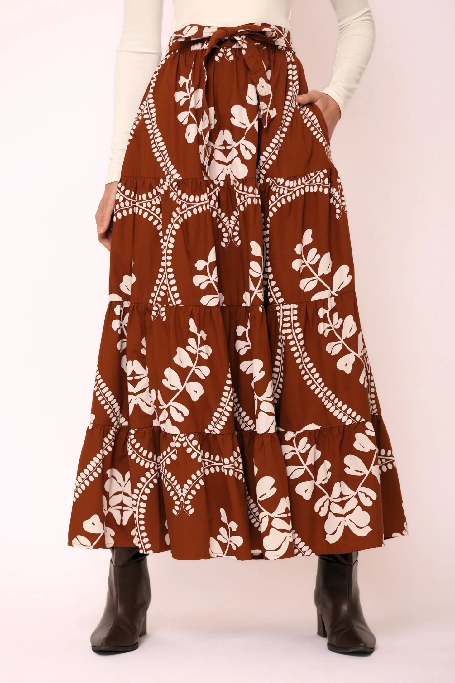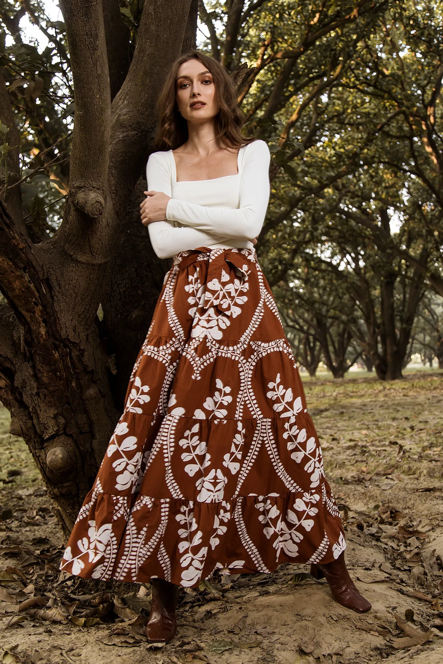 The Gia skirt is back in a new intriguing print. The elastic waist, self-tie belt, tiered A-line and hidden pockets channel elegance with ease. Pair it with our Johanna top or dress down with a white t-shirt and trainers. Gia is made from soft, breathable cotton. With this print, designer Vera Fritsch takes you on a journey to “Styria”, her home region in Austria. Because of its dense forests and lush meadows, it is often called the “Green Heart” of Austria.
