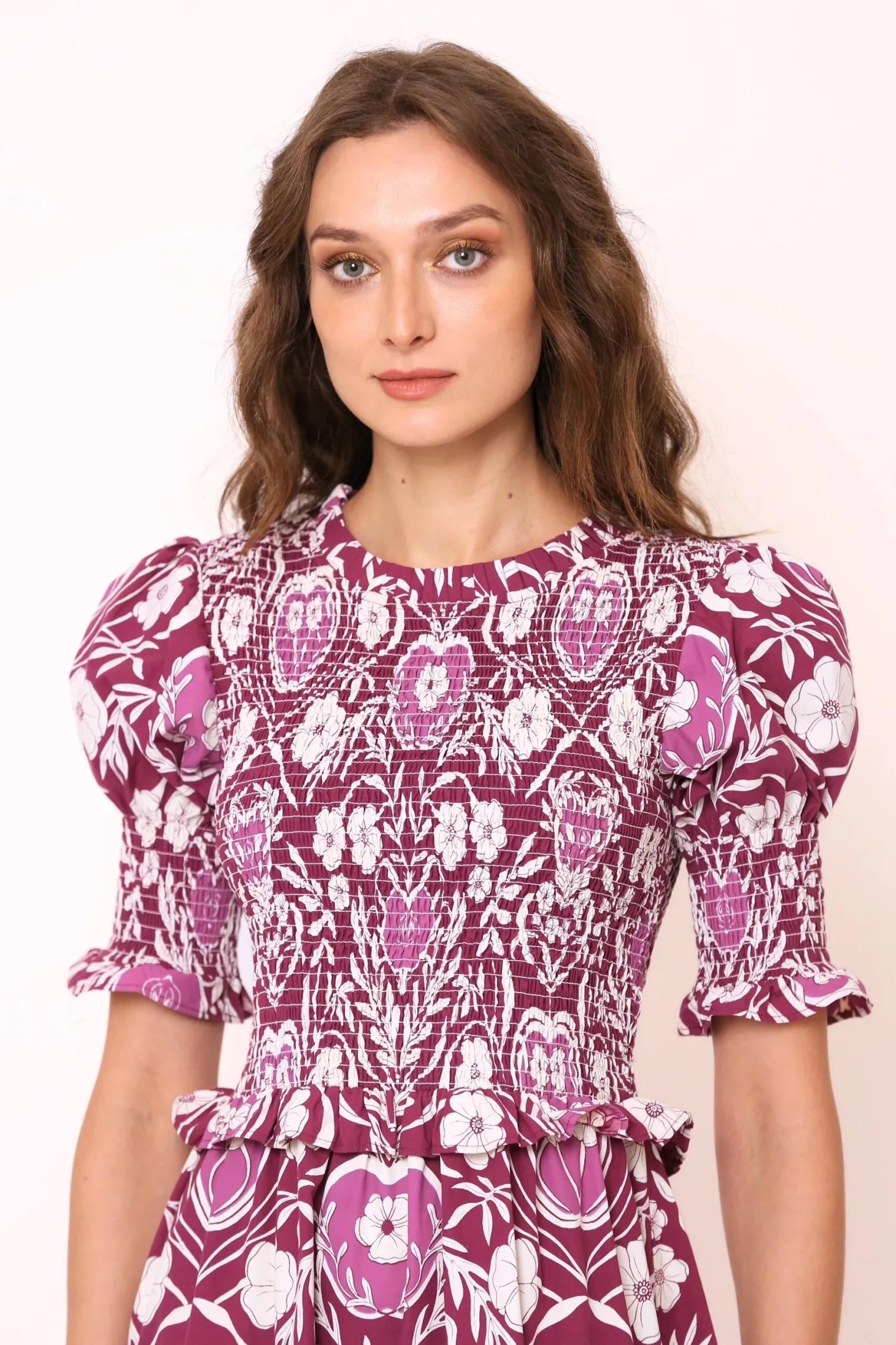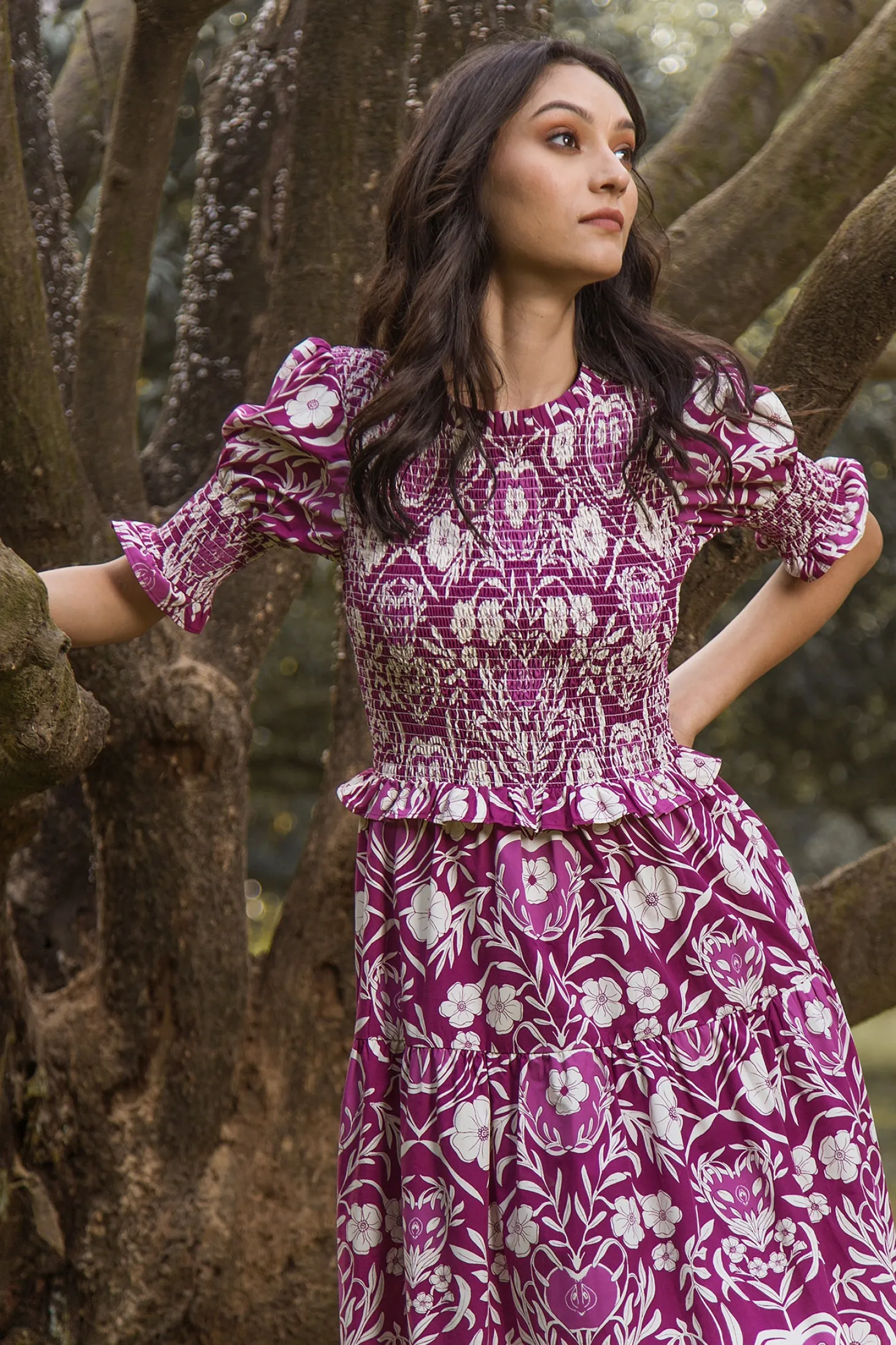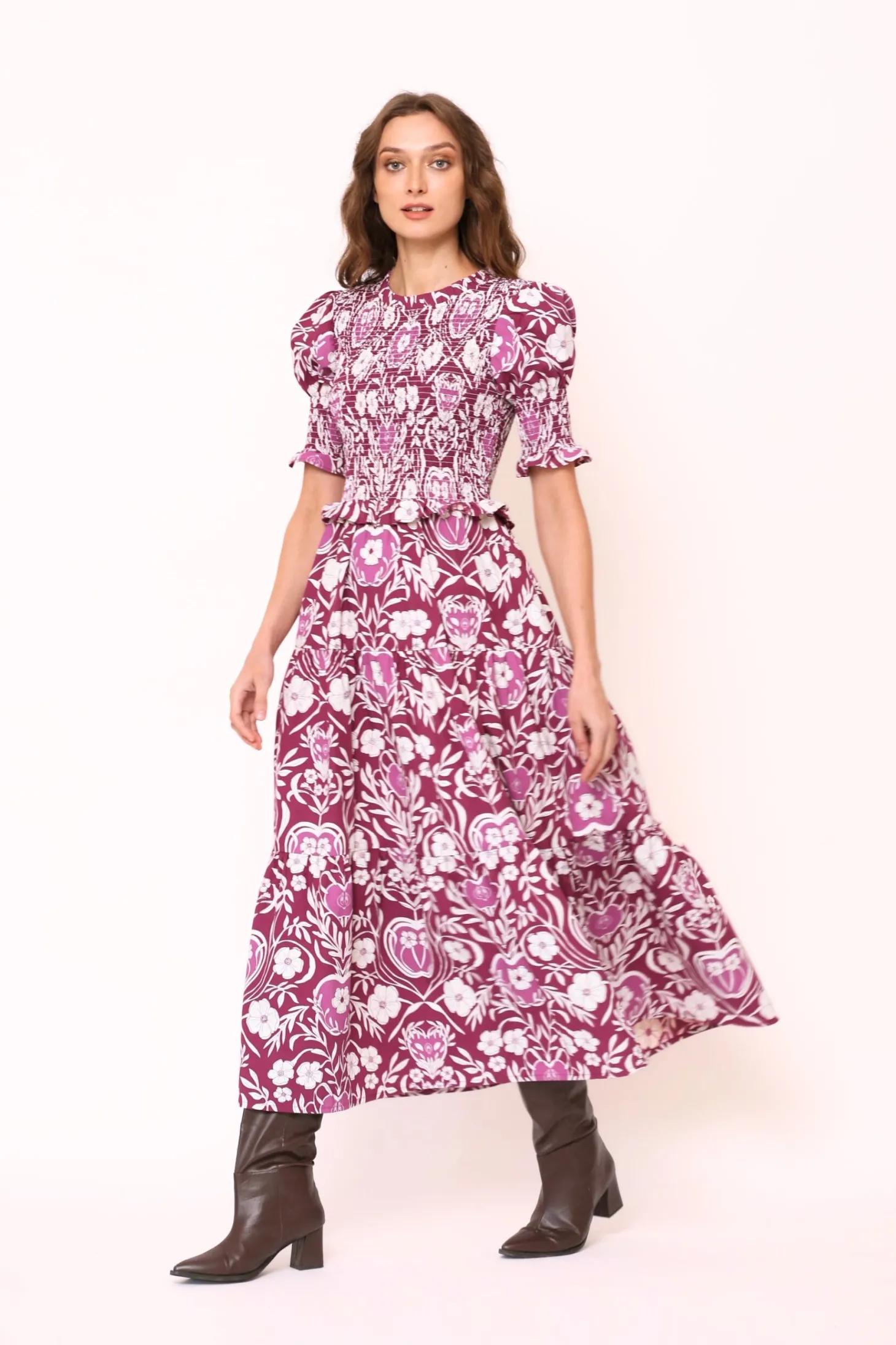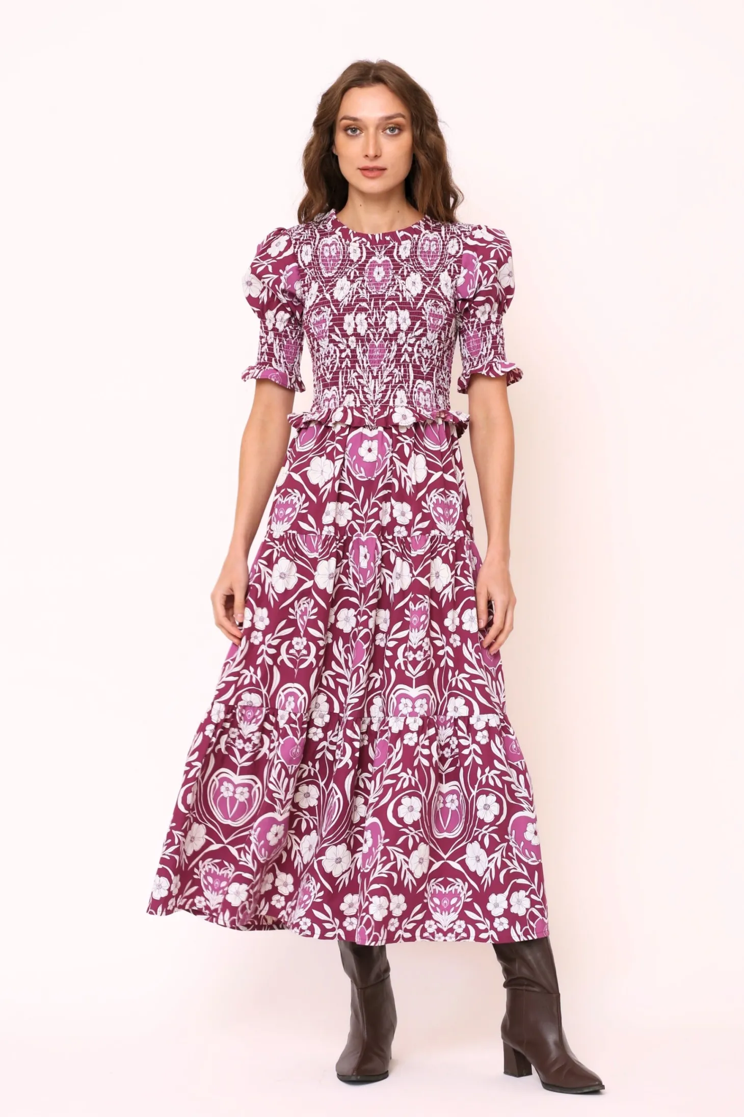 The Klara strikes the right balance between sophistication and ease with its smocked bodice, tiered A-line skirt and flattering puff sleeves. The delicate frills on the neckline, cuffs and waist give it an elegant touch. Klara is made from soft, breathable cotton. Klara is designed in our “Orchard” print that references the natural beauty of apple orchards in the apple-growing region of Austria’s highlands.