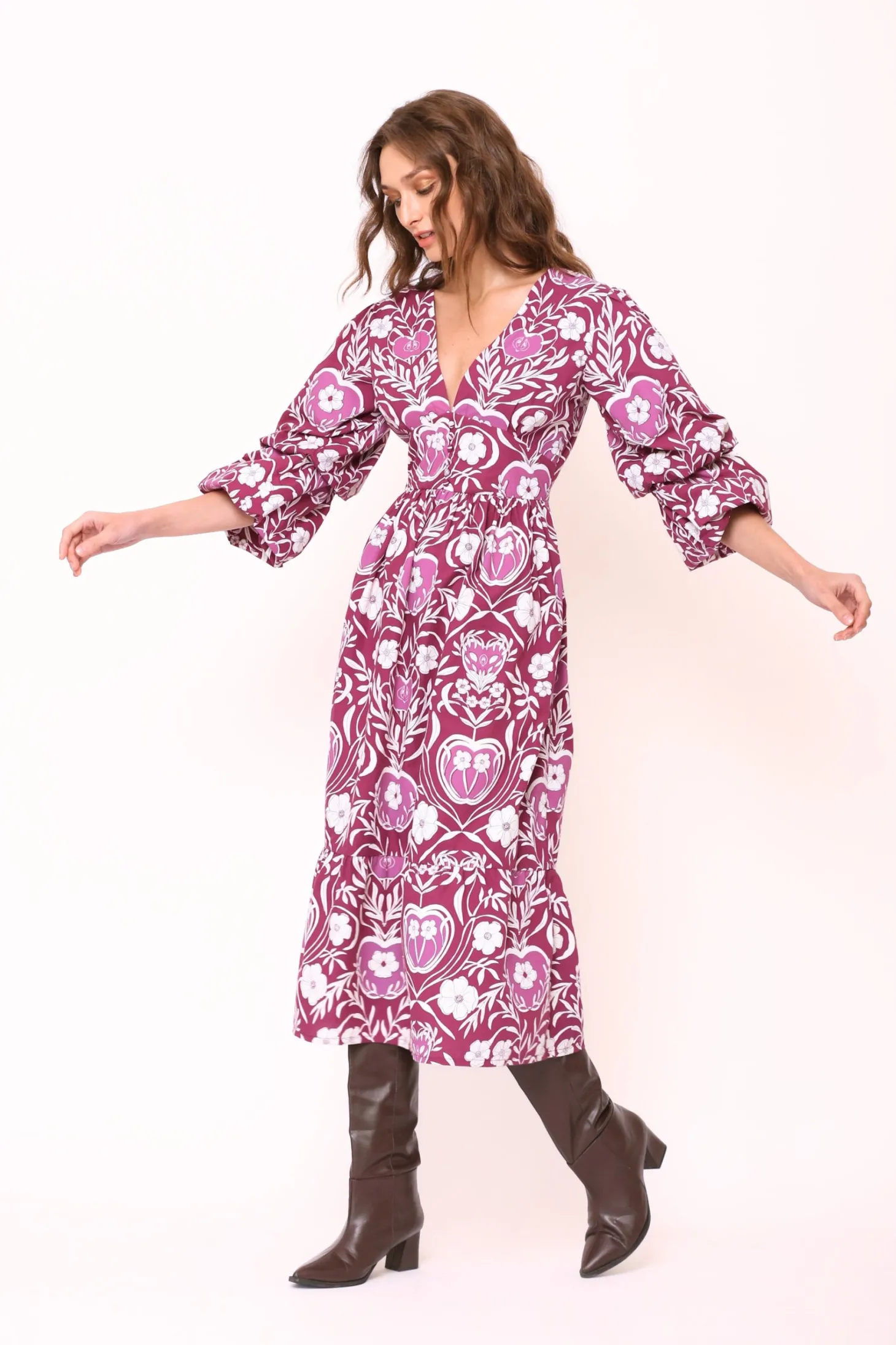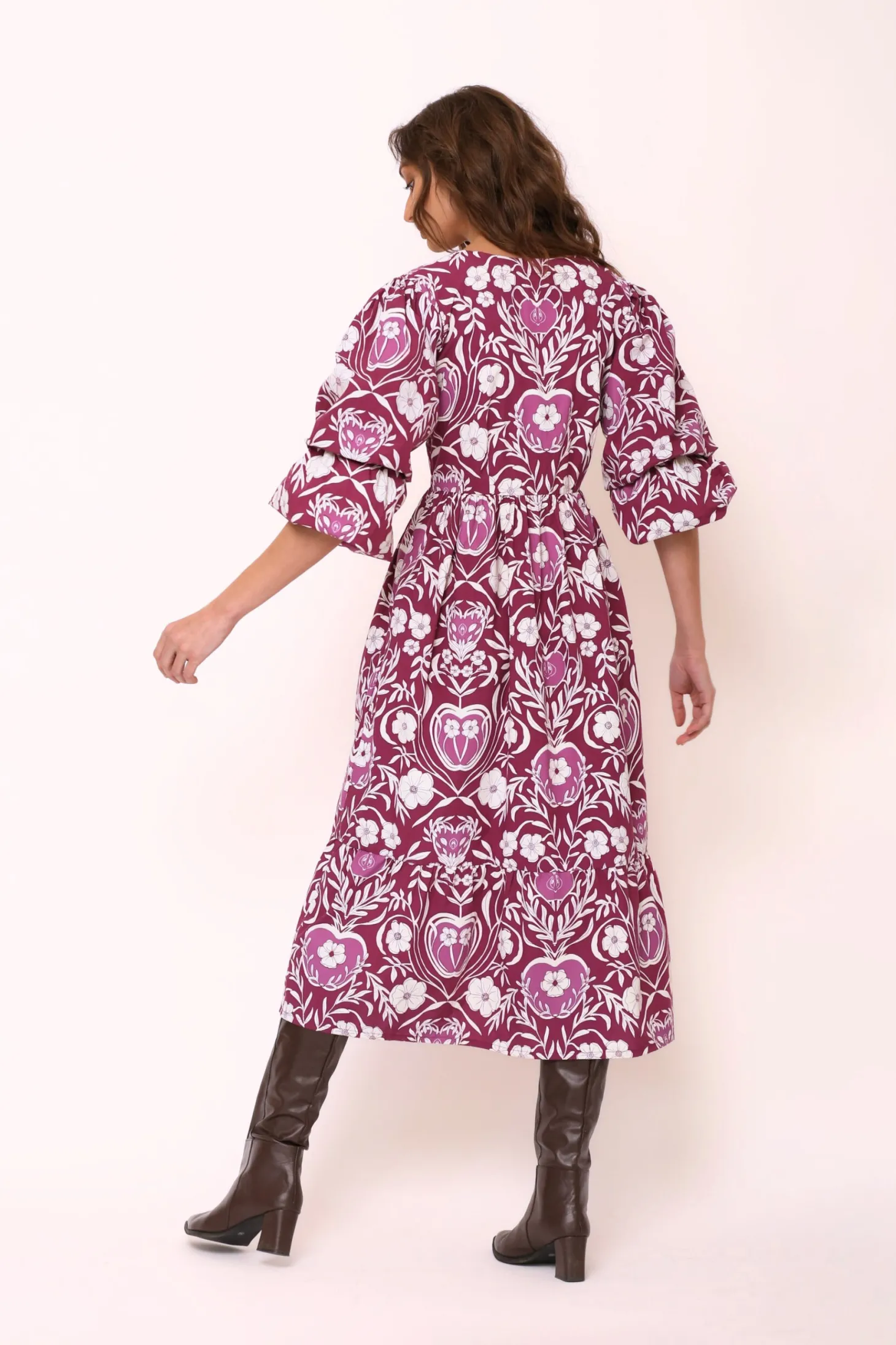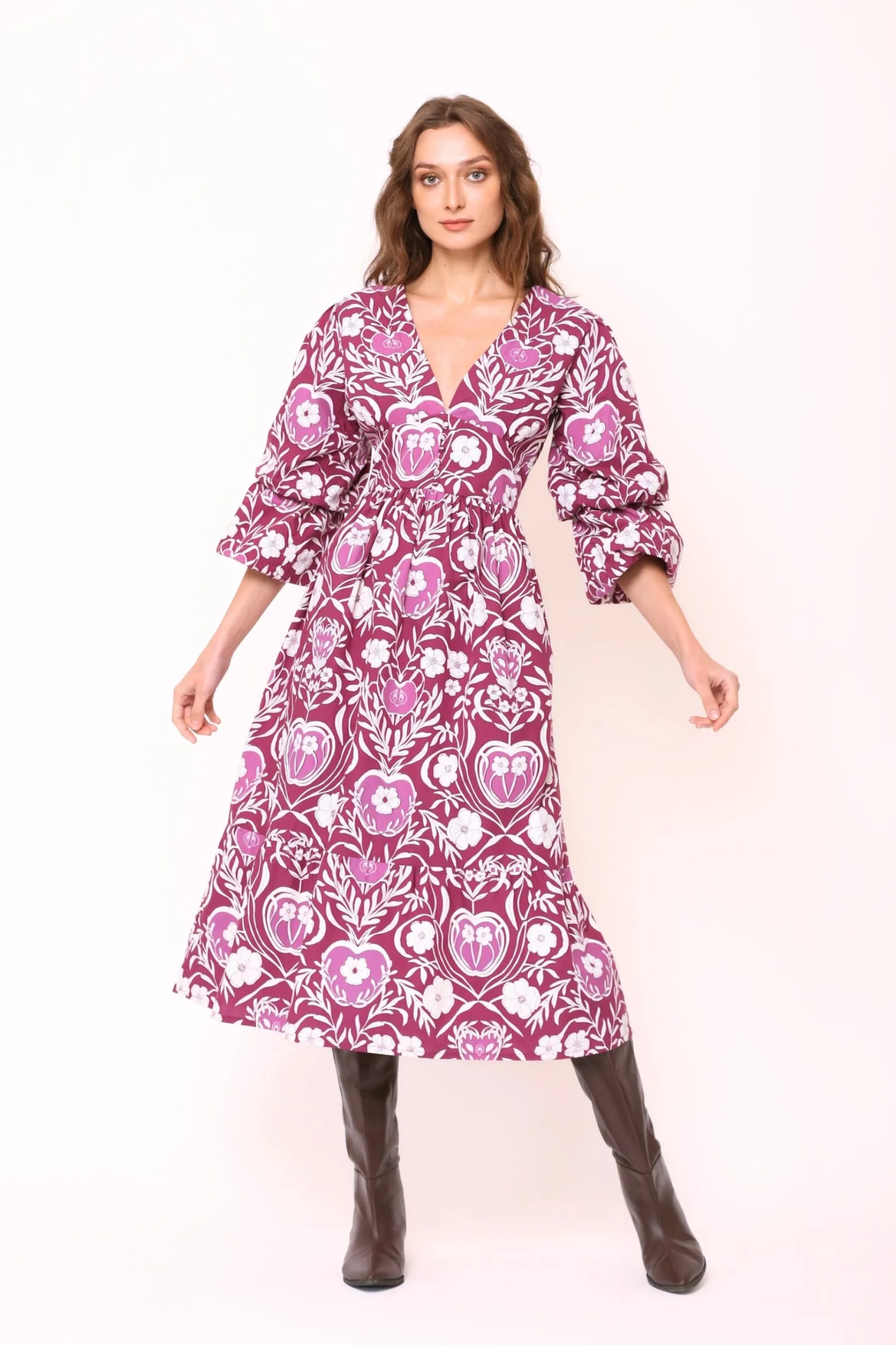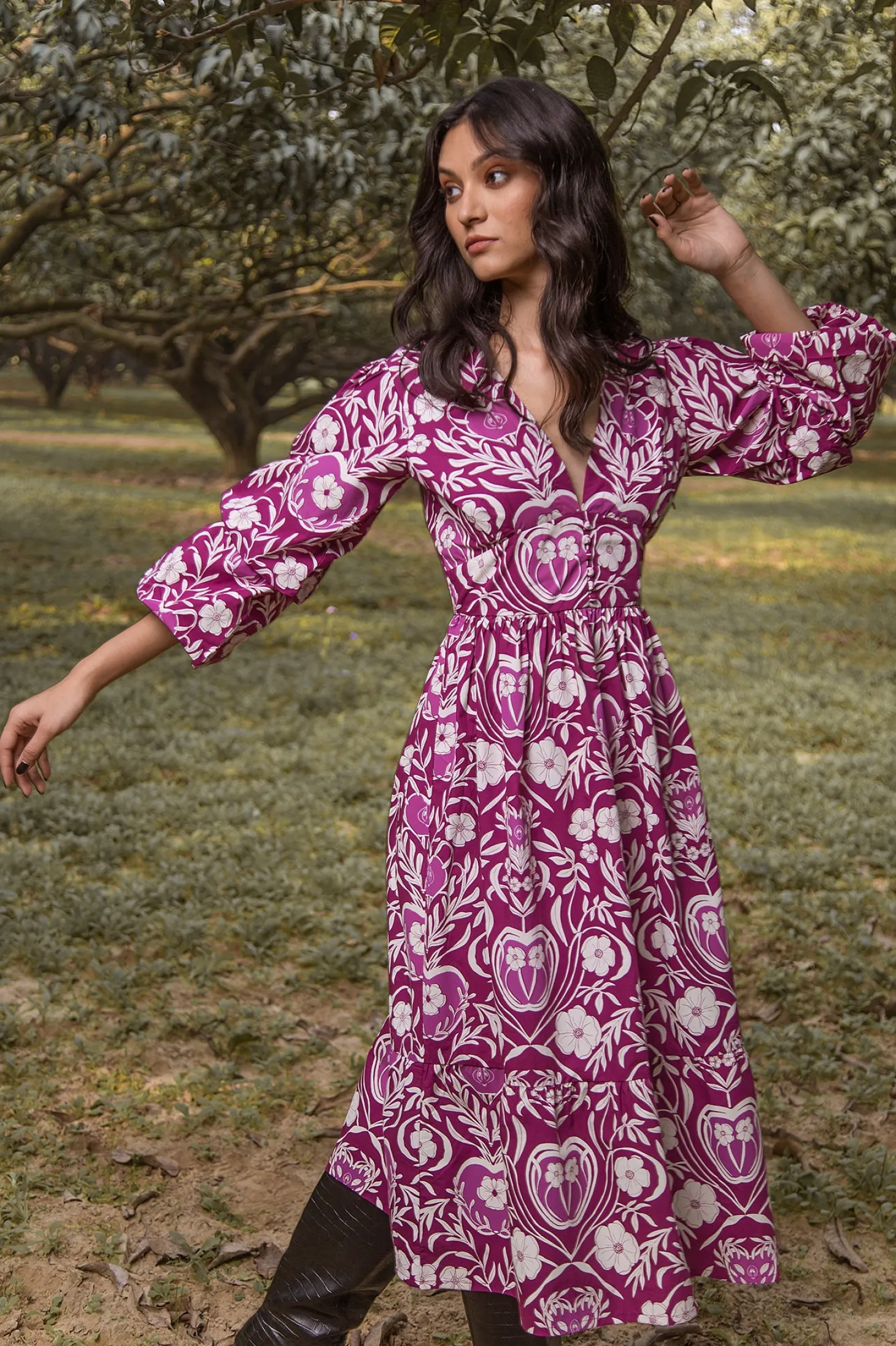 The Bianca dress features double puff sleeves, an enticing V-neck, a fitted waist and flattering A-line skirt creating a look of empowering femininity. Bianca is made from soft, breathable cotton. The print references the natural beauty of apple orchards in the apple-growing region of Austria’s highlands.