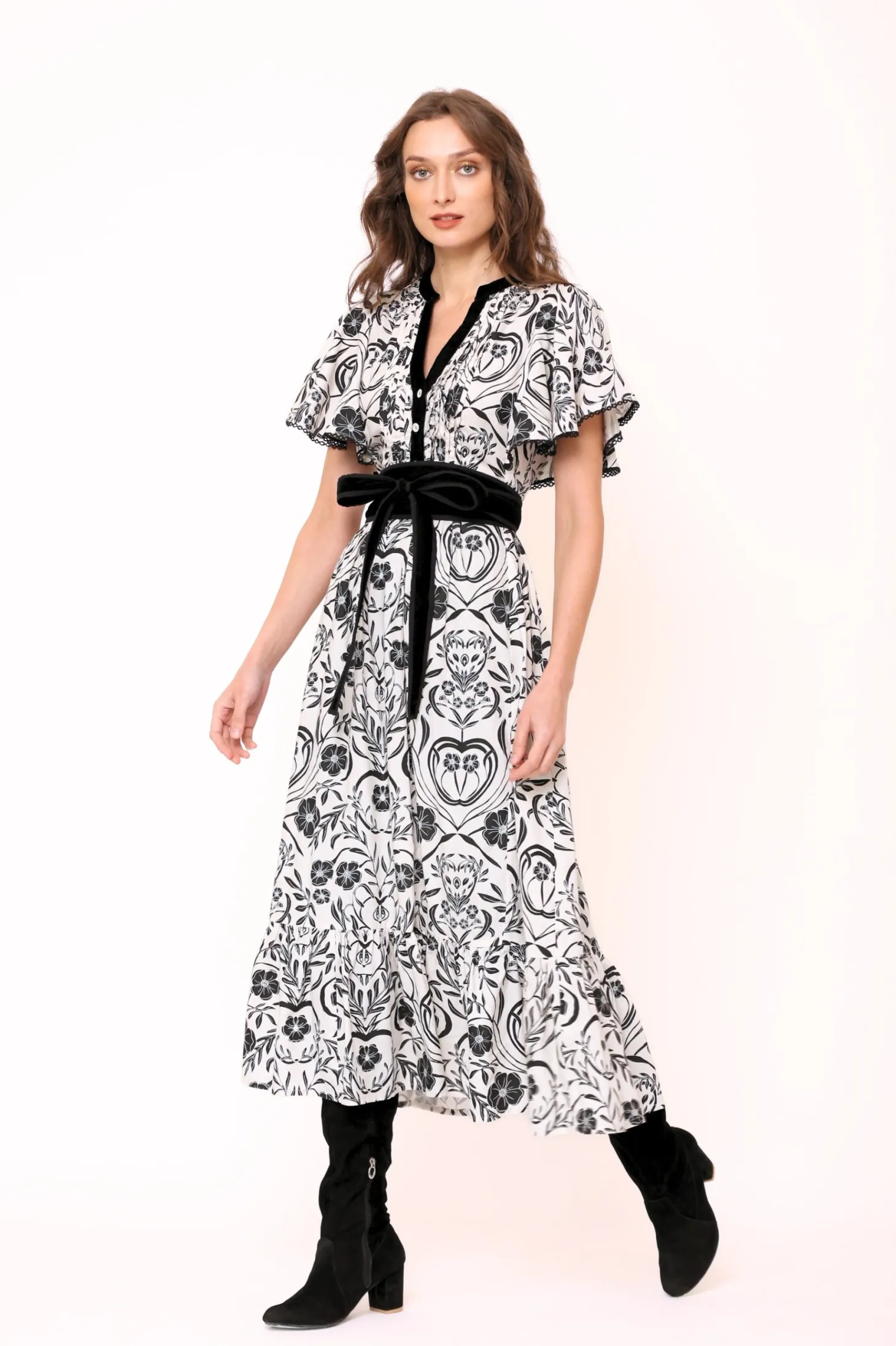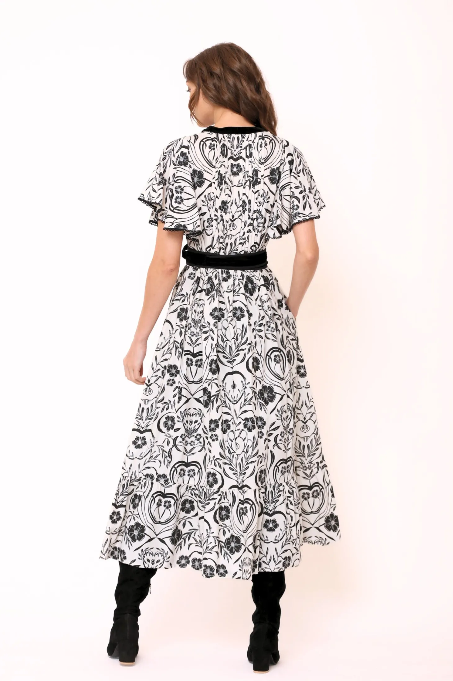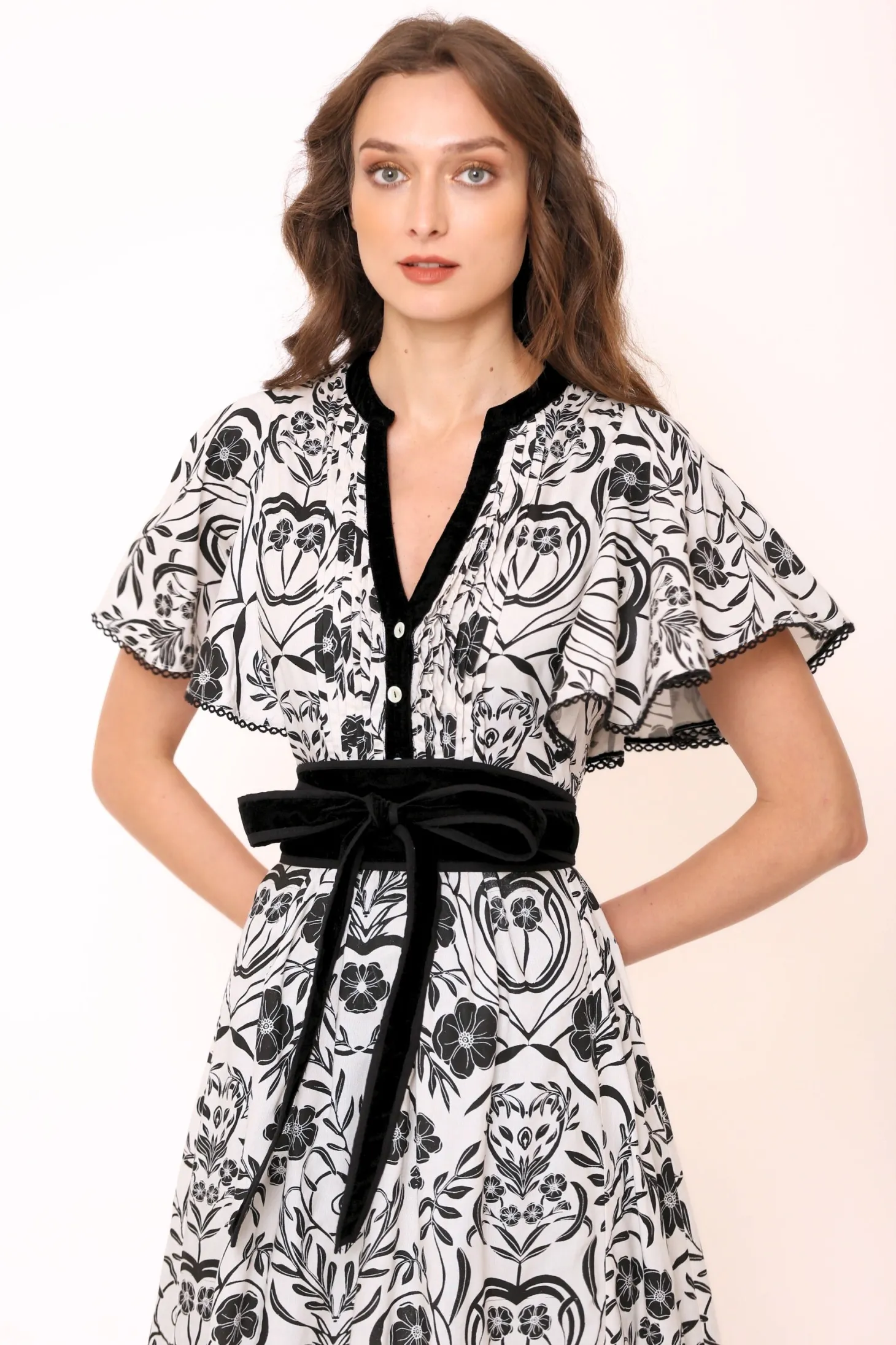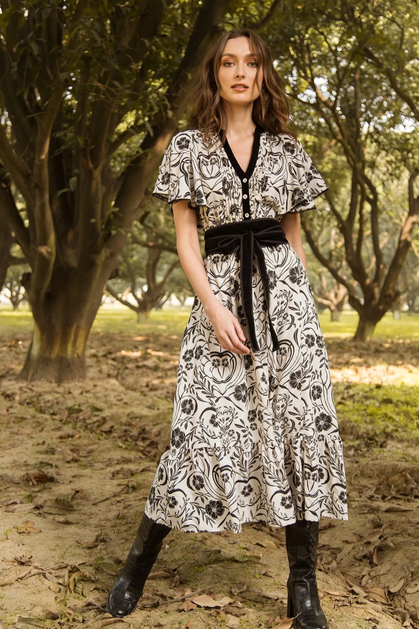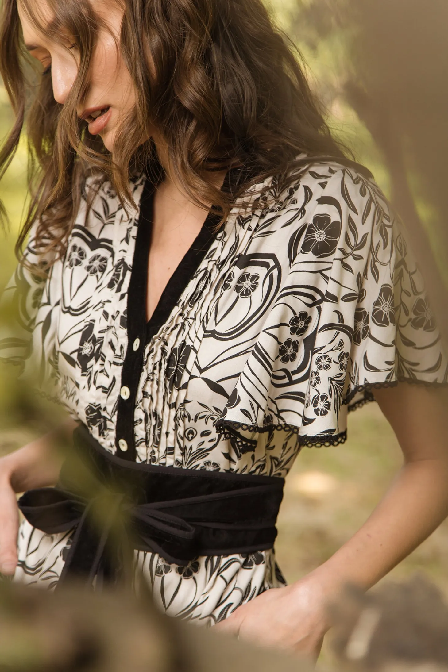 It’s all in the details: the Leni is adorned with delicate lace trims on the neckline, and flutter sleeves. Cut loose for a universally flattering fit, the Leni features subtle pleats on the bodice as well as a ruffled hem. Accentuate the waist with the featured obi belt. Leni is made from ultra soft, plant-based Viscose that drapesbeautifully. The print references the natural beauty of apple orchards in the apple-growing region of Austria’s highlands.