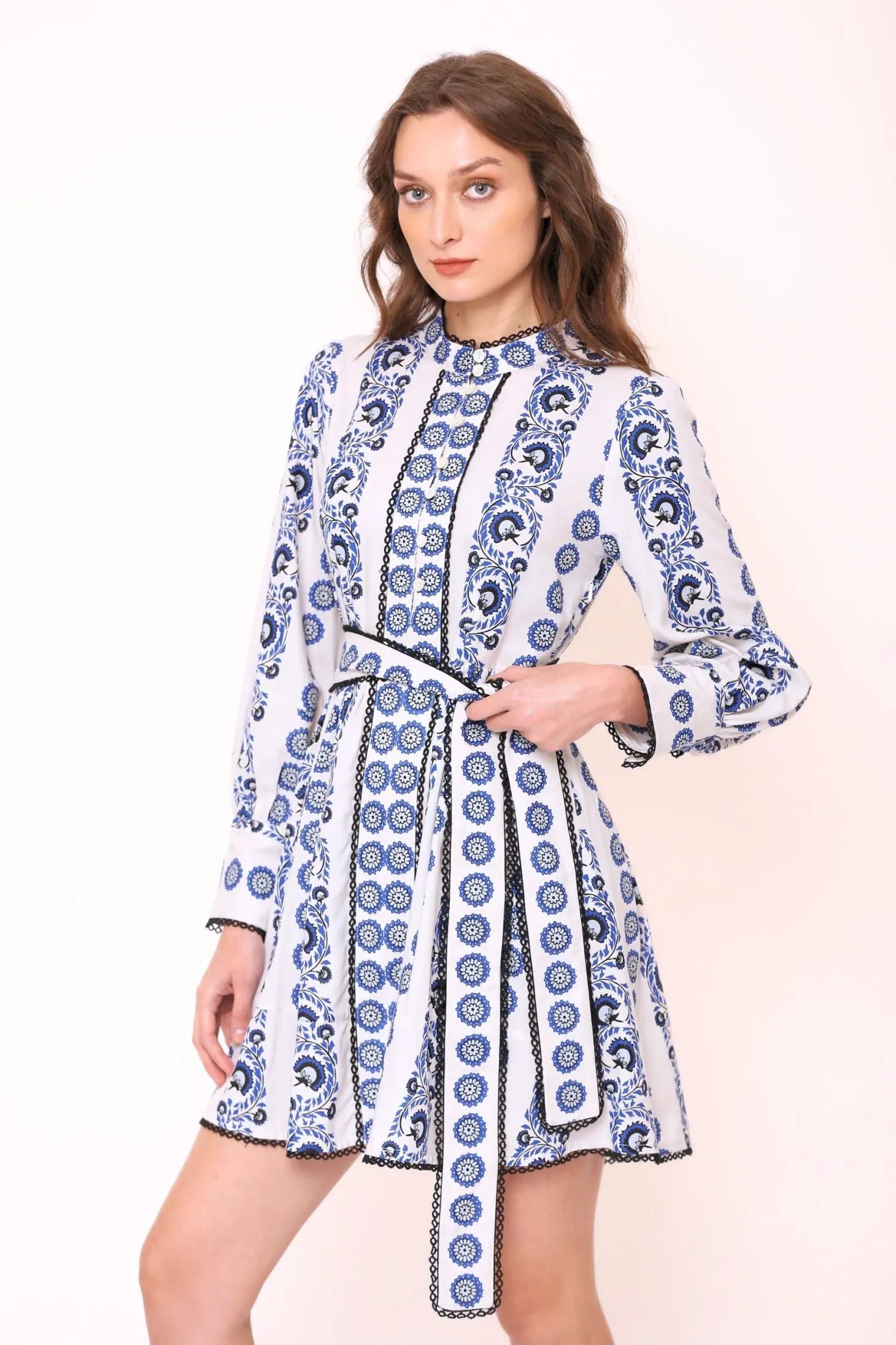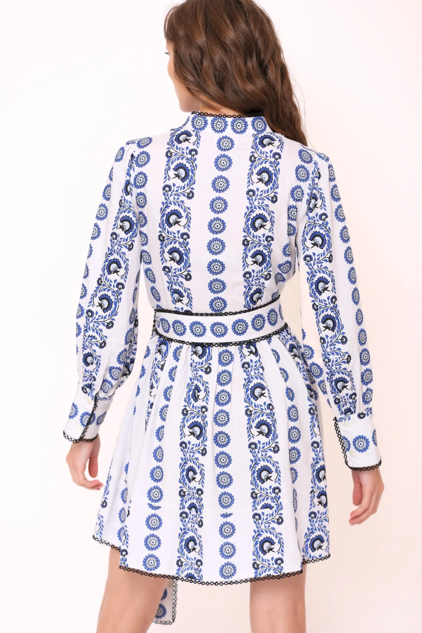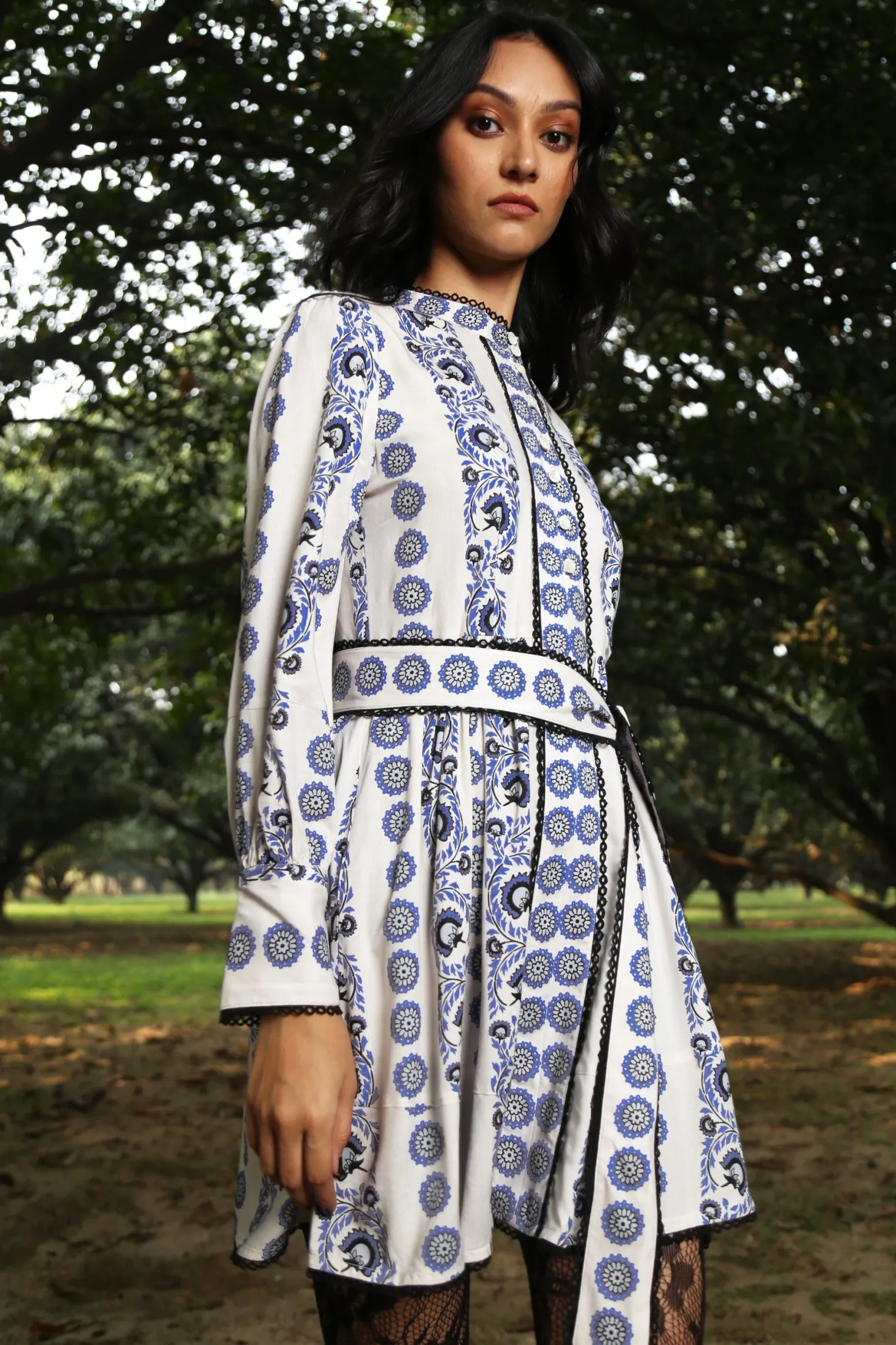 The Nella is a dress to impress. The dress cuts above the knee and features elegant bishop sleeves, a fitted bodice and a flouncy A-line silhouette. Nella is generously adorned with trim and lace details. Nella is made from ultra soft, plant-based Viscose that drapesbeautifully. The print aims to portray the sunrise on top of a mountain, minute by minute bathing the nearby plateaus and valleys in hues of blue, pink, yellow and orange.