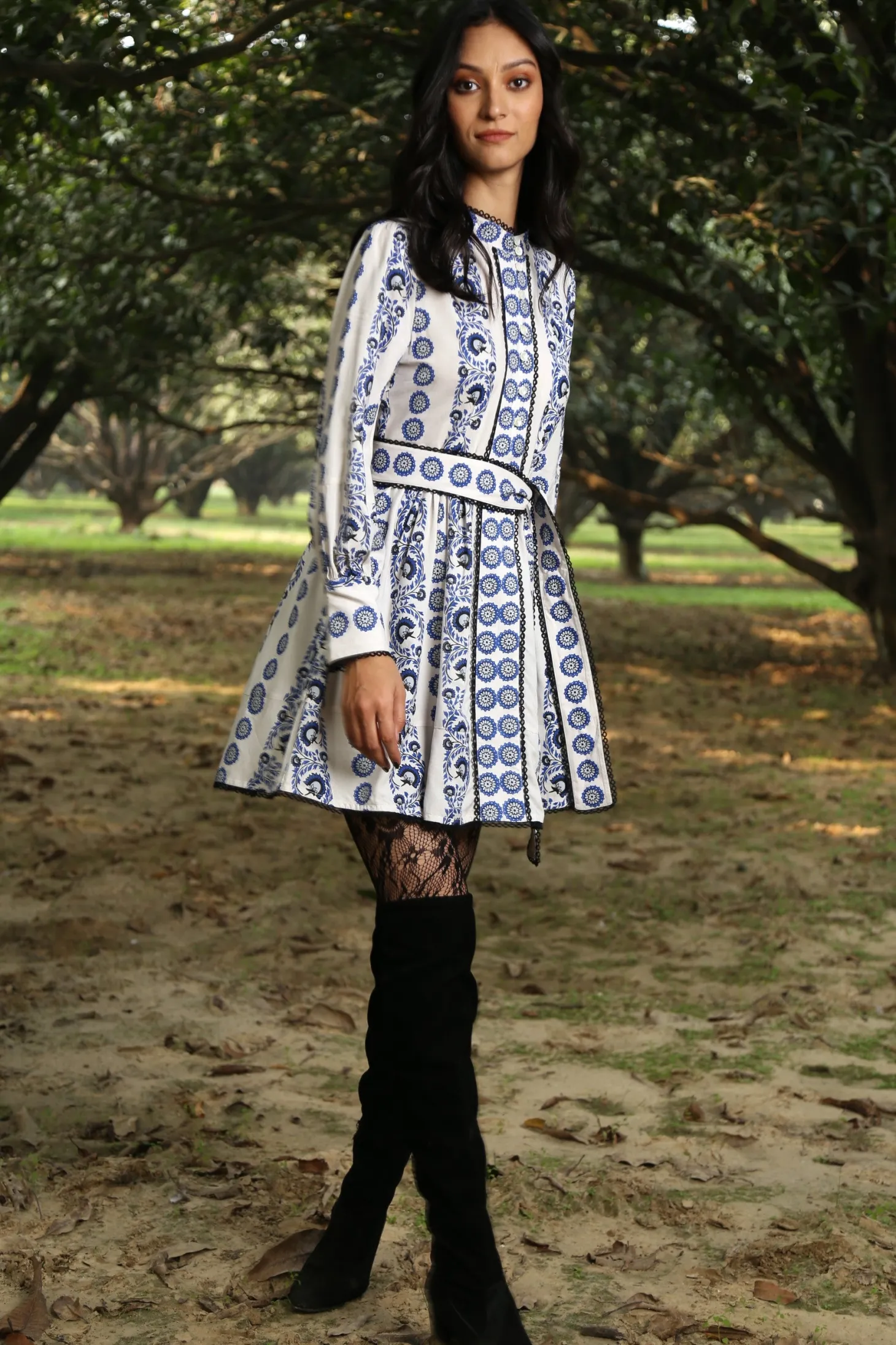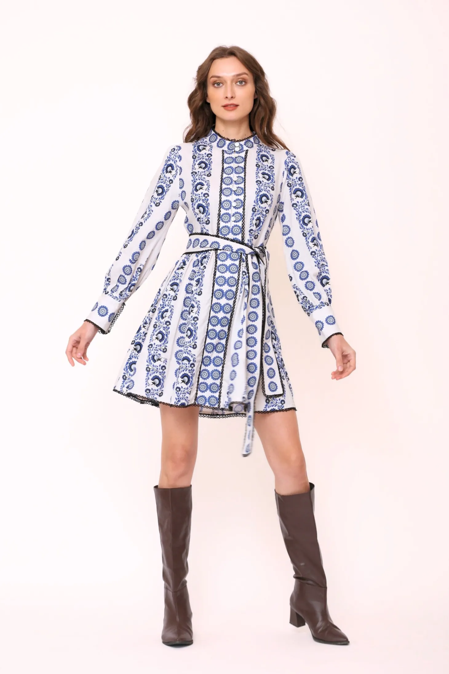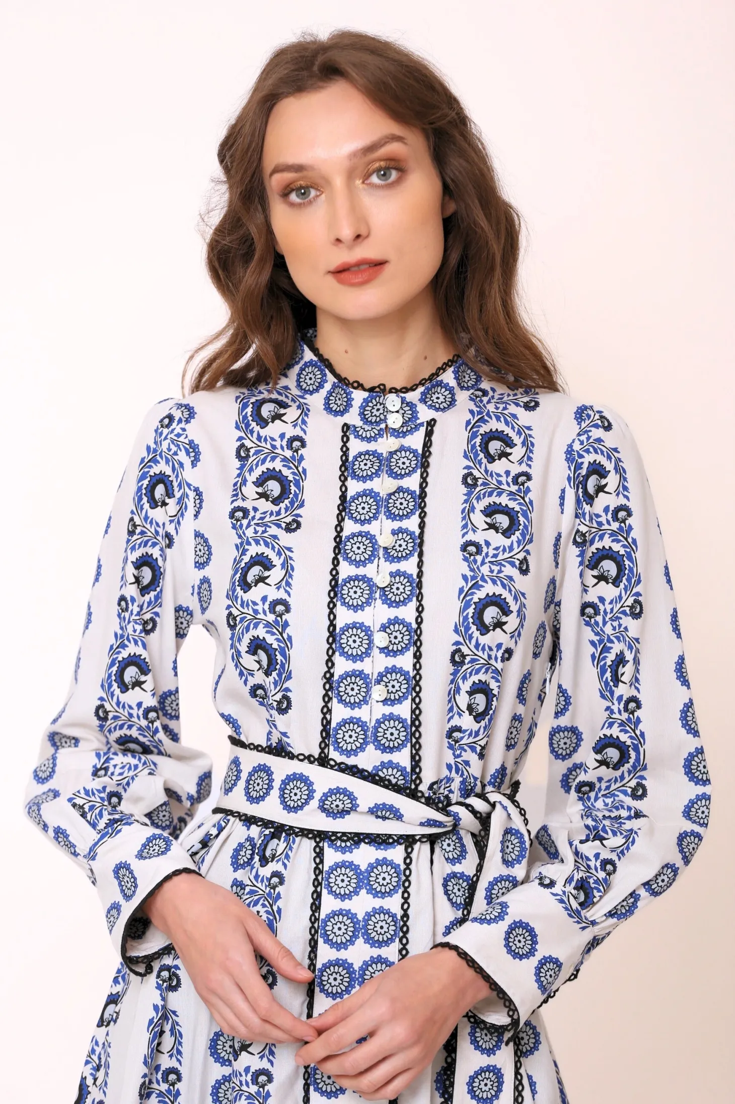 The Nella is a dress to impress. The dress cuts above the knee and features elegant bishop sleeves, a fitted bodice and a flouncy A-line silhouette. Nella is generously adorned with trim and lace details. Nella is made from ultra soft, plant-based Viscose that drapesbeautifully. The print aims to portray the sunrise on top of a mountain, minute by minute bathing the nearby plateaus and valleys in hues of blue, pink, yellow and orange.