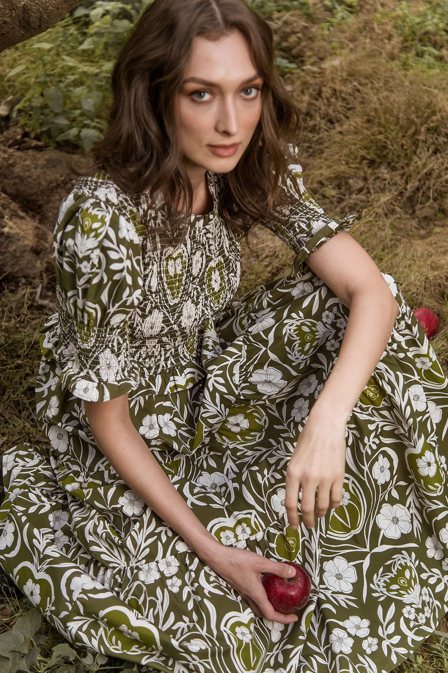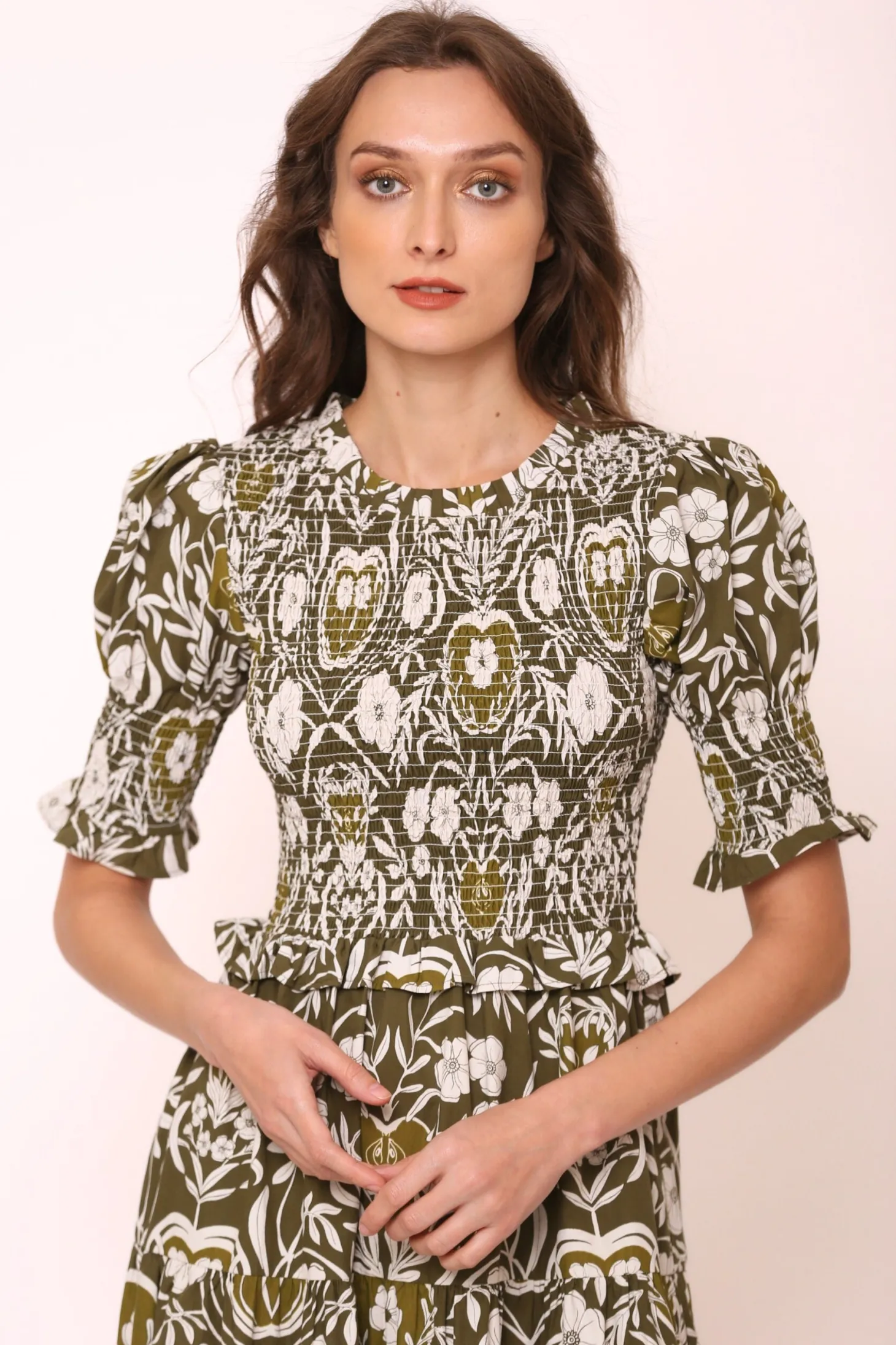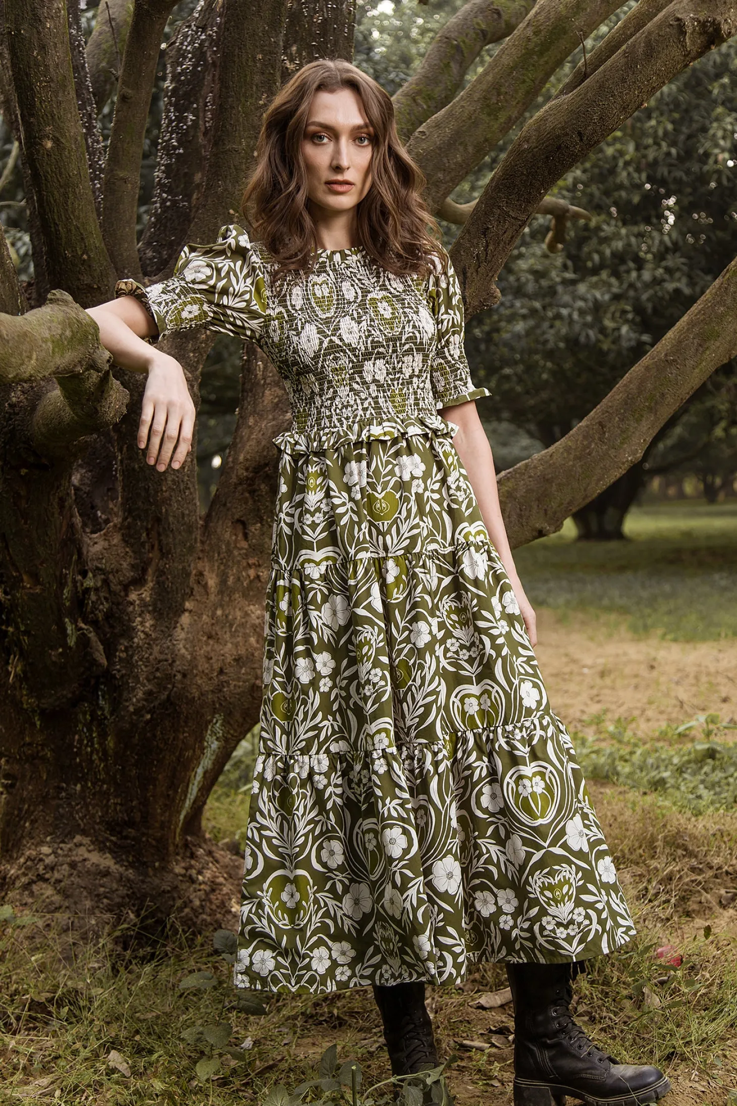 The Klara strikes the right balance between sophistication and ease with its smocked bodice, tiered A-line skirt and flattering puff sleeves. The delicate frills on the neckline, cuffs and waist give it an elegant touch. Klara is made from soft, breathable cotton. With this print, designer Vera Fritsch takes you on a journey to “Styria”, her home region in Austria. Because of its dense forests and lush meadows, it is often called the “Green Heart” of Austria.