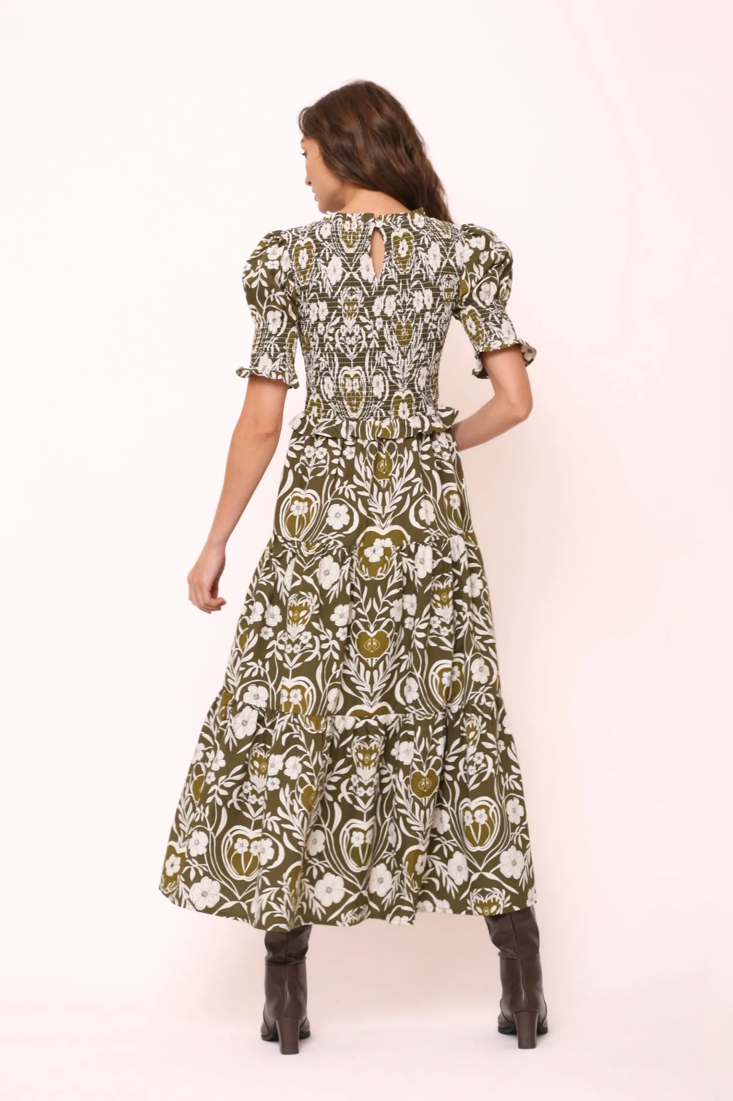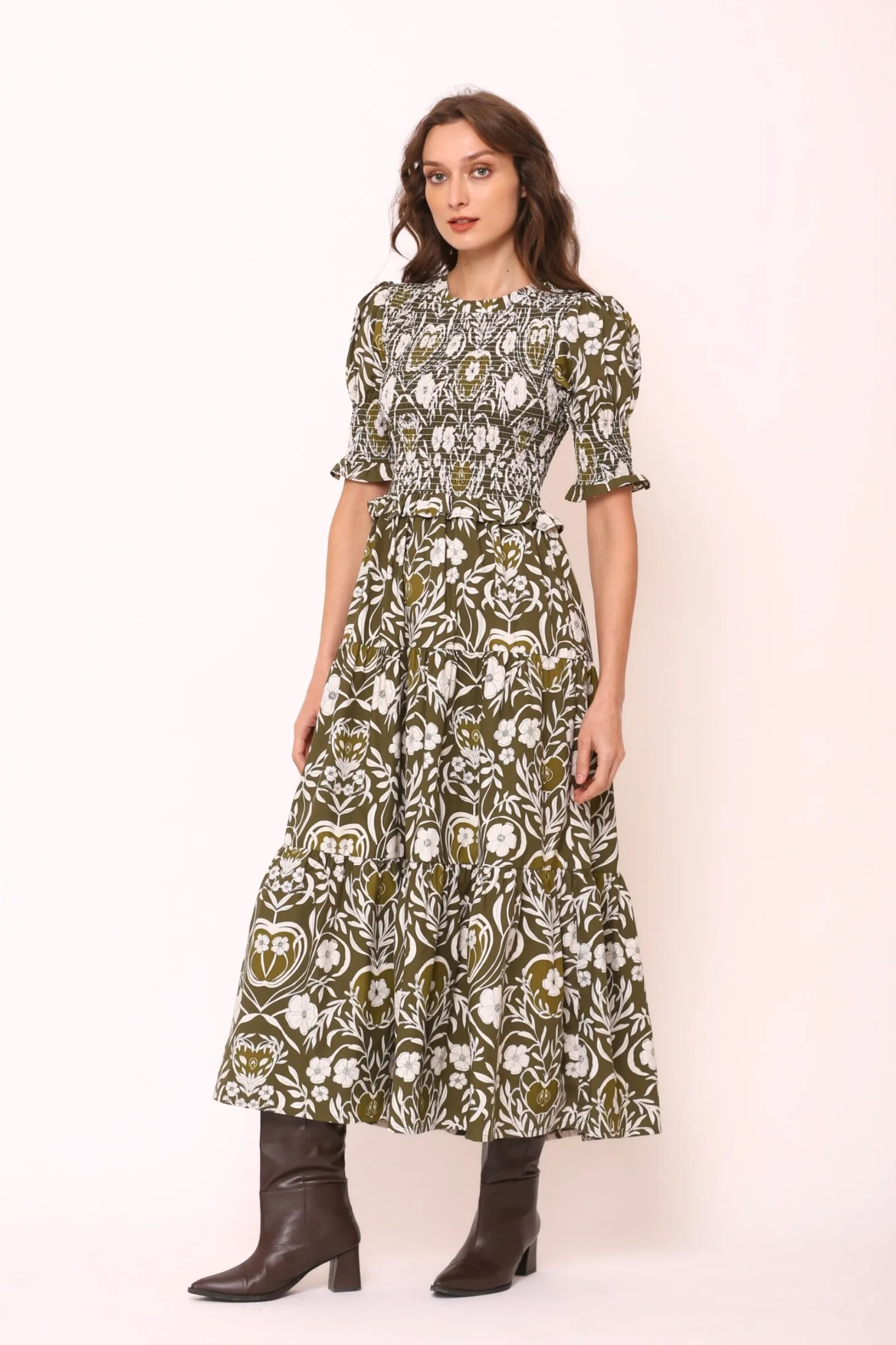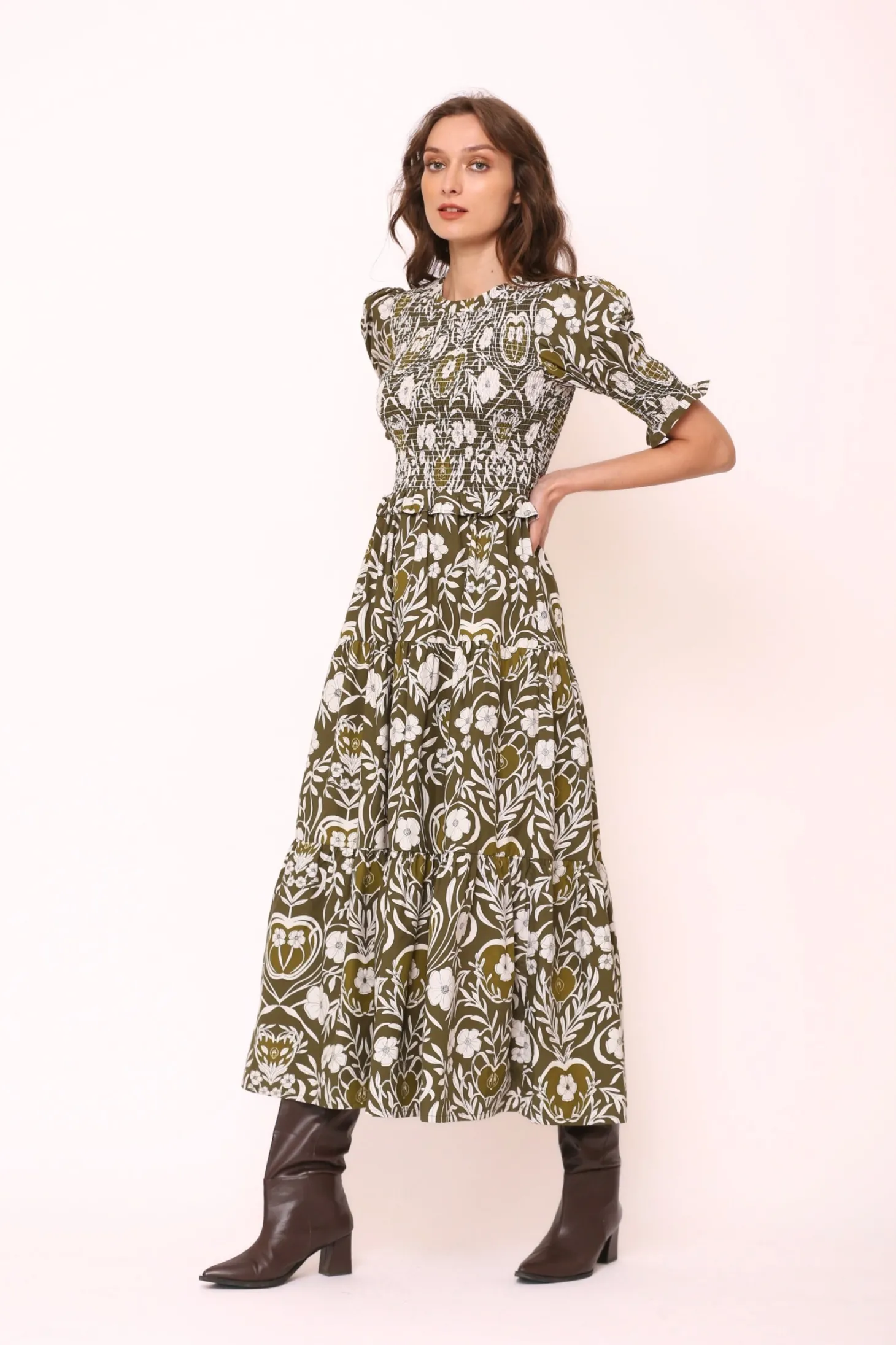 The Klara strikes the right balance between sophistication and ease with its smocked bodice, tiered A-line skirt and flattering puff sleeves. The delicate frills on the neckline, cuffs and waist give it an elegant touch. Klara is made from soft, breathable cotton. With this print, designer Vera Fritsch takes you on a journey to “Styria”, her home region in Austria. Because of its dense forests and lush meadows, it is often called the “Green Heart” of Austria.