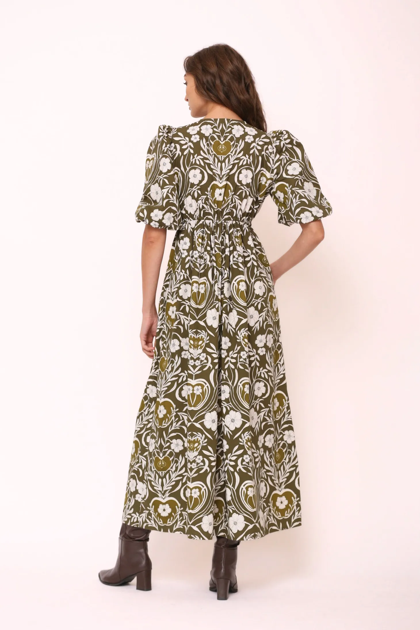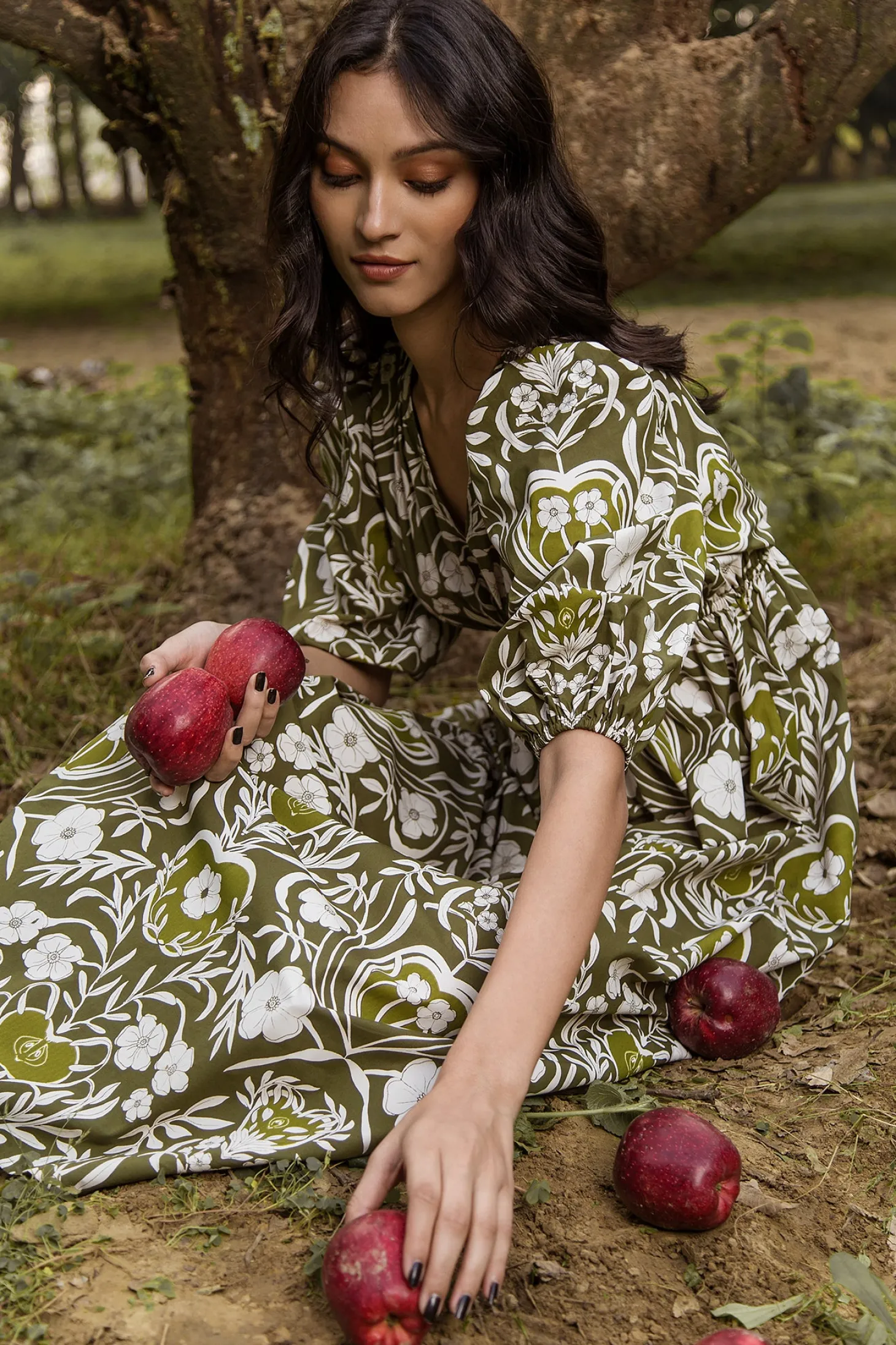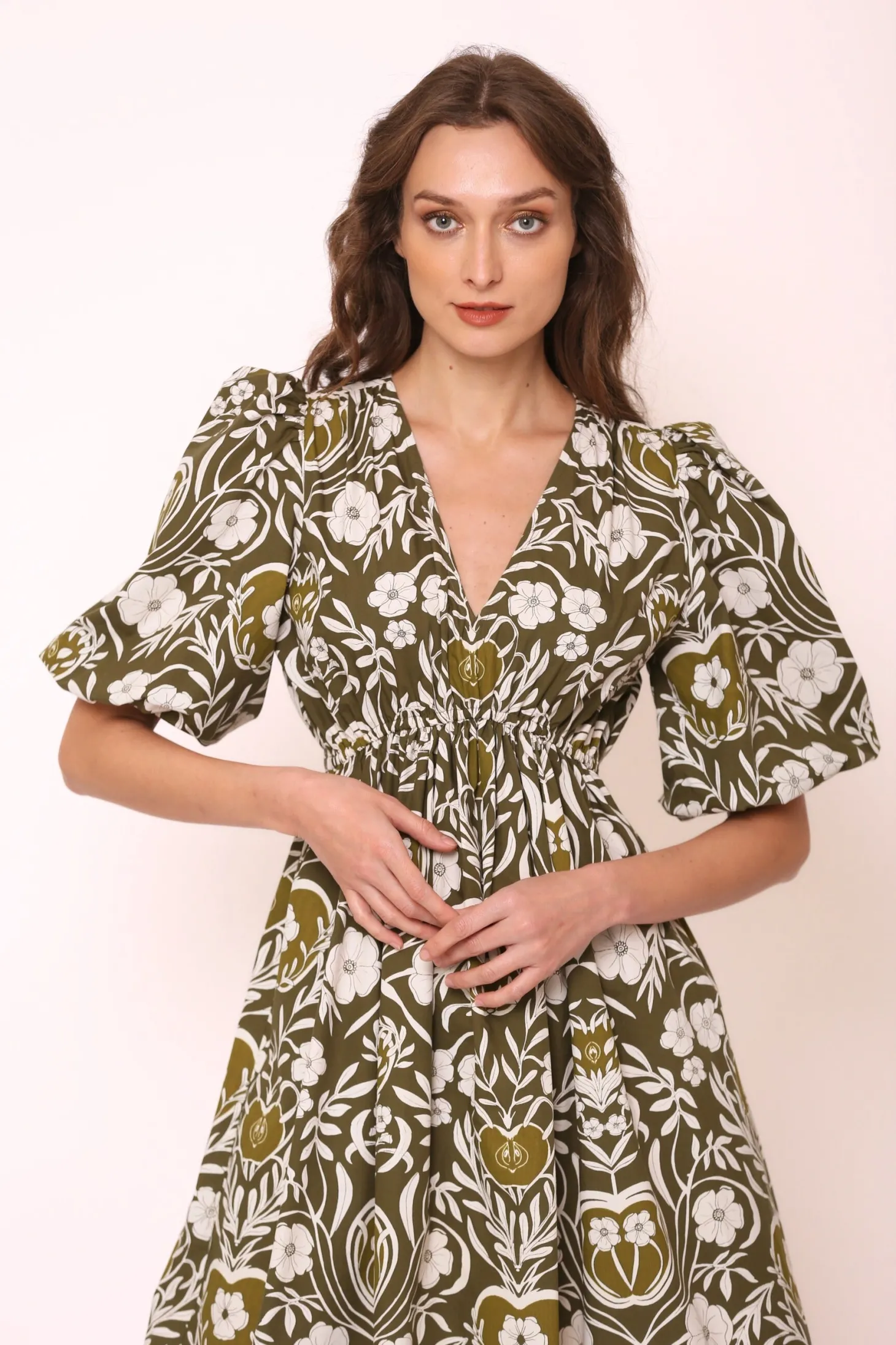 With its elbow-length puffed sleeves, V-neck, elastic waistband and flattering A-line, the Emilia Dress is a fall favorite. Layer with a cardigan and boots as the temperature drops, this midi length dress says fall sophistication. Emilia is made from soft, breathable cotton. With this print, designer Vera Fritsch takes you on a journey to “Styria”, her home region in Austria. Because of its dense forests and lush meadows, it is often called the “Green Heart” of Austria.