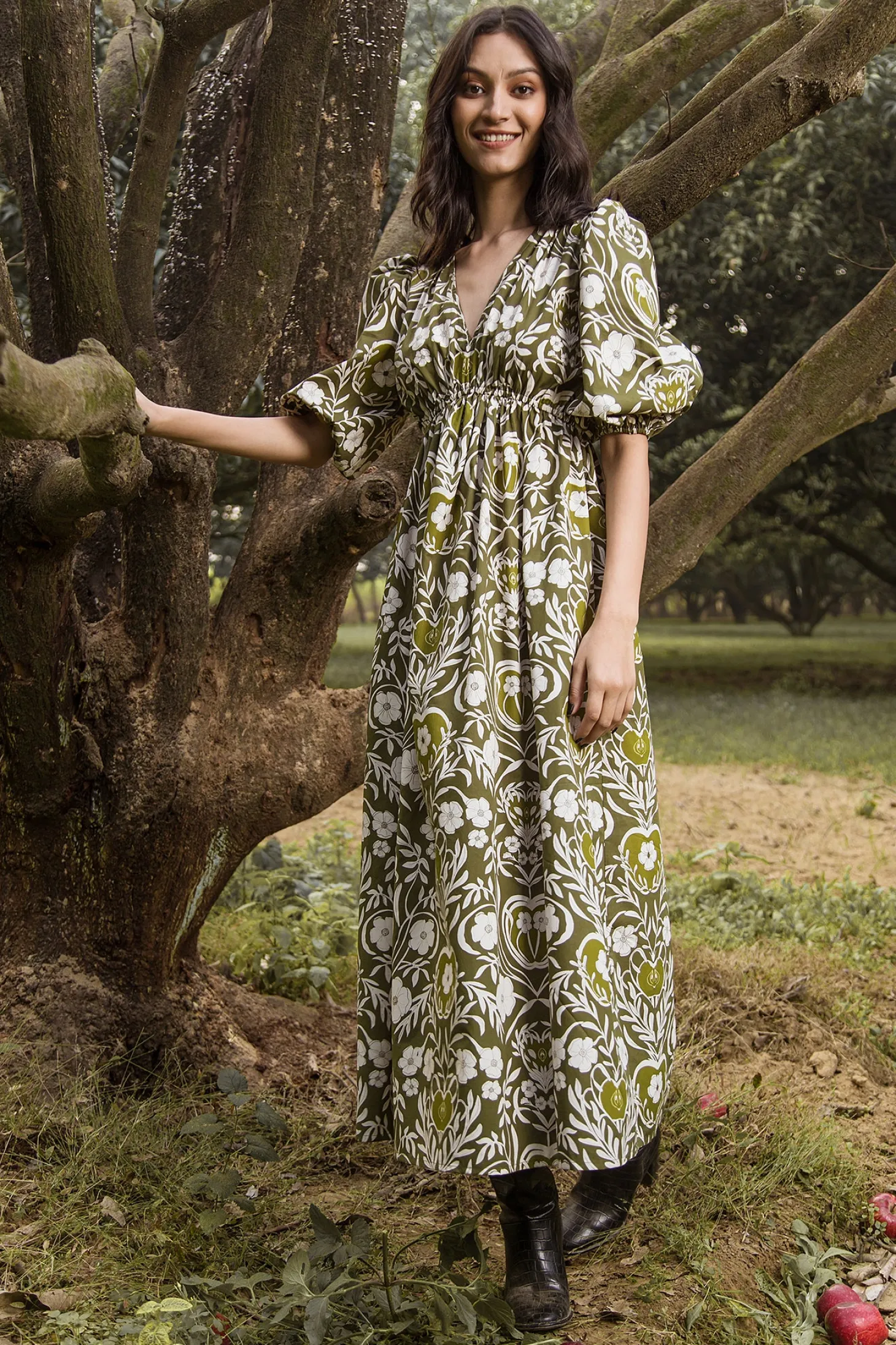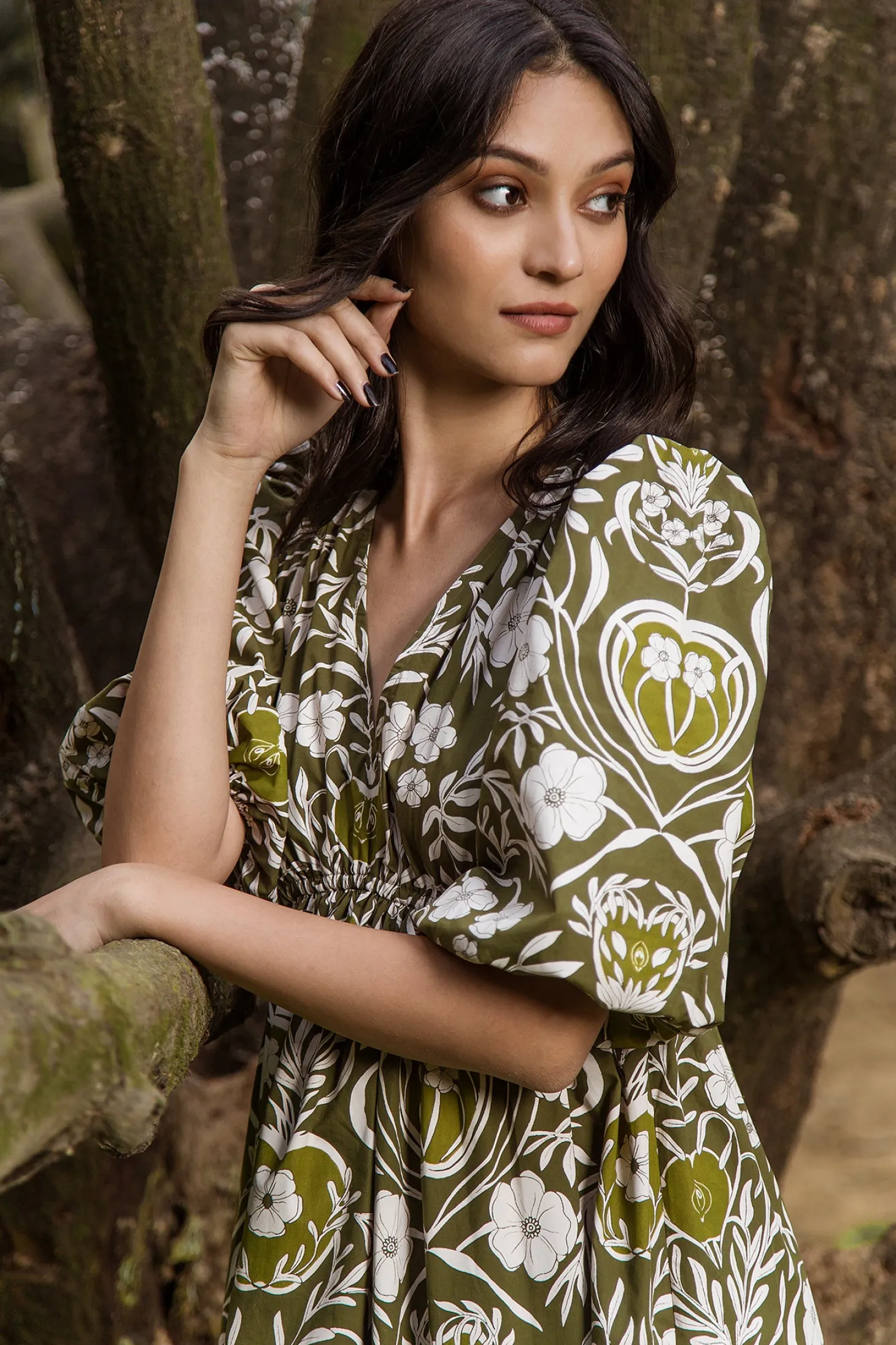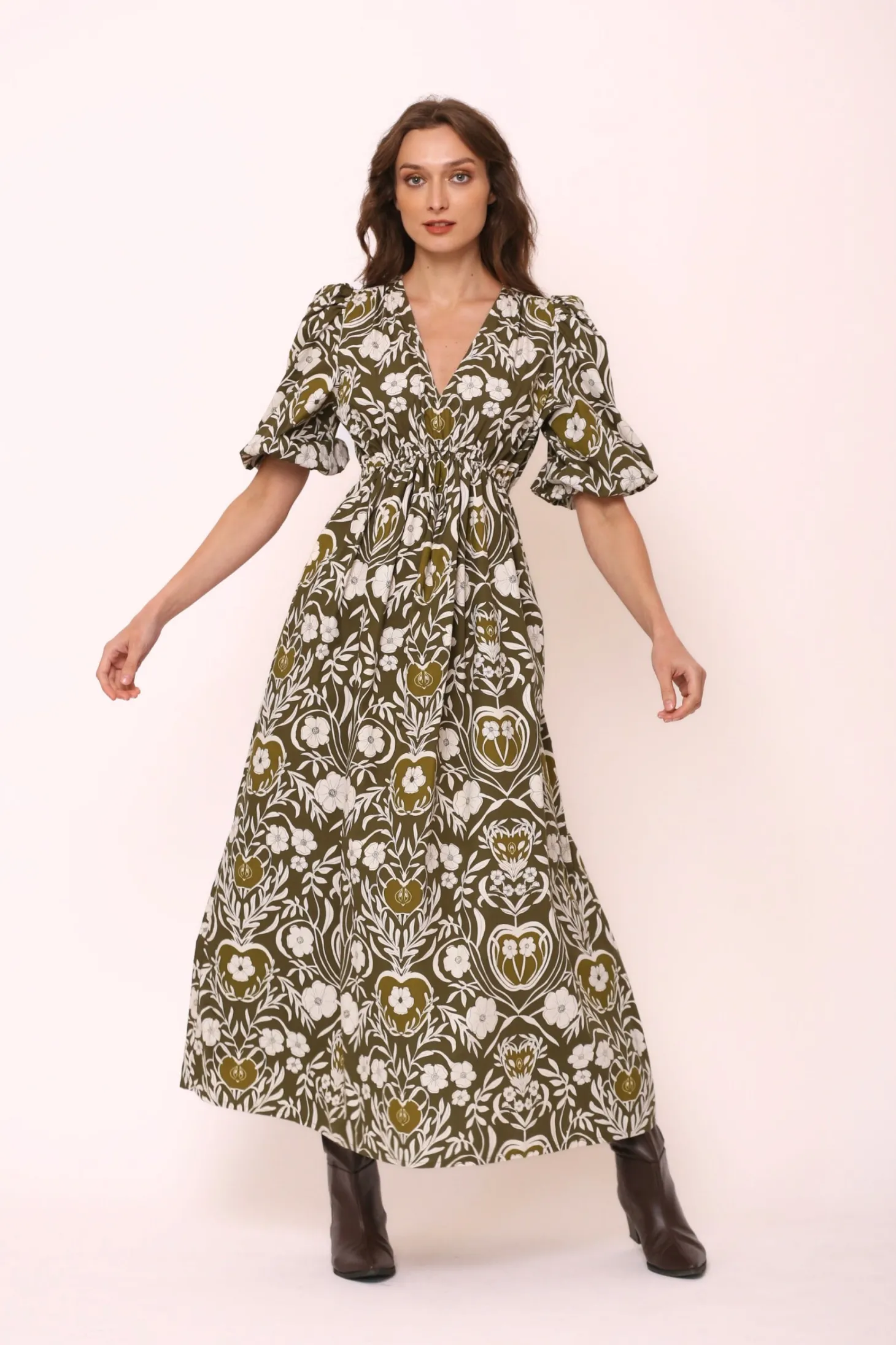 With its elbow-length puffed sleeves, V-neck, elastic waistband and flattering A-line, the Emilia Dress is a fall favorite. Layer with a cardigan and boots as the temperature drops, this midi length dress says fall sophistication. Emilia is made from soft, breathable cotton. With this print, designer Vera Fritsch takes you on a journey to “Styria”, her home region in Austria. Because of its dense forests and lush meadows, it is often called the “Green Heart” of Austria.