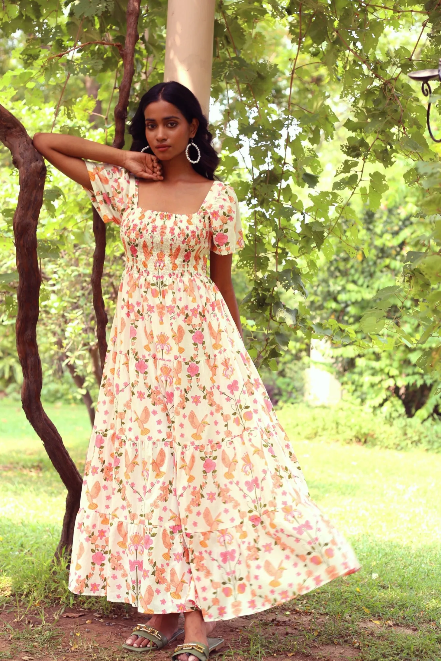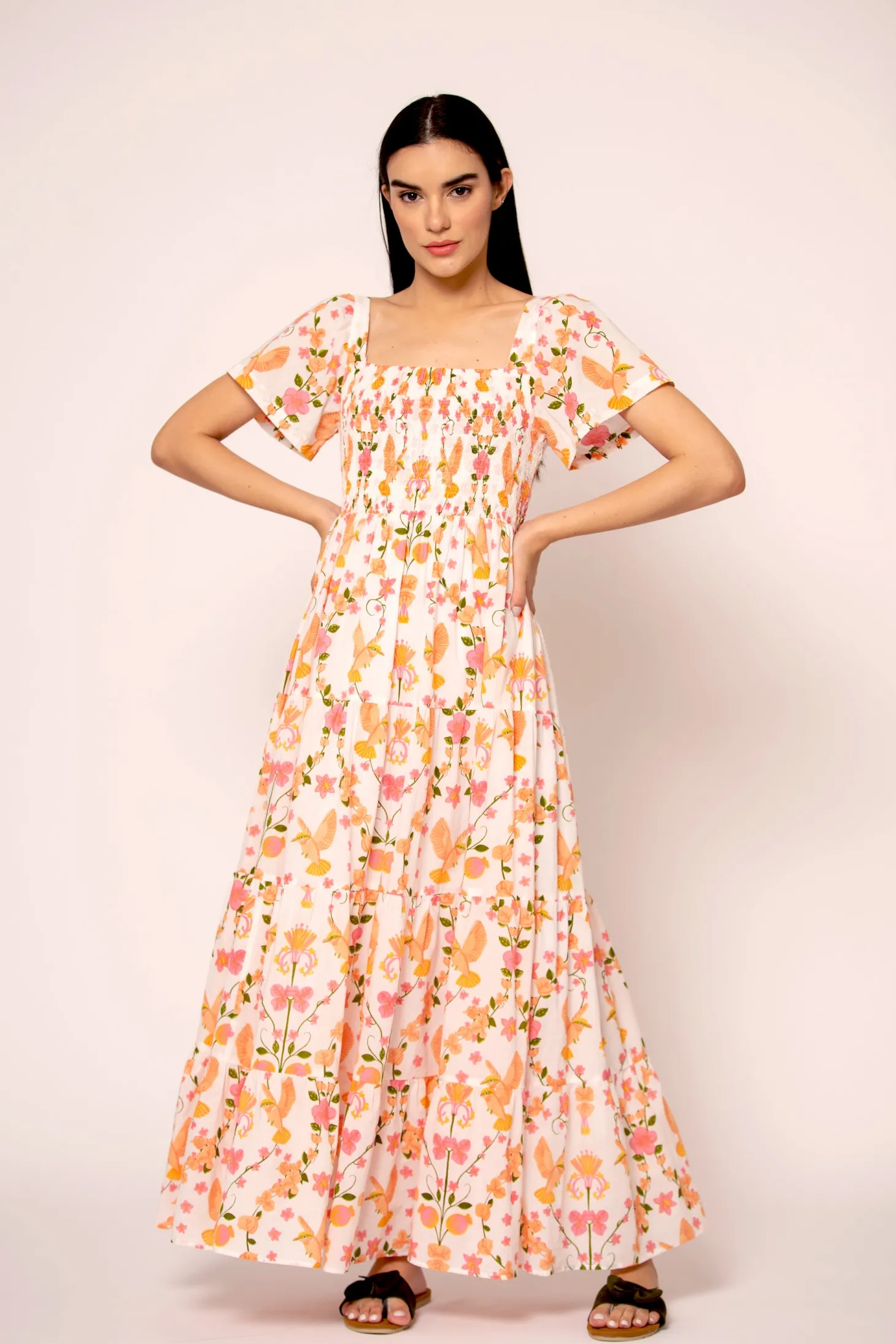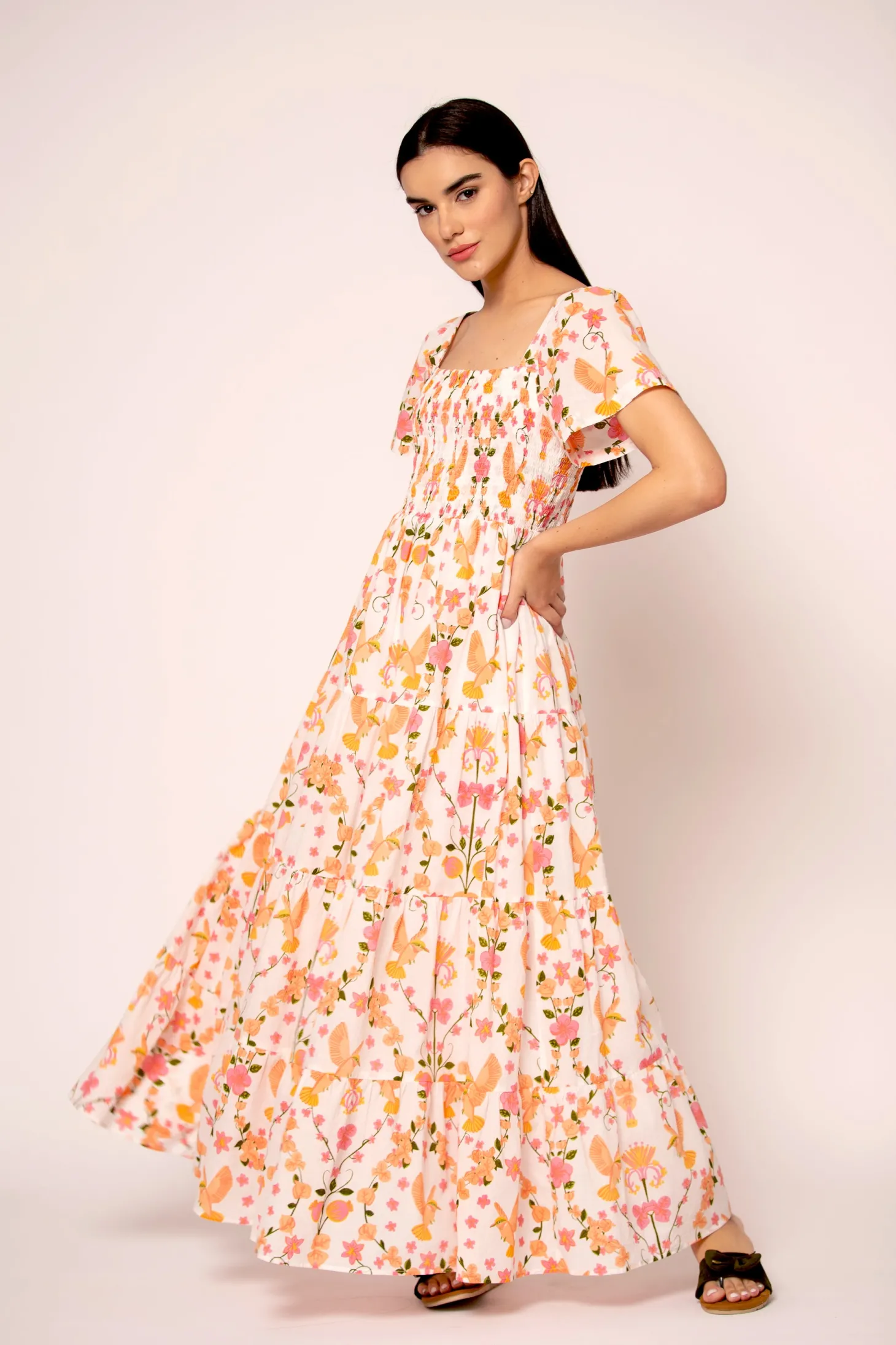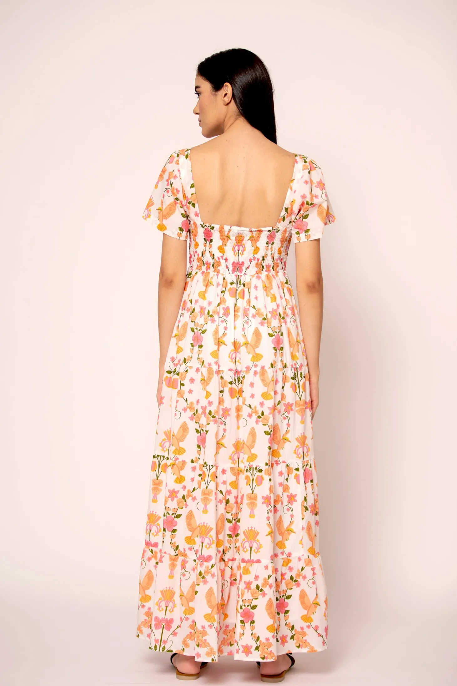 With its smocked top, tiered A-line skirt and flattering sleeves, the Rosie strikes the right balance between sophistication and ease. Rosie is made from a soft, breathable cotton cambric fabric that will keep you cool on a hot summer day. The vibrant artwork is inspired by the romantic nostalgia of Pondicherry’s French mansions with patios covered in pink and peach bougainvilleas.
